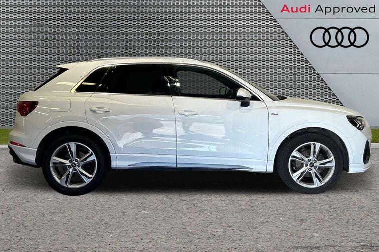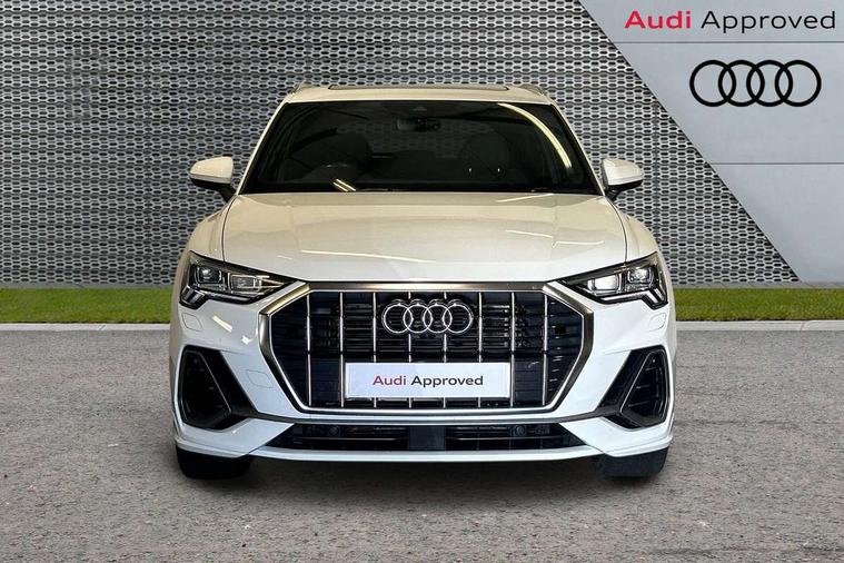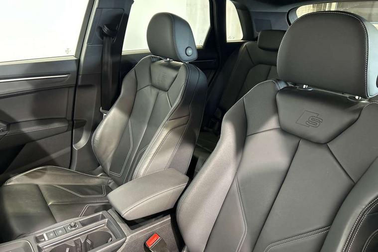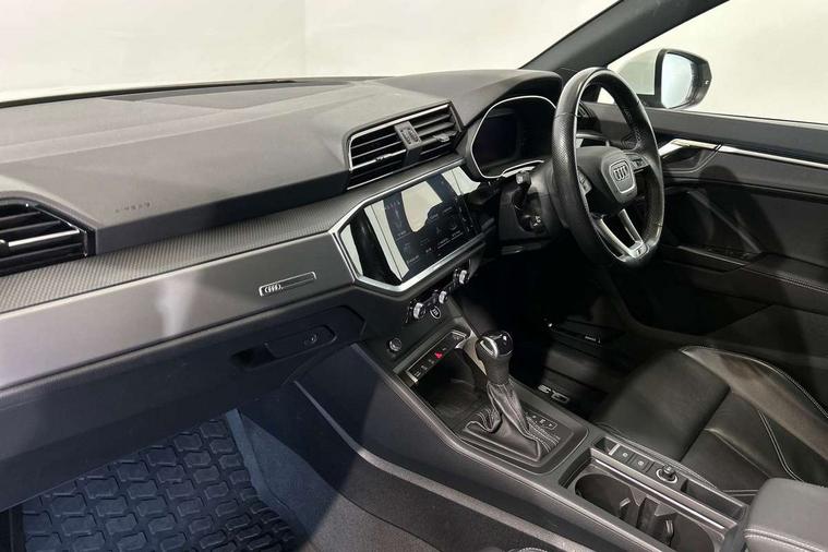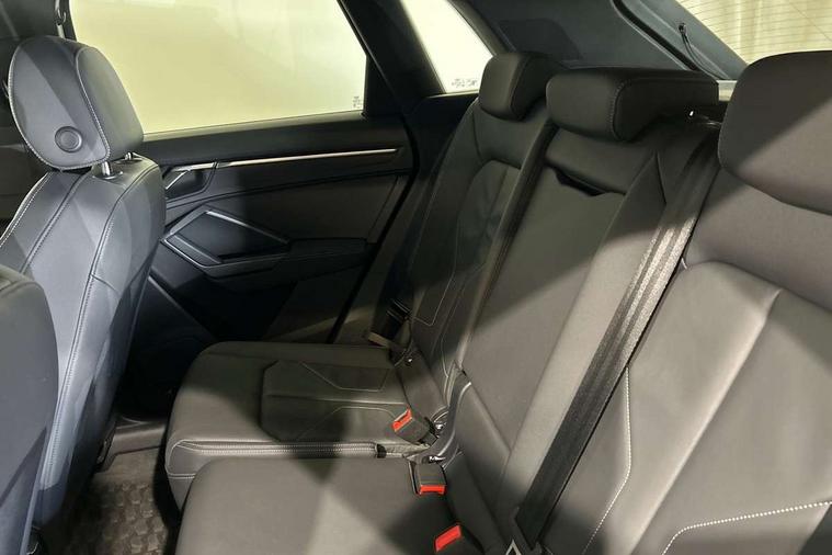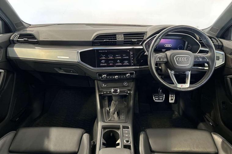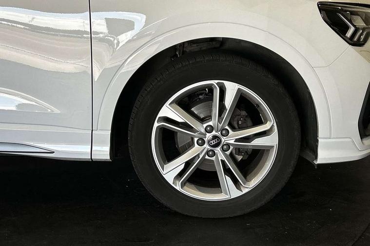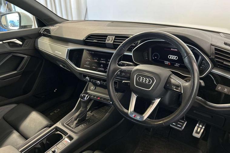 Amazon alexa Integration, Audi drive select, Audi lane departure warning, Audi Virtual Cockpit - 10.25" display, Bluetooth interface, Camera based traffic sign recognition, Legal emergency call, MMI Navigation Plus with high resolution 10.1 inch touchscreen colour display, Power operated tailgate, Progressive steering, Service interval indicator, Smartphone interface includes wireless Apple carplay/Android Auto, Start stop system with recuperation, Voice control system with natural language interaction, Diesel particulate filter, Sports suspension, 2 USB-C ports with charge and data functions, 6 passive loudspeakers, DAB digital radio module, Acoustic windscreen, Aluminium roof rails, Aluminium window trim, Anthracite black radiator grille, Auto dimming frameless rear view mirror, Body colour front spoiler blade, Body coloured bumpers, Electrically folding, adjustable and heated door mirrors with integrated LED side indicators and kerb view function for passenger side, Front and rear electric windows, Front fog lights, Front side air inlets in matt platinum grey, Grille vertical bars in aluminium silver/Matt, High gloss black finish B and C pillars, LED Dynamic rear indicators, LED headlights with LED daytime running lights, LED rear lights, LED third brake light, Privacy glass dark tinted rear and rear-side windows (from B-pillar backwards), Rain and light sensors, Rear diffuser grille in grained matt black, Rear diffuser strip in matt anthracite black, Rear side wing doors, Rear wiper, S line badges on front wings, S Line front and rear bumpers, Side skirt insert in matt Platinium grey, Variable front intermittent wipers, 12V socket in rear centre console, 3 seat bench in 2nd row, 3 spoke leather multifunction steering wheel features S badging and grips in perforated leather with contrast stitching, 40:20:40 folding with manual adjustment for 60:40 forwards/backwards position and backrest angle, Adjustable rear seat bench/backrest with centre armrest and cupholder, Black cloth headlining, Dual zone electronic climate control, Front and rear black floor mats with contrast stitching in rock grey, Front and rear headrests, Front and rear roof module including reading lights, Front centre armrest, Glove compartment lighting, Height and reach adjustable steering wheel, Illuminated door sill trims with S logo, ISOFIX child seat mounting for front passenger with airbag deactivation and outer rear seat including top tether attachment point for outer rear seats, Luggage compartment light, Manual front seats with height adjustment, Perforated leather gearknob, Single front passenger seat, Stainless steel luggage compartment sill finisher, Stainless steel pedals, Ambient lighting pack - Q3, Non smoking pack - Q3, 3x3 point rear seatbelts, 6 airbags - Driver, front passenger, curtain and side windows, Audi pre-sense front with pedestrain and cyclist recognition, Electrically operated child locks on rear doors, Electromechanical parking brake, Electronic stabilisation control including ABS, ASR and EDL, Front seatbelt reminder, Hill descent control, Hill hold assist, Pre sense basic, Seatbelt monitoring, Tyre pressure warning, Warning triangle and first aid kit, Anti theft alarm, Anti theft wheel bolts, Immobiliser, Remote central locking, Aluminium look interior elements, Dark matt brushed aluminium inlay, Detail dashboard around MMI touch colour display in glass look, black with surround in aluminium look, Leatherette door armrest,