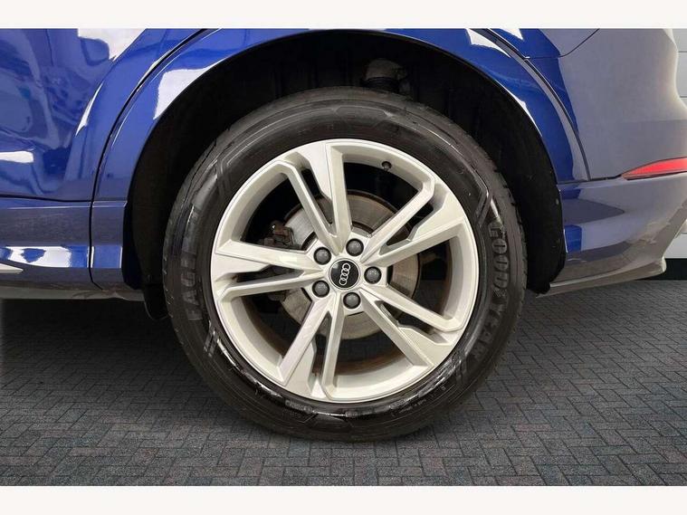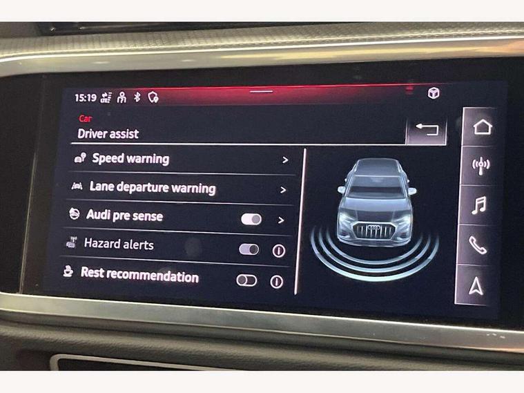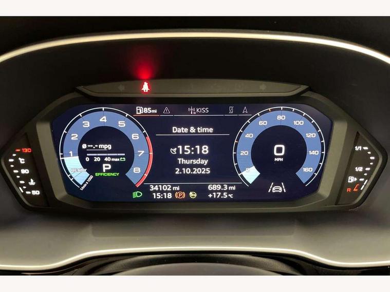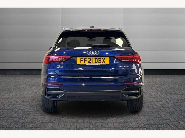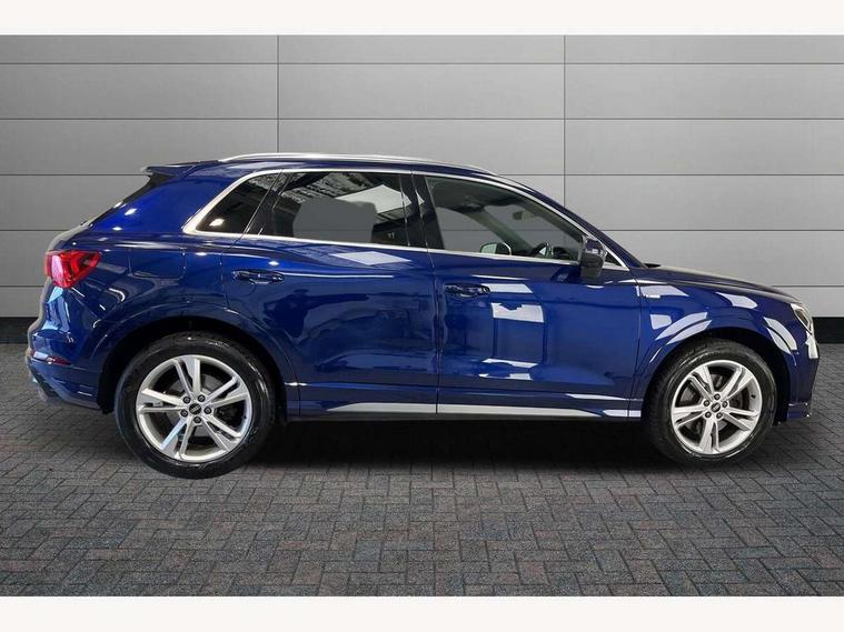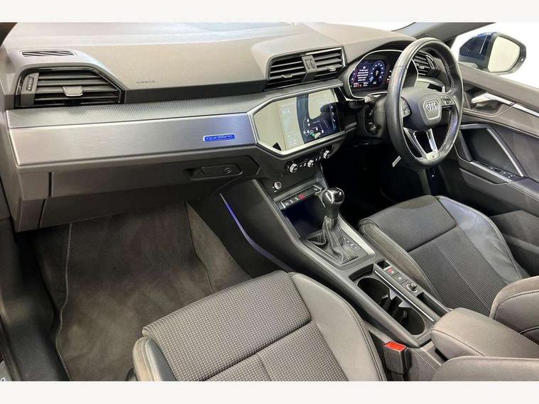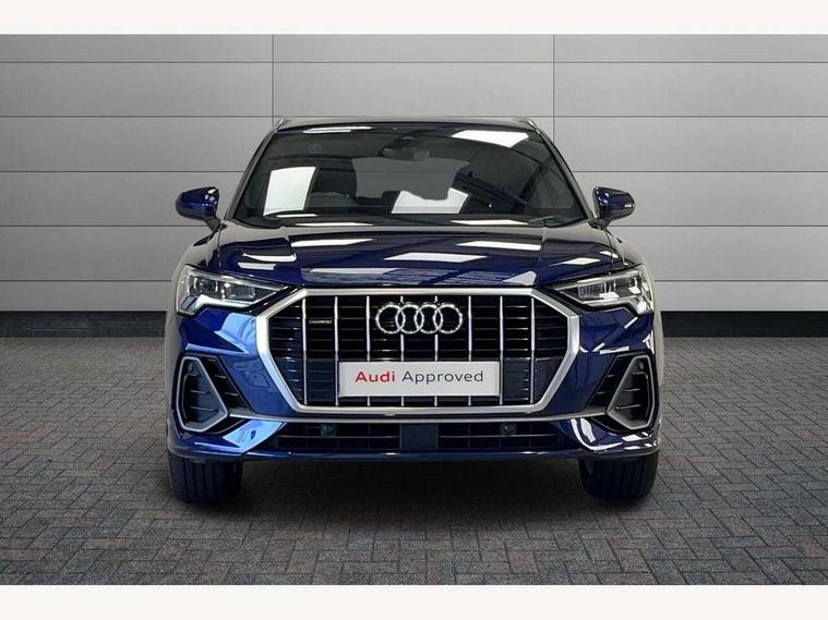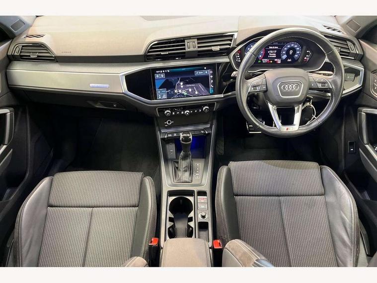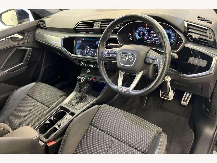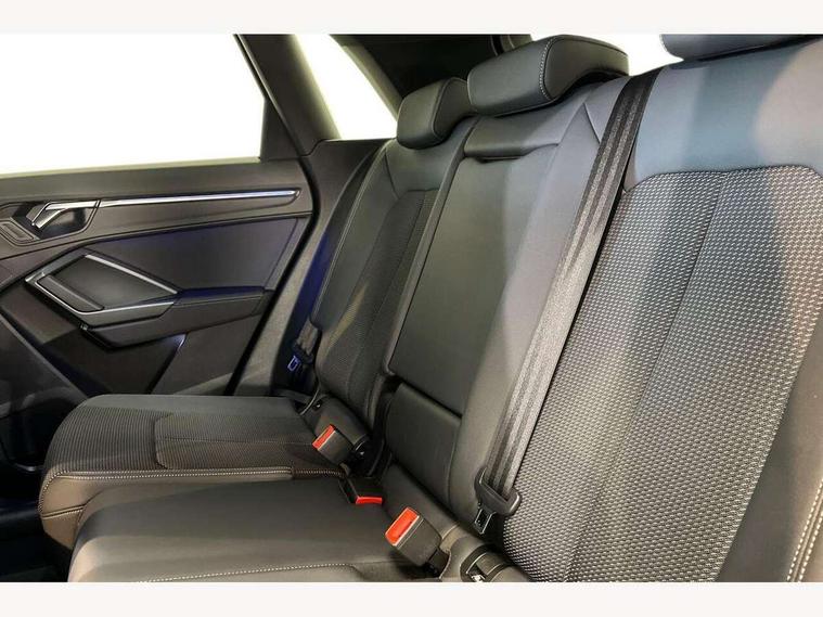 Amazon alexa Integration, Audi connect safety and service (e-call), Audi drive select, Audi lane departure warning, Audi smartphone interface includes wireless Apple carplay/Android Auto, Audi Virtual Cockpit - 10.25" display, Bluetooth interface, Camera based traffic sign recognition, MMI Navigation Plus with high resolution 10.1 inch touchscreen colour display, Power operated tailgate, Progressive steering, Service interval indicator, Start stop system with recuperation, Voice control system with natural language interaction, Sports suspension, 2 USB-C ports with charge and data functions, 6 passive loudspeakers, DAB digital radio module, Acoustic windscreen, Aluminium roof rails, Aluminium window trim, Auto dimming frameless rear view mirror, Body coloured bumpers, Electrically folding, adjustable and heated door mirrors with integrated LED side indicators and kerb view function for passenger side, Front and rear electric windows, Front fog lights, Front side air inlets in matt platinum grey, Front spoiler blade in matt platinum grey, Grille vertical bars in aluminium silver/Matt, High gloss black finish B and C pillars, LED headlights with LED daytime running lights and dynamic rear indicator, LED rear lights, Privacy glass dark tinted rear and rear-side windows (from B-pillar backwards), Rain and light sensors, Rear diffuser strip in matt titanium black, S line badges on front wings, S Line front and rear bumpers, Side skirt insert in matt Platinium grey, Silver chrome grille surround, Titanium black radiator grille, 12V socket in rear centre console, 40:20:40 folding with manual adjustment for 60:40 forwards/backwards position and backrest angle, Adjustable rear seat bench/backrest with centre armrest and cupholder, Black cloth headlining, Dual zone electronic climate control, Front and rear black floor mats with contrast stitching in rock grey, Front and rear headrests, Front and rear roof module including reading lights, Front centre armrest, Glove compartment lighting, Height and reach adjustable steering wheel, Illuminated door sill trims with S logo, ISOFIX child seat mounting for front passenger with airbag deactivation and outer rear seat including top tether attachment point for outer rear seats, Luggage compartment light, Manual front seats with height adjustment, Perforated leather gearknob, Stainless steel luggage compartment sill finisher, Stainless steel pedals, Non smoking pack - Q3, 3x3 point rear seatbelts, 6 airbags - Driver, front passenger, curtain and side windows, Audi pre-sense front with pedestrain and cyclist recognition, Electrically operated child locks on rear doors, Electromechanical parking brake, Electronic stabilisation control including ABS, ASR and EDL, Hill descent control, Hill hold assist, Pre sense basic, Seatbelt monitoring, Tyre pressure warning, Warning triangle and first aid kit, Anti theft alarm, Anti theft wheel bolts, Remote central locking, Dark matt brushed aluminium inlay, Detail dashboard around MMI touch colour display in glass look, black with surround in aluminium look, Leatherette door armrest,