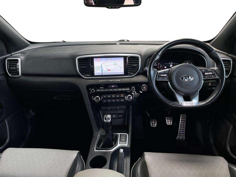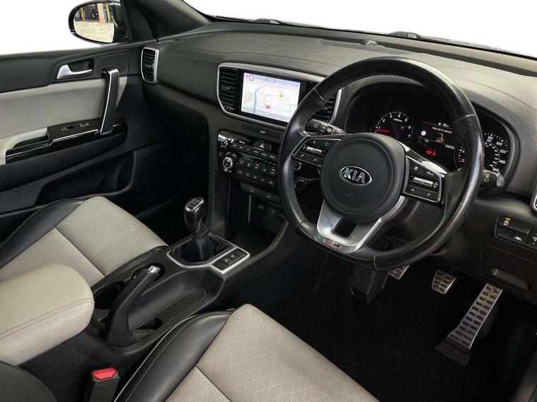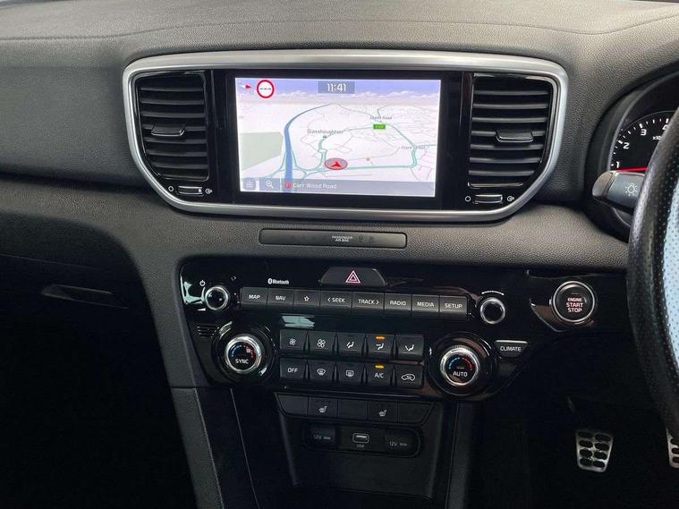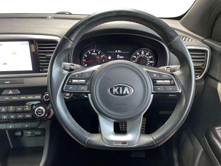 4.2" supervision colour cluster display, 8" touchscreen satellite navigation with European mapping and traffic messaging channel, Android auto with voice control, Apple car play with voice control, Cruise control + speed limiter, Driver attention warning, Emergency stop signalling system, Front parking sensor, Kia connected services featuring TomTom live, Lane keep assist, Rear parking sensor, Reversing camera, Speed limit information, Speed sensitive power steering, Telematics system with UVO connect services, Trip computer, Windscreen washer level indicator, Intelligent Stop and Go, 6 speaker audio system, Bluetooth audio streaming, DAB Radio with MP3, Rear USB port, Steering wheel mounted audio controls, USB/iPod/auxiliary input connections, All round electric windows with drivers auto up/down function, Auto dimming rear view mirror, Automatic lighting control, Automatic window defogger, Black wheel arch body mouldings and side sills with dark chrome insert, Body colour door handles with chrome inserts, Body colour door mirrors, Chrome window surround, Dark chrome front bumper insert, Dark chrome front grille surround, Electrically adjustable/heated/folding door mirrors with LED indicators, Front wiper de-icer, High beam assist, High gloss black blade mesh radiator grille, LED Bi-Function headlights, LED daytime running lights, LED ice cube front fog lights, LED rear lights, Privacy glass - Rear windows and tailgate, Rain sensing front wipers, Rear spoiler, Rear wiper, Roof rails, Shark fin antenna, Silver painted front and rear skid plates, Tinted glass, Trailer stability assist, Welcome and follow-me home light functionality, Wide view drivers door mirror, 12V power in front and rear centre console, 3 x passenger assist grips, 60/40 split folding rear seat, Air filter, All-round height adjustable headrests, Aluminium door scuff plates, Aluminium pedals, Black headlining, Centre cabin light, Centre console storage box, Chrome boot sill guard, D-Shaped sports leather steering wheel and perforated inserts with GT-Line logo, Driver and front passenger side sunvisors with illuminated vanity mirrors, Driver's seat manual height adjust, Drivers seat power lumbar support, Dual zone automatic air conditioning, Front and rear door storage, Front cabin LED map light with sunglasses case, Front door courtesy reflectors, Front seat and rear pockets, Front/rear centre armrests, Gear shift indicator, Glovebox illumination, Heated front and outer rear seats, Interior door lock/unlock function, ISOFIX Child seat top tethers and anchor fixings, Leather trimmed door armrests, Leather trimmed gearshift, Luggage area light, Luggage area load cover, Luggage net with hooks, Rear centre armrest with cupholder, Rear coat hooks, Satin chrome interior door handles, Tilt/telescopic adjustable steering wheel, Two tone leather upholstery, Ventilation ducts to rear compartment, Active front headrests, All round 3-point seatbelts, Anti-lock braking system with electronic brakeforce distribution, Dual front side airbags, Electronic stability control with downhill brake control, Front passenger airbag cut-off switch, Front seatbelt pretensioners + load limiters, Height adjustable front seatbelts, Hill start assist control (HAC), Impact sensing auto door unlocking, Rear door child safety locks, Traction control, Twin curtain airbags with roll over sensor, Twin front airbags, Tyre pressure monitoring system, Advanced anti-theft system including immobiliser and alarm, Door deadlocks, Engine Start/Stop Button with Smart Entry System, Locking wheel nuts, Speed sensitive auto door locking, Visible vehicle identification number, High gloss black centre fascia, 19" alloy Wheels B-type, Tyre mobility kit,