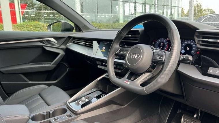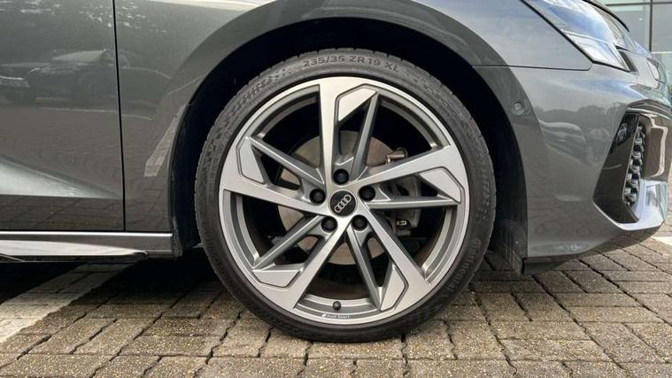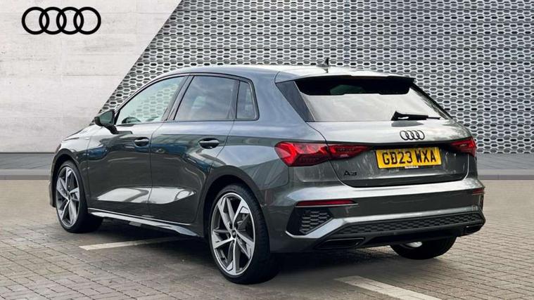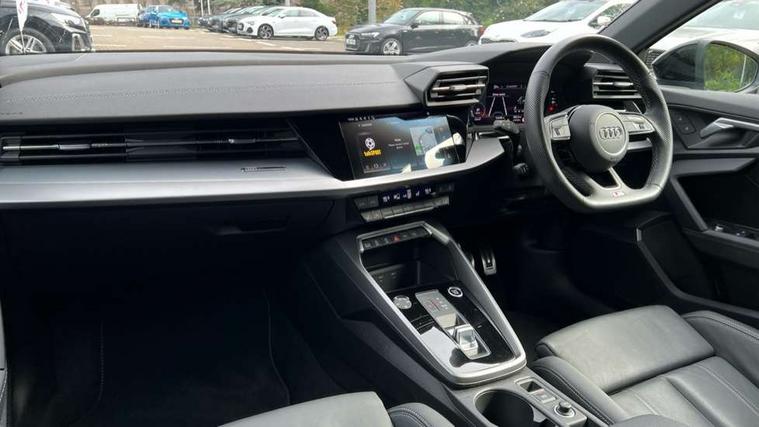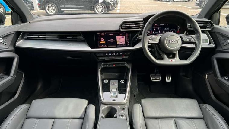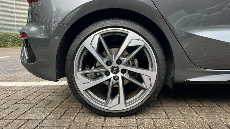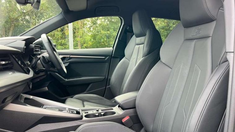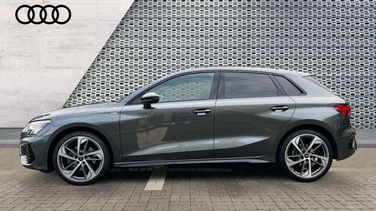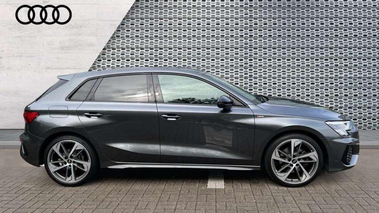 Audi drive select (Auto, Comfort, Dynamic, Efficiency and Individual), Audi smartphone interface, Audi Virtual Cockpit - 10.25" digital and colour instrument cluster, Automatic start/stop system with recuperation, Bluetooth interface, Camera based traffic sign recognition, Collision avoidance assistant, e-Call (emergency call), Electromechanical power speed sensitive steering, Lane departure warning system, MMI Navigation Plus with high resolution 10.1" colour touch screen display, Service indicator, Trip computer, Voice control system with natural language interaction, Sports suspension, 2xUSB-C connection with data and charging functions, 6 passive loudspeakers, DAB Digital radio, 3rd brake light, Acoustic glass windscreen, Audi beam uses LEDs to project the Audi logo onto the ground as you exit your A3, Auto dimming frameless rear view mirror, Electrically adjustable/heated/folding/auto dimming door mirrors with integrated LED indications + kerb view function for passenger side, Front electric windows, Illuminated door sills with aluminium inserts at the front with S logo, LED daytime running lights, LED headlights with LED rear lights and dynamic rear indicators, Light and rain sensors, Privacy glass - dark tinted rear window, rear door and side windows, Rear electric windows, Rear side air outlets in grained matt black, Rear side wing doors, Rear wiper, S roof spoiler, 12V socket and storage compartment in front centre console, 3 seat bench in 2nd row, 4 way electrically adjustable lumbar support for driver and front passenger, 60/40 split folding rear seat bench, Black cloth headlining, Dual zone electronic climate control, Front and rear centre armrest in artificial leather, Front and rear headrests, Front/rear floor mats, Height and reach adjustable steering wheel, Interior lighting - glove compartment light and right hand side, Luggage compartment floor covering, Manual boot compartment lid, Seat side bolsters, Single front passenger seat, Stainless steel pedals and front footrest in black, Twin leather upholstery with front sports seats S embossed logo, Aluminium interior elements pack - A3 Sportback, Black styling pack - A3 Sportback/Black edition, LED interior lighting pack - A3 Sportback, 3x3 point rear seat belts, Driver and front passenger airbag with passenger airbag deactivation, Electronic Stabilisation Control (ESC) including ABS, ASR and EDL, First aid kit with warning triangle and 2 safety vests, Front side airbags with head airbags and interaction airbag, Pre-sense front with pedestrian and cyclist detection, Seatbelt monitoring, Tyre pressure loss indicator, Anti theft alarm, Anti-theft wheel bolts, Electronically operated child locks, Immobiliser, Remote control central locking, Dark spectrum aluminium inlays, accent surfaces in the dashboard and centre console in platinum grey silk effect paint finish, 19" 5 arm trapezoid design alloy wheels in matt grey with diamond cut finish,