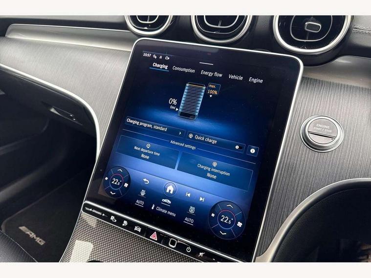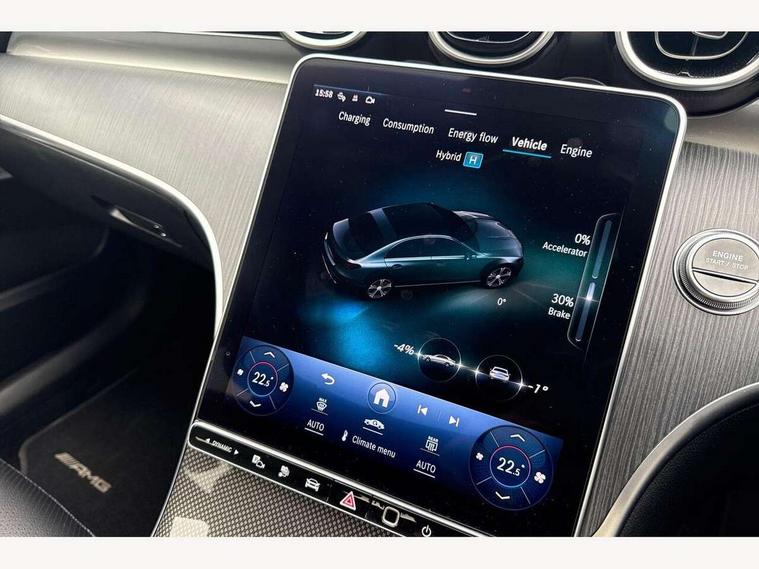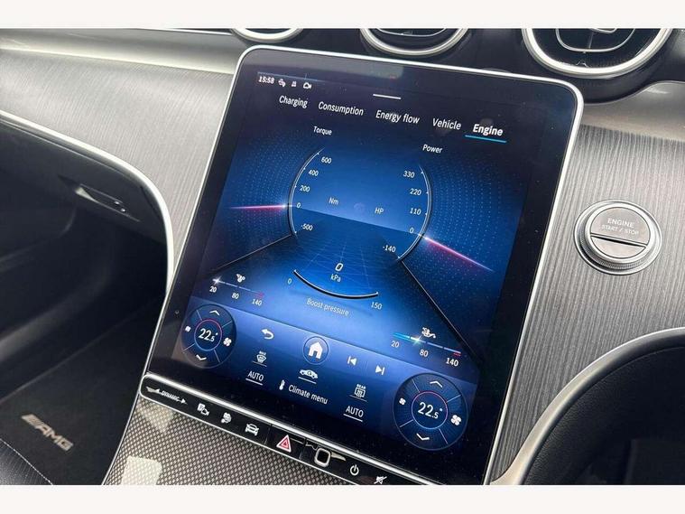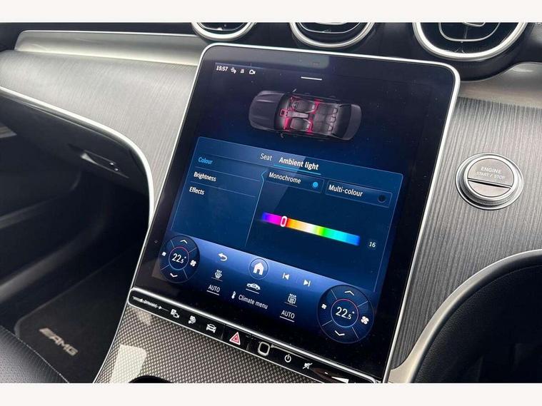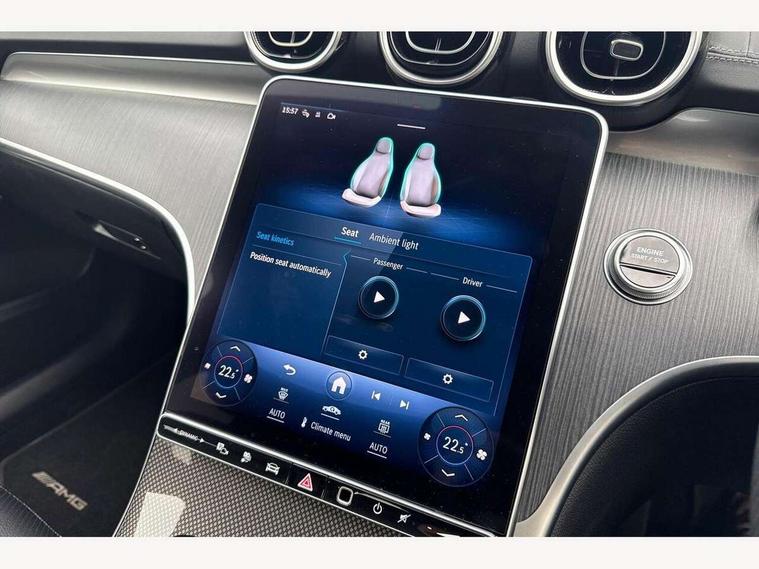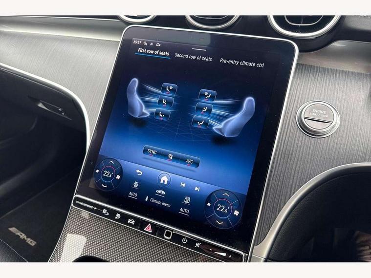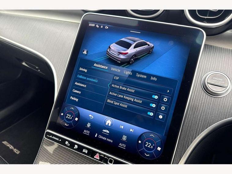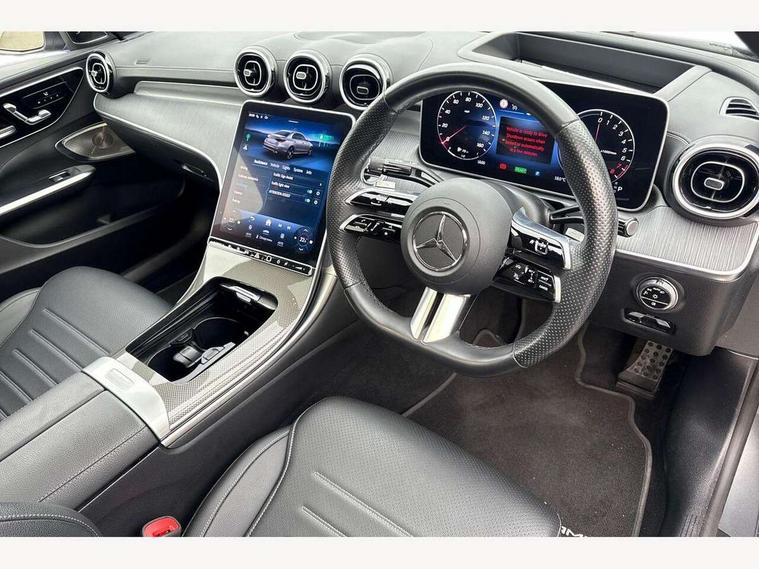 11.9" high resolution multimedia colour display, 12.3" digital instrument cluster display, Acoustic ambient protection, Active blind spot assist, Active brake assist plus, Active lane keeping assist, AMG DYNAMIC SELECT with a choice of driving modes (Slippery, Comfort, Sport, Sport+, Individual), Attention assist, Cruise control with speedtronic variable speed limiter, E-call, Extended MBUX functions, Finger print sensor, Fluorescent jacket for driver, Head up Display, MBUX augmented reality for navigation, MBUX navigation premium, MBUX voice control activated by keywords "Hey Mercedes", Mercedes connect me, Mercedes me remote services, Outside temperature gauge, Pre-installation for digital key transfer, Remote boot release, Service indicator (ASSYST), Smartphone integration, Sports direct steer speed sensitive steering, Status display for rear seat belts in instrument cluster, Traffic sign assist, Wireless charging system for mobile devices, 11 kW AC onboard charger, 50l fuel tank with increased capacity, 5m charging cable for household socket (mode 2), 5m charging cable for wall box/public charging stations(mode 3), 66l fuel tank with increased capacity, 9G TRONIC 9 speed automatic transmission, Agility control sports suspension and lowered by 15 mm, Petrol Particulate Filter, Sporty engine sound system, Burmester 3D surround sound system, DAB Digital radio, MBUX multimedia system, Adaptive brake lights, Adaptive high beam assist plus, AMG body styling front apron, rear apron and side skirts, AMG front bumper with sporty air intakes and chrome elements, AMG rear bumper with high gloss chrome elements, AMG side skirts in vehicle colour, B-pillar trim in glossy black, Body coloured bumpers, Body coloured door mirrors, Chrome beltline trim, Daytime running lights, Digital light LED headlights with projection function, Electric panoramic sliding sunroof, Electric windows with one touch opening/closing and obstruction sensors, Electrically adjustable and heated door mirrors, Green tinted glass, Heat insulating dark tinted glass, Illuminated front door sill panels, LED Indicators, LED tail lights, LED third brake light, Noise acoustic glass, Powerdomes on bonnet, Privacy glass, Radiator diamond grille with integrated Mercedes Benz star and louvre silver with chrome pins, Radio aerial integrated into rear window, Rain sensor with automatic windscreen wiper activation, Rear boot, Rear side wing doors, Two visible exhaust pipes integrated into rear bumper, 3 seat bench in 2nd row, 3 spoke flattened bottom AMG multifunction steering wheel in black nappa leather with chrome inserts and perforated leather in grip area, 40:20:40 split folding rear bench seat, AMG sports seats, Artico man-made leather upholstery, Audio and onboard settings control on multifunction steering wheel, Auto Mercedes-Benz child seat recognition sensor, Black air vents with silver chrome elements, Black floor mats with AMG lettering, Black roof liner, Door trim elements high gloss black with silver chrome surroundings and switches, Double cupholder in centre console, Electrically height/reach adjustable steering column, Folding rear seat backrest, Front and rear head restraints, Front centre armrest with storage compartment, Gearshift paddles on steering wheel, Heated front seats, Illuminated door sills with Mercedes Benz lettering, Illuminated glove compartment stowage, Interior lighting - 64 colour Ambient lighting, Overhead control unit in high gloss black, Rear top tether child seat ISOFIX attachment, Single front passenger seat, Sports pedals with stainless steel surfaces and rubber studs, Sunvisors with illuminated vanity mirrors, THERMATIC 2 zone automatic climate control, Interior lighting package - C Class, Memory package - C Class, Mirror pack - C Class, Parking package with 360 degree camera - C Class, Seat comfort pack - C Class, Stowage space pack - C Class, USB package - C Class, USB package plus - C Class, 3 rear 3 point seatbelts, Active bonnet pedestrian safety measure which detects an impact and raises bonnet, Adaptive brake system with HOLD function and brake drying in the wet, Anti-lock braking system (ABS), Black seat belts, Brake calipers with Mercedes-Benz lettering + perforated front brake discs, Child proof door locks, Drivers knee airbag, Drivers pelvis airbag, Dual stage driver/passenger airbags, Electric parking brake, Electronic Stability Programme (ESP), Front centre airbag between driver and front passenger seats, Front side airbags, Larger brake discs on front axle, Rear seatbelt warning indicator, Sports braking system, Tyre pressure monitoring system, Warning triangle and first aid kit, Window airbags for driver, front passenger and rear passenger, Central locking with interior switch, automatic locking and crash sensor with emergency opening function, Chrome surround electric key, Dashcam, Keyless Go, Urban guard vehicle protection - Thatcham Category 1 consisting of breakin, anti-theft alarm system (ATA), interior monitoring and tow away protection, Artico man-made leather dashboard with contrast stitching, Centre console trim in anthracite line structure lime wood, 19" AMG 5 twin spoke light alloy wheels aerodynamically optimised painted in black with high sheen finish, Noise reduced tyre with foam absorber, Summer tyres, TIREFIT with tyre inflation compressor,