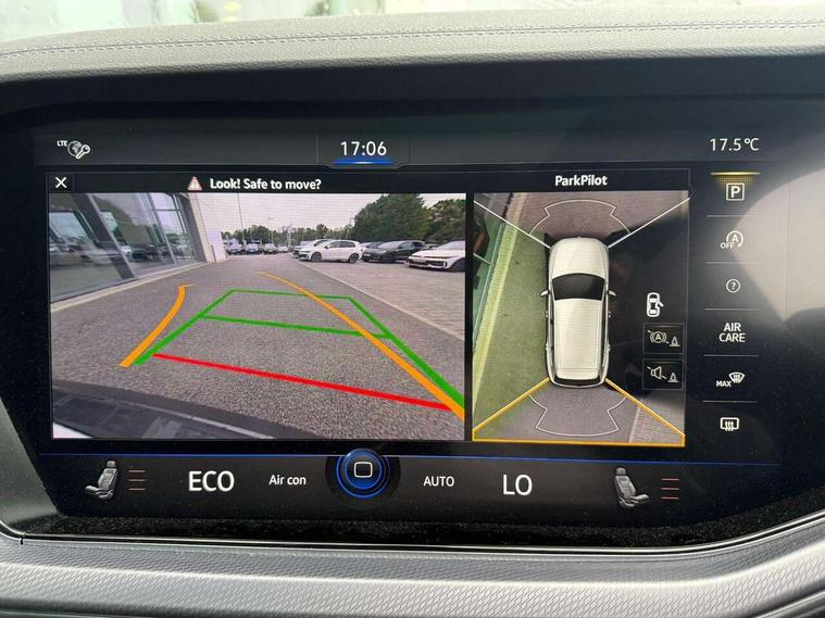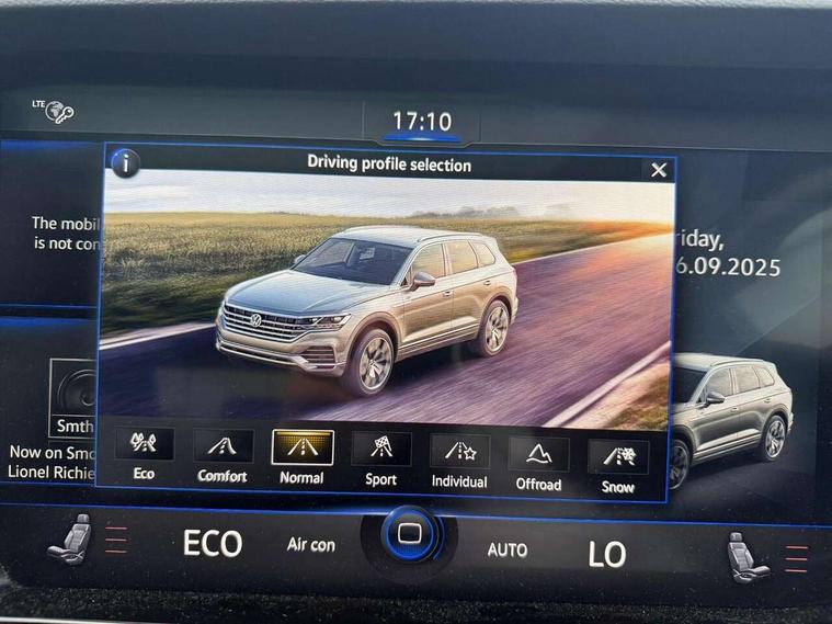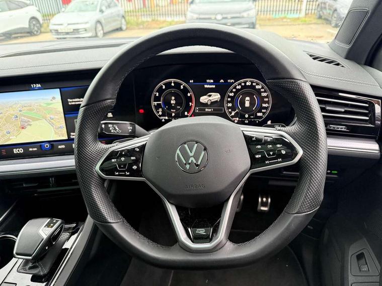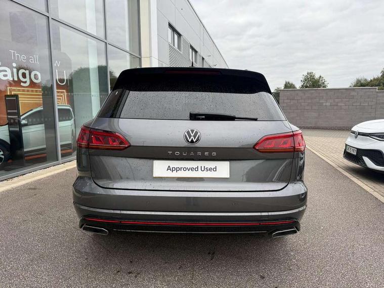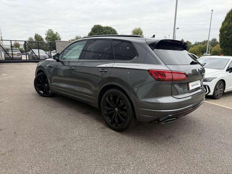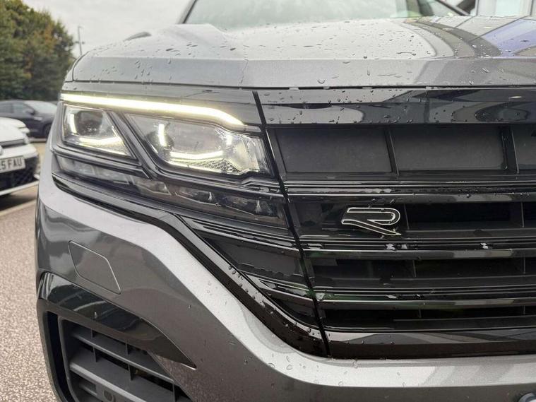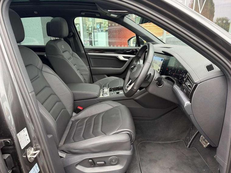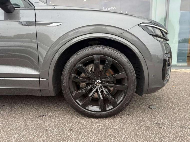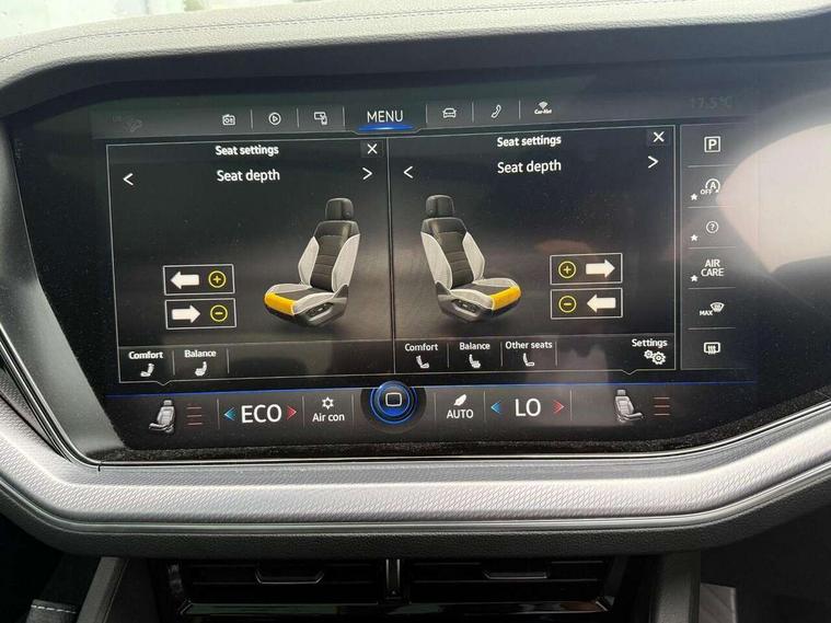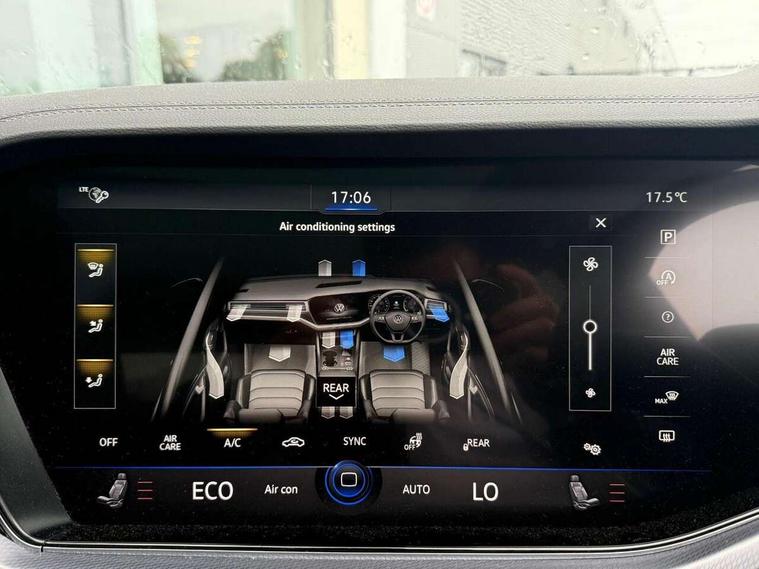 2D/3D map view, ACC - Adaptive cruise control with front assist, forward collision warning, distance monitoring, city emergency brake and speed limiter, Apple car play/Android Auto, Audible and visual fatigue detection system, Bluetooth hands free telephone connection, Car information display, Drive select with Damper control, Driver alert system, Driver profile selection, Dynamic road sign display camera controlled system with visual warning for traffic and road signs, eCall emergency system, Fully electric tailgate + keyless entry and start, Instrument cluster, MirrorLink, Multifunction camera, Multifunction computer premium with 7" colour display, One touch indicators with repeat function, Service interval indicator, Speed sensitive power steering, Start/stop system with regenerative braking, Tailgate power latch, Think blue trainer driver tips and journey analysis, Traffic sign recognition, Voice control system, Wireless Smartphone charger, Torsen limited slip differential, DAB Digital radio, Dynamic navigation based on TMC+, Gesture control for infotainment system, Multi device interface (MDI) with illuminated USB-C connection, Music playback - MP3, WMA and AAC files, SD card slot, Simultaneous pairing of 2 compatible mobile devices, SMS functionality - read, compose and send SMS messages using touch-screen display, Title and cover art display, Volkswagen media control, Adaptive low beam for urban and motorway use, Auto dimming rear view mirror, Automatic coming/leaving home lighting function, Automatic headlights, Black anodised roof rails, Black door mirrors, Black rear diffuser, Black side window surrounds, Black upper and lower grille louvres extending into headlights and radiator grille, Body colour door handles, Body coloured wheel arches, C signature gloss black front air intake, Chromed tailpipe on the left and right integrated in the bumper with trapezoid design, Dusk sensor, Dynamic headlight range control, Electric front tilt/slide panoramic sunroof and fixed rear sunroof, Electrically power adjustable, heated, folding, auto dimming, front passenger exterior door mirror lowering function, Front and rear electric windows, Galvanised body, Gloss black finish B pillar, Gloss black rear diffuser, Headlight washers, Heat insulating darkened glass in side and rear windows, Heated windscreen washer jets, IQ.Light-LED matrix headlight, daytime running light with dynamic cornering light and indicator, LED 3rd brake light, LED rear fog light, LED rear number plate lights, Plastic scuff plates in door apertures, Poor weather light, Puddle lights, Rain sensor, Rear side wing doors, Rear wiper, 12V socket in front and rear centre console and boot, 2 Coat hooks on B pillar, 3 rear head restraints, 3 seat bench in 2nd row, 3 spoke sport heated leather multi-function sports steering wheel with gear shift paddles - generation 2, 4 way adjustable front head restraints, 4 way electric lumbar support for driver and front passenger, 4 zone climate control, 40:20:40 split folding slide/recline rear seat, B pillar vents, Black lower edge of door extending sills, Branded points of interest, Double sun visor for drivier and passenger with LED illuminated vanity mirrors, Electric luggage compartment cover, Folding rear centre armrest with 2 cupholders, Front + rear carpet mats, Front centre armrest with storage box, Gear shift indicator, Height/reach adjust steering wheel, Illuminated air conditioned glovebox, Isofix preparation for 2 rear child seats, Jack and tool kit, Leather trimmed gear knob with gloss black inlay/aluminum trim, Leatherette door trim, LED luggage compartment lighting, Load through provision, Luggage compartment with load lashing rings, Plastic loading edge protection, Rear seat remote release levers, Single front passenger seat, Soul black headlining, Stainless steel pedals, Innovision cockpit pack - Touareg, 3 point front seatbelts with pre-tensioners, ABS, Active bonnet, Automatic post collision braking system, Curtain airbags, Driver/Front Passenger airbags, EBD + Brake Assist, EDL, Electronic parking brake with auto hold, ESC with ASR, Front seat side impact airbags, Hill descent control, Hill start assist, Passenger airbag deactivate switch, Seatbelt warning lamp and buzzer, Three 3 point rear seatbelts, Two tone horn, Volkswagen roadside assistance, Warning triangle and first aid kit, Alarm with interior monitoring in cab, backup horn and towing protection, Child security locks for front and rear doors, Electronic engine immobiliser, Remote central locking, Black decorative trims on the side windows, High gloss black centre console,
