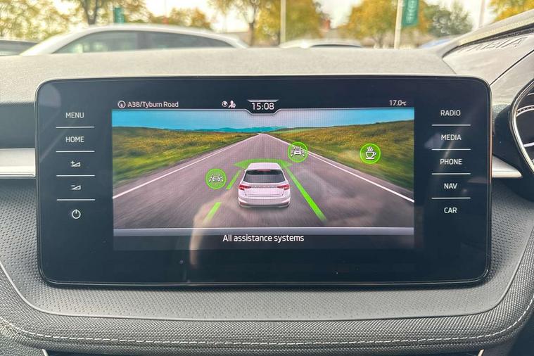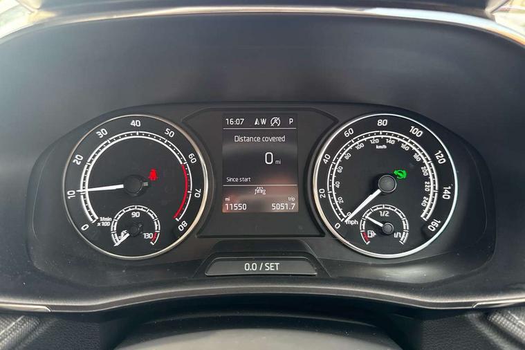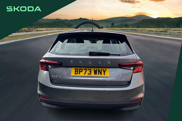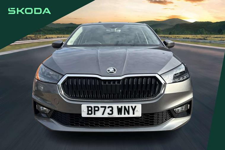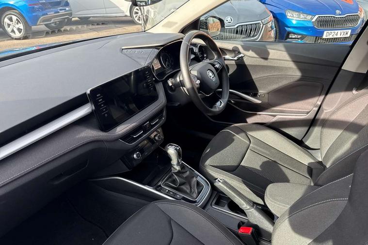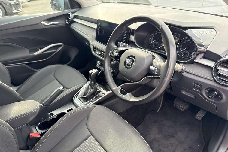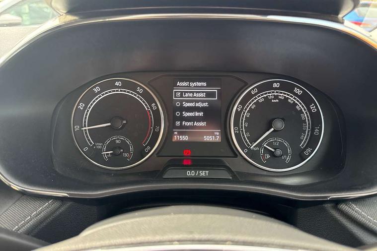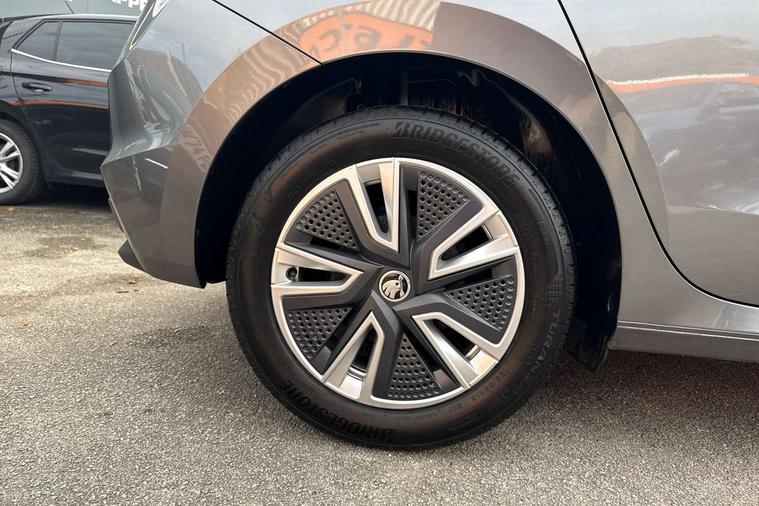 Bluetooth connection, Driver alert system - DAS, Electromechanical power steering, Exterior temperature gauge, Service interval indicator, 2x USB-C in the front (for data transmission and charging), 6 Speakers (4 in front and 2 in rear), Auxiliary socket for external MP3 player, DAB digital radio reception, Web radio, Auto dimming rear view mirror, Basic LED Headlights, Body colour door mirrors, Body coloured bumpers, Chrome window surround, Door mirror integrated indicators, Electrically adjustable and heated door mirrors, Front and rear electric windows, Front fog lights, Front window wiper intermittent control, Headlight range control - Automatic, Ice scraper in fuel cap, LED daytime running lights with coming and leaving home feature, Rain sensor, Rear LED fog light, Rear side wing doors, Rear window wiper with washing nozzles, Roof mounted spoiler, SKODA tailgate lettering in chrome, Third brake light, 3 rear headrests, Backrest split and folding, Central console with fixed cup holder and storage box, Chrome handbrake release button, Comfort seats, Fabric upholstery, Front centre armrest, Gearshift knob/handle in leather, Hand brake lever handle in leather, Height adjustable front headrests, Height adjustable front seats, Height adjustable steering wheel, ISOFIX and TopTether anchorage points to the outer rear seats, ISOFIX and TopTether on the front passenger seat, Luggage compartment lighting, Manually adjustable lumbar support in front seats, Pollen filter, Rear seat bench unsplit, Removable cup holder, Single front passenger seat, Storm grey headlining, Sun visors with mirror and airbag label on passenger side, Textile floor mats, Ticket holder, Umbrella in drivers door, 3-point height adjustable front seats belts with pretensioner and force limiter, Automatic warning lights in case of crash, Driver and passengers airbag with switch off function, e-Call+, ESC including ABS, MSR, ASR, EDS, HBA and XDS, Front and rear seat belt warning, FRONT ASSIST (AEB City and AEB Inter Urban), Front side airbags, Head airbags, Hill hold assist, One tone horn, Pedestrian protection, Three rear 3-points safety seat belts with pretensioner and force limiter including stop function for outer rear seat belts, Tyre pressure monitoring system, Anti-theft alarm system including immobiliser, interior monitoring, backup horn, and towing protection, Central locking with radio remote control, interior controls, SAFE function and 2 foldable keys, KESSY - Keyless engine start/stop, Chrome edged air vents, Satin black door and side trim panel in front, Anti-theft wheel bolts protection, Super-low rolling resistance tyres,
