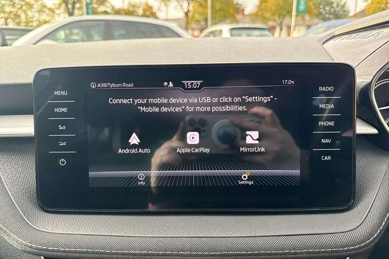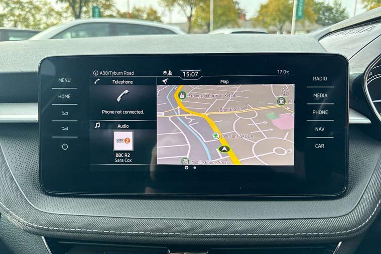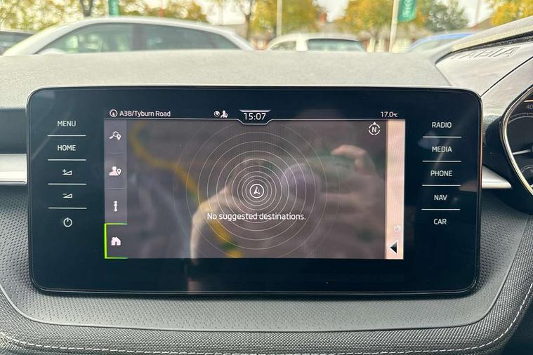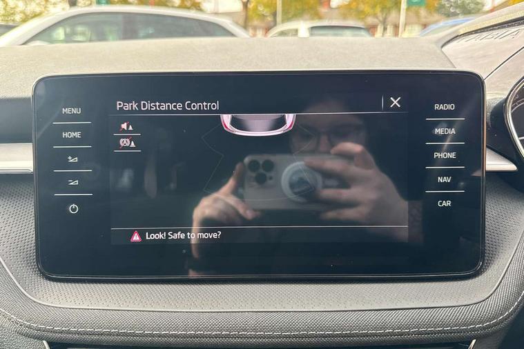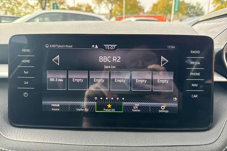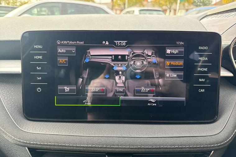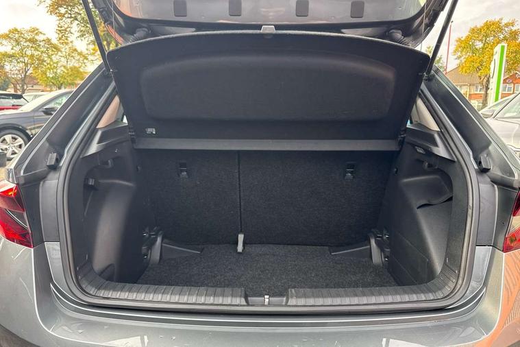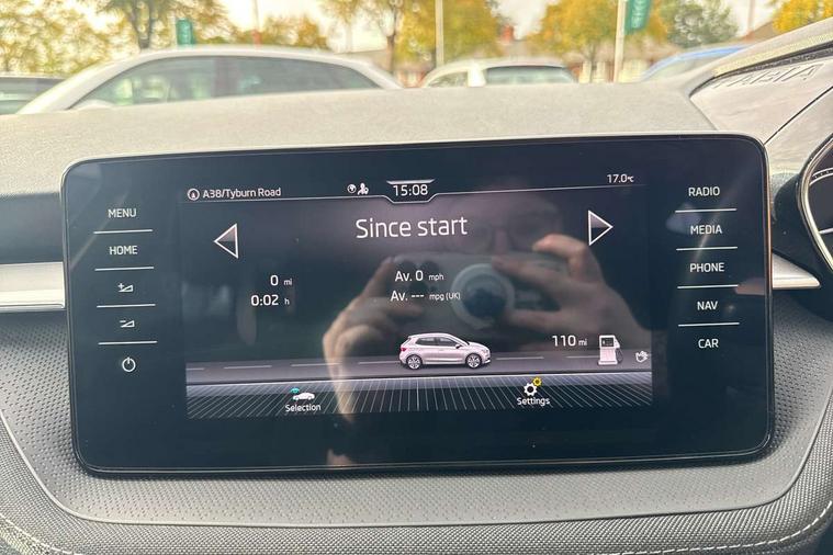 Bluetooth connection, Driver alert system - DAS, Electromechanical power steering, Exterior temperature gauge, Service interval indicator, 2x USB-C in the front (for data transmission and charging), 6 Speakers (4 in front and 2 in rear), Auxiliary socket for external MP3 player, DAB digital radio reception, Web radio, Auto dimming rear view mirror, Basic LED Headlights, Body colour door mirrors, Body coloured bumpers, Chrome window surround, Door mirror integrated indicators, Electrically adjustable and heated door mirrors, Front and rear electric windows, Front fog lights, Front window wiper intermittent control, Headlight range control - Automatic, Ice scraper in fuel cap, LED daytime running lights with coming and leaving home feature, Rain sensor, Rear LED fog light, Rear side wing doors, Rear window wiper with washing nozzles, Roof mounted spoiler, SKODA tailgate lettering in chrome, Third brake light, 3 rear headrests, Backrest split and folding, Central console with fixed cup holder and storage box, Chrome handbrake release button, Comfort seats, Fabric upholstery, Front centre armrest, Gearshift knob/handle in leather, Hand brake lever handle in leather, Height adjustable front headrests, Height adjustable front seats, Height adjustable steering wheel, ISOFIX and TopTether anchorage points to the outer rear seats, ISOFIX and TopTether on the front passenger seat, Luggage compartment lighting, Manually adjustable lumbar support in front seats, Pollen filter, Rear seat bench unsplit, Removable cup holder, Single front passenger seat, Storm grey headlining, Sun visors with mirror and airbag label on passenger side, Textile floor mats, Ticket holder, Umbrella in drivers door, 3-point height adjustable front seats belts with pretensioner and force limiter, Automatic warning lights in case of crash, Driver and passengers airbag with switch off function, e-Call+, ESC including ABS, MSR, ASR, EDS, HBA and XDS, Front and rear seat belt warning, FRONT ASSIST (AEB City and AEB Inter Urban), Front side airbags, Head airbags, Hill hold assist, One tone horn, Pedestrian protection, Three rear 3-points safety seat belts with pretensioner and force limiter including stop function for outer rear seat belts, Tyre pressure monitoring system, Anti-theft alarm system including immobiliser, interior monitoring, backup horn, and towing protection, Central locking with radio remote control, interior controls, SAFE function and 2 foldable keys, KESSY - Keyless engine start/stop, Chrome edged air vents, Satin black door and side trim panel in front, Anti-theft wheel bolts protection, Super-low rolling resistance tyres,