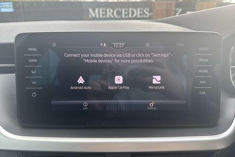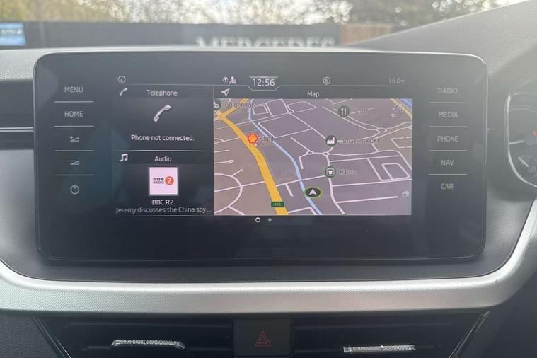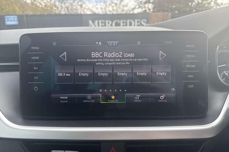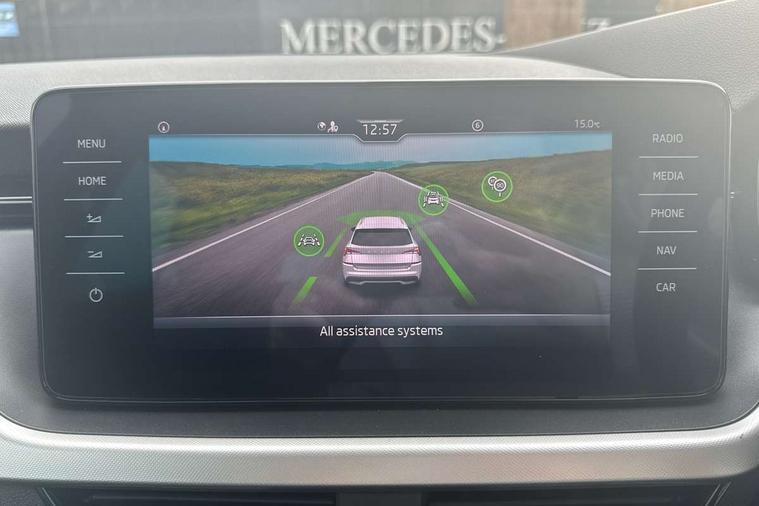 Amundsen satellite navigation with 9.2" glass colour touchscreen display, web radio, voice control and traffic sign recognition, Bluetooth system, E-call, Front assist system, Gesture control, PAS, Service indicator, Speed limiter, Wireless SmartLink for apple car play, android auto and mirrorlink, 8 Speakers, Auxiliary input socket, DAB Digital radio, Body colour bumpers, Body colour door mirrors and handles, Chrome grille surround, Dimming rear view mirror with black surround, Electrically adjustable and heated door mirrors, Front and rear electric windows, Headlight range control, Heated rear window, LED rear lights - low functionality, LED third brake light, Light sensors, Privacy glass, Rain sensor, Rear fog lights, Rear side wing doors, Rear wiper, 12V Accessory socket in centre console, 3 seat bench in 2nd row, Chrome inner door handles, Cloth upholstery, Front head restraints, Glove compartment with illumination, Height adjustable driver and front passenger seats - manual, Ice scraper, Isofix child seat fittings on outer rear seats, ISOFIX on front passenger seat, Manual lumbar support for front seats, Rake/reach adjustable steering wheel, Reading lights, Single front passenger seat, Sun visors with illumination on front passenger, Textile floor mats, Third rear headrest, Top tether for front passenger seat, Umbrella in driver's door, 3x3 point rear seatbelts, Airbags - driver and front passenger, ESP, Front passenger airbag deactivation switch, Front side airbags with curtain airbags, Hill hold control, Manual parking brake, Manual rear child locks, One tone horn, Rear disc brakes, Seatbelt reminder for driver an co-driver, Traction control, Tyre pressure monitor, Anti-theft alarm system with interior monitoring, backup horn, towing protection and remote central locking with SAFE system, Anti-theft wheel bolts, Electronic engine immobilizer, Silver haptic decorative insert on the dashboard with hot stamping in glossy black,