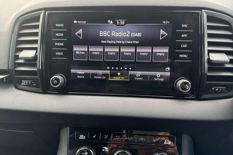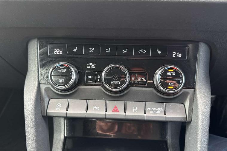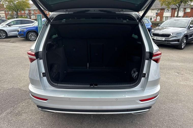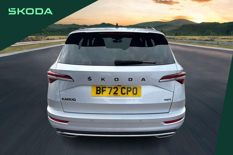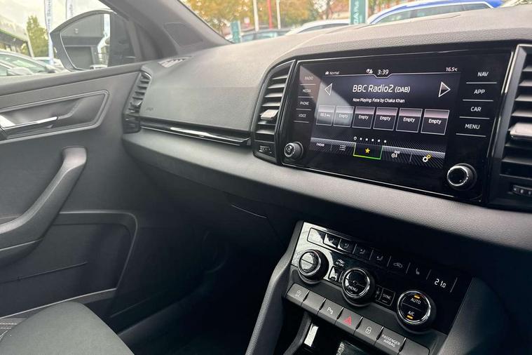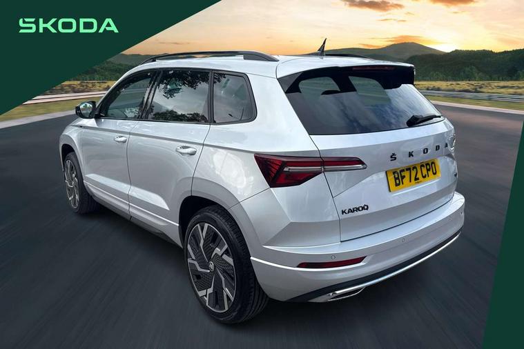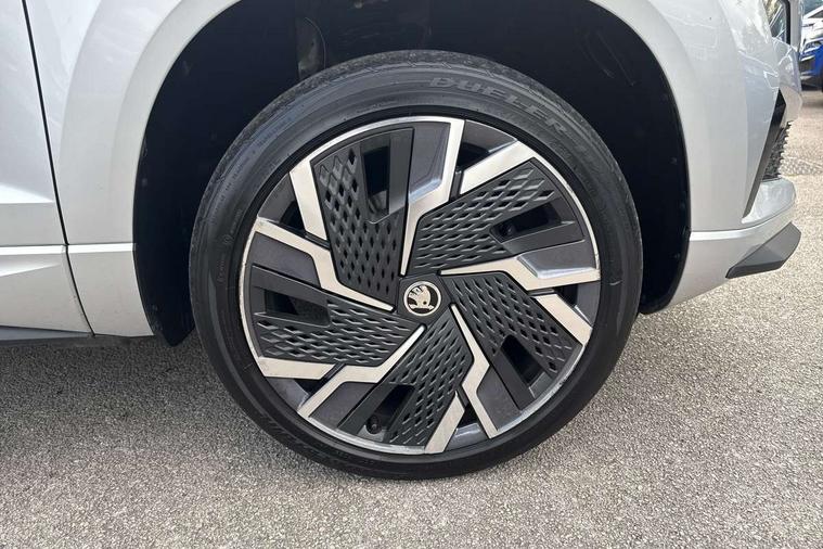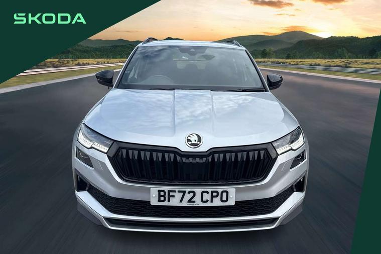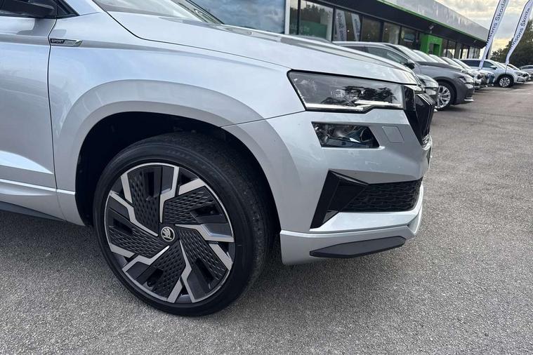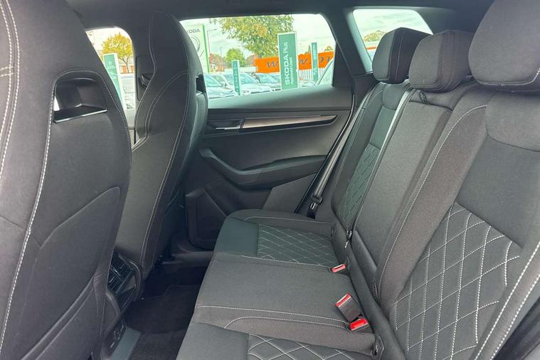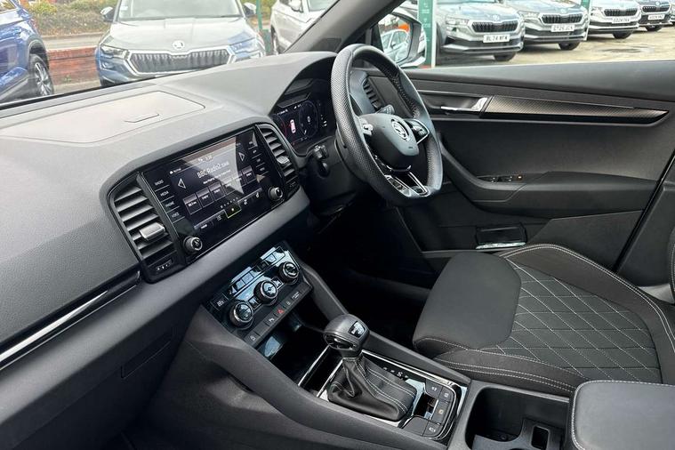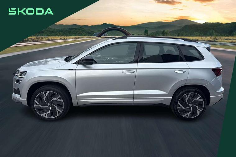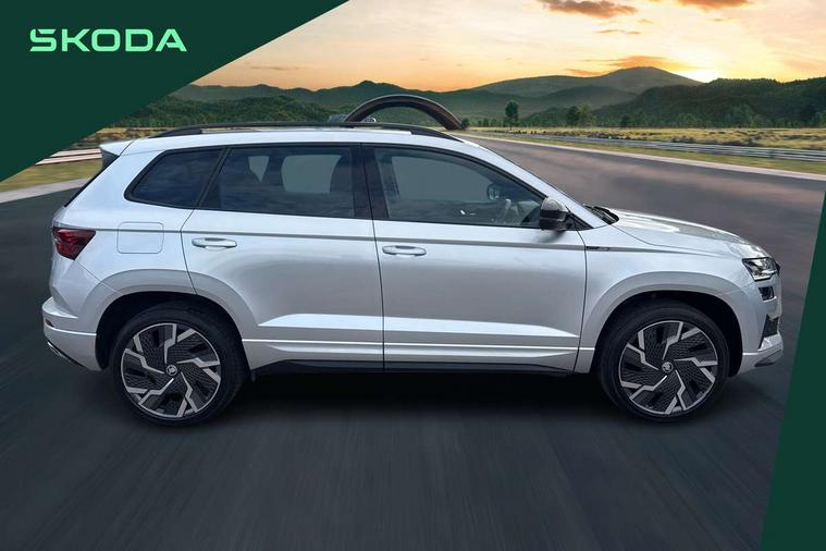 8" Digital display, Care connect, Colour multifunction trip computer, Driver fatigue sensor, Emergency services call system, Outside temperature gauge, Service interval indicator, SmartLink wireless for Apple and wired for Android, Start/stop system with regenerative braking, USB C Port x 2 in front centre console, Virtual pedal with electrically operated boot door, 8 Speakers, DAB radio with Bluetooth, USB connection, Acoustic glass, Aero front windscreen wipers with intermittent function, Auto dimming rear view mirror with light and rain sensors, Automatic headlight control system, Black door mirrors, Black electric window control buttons, Black radiator grille, Black roof rails, Body colour door handles, Electric front and rear windows with child proof lock, Front door steps with SportLine logo, Heated rear windscreen, LED daytime running lights, LED rear lights with high functionality welcome effect and dynamic indicators, Light assistant (coming/leaving home/tunnel light), Panoramic sliding sunroof, Plastic scuff plates, Privacy glass, Protective door side sills in body colour, Rear diffuser, Rear side wing doors, Rear spoiler, Rear window wiper with washer system and intermittent control, Safety reflectors on front doors, Skoda lettering on tailgate in black, Sportline badge on front fender, Sportline decorative inserts with badging, Sports front and rear bumpers, 1.5 litre bottle holders in driver and front passenger door panels, 12V socket in boot, 12v socket in front centre armrest with storage compartment and rear air vents, 2 Folding hooks and nets in boot, 3 rear height adjustable headrests, 3 seat bench in 2nd row, 3 spoke leather sports multifunction steering wheel and silver stitching with gear shift paddles, 4 foldable roof handles with rear coat hooks, Black floor carpet, Black roof headlining, Chrome inner door handles, Double sided boot floor, Foldable hooks in the boot, Front head restraints, Height adjustable front three point seats belts with tensioners, Height/reach adjust steering wheel, Ice scraper, Illuminated glovebox, Illuminated luggage compartment, Interior noise suppression, Isofix child seat preparation outer rear, Manual lumbar support for front seats, Pen holder, Pollen filter, Rear boot cover, Rear reading lights, Rear seats fixed folding and divided 60:40, Rubbish bin door, Safety vest holder, Single front passenger seat, Storage box in upper central dashboard closed, Sunvisors with illuminated vanity mirrors, Textile floor mats, Ticket holder, Titan black interior ceiling, Welcome animation with sportline logo, Light Pack - Karoq, Parking pack - Karoq, Automatic door unlocking in case of crash, Automatic fuel cut off in case of crash, Child locks on rear doors, Driver airbag, Electronic parking brake with auto hold function, Emergency rear braking signal, ESC including ABS, MSR, ASR, EDS, HBA, DSR, RBS, MKB and traction control, Front side airbags, Hill hold control, Knee airbags, Passenger airbag with switch-off function, Pedestrian monitor, Seatbelt reminder signalisation and pretensioner for all seats, Three point seatbelts rear, Two tone horn, Tyre pressure display, Tyre pressure monitor, Alarm with interior monitoring, back up horn and tilt sensor with safe function, Electronic engine immobiliser, Keyless entry and start/stop, Remote central locking with 2 remote folding keys, Black air vent surround, Black centre console, Satin black dashboard, Satin black door trim, 19" Sagitarius anthracite alloy wheels with matt black aero inserts, Anti-theft wheel bolts protection, Matt black aero hub caps, Storage on wheel cover, Tool kit,