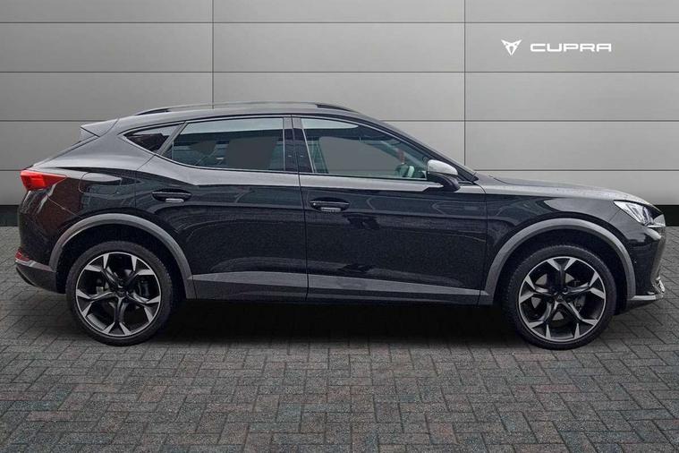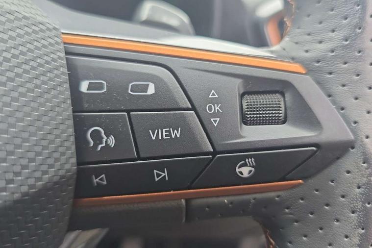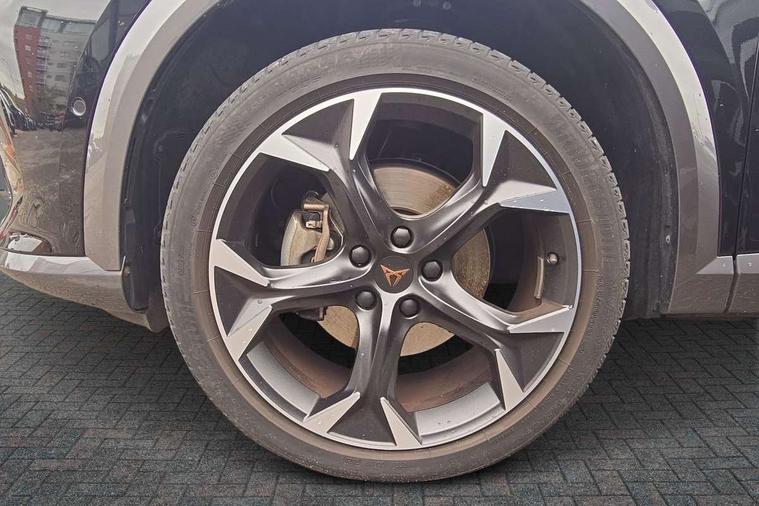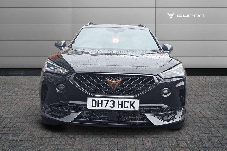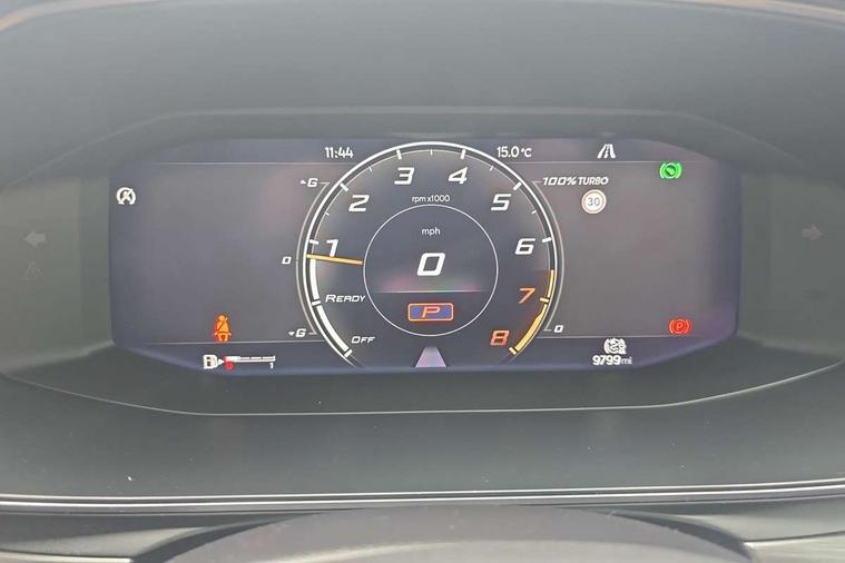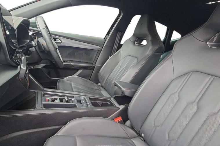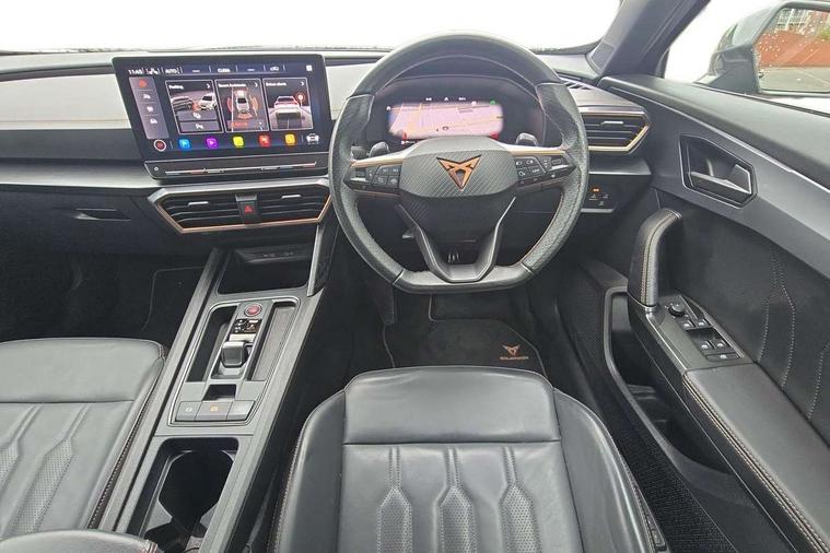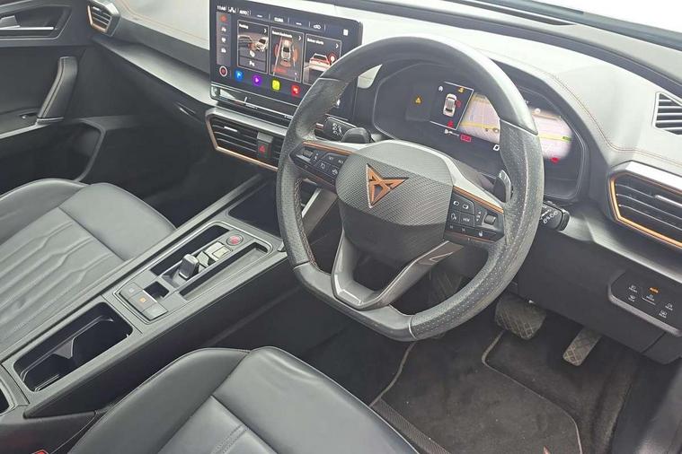 Digital cockpit and configurable dashboard, Driver alert system, Driving profile selection, Forward collision warning with automatic braking, Lane assist, Navigation system with 12'' Touchscreen Display, Park assist (inc front/rear parking sensors), PAS, Predictive adaptive cruise control with speed limiter, Rear view camera, RPM, trip computer, outside temp gauge, instrument light brightness, low fuel warning light, lights on reminder, gearshift indicator, Service interval indicator, Start/stop system with regenerative braking, Voice control system, Wired Android Auto, Wireless apple carplay, Wireless phone charger, Electronic locking differential and dynamic traction support, Standard suspension, 2 front and 2 rear USB type C sockets, Auxiliary input socket, DAB radio, Auto dimming rear view mirror, Body colour door handles, Body coloured bumpers, Dark grey wing mirror, Daytime running light with automatic headlight control and coming home feature, Dynamic headlight range control, Electric front/rear windows, Electrically adjustable heated and folding door mirrors with memory function, Front fog lamps with cornering function, Gloss black roof rails and window surrounds, LED Headlights, LED Taillights with dynamic indicator, Rain sensing wipers, Rear diffuser with black simulated exhaust pipes, Rear side wing doors, Rear wash/wipe, Third brake light, Tinted rear windows, Welcome lights, 12v power supply in centre console, 12V socket, 12v socket in loadspace, 2 front and 2 rear reading lights, 230V socket, 3 seat bench in 2nd row, 60/40 split rear bench seat with armrest and mechanical seat release, Black headlining, Dust/pollen filter, Front and rear head restraints, Front centre armrest, Height/reach adjust steering wheel, Illuminated interior front door sills, Illuminated sunvisor with mirror, Isofix, Leather multi function heated steering wheel with gear shift paddles, Luggage tie-down hooks, Single front passenger seat, Three zone climate control with control panel in rear, Variable luggage/load compartment floor, Wraparound lighting, Genuine Nappa leather Pack - Cupra, 3 point seatbelts on all rear seats, ABS, Brake control system - ESC and brake booster, Child proof door locks, Driver and front passenger airbags with front passenger airbag de-activation, Electronic parking brake, Front and rear disc brakes, Front side curtain airbags, Hill hold control, Public e-call, Seat belt reminder for front and rear seats, Tyre pressure monitoring system, Anti theft alarm system, Keyless entry and start system (KESSY), Locking wheel bolts, Copper and aluminium interior detailing, 19" 'Exclusive' machined sport matte black and silver alloy wheels,