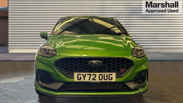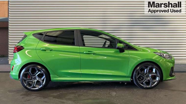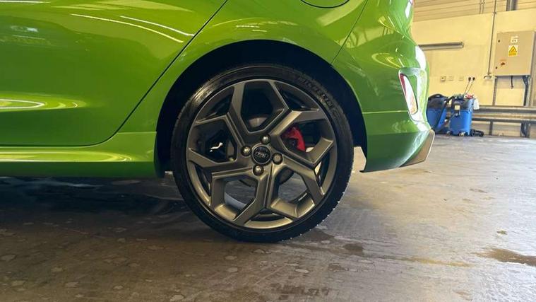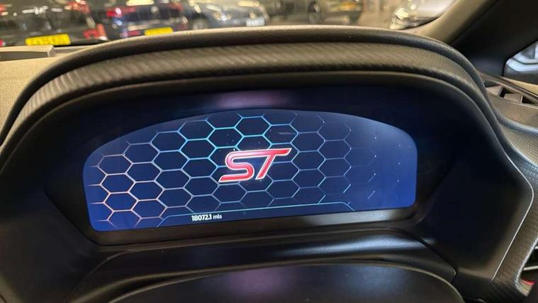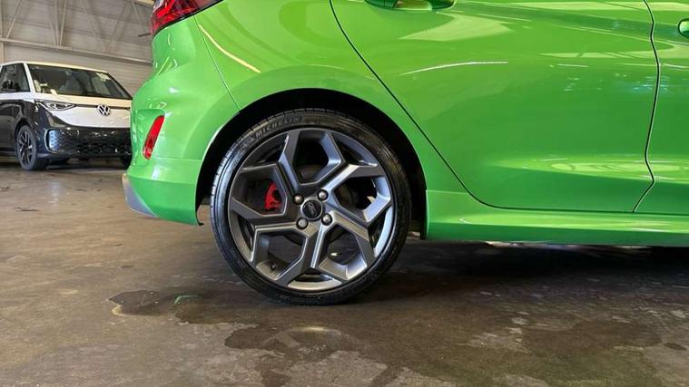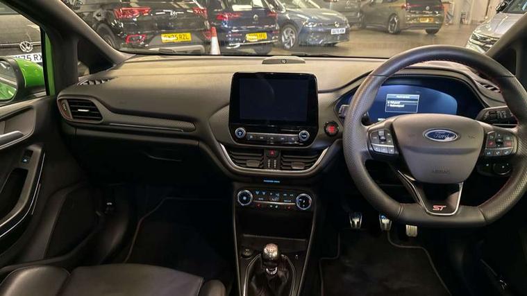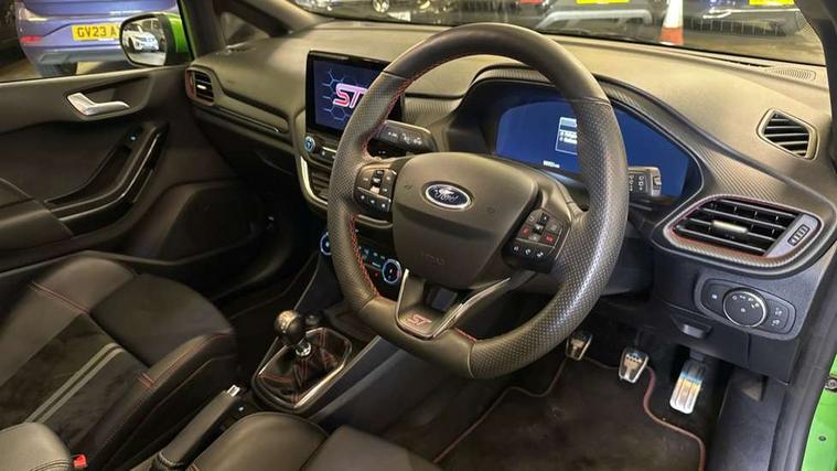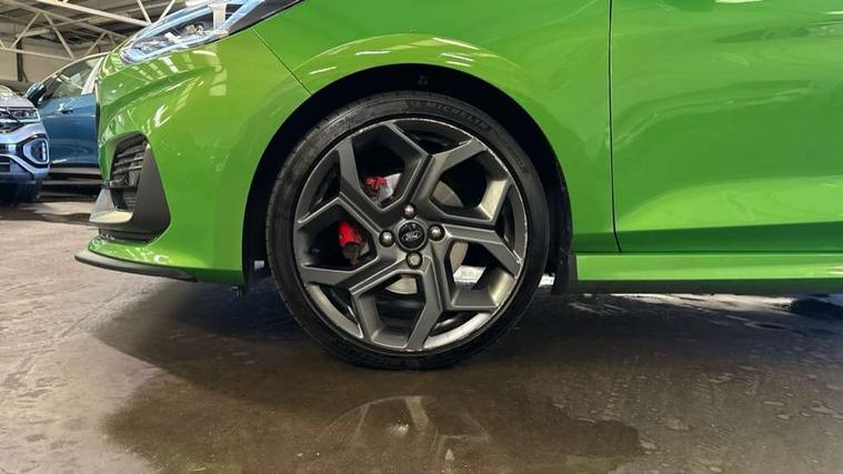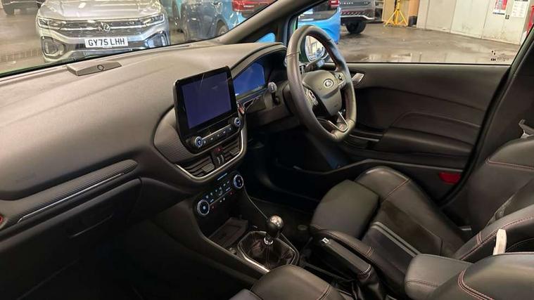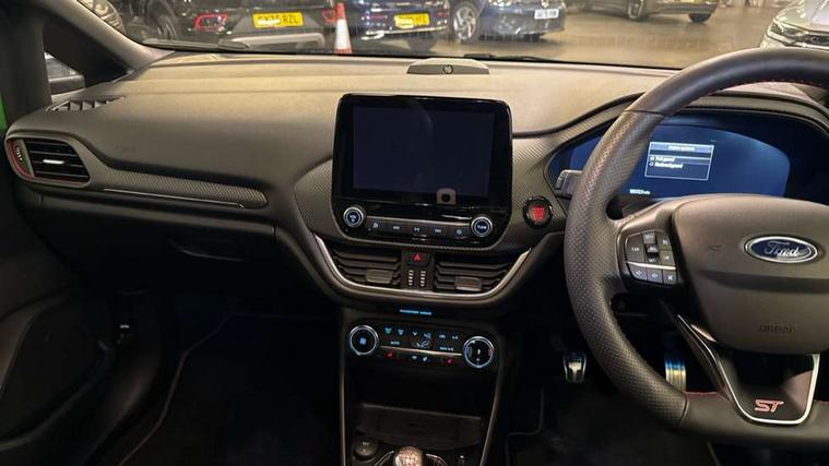Cruise control with adjustable speed limiter and intelligent speed assist, Driver alert system, Electric power steering, Ford easy fuel, Lane keep assist, Lane keeping aid, Rear parking distance sensors, Rear view camera, Selectable drive modes (Normal, Sport, Track), Traffic sign recognition, Trip computer, Unique ST suspension, 3rd brake light, Auto high beam, Automatic headlights, Body colour bumpers, Body coloured electrically operated with side indicators, Dual chrome exhaust tailpipe, Electric front windows/one touch facility, Electric rear windows, LED rear lights, Matrix LED headlights with signature LED daytime running lights and integrated sequential indicator, Quickclear heated windscreen, Rain sensing wipers and auto dimming rear view mirror, Rear privacy glass, Rear side wing doors, Rear wiper, Unique ST front grille and bumper, ST rear bumper with diffusor, Unique ST scuff plates, 3 rear headrests, 3 seat bench in 2nd row, 6 way manual driver seat adjust, with lumbar adjust, 6 way manual passenger seat adjust, with lumbar adjust, Adjustable head restraints, Centre console with opening armrest, 2x cupholders, 12v and USB, EATC - Electronic Auto Temperature control, Floor mats with red stitching, Ford Performance sensico partial premium leather upholstery with red stitching, Ford performance sports seats, Leather gear knob with red stitching, Leather steering wheel with red stitching, Seat belts with red detailing, Single front passenger seat, Unique ST soft feel gearknob, Performance pack - Fiesta, 3 point seatbelts on all rear seats, Electronic stability control with hill start assist, Front and rear seat belt warning, Manual child lock in rear doors, Red brake calipers, Tyre pressure monitoring system, Ford keyfree system with Keyless entry and keyless start, Remote central locking, Thatcham alarm with power door dead locks, 18" 5 spoke alloys with magnetite finish,