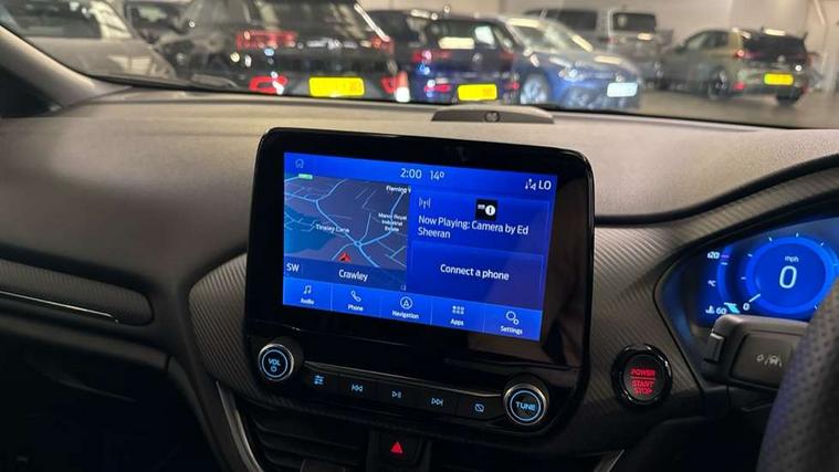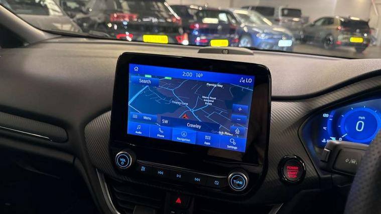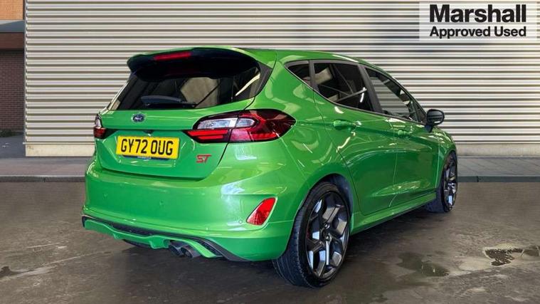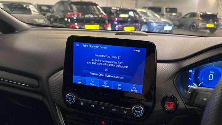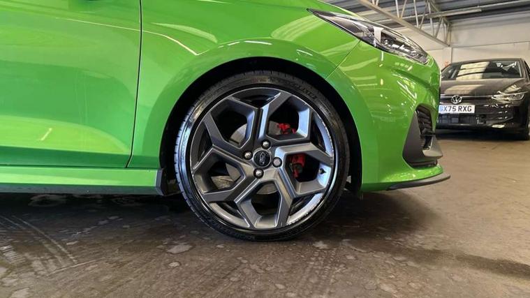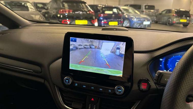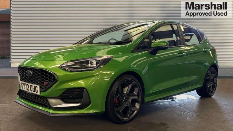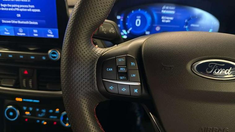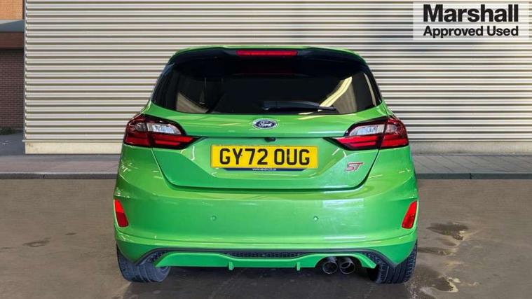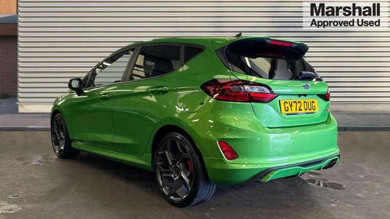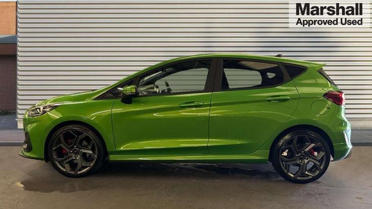 Cruise control with adjustable speed limiter and intelligent speed assist, Driver alert system, Electric power steering, Ford easy fuel, Lane keep assist, Lane keeping aid, Rear parking distance sensors, Rear view camera, Selectable drive modes (Normal, Sport, Track), Traffic sign recognition, Trip computer, Unique ST suspension, 3rd brake light, Auto high beam, Automatic headlights, Body colour bumpers, Body coloured electrically operated with side indicators, Dual chrome exhaust tailpipe, Electric front windows/one touch facility, Electric rear windows, LED rear lights, Matrix LED headlights with signature LED daytime running lights and integrated sequential indicator, Quickclear heated windscreen, Rain sensing wipers and auto dimming rear view mirror, Rear privacy glass, Rear side wing doors, Rear wiper, Unique ST front grille and bumper, ST rear bumper with diffusor, Unique ST scuff plates, 3 rear headrests, 3 seat bench in 2nd row, 6 way manual driver seat adjust, with lumbar adjust, 6 way manual passenger seat adjust, with lumbar adjust, Adjustable head restraints, Centre console with opening armrest, 2x cupholders, 12v and USB, EATC - Electronic Auto Temperature control, Floor mats with red stitching, Ford Performance sensico partial premium leather upholstery with red stitching, Ford performance sports seats, Leather gear knob with red stitching, Leather steering wheel with red stitching, Seat belts with red detailing, Single front passenger seat, Unique ST soft feel gearknob, Performance pack - Fiesta, 3 point seatbelts on all rear seats, Electronic stability control with hill start assist, Front and rear seat belt warning, Manual child lock in rear doors, Red brake calipers, Tyre pressure monitoring system, Ford keyfree system with Keyless entry and keyless start, Remote central locking, Thatcham alarm with power door dead locks, 18" 5 spoke alloys with magnetite finish,