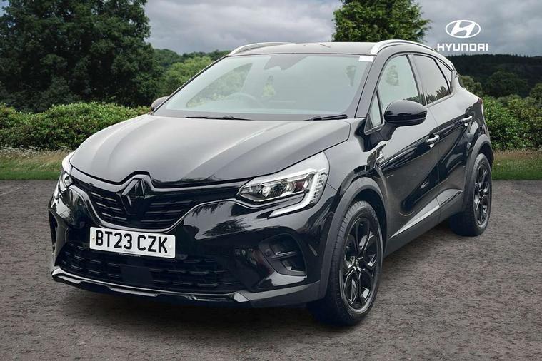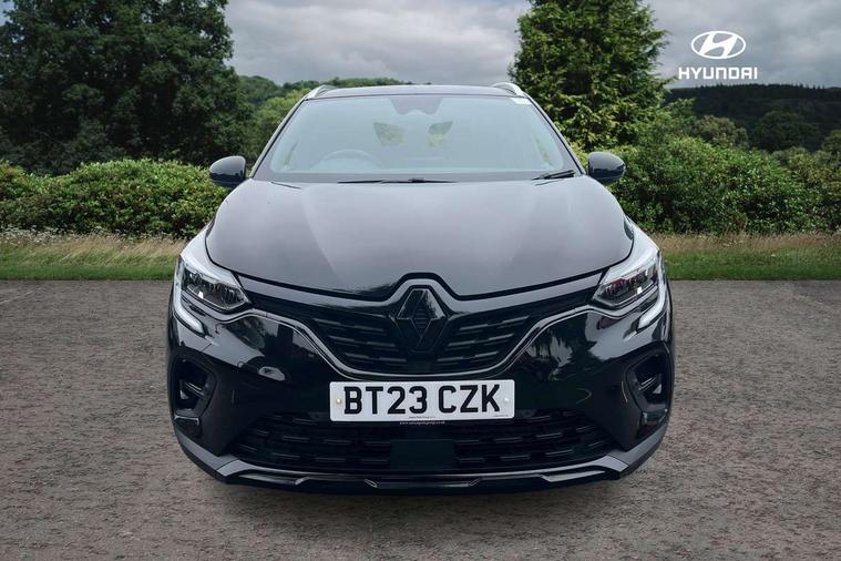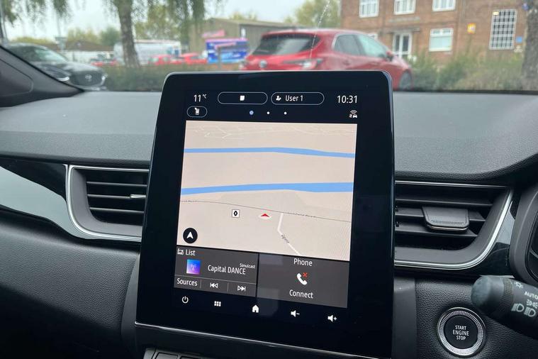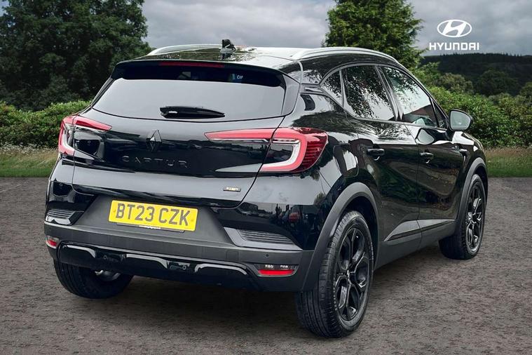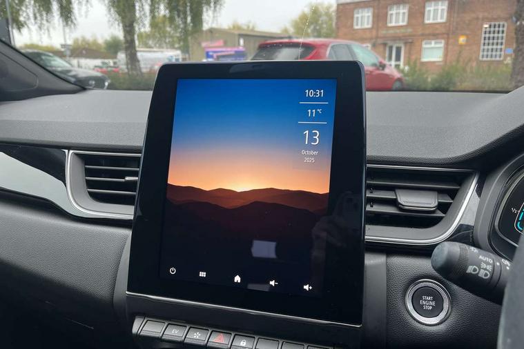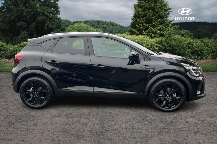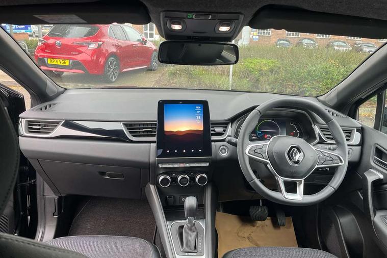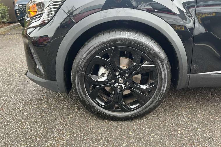 7" TFT Driver information display, Cruise control + speed limiter, EasyLink 9.3" portrait touchscreen with navigation, google search and traffic information, Eco mode, EV button to activate pure mode, Front and rear parking distance sensors, Gear change indicator, Lane departure warning system, Lane keep assist, Multisense with 3 driving modes + 8 ambient lighting colours, Rear view camera, Renault automatic emergency assist, Smartphone integration compatible with Apple CarPlay and Android Auto, Traffic sign recognition with over speed prevention, Trip computer, Variable assistance power steering, DAB Radio with Bluetooth and USB, 2 reverse gear LED lamps and 1 rear LED fog lamp in the bumper, Auto dimming rear view mirror, Automatic front wipers with rain sensors, Automatic headlights, Automatic high/low beam, Black 'Renault' logo at the front and rear with black 'CAPTUR' naming on tailgate, Body colour door handles, Body coloured bumpers, Body coloured door mirrors, C Shaped LED front and rear lighting signatures with 3D effect on the rear lights, Day time running light, Drivers one touch window with anti-pinch feature, Extra tinted glass in rear windows and tailgate, Front and rear electric windows, Front fenders decopart with shinny black insert, Front grille with shiny black upper trim, Full LED headlights with LED rear lights, Gloss black front air intakes surrounds, Gloss black lower door protection, LED high level brake lights, LED rear fog lights, LED turn indicators on door mirrors, Longitudinal roof bars, Rear side wing doors, Rear wiper, Shark fin antenna, Shiny black front and rear skid plate, 12V Accessory socket, 60/40 split and fixed base rear seat bench, Automatic climate control with one touch demist function and air quality regulator, Central rear LED rooflight with 3 reading lights, Dark grey interior roof lining, Front head restraints, Glovebox, Heating system with pollen filter, Height adjustable driver's seat, Height adjustable passenger seat, Height/reach adjust steering wheel, ISOFIX child seat fixing points on rear outermost seats, LED front roof lights, Middle console with armrest and storage, Modular boot floor, Rear air vents, Rear head restraints, Red insert on air vent, Single front passenger seat, Sliding rear bench, Synthetic leather steering wheel, Synthetic leather/cloth upholstery, 3 rear seatbelts, ABS+EBA, AEBS - active emergency braking system, B Brake Mode - One pedal driving with increased regenerative braking, Distance warning alert, Driver and front passenger and 3 rear passengers seatbelt reminder, Driver and front passenger, side, head and curtain airbags, Driver height adjustable seat belt, Electric parking brake with auto hold function, Electronic stability control, Front dash warning indicator in case of heavy braking, Front driver and passenger side airbag deactivation, Hill start assist, Passenger airbag deactivation system, Rear door and window child locking function for rear door, Tyre pressure warning light, Anti drill door locks and locking fuel cap, Central door locking, Deadlocking system, Hands free keycard with push button and start/stop function, RAID (Renault Anti-Intruder Device) automatic door locking, Black soft touch dashboard, Glossy black insert on dashboard, 18" Shiny black pasadena diamond cut alloy wheels,