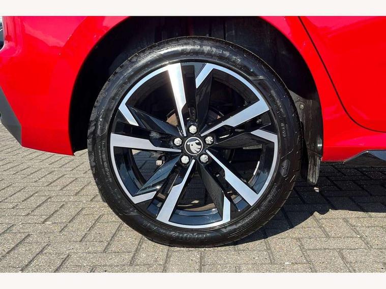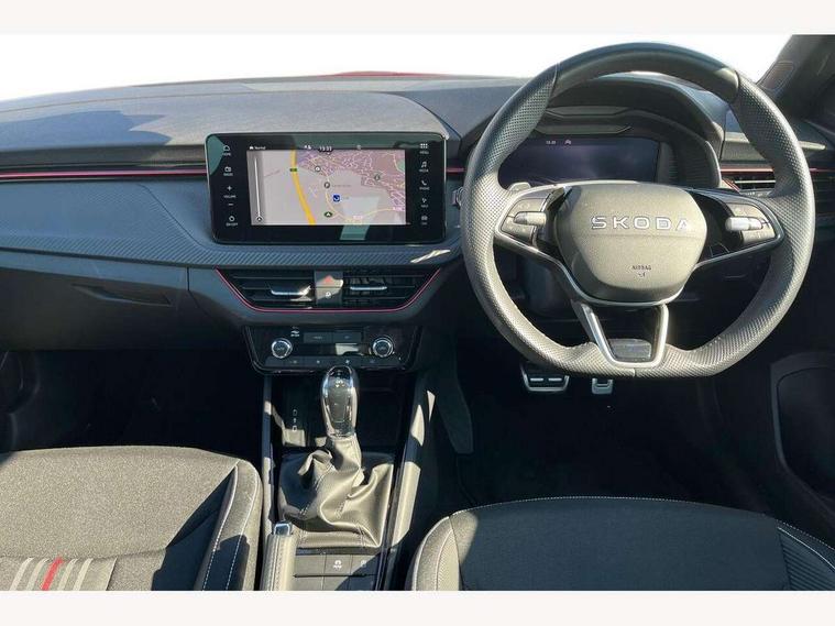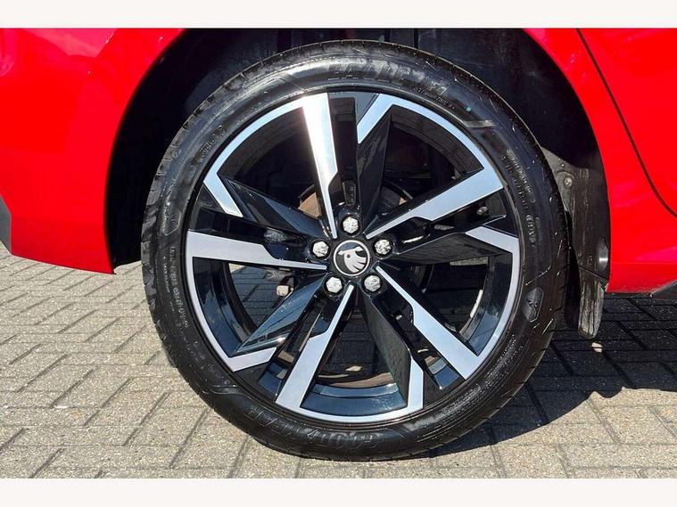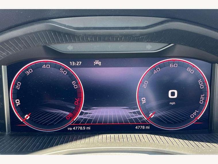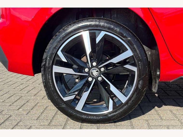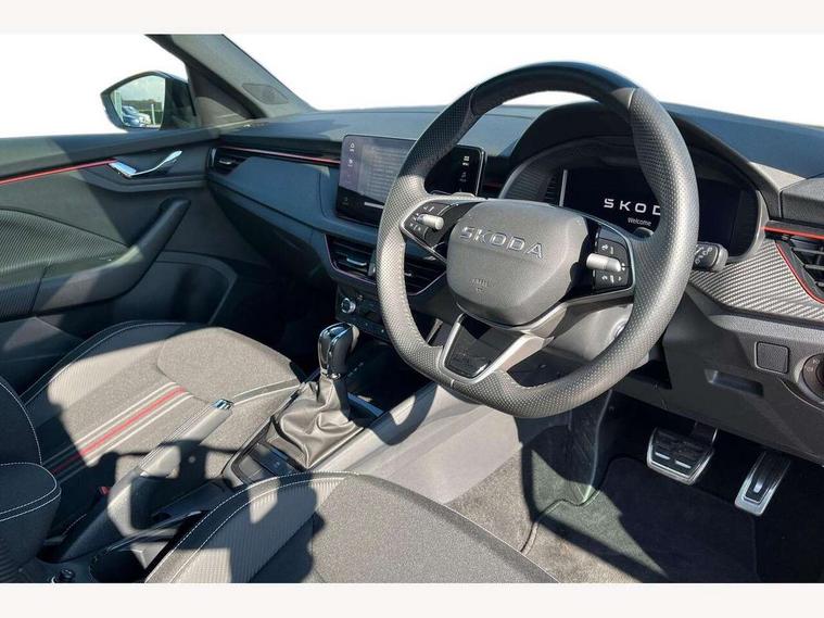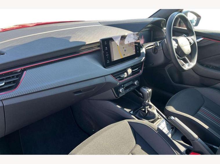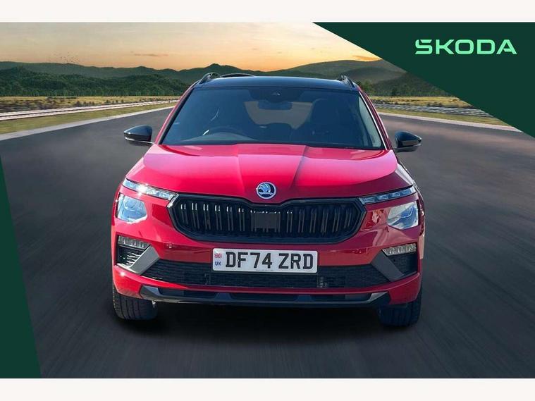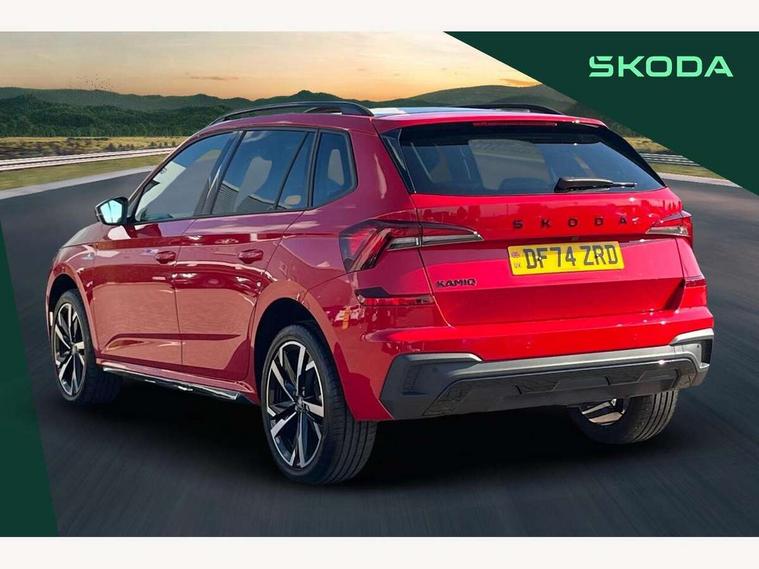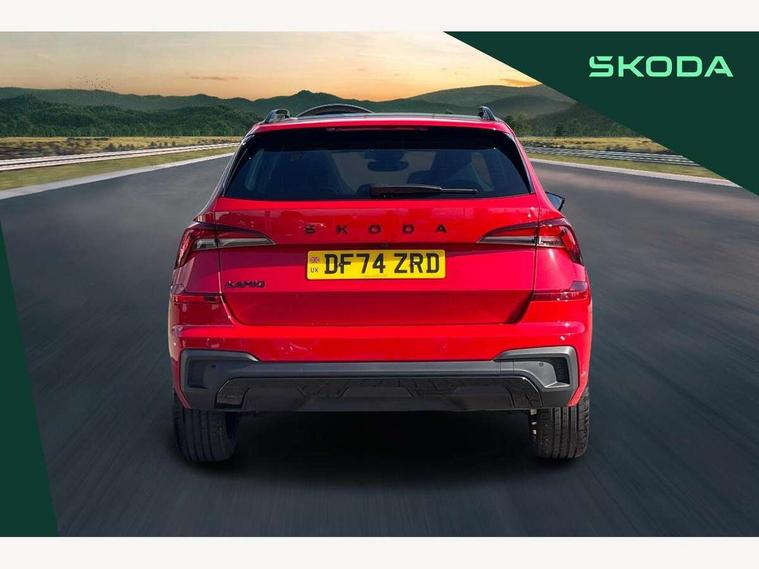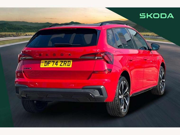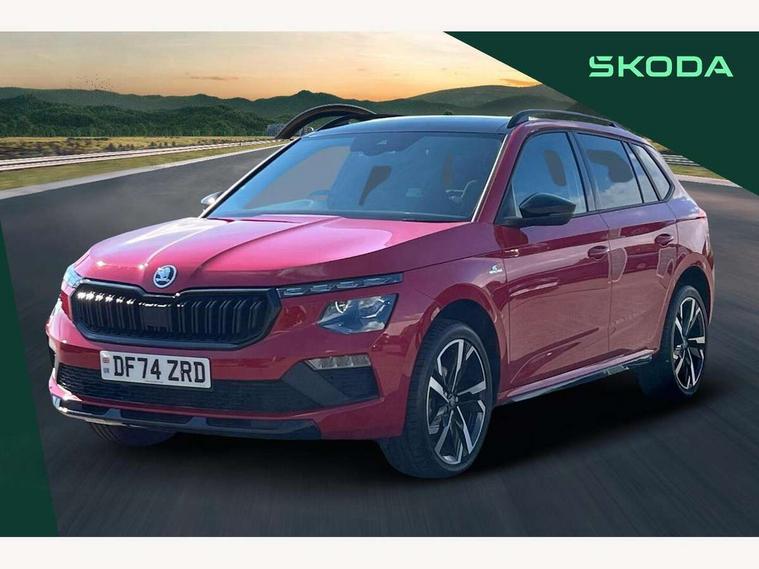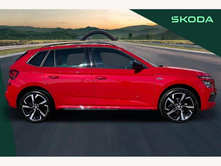Advanced driver attention and drowsiness monitor, Bluetooth system, E-call, Front assist system, PAS, Rear parking sensors, Service indicator, Speed limiter, Traffic sign recognition, Virtual cockpit with 10.25" display, Voice control system, Wireless smartlink, 4 USB C ports, 8 Speakers, 9.2" Skoda navigation display, DAB Digital radio, Auto dimming rear view mirror, Automatic headlight control with coming home and leaving home feature, Black door mirrors, Black radiator grille, Black rear diffuser, Black roof spoiler, Body colour bumpers, Body colour door handles, Boot lettering in black, Extended tailgate glass, Front and rear electric windows, Heated rear window, LED daytime running lights, LED high beam, LED low beam, LED third brake light, Light sensors, Monte carlo plaque, Panoramic sunroof with black roof rails, Privacy glass, Rear side wing doors, Rear wiper, Ticket holder inside windscreen, 12V socket in luggage compartment, 3 seat bench in 2nd row, Aluminium pedals, Ambient lighting in white/red, Art leather carbon decor inserts, Art leather carbon door inserts, Black roof lining, Cargo elements, Chrome inner door handles, Driver and passenger sun visors with vanity mirror, Dual zone climate control, Front and rear roof lights, Front centre armrest, Front head restraints, Glove compartment with illumination, Height adjustable driver seat, Height adjustable front passenger seat, Ice scraper, Inner circulation control with pollen filter, ISOFIX on front passenger seat, Isofix preparation for back seats, Leather gearknob and handbrake lever, Manual lumbar support for front seats, Monte Carlo cloth upholstery, Net package and top tether hooks in boot space, Net under rear shelf, Pocket on the back of both front seats include mobile phone pockets, Rake/reach adjustable steering wheel, Reading lights, Rear centre armrests, Red hotstamping, Single front passenger seat, Sports seats, Textile floor mats, Third rear headrest, Top tether for front passenger seat, Umbrella in driver's door, Light and view plus package - Kamiq, 3x3 point rear seatbelts, Airbags - driver and front passenger, Disc brakes, ESP, Extended and predictive pedestrian/cyclist protection, Front passenger airbag deactivation switch, Front side airbags with curtain airbags, Hill hold control, Manual leather parking brake, Manual rear child locks, One tone horn, Seatbelt reminder for driver an co-driver, Traction control, Tyre pressure monitor, Anti-theft alarm system with interior monitoring, backup horn, towing protection and remote central locking with SAFE system, Anti-theft wheel bolts, Electronic engine immobilizer, 18" Ursa black diamond cut alloy wheels,