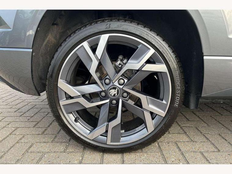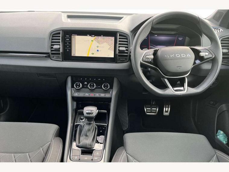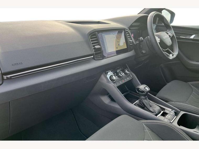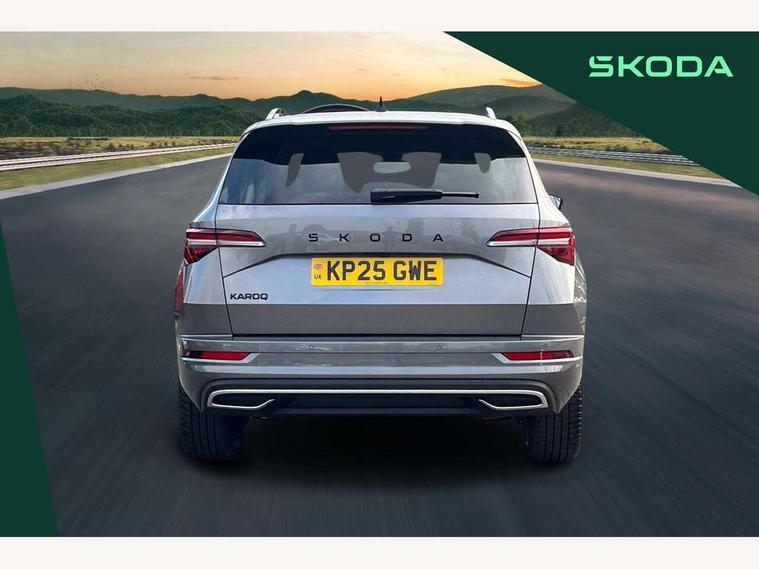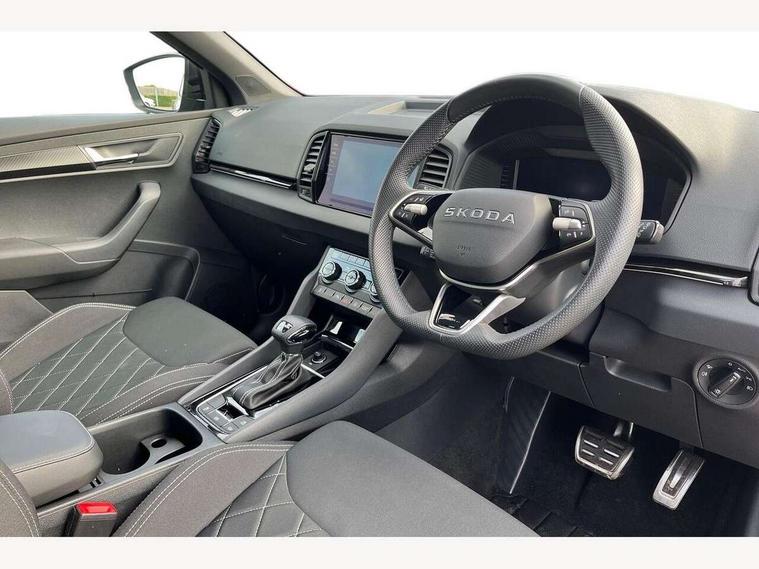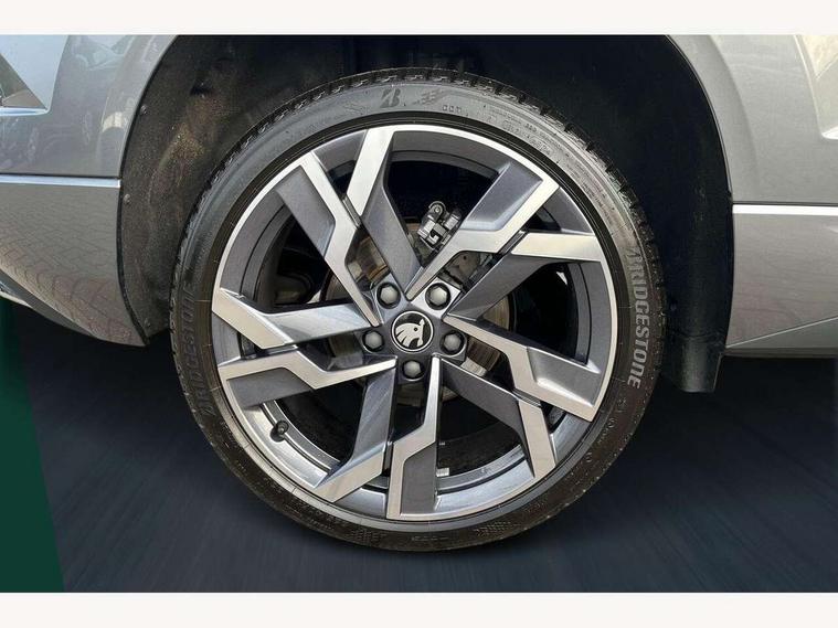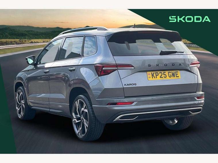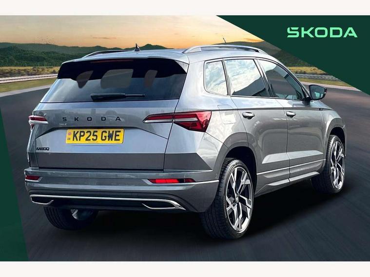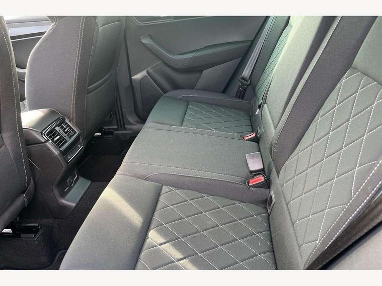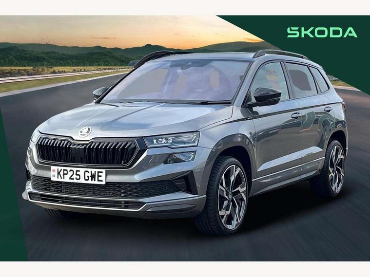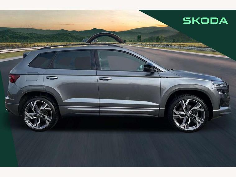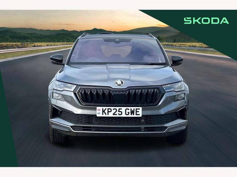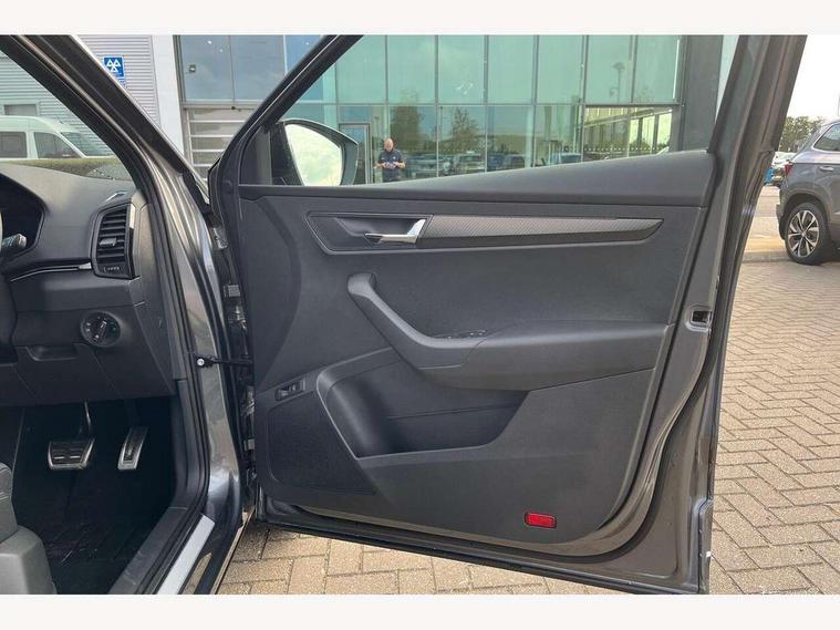 Advanced driver attention and drowsiness monitor, Emergency services call system, Outside temperature gauge, Sensor for driver assistance systems, Service interval indicator, SmartLink wireless for Apple and wired for Android, Start/stop system with regenerative braking, Traffic sign recognition, USB C Port x 2 in front centre console, Virtual Cockpit - 10.25" digital display, Virtual pedal with electrically operated boot door, Wireless smartphone charging, DAB radio with Bluetooth, USB connection, Acoustic glass, Aero front windscreen wipers with intermittent function, Auto dimming rear view mirror with light and rain sensors, Black door mirrors, Black electric window control buttons, Black radiator grille, Black roof rails, Body colour door handles, Electric front and rear windows with child proof lock, Extended rear roof spoiler, Front door steps with SportLine logo, Heated rear windscreen, LED daytime running lights, LED rear lights with high functionality welcome effect and dynamic indicators, Light assistant (coming/leaving home/tunnel light), Panoramic sliding sunroof, Plastic scuff plates in door apertures, Privacy glass, Protective door side sills in body colour, Rear diffuser, Rear side wing doors, Rear window wiper with washer system and intermittent control, Safety reflectors on front doors, Skoda lettering on tailgate in black, Sportline badge on front fender, Sports front and rear bumpers, Third brake light, Unique dark chrome design logo on alloy wheels, 1.5 litre bottle holders in driver and front passenger door panels, 12V socket in boot, 12v socket in front centre armrest with storage compartment and rear air vents, 2 x Tablet holder, 3 rear height adjustable headrests, 3 seat bench in 2nd row, 3 spoke sports leather heated multifunction steering wheel with DSG paddles, 4 foldable roof handles with rear coat hooks, Black floor carpet, Cargo elements in boot, Chrome inner door handles, Foldable hooks in the boot, Front head restraints, Height adjustable front three point seats belts with tensioners, Height/reach adjust steering wheel, Ice scraper, Illuminated glovebox, Illuminated luggage compartment, Isofix child seat preparation for front passenger seat, Isofix child seat preparation outer rear, Manual lumbar support for front seats, Pen holder, Pollen filter, Rear backrest release from boot, Rear boot cover, Rear package tray, Rear reading lights, Rear seats fixed folding and divided 60:40, Rubbish bin door, Safety vest holder, Single front passenger seat, Skoda lettering on steering wheel, Sportline decorative inserts, Storage box in upper central dashboard closed, Sunvisors with illuminated vanity mirrors, Textile floor mats, Ticket holder, Titan black interior ceiling, Umbrella under passenger seat, Under passenger seat storage compartment, Columbus pack - Karoq, LED Interior lighting pack with Skoda welcome logo - Karoq, Light Pack - Karoq, Non Smokers pack, Performance pack - Karoq, Winter plus pack with heated front and rear seats - Karoq, Automatic door unlocking in case of crash, Automatic fuel cut off in case of crash, Driver airbag, Electronic parking brake with auto hold function, Emergency rear braking signal, ESC (incl. ABS+MSR+ASR+EDS+HBA+DSR+RBS+MKB), Front side airbags, Head airbags, Hill hold control, Knee airbags, Passenger airbag with switch-off function, Pedestrian monitor, Seatbelt reminder signalisation and pretensioner for all seats, Three point seatbelts rear, Two tone horn, Tyre pressure monitor, Alarm with interior monitoring, back up horn and tilt sensor with safe function, Electronic engine immobiliser, Keyless entry and start/stop, Remote central locking with 2 remote folding keys, Black air vent surround, Black centre console, carbon door decor, Satin black dashboard, Satin black door trim, 19" Sagittarius anthracite alloy wheels, Anti-theft wheel bolts protection, Breakdown and tool kit,