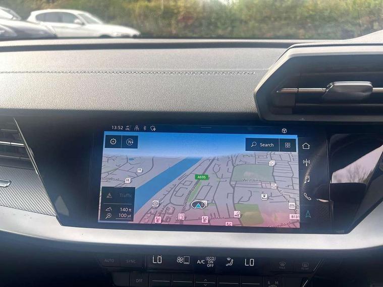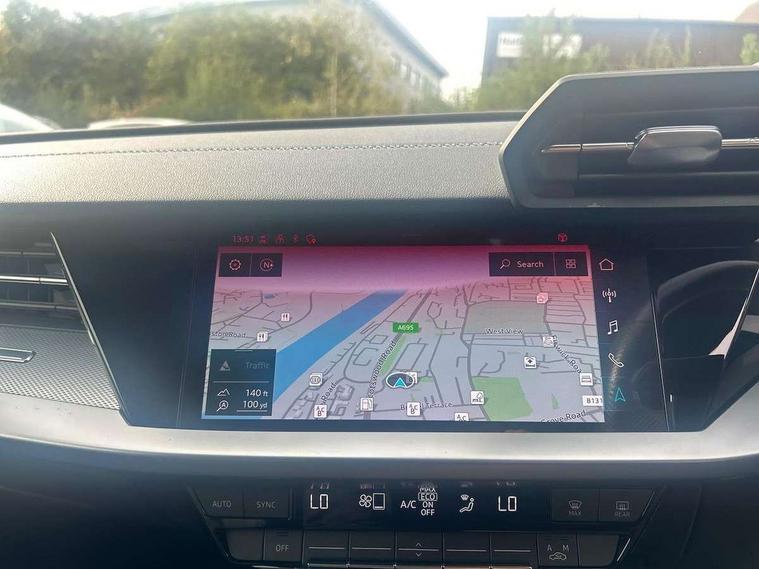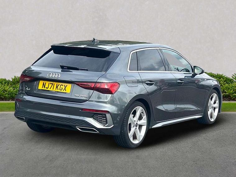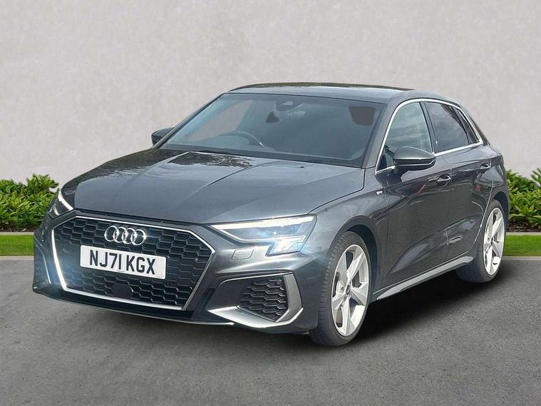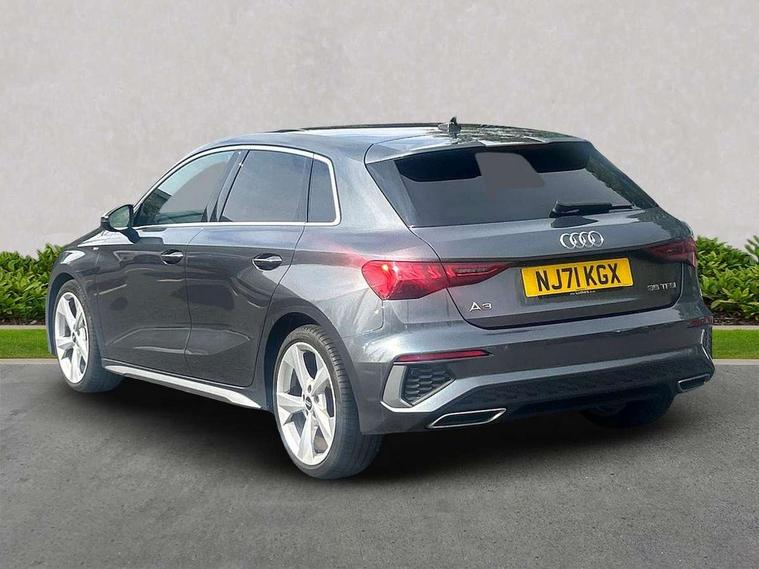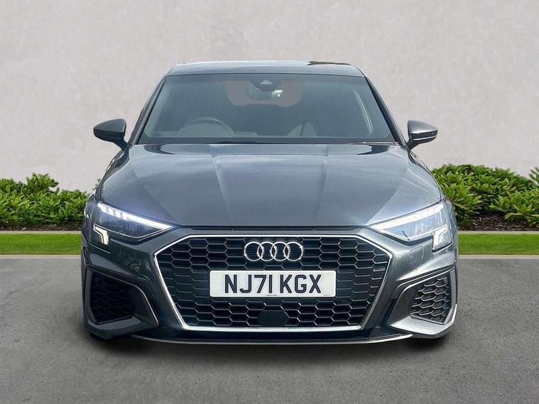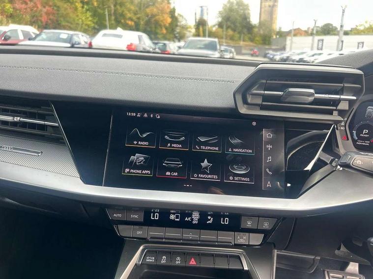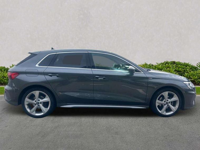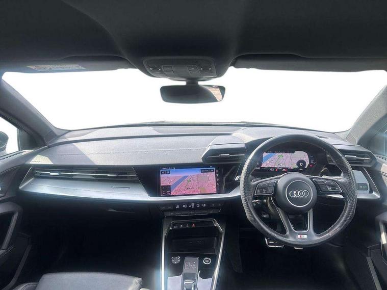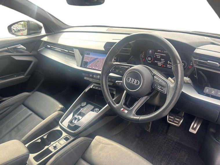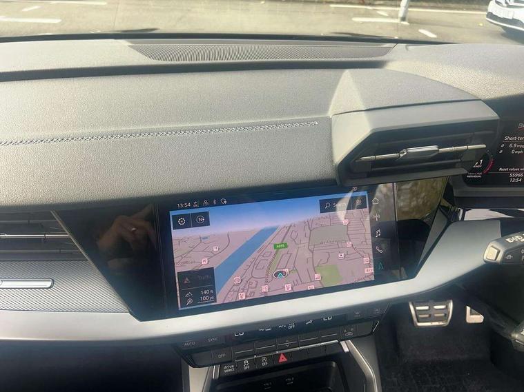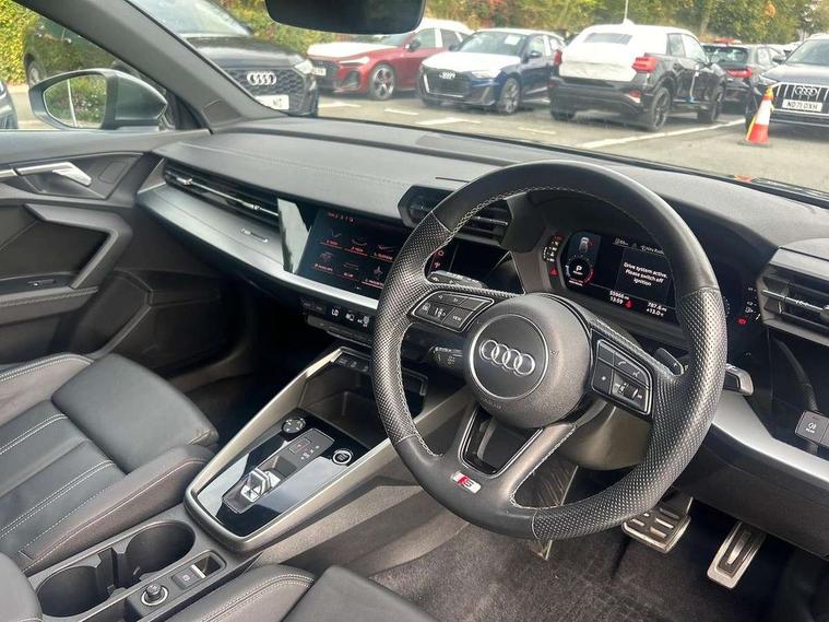 Audi connect emergency call and service, Audi drive select (Auto, Comfort, Dynamic, Efficiency and Individual), Audi smartphone interface, Audi Virtual Cockpit - 10.25" digital and colour instrument cluster, Automatic start/stop system with recuperation, Bluetooth interface, Collision avoidance assistant, Electromechanical power speed sensitive steering, Lane departure warning system, MMI Navigation Plus with high resolution 10.1" colour touch screen display, Service indicator, Trip computer, Voice control system with natural language interaction, 2xUSB-C connection with data and charging functions, 6 passive loudspeakers, DAB Digital radio, 3rd brake light, Acoustic glass windscreen, Aluminium window trim, Auto dimming frameless rear view mirror, Electrically adjustable/heated/folding/auto dimming door mirrors with integrated LED indications + kerb view function for passenger side, Front electric windows, Illuminated aluminium inserts front door sills with S logo, LED daytime running lights, LED headlights with LED rear lights and dynamic rear indicators, Light and rain sensors, Privacy glass - dark tinted rear window, rear door and side windows, Rear electric windows, Rear side air outlets in grained matt black, Rear wiper, S line bumpers, S roof spoiler, 12V socket and storage compartment in front centre console, 40/20/40 split folding rear seat bench with cupholder, Black cloth headlining, Dual zone electronic climate control, Front and rear centre armrest in leather, Front and rear headrests, Front/rear floor mats, Height and reach adjustable steering wheel, Interior lighting - glove compartment light and right hand side, Luggage compartment floor covering, Manual boot compartment lid, Manually adjustable front seats, Seat side bolsters, Stainless steel pedals and front footrest, Twin leather upholstery with front sports seats S embossed logo, Aluminium interior elements pack - A3 Sportback, S line styling pack - A3 Sportback, 3x3 point rear seat belts, Driver and front passenger airbag with passenger airbag deactivation, Electronic Stabilisation Control (ESC) including ABS, ASR and EDL, First aid kit with warning triangle and 2 safety vests, Front side airbags with head airbags and interaction airbag, Hill hold assist, Pre-sense front with pedestrian and cyclist detection, Seatbelt monitoring, Tyre pressure loss indicator, Anti theft alarm, Anti-theft wheel bolts, Electronically operated child lock, Immobiliser, Remote control central locking, Accent surfaces in the dashboard and centre console in platinum grey silk effect paint finish, Dark spectrum aluminium inlays,