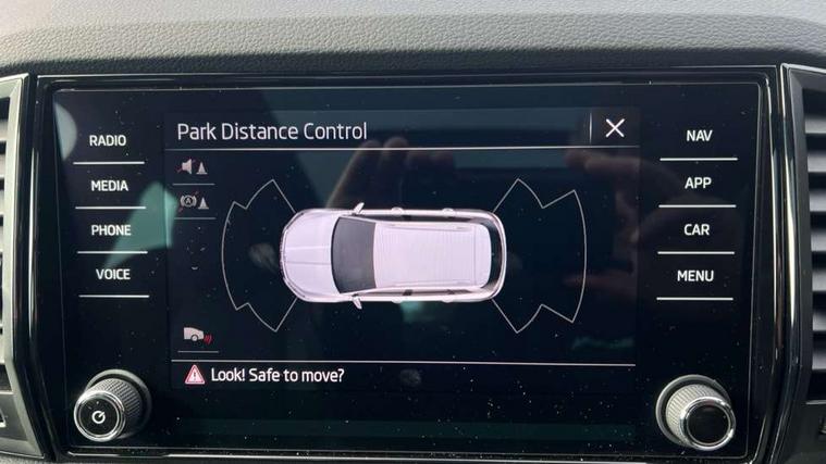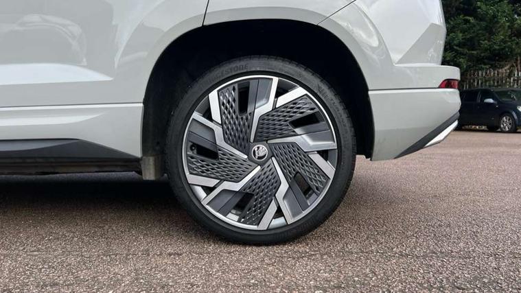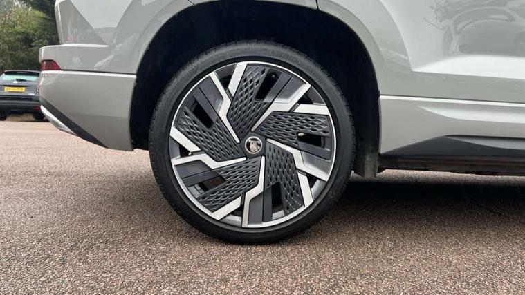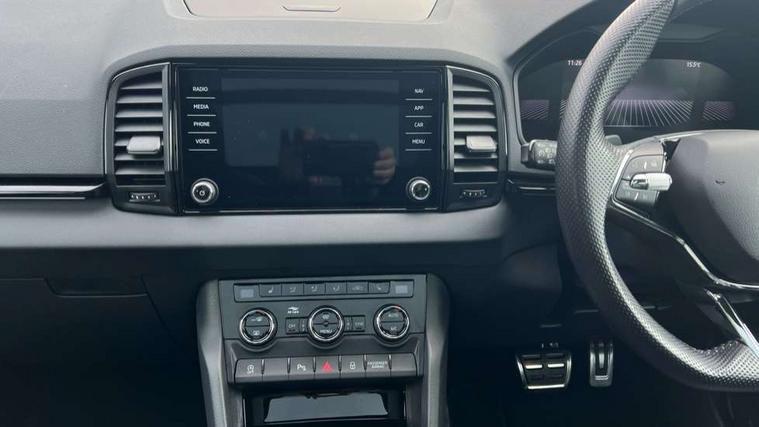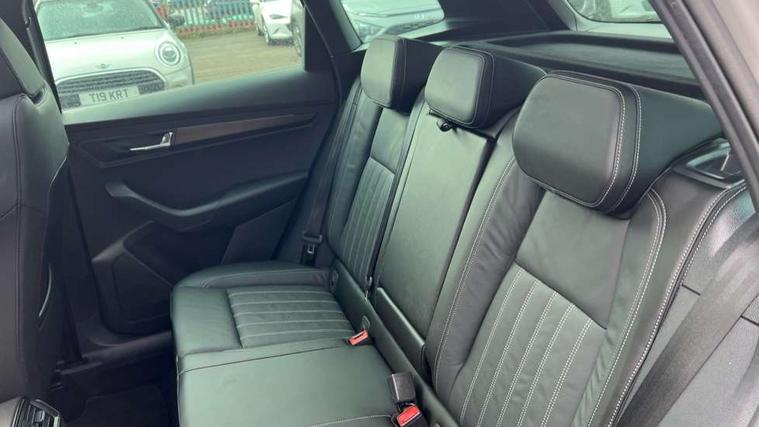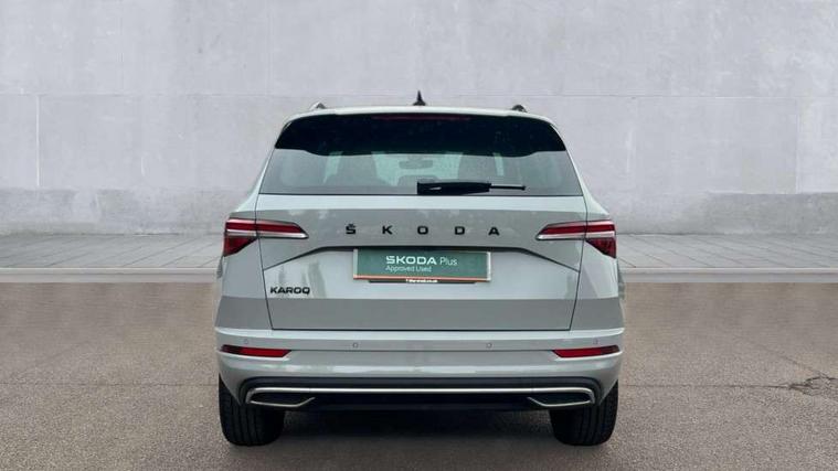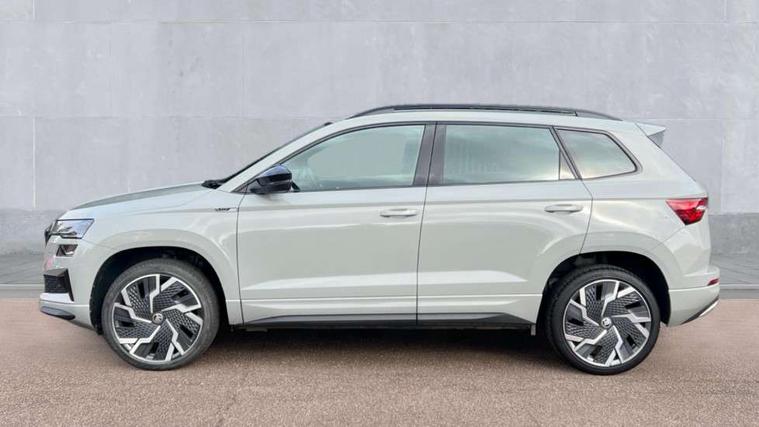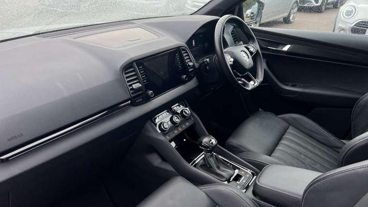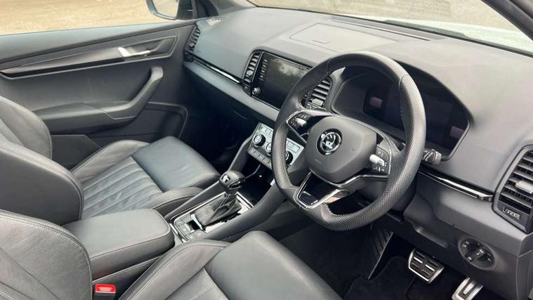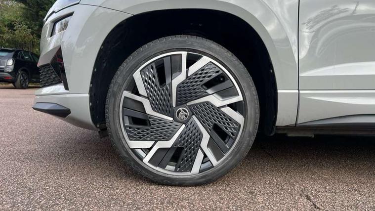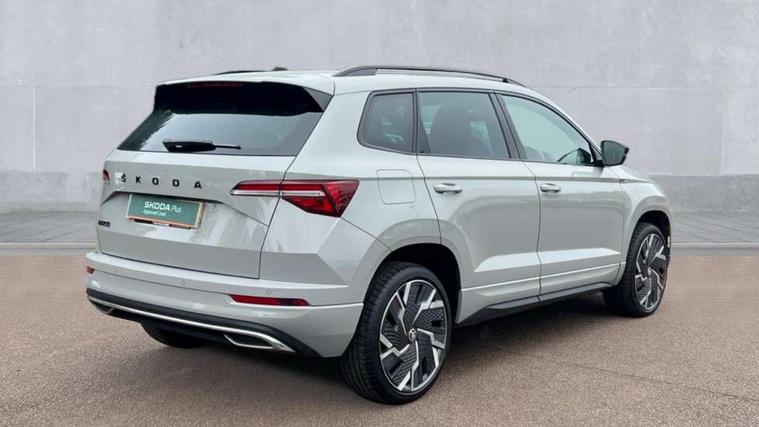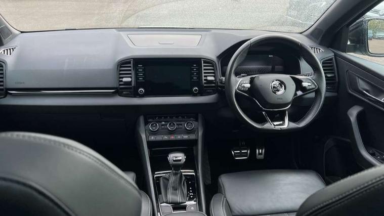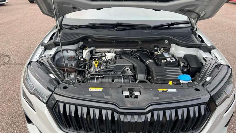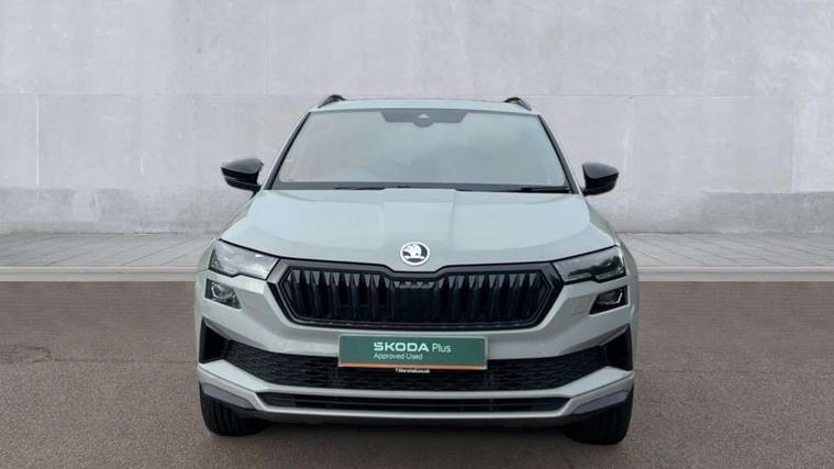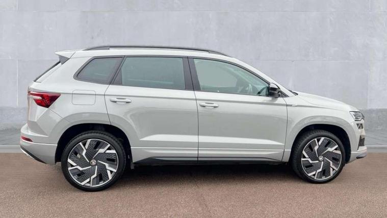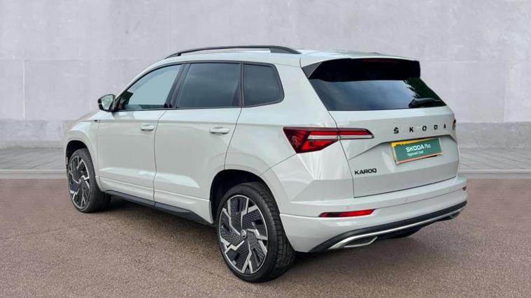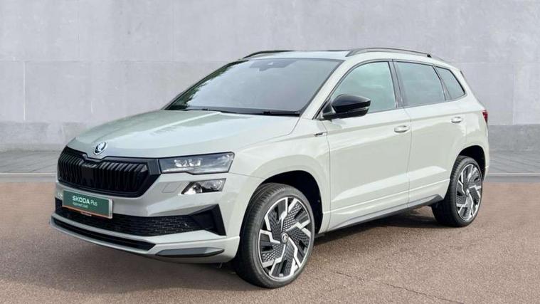 8" Digital display, Care connect, Driver fatigue sensor, Emergency services call system, Outside temperature gauge, Service interval indicator, SmartLink wireless for Apple and wired for Android, Start/stop system with regenerative braking, USB C Port x 2 in front centre console, Virtual cockpit, Virtual pedal with electrically operated boot door, 8 speakers, DAB radio with Bluetooth, USB connection, Acoustic glass, Aero front windscreen wipers with intermittent function, Auto dimming rear view mirror with light and rain sensors, Black door mirrors, Black electric window control buttons, Black radiator grille, Black roof rails, Body colour door handles, Dynamic headlight range control with cornering light function, Electric front and rear windows with child proof lock, Front door steps with SportLine logo, Heated rear windscreen, LED daytime running lights, LED rear lights with high functionality welcome effect and dynamic indicators, Light assistant (coming/leaving home/tunnel light), Panoramic sliding sunroof, Plastic scuff plates, Privacy glass, Protective door side sills in body colour, Rear diffuser, Rear side wing doors, Rear spoiler, Rear window wiper with washer system and intermittent control, Safety reflectors on front doors, Skoda lettering on tailgate in black, Sportline badge on front fender, Sportline decorative inserts with badging, Sports front and rear bumpers, Third brake light, 1.5 litre bottle holders in driver and front passenger door panels, 12V socket in boot, 12v socket in front centre armrest with storage compartment and rear air vents, 2 Folding hooks and nets in boot, 3 rear height adjustable headrests, 3 seat bench in 2nd row, 3 spoke leather sports multifunction steering wheel and silver stitching with gear shift paddles, 4 foldable roof handles with rear coat hooks, Black floor carpet, Black roof headlining, Chrome inner door handles, Double sided boot floor, Foldable hooks in the boot, Front head restraints, Height adjustable front three point seats belts with tensioners, Height/reach adjust steering wheel, Ice scraper, Illuminated glovebox, Illuminated luggage compartment, Isofix child seat preparation outer rear, Manual lumbar support for front seats, Pen holder, Pollen filter, Rear boot cover, Rear reading lights, Rear seats fixed folding and divided 60:40, Rubbish bin door, Safety vest holder, Single front passenger seat, Storage box in upper central dashboard closed, Sunvisors with illuminated vanity mirrors, Textile floor mats, Ticket holder, Titan black interior ceiling, Tool kit, Welcome animation with sportline logo, Light Pack - Karoq, Parking pack - Karoq, Automatic door unlocking in case of crash, Automatic fuel cut off in case of crash, Child locks on rear doors, Driver airbag, Electronic parking brake with auto hold function, Emergency rear braking signal, ESC including ABS, MSR, ASR, EDS, HBA, DSR, RBS, MKB and traction control, Front side airbags, Hill hold control, Knee airbags, Passenger airbag with switch-off function, Pedestrian monitor, Seatbelt reminder signalisation and pretensioner for all seats, Three point seatbelts rear, Two tone horn, Tyre pressure display, Tyre pressure monitor, Alarm with interior monitoring, back up horn and tilt sensor with safe function, Electronic engine immobiliser, Keyless entry and start/stop, Remote central locking with 2 remote folding keys, Black air vent surround, Black centre console, Satin black dashboard, Satin black door trim, 19" Vega black polished alloy wheels, Anti-theft wheel bolts protection, Matt black aero hub caps, Storage on wheel cover,