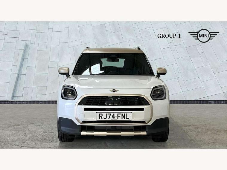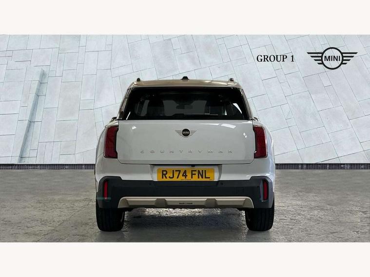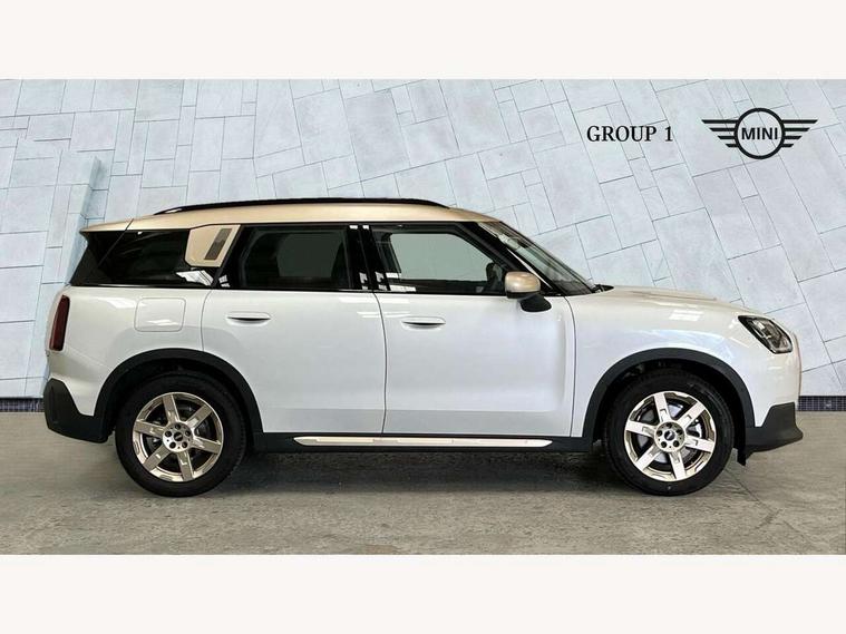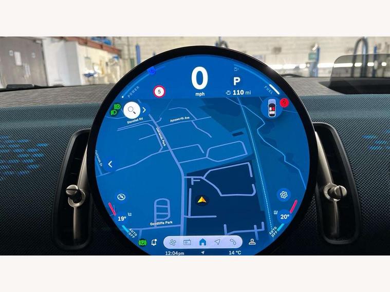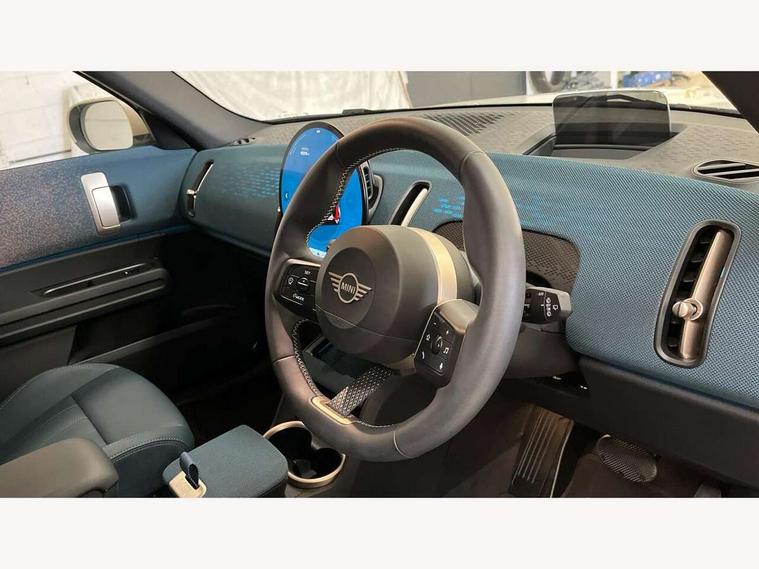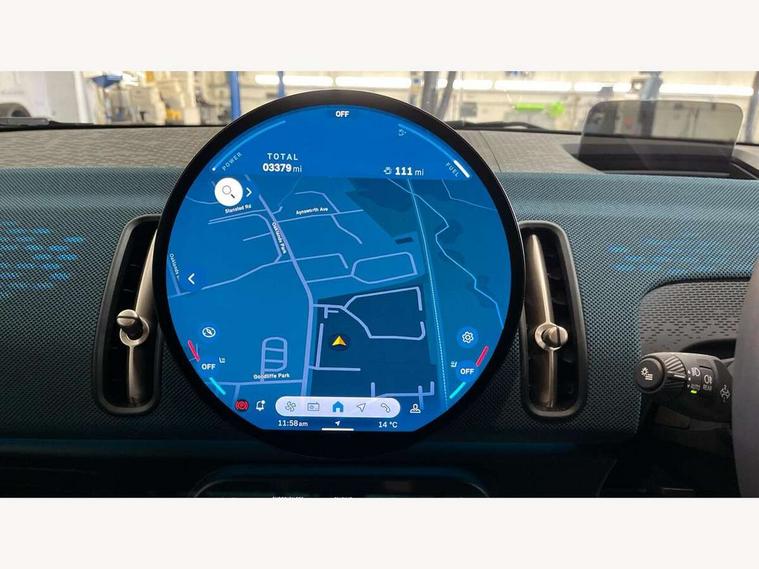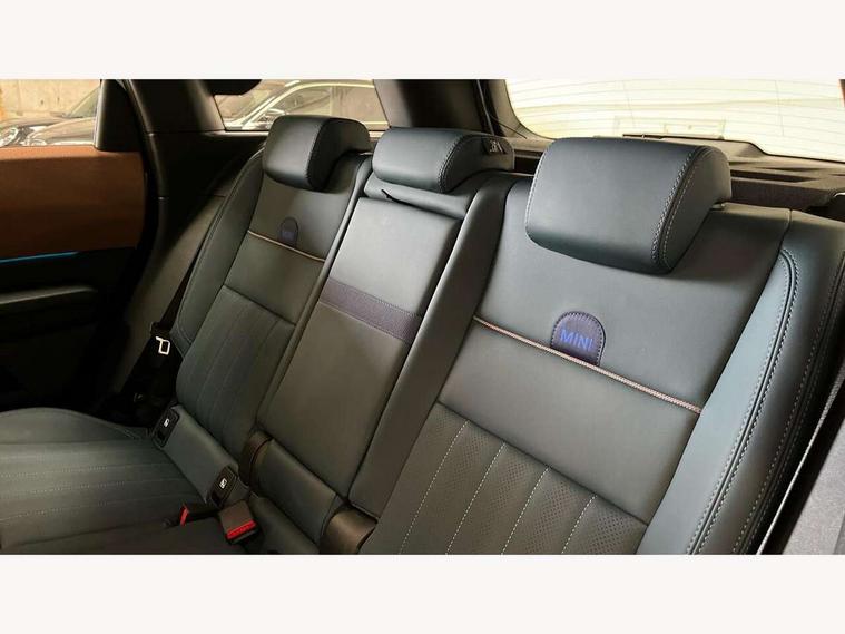 Bluetooth connection, Circular OLED Screen, Compatible mobile phone bluetooth with audio streaming, Cruise Control (DCC), Digital dashboard display, Driving assistant, E-call, Electro-mechanical speed dependant steering assistance, MINI Experience Modes, Mini navigation system, MINI TeleServices, Parking assistant in camera and ultrasound based assistance system, rear view camera, parking aid and distance control, Auto transmission with Paddles, Larger capacity fuel tank, 6 speakers, DAB Digital radio, Personal eSim, Auto tailgate, Electric adjustable heated door mirrors, Front and rear electric windows, Heated rear window, LED daytime running lights, LED Headlights, LED rear lights, LED third brake light, Logos in Vibrant Silver, Rain sensor with auto headlights, Rear side wing doors, Rear window wiper, Roof rails, Vibrant Silver Grill Surround, 3 seat bench in 2nd row, 60/40 split rear bench seat, Anthracite headliner, Auto air conditioning, Floor mats, Front armrest, Front headrests, Front sport seats, Heated steering wheel, Height and length steering column adjustment, Lidded storage box in Petrol knit, Rear headrests, Single front passenger seat, Sport Vescin Steering Wheel, Sunvisors with vanity mirrors, Vescin synthetic leather upholstery, Vibrant Silver sill inlay, 3x3 point rear seat belts, 6 Airbags - front, side, head and seat belt tensioners, ABS, DSC - Dynamic Stability Control, Electronic handbrake, Electronic Stability Programme (ESP), Front ISOFIX (iSize), Hill hold assist, Hill start assist, Manual rear child locks, Traction control, Tyre pressure monitoring system, Warning triangle, Alarm system with tilt sensor, monitoring doors, bonnet interior and tailgate, Auto drive away locking, Deadlocking function, Electronic vehicle immobiliser, Locking wheel bolts, Remote control locking, Start/stop toggle with keyless go, Petrol/Brown dashboard knit, MINI Mobility Kit,