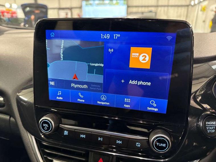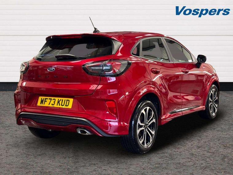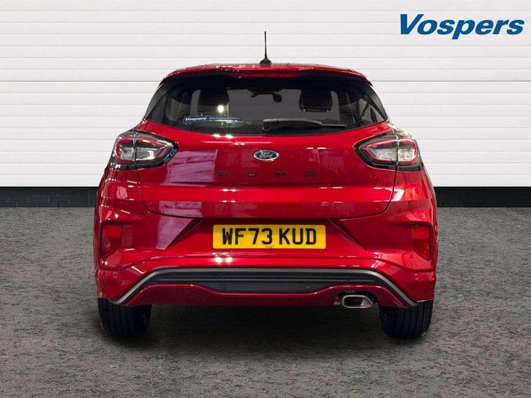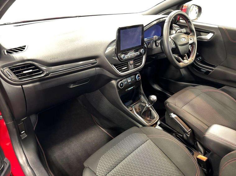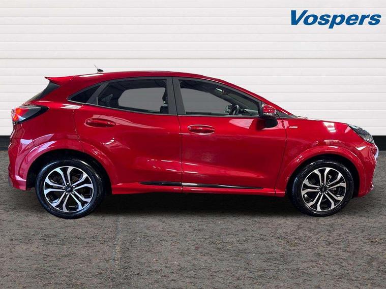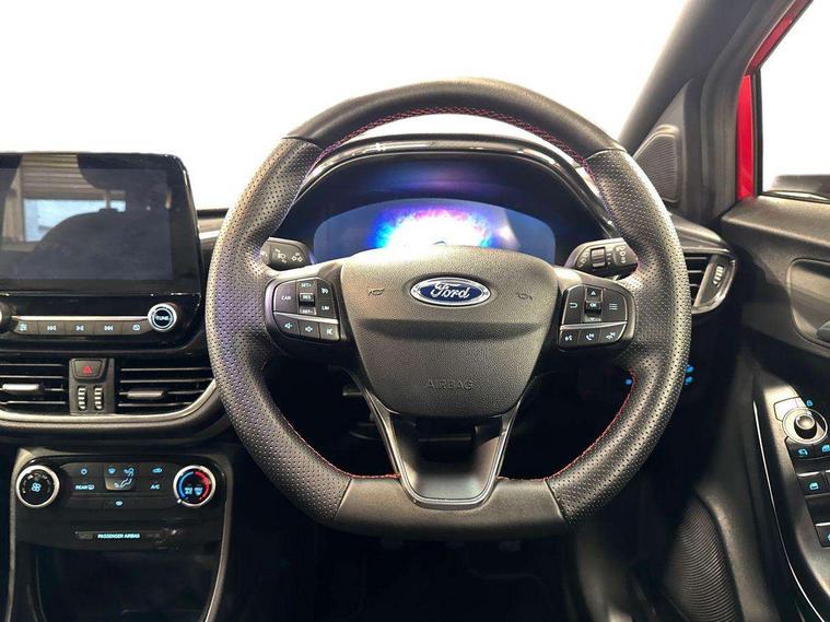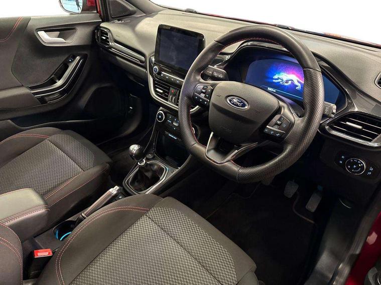 Driver impairment monitor, Emergency call service, Ford easy fuel, Full digital 12.3" instrument cluster, Lane keeping aid with lane departure warning, Power assist steering, Power start button, Rear parking sensor, Selectable drive modes(Normal, sport, Eco, trail, slippery), Speed sign recognition, Sport suspension, Automatic headlights with auto high beam, Automatic rain sensing wipers, LED rear lamps, Power foldable heated door mirrors with puddle lamps, Projector headlamps with LED day time running lights and front fog lamps, Quickclear heated windscreen, Rear side wing doors, Rear wiper, ST-Line body styling kit with unique grille, Third brake light, 3 seat bench in 2nd row, Centre console with armrest and stowage, Ford megabox extended bootspace, Front and rear head restraints, Front floor mats, Manual 2 way passenger seat adjustment, Manual 4 way driver seat adjust with lumbar adjustment, Single front passenger seat, ST- Line cloth trim with red stitching, ST-Line flat bottomed sensico leather steering wheel with leather handbrake and aluminium gear knob, Ford SYNC 3 navigation pack - Puma, 3 rear seatbelts, Child safety lock, Electronic stability control (ESC) and hill start assist, Pedestrian/cyclist detection & post-collision braking, Pre collision assist system, Tyre pressure monitoring system (TPMS), Thatcham alarm,