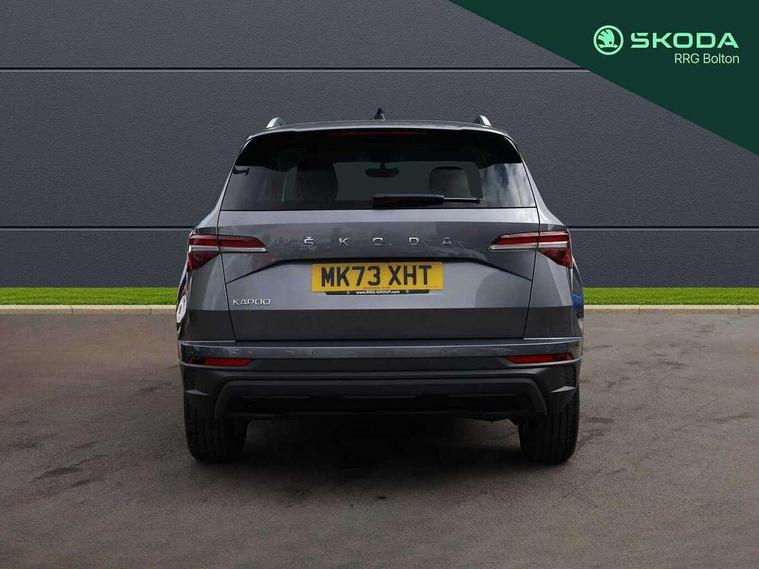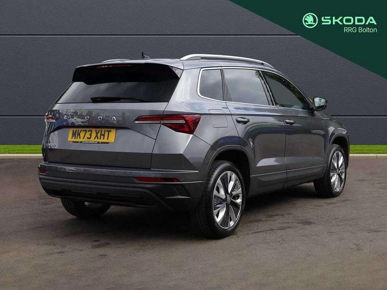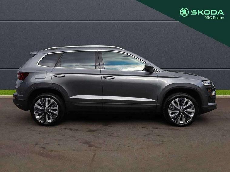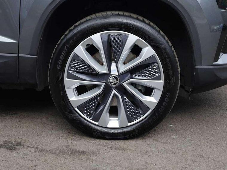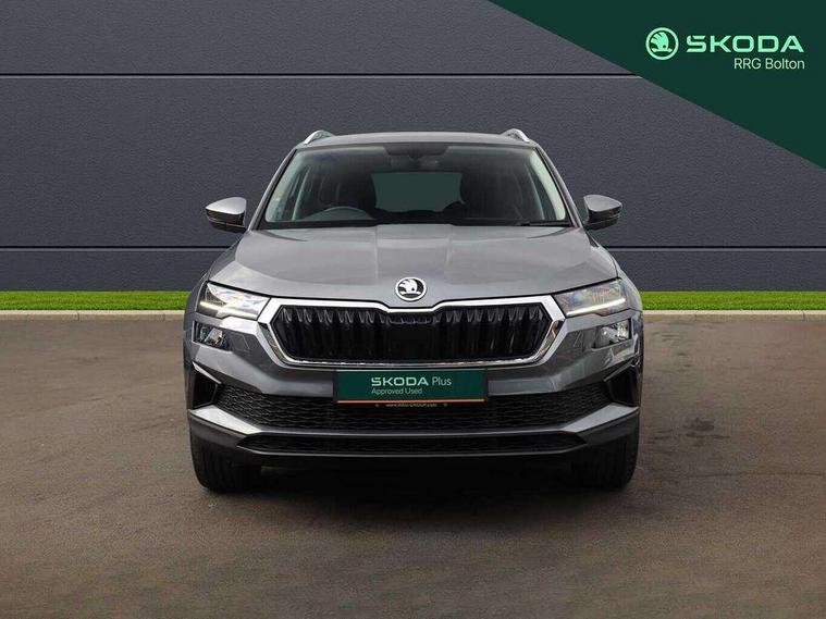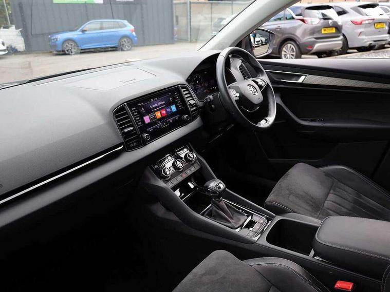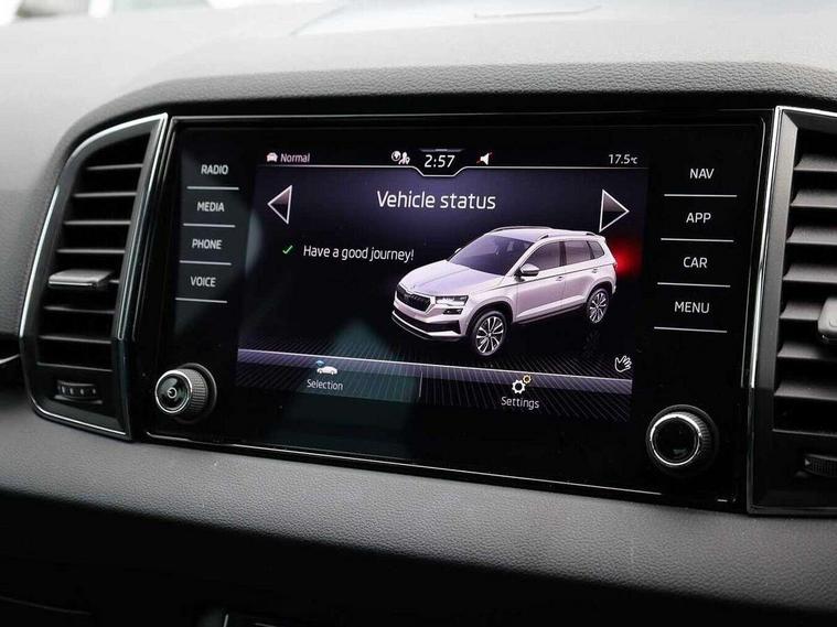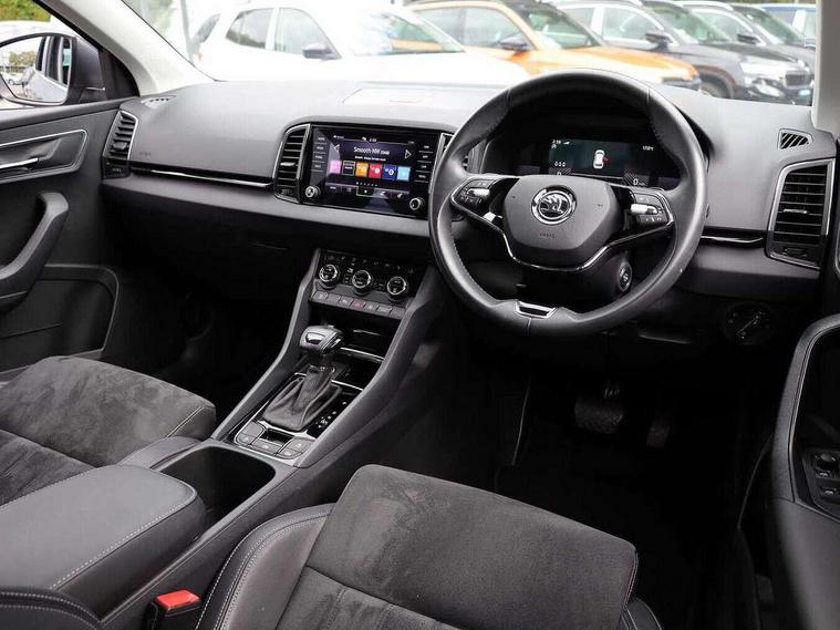 8" Digital display, Care connect, Driver fatigue sensor, Emergency services call system, Outside temperature gauge, Service interval indicator, SmartLink wireless for Apple and wired for Android, Start/stop system with regenerative braking, USB C Port x 2 in front centre console, 8 Speakers, DAB radio with Bluetooth, USB connection, Acoustic glass, Aero front windscreen wipers with intermittent function, Auto dimming rear view mirror with light and rain sensors, Black electric window control buttons, Body colour door mirrors and handles, Dynamic headlight range control with cornering light function, Electric front and rear windows with child proof lock, Heated rear windscreen, LED daytime running lights, LED rear lights with high functionality welcome effect and dynamic indicators, Light assistant (coming/leaving home/tunnel light), Plastic scuff plates, Privacy glass, Rear side wing doors, Rear spoiler, Rear window wiper with washer system and intermittent control, Safety reflectors on front doors, 1.5 litre bottle holders in driver and front passenger door panels, 12V socket in boot, 12v socket in front centre armrest with storage compartment and rear air vents, 2 spoke leather heated multifunction steering wheel with DSG paddles, 2 x Tablet holder, 3 rear height adjustable headrests, 3 seat bench in 2nd row, 4 foldable roof handles with rear coat hooks, Black floor carpet, Chrome inner door handles, Decorative door sills with KAROQ badging, Double sided boot floor, Foldable hooks in the boot, Front head restraints, Height adjustable front three point seats belts with tensioners, Height/reach adjust steering wheel, Ice scraper, Illuminated glovebox, Illuminated luggage compartment, Isofix child seat preparation for front passenger seat, Isofix child seat preparation outer rear, Manual lumbar support for front seats, Pen holder, Pollen filter, Rear boot cover, Rear reading lights, Rubbish bin door, Safety vest holder, Single front passenger seat, Storage box in upper central dashboard closed, Sunvisors with illuminated vanity mirrors, Textile floor mats, Ticket holder, VarioFlex seats with standard rear seat release, Boot pack - Karoq, Chrome roof rails + chrome pack - Karoq, Parking pack - Karoq, Automatic door unlocking in case of crash, Automatic fuel cut off in case of crash, Child locks on rear doors, Driver airbag, Electronic parking brake with auto hold function, Emergency rear braking signal, ESC including ABS, MSR, ASR, EDS, HBA, DSR, RBS, MKB and traction control, Front side airbags, Hill hold control, Knee airbags, Passenger airbag with switch-off function, Pedestrian monitor, Seatbelt reminder signalisation and pretensioner for all seats, Three point seatbelts rear, Two tone horn, Tyre pressure display, Tyre pressure monitor, Alarm with interior monitoring, back up horn and tilt sensor with safe function, Electronic engine immobiliser, Keyless entry and start/stop, Remote central locking with 2 remote folding keys, Chrome framed air vents, 18" Miran alloy wheels in black, Anti-theft wheel bolts protection, Storage on wheel cover, Tool kit,