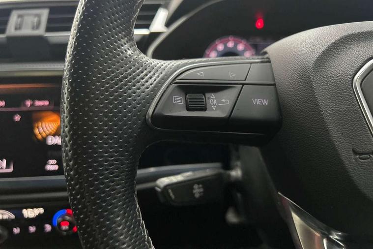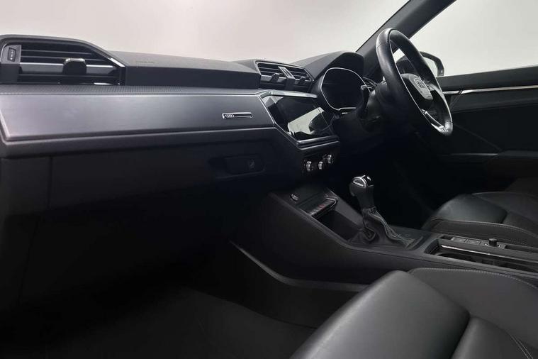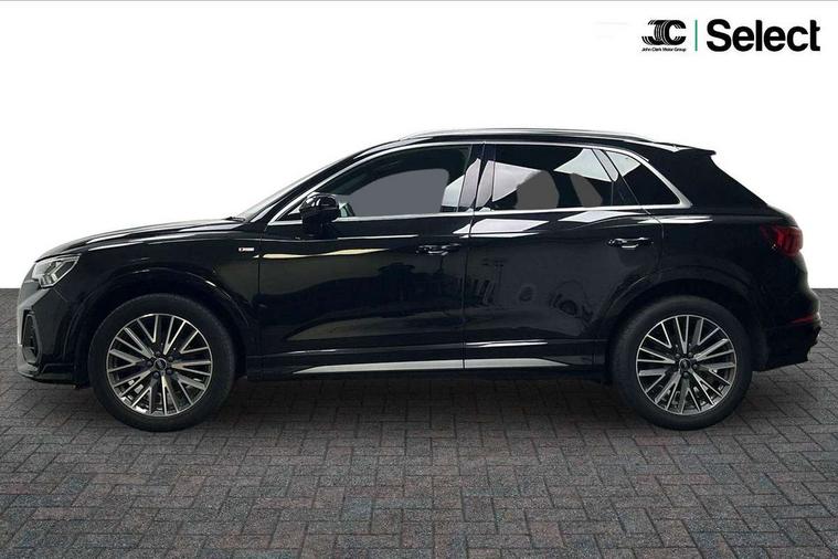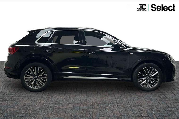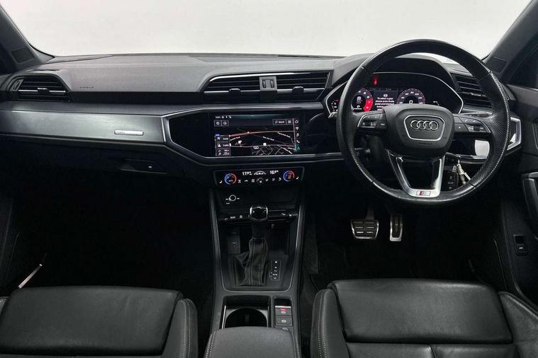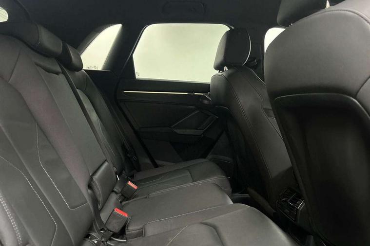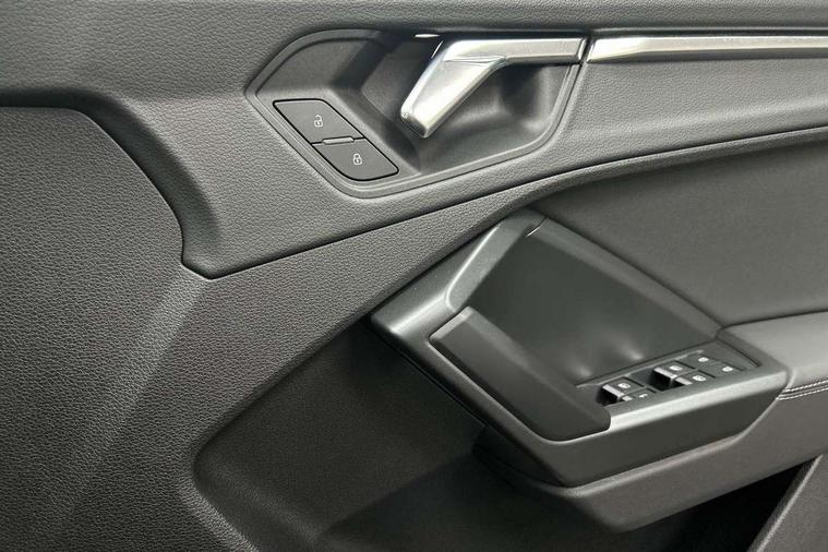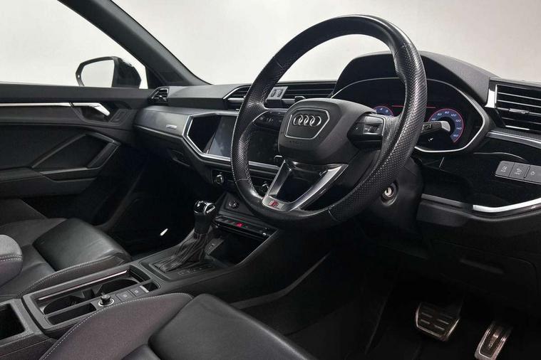 Audi connect safety and service (e-call), Audi drive select, Audi lane departure warning, Audi side assist, Audi Virtual Cockpit - 10.25" display, Bluetooth interface, Camera based traffic sign recognition, MMI Navigation Plus with high resolution 10.1 inch touchscreen colour display, Power operated tailgate, Progressive steering, Service interval indicator, Smartphone interface includes wireless Apple carplay/Android Auto, Start stop system with recuperation, Voice control system with natural language interaction, 48V Mild hybrid technology, Sports suspension, 1 x USB type C and 1 USB type A charging points, 6 passive loudspeakers, DAB digital radio module, Acoustic windscreen, Aluminium roof rails, Aluminium window trim, Auto dimming frameless rear view mirror, Body coloured bumpers, Electrically folding, adjustable and heated door mirrors with integrated LED side indicators and kerb view function for passenger side, Front and rear electric windows, Front fog lights, Front side air inlets in matt platinum grey, Front spoiler blade in matt platinum grey, Grille vertical bars in aluminium silver/Matt, High gloss black finish B and C pillars, LED headlights with LED daytime running lights and dynamic rear indicator, LED rear lights, Privacy glass dark tinted rear and rear-side windows (from B-pillar backwards), Rain and light sensors, Rear diffuser strip in matt titanium black, S line badges on front wings, S Line front and rear bumpers, Side skirt insert in matt Platinium grey, Silver chrome grille surround, Titanium black radiator grille, 12V socket in rear centre console, 40:20:40 folding with manual adjustment for 60:40 forwards/backwards position and backrest angle, Adjustable rear seat bench/backrest with centre armrest and cupholder, Black cloth headlining, Dual zone electronic climate control, Front and rear black floor mats with contrast stitching in rock grey, Front and rear headrests, Front and rear roof module including reading lights, Front centre armrest, Glove compartment lighting, Height and reach adjustable steering wheel, Illuminated door sill trims with S logo, ISOFIX child seat mounting for front passenger with airbag deactivation and outer rear seat including top tether attachment point for outer rear seats, Luggage compartment light, Manual front seats with height adjustment, Perforated leather gearknob, Stainless steel luggage compartment sill finisher, Stainless steel pedals, Non smoking pack - Q3, 3x3 point rear seatbelts, 6 airbags - Driver, front passenger, curtain and side windows, Audi pre-sense front with pedestrain and cyclist recognition, Electrically operated child locks on rear doors, Electromechanical parking brake, Electronic stabilisation control including ABS, ASR and EDL, Hill descent control, Hill hold assist, Pre sense basic, Seatbelt monitoring, Tyre pressure warning, Warning triangle and first aid kit, Anti theft alarm, Anti theft wheel bolts, Remote central locking, Dark matt brushed aluminium inlay, Detail dashboard around MMI touch colour display in glass look, black with surround in aluminium look, Leatherette door armrest, Tool kit, Tyre repair kit,