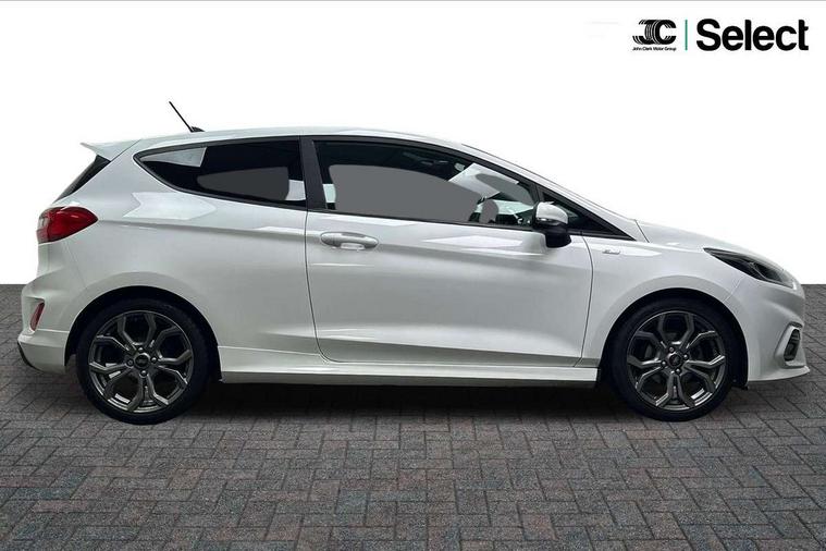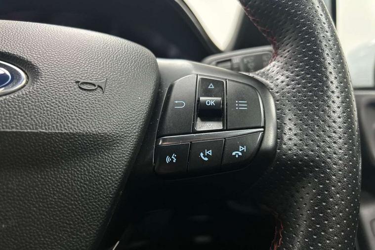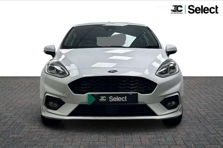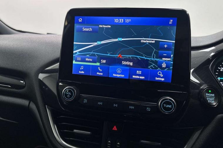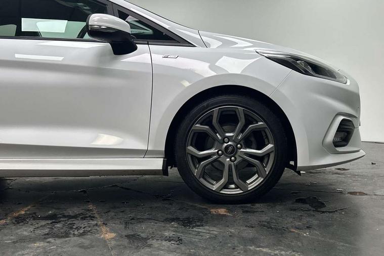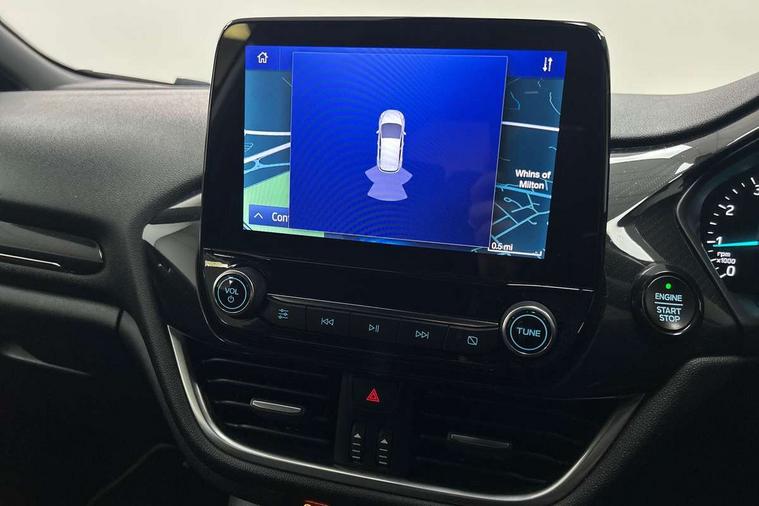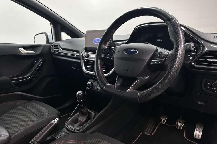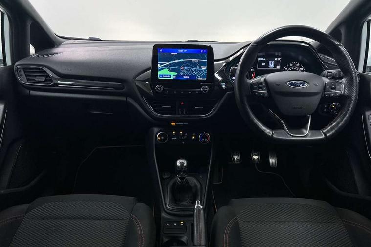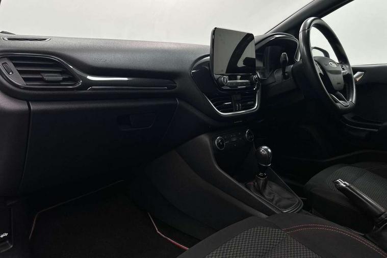 Bluetooth system, Electric power steering, Ford easy fuel, Ford SYNC 3 Navigation system incl 8" touchscreen, 7 speakers, FordPass connect, Apple carplay, android auto, voice control and emergency assistance, Rear parking distance sensors, Trip computer, Sports suspension, 2 USB ports, Auxiliary input socket, DAB Digital radio, Steering wheel mounted controls, Body colour bumpers, Body colour door handles, Body colour large rear spoiler, Body coloured electrically operated and heated door mirrors with side indicators, Cornering front fog lights, Electric front windows/one touch facility, LED Night signature to rear lights, Power foldable door mirrors with puddle lights, Quickclear heated windscreen, Rain sensing wipers and auto dimming rear view mirror, Rear privacy glass, Rear wiper, Unique ST-Line upper grille & full bodystyling kit with ST-Line wing badges, 12V Accessory socket in centre console, 3 spoke flat bottomed leather steering wheel, 60/40 split folding rear seat, Adjustable head restraints, Black headlining, Boot carpet, Centre console with armrest and illuminated cupholders, Chrome inner door handles, Cloth upholstery, Footwell illumination, Front floor mats, Front map reading lights, Front seat and rear pockets, Height adjustable driver's seat, Illuminated glovebox, LED ambient lighting, Load area light, Manual air conditioning, Overhead console with sunglasses holder, Pollen filter, Rake/reach adjustable steering wheel, Sensico leather steering wheel/gear knob/handbrake, Sports front seats, Sports pedals, NCAP Pack - Fiesta, 3 point seatbelts on all rear seats, ABS+EBA, Curtain airbags, Driver and passenger airbags, Drivers knee airbag, Electronic stability control with hill start assist, Front passenger airbag deactivation, Front side airbags, Seatbelt warning, Two tone horn, Tyre pressure monitoring system, Keyless start with 'Ford Power' starter button, MyKey system, Remote central locking & engine immobiliser, Thatcham Cat.1 alarm, 17" 5 spoke alloy wheels with rock metallic finish,