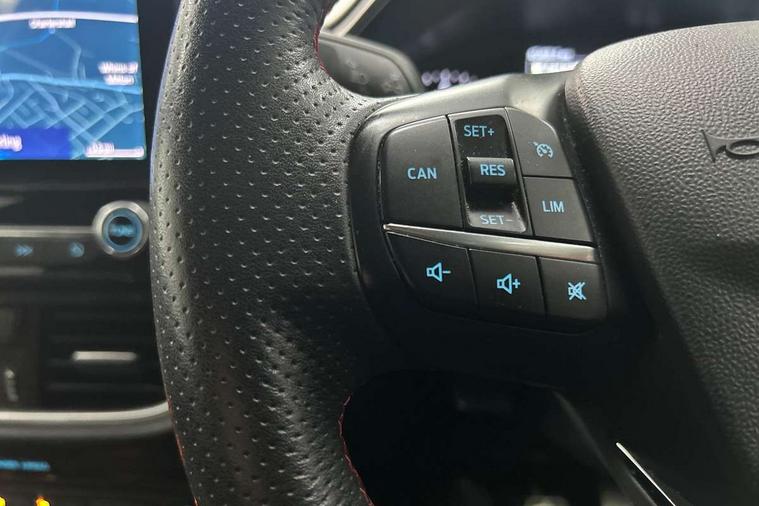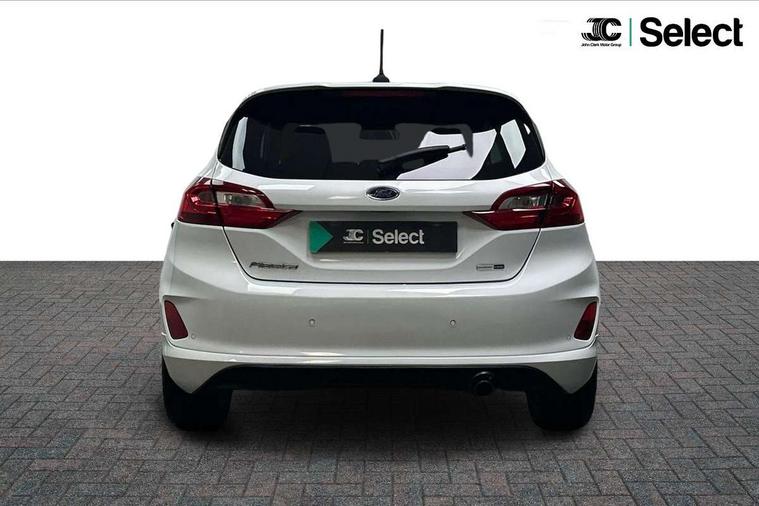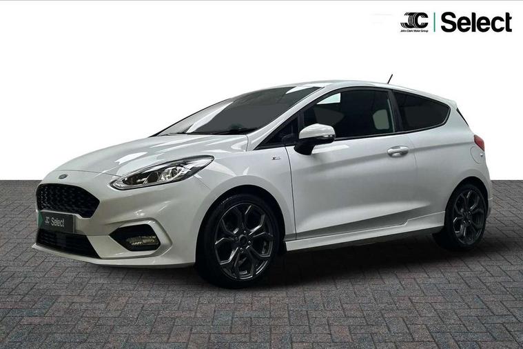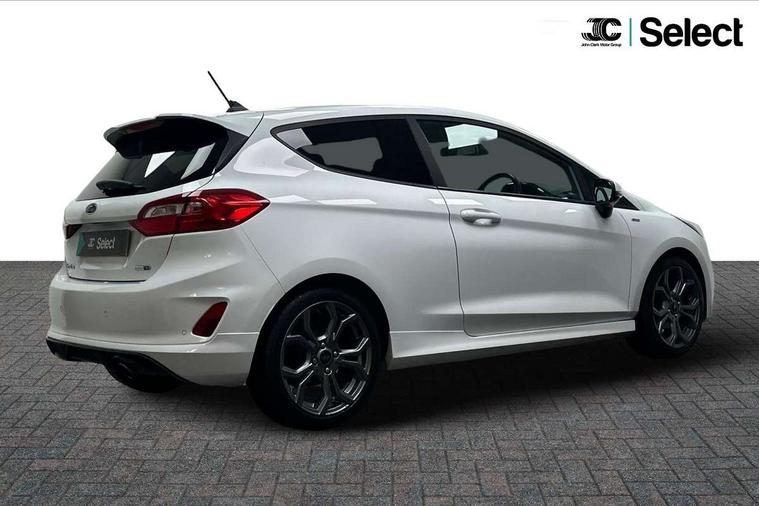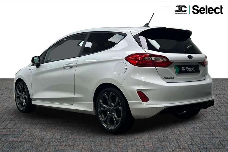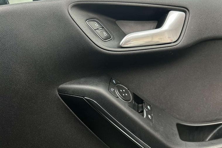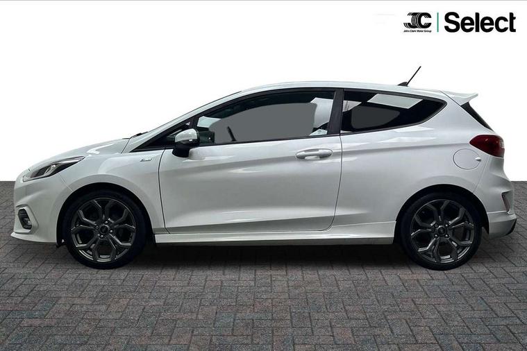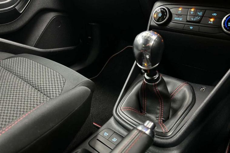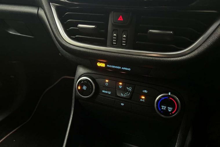 Bluetooth system, Electric power steering, Ford easy fuel, Ford SYNC 3 Navigation system incl 8" touchscreen, 7 speakers, FordPass connect, Apple carplay, android auto, voice control and emergency assistance, Rear parking distance sensors, Trip computer, Sports suspension, 2 USB ports, Auxiliary input socket, DAB Digital radio, Steering wheel mounted controls, Body colour bumpers, Body colour door handles, Body colour large rear spoiler, Body coloured electrically operated and heated door mirrors with side indicators, Cornering front fog lights, Electric front windows/one touch facility, LED Night signature to rear lights, Power foldable door mirrors with puddle lights, Quickclear heated windscreen, Rain sensing wipers and auto dimming rear view mirror, Rear privacy glass, Rear wiper, Unique ST-Line upper grille & full bodystyling kit with ST-Line wing badges, 12V Accessory socket in centre console, 3 spoke flat bottomed leather steering wheel, 60/40 split folding rear seat, Adjustable head restraints, Black headlining, Boot carpet, Centre console with armrest and illuminated cupholders, Chrome inner door handles, Cloth upholstery, Footwell illumination, Front floor mats, Front map reading lights, Front seat and rear pockets, Height adjustable driver's seat, Illuminated glovebox, LED ambient lighting, Load area light, Manual air conditioning, Overhead console with sunglasses holder, Pollen filter, Rake/reach adjustable steering wheel, Sensico leather steering wheel/gear knob/handbrake, Sports front seats, Sports pedals, NCAP Pack - Fiesta, 3 point seatbelts on all rear seats, ABS+EBA, Curtain airbags, Driver and passenger airbags, Drivers knee airbag, Electronic stability control with hill start assist, Front passenger airbag deactivation, Front side airbags, Seatbelt warning, Two tone horn, Tyre pressure monitoring system, Keyless start with 'Ford Power' starter button, MyKey system, Remote central locking & engine immobiliser, Thatcham Cat.1 alarm, 17" 5 spoke alloy wheels with rock metallic finish,