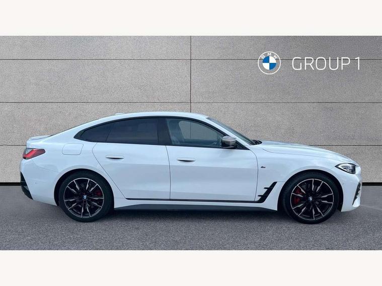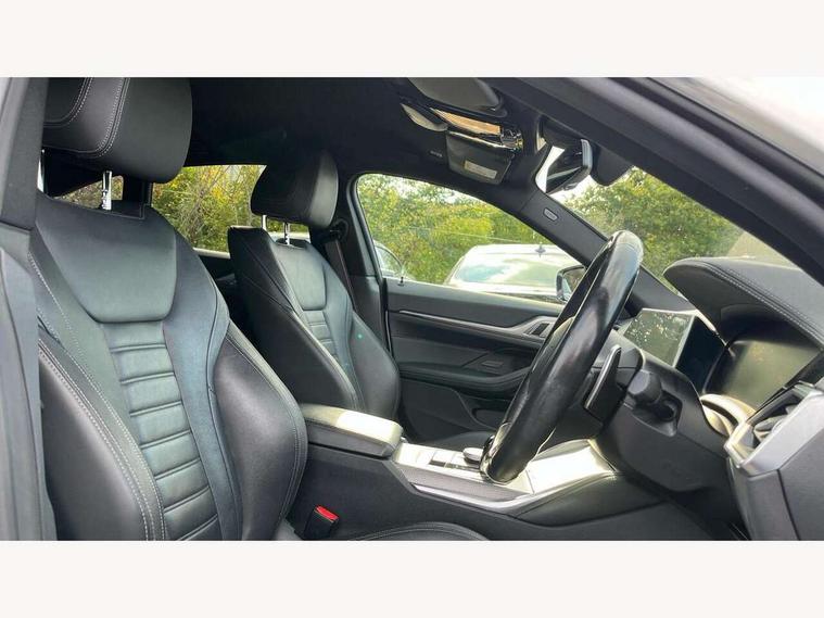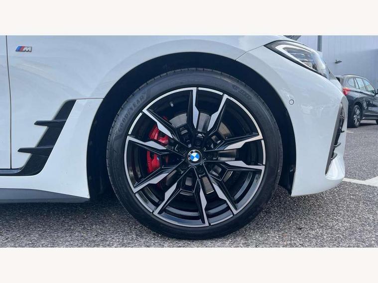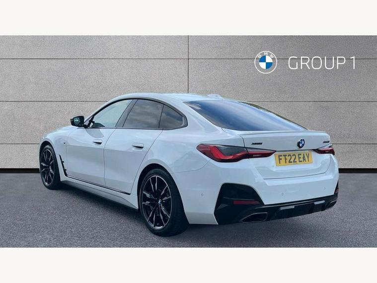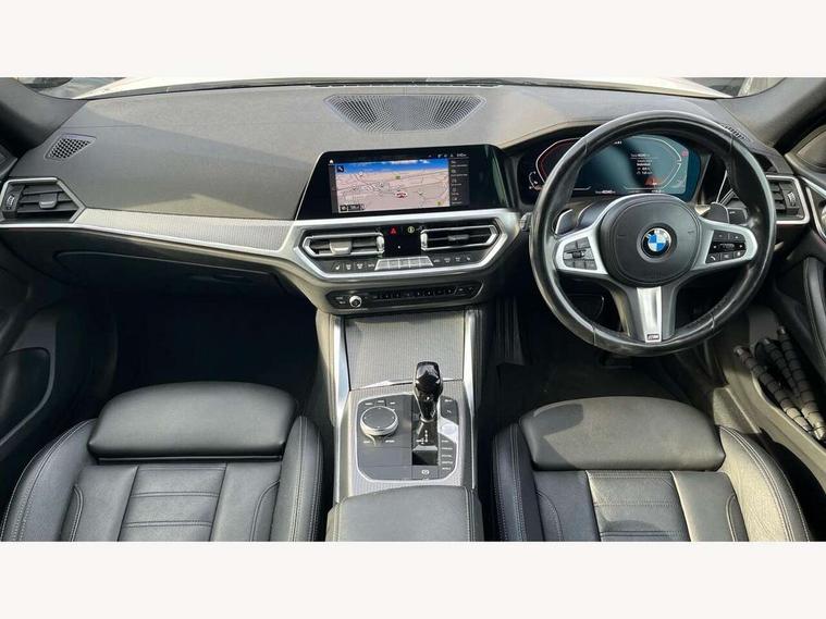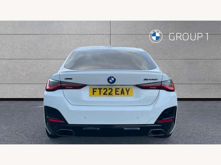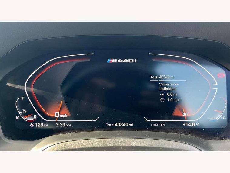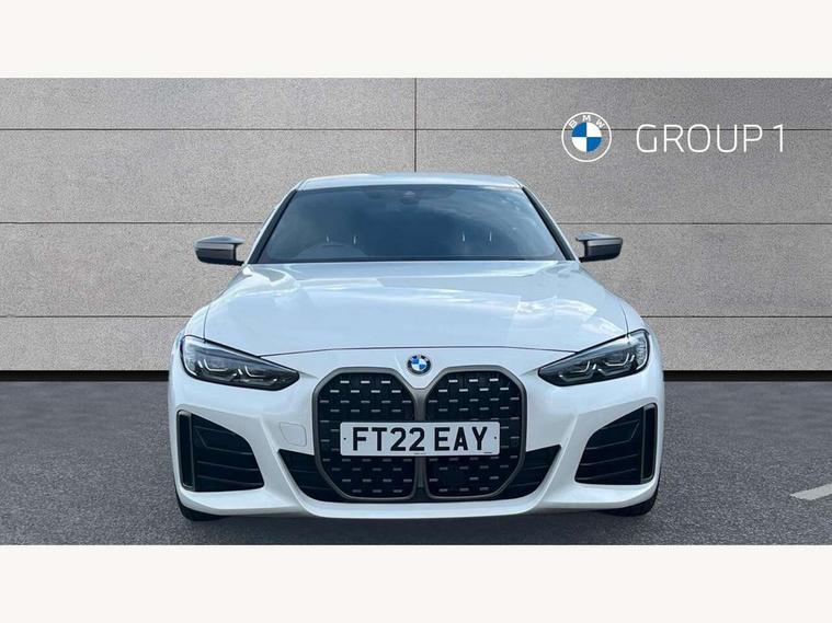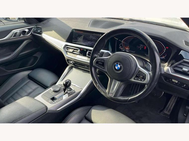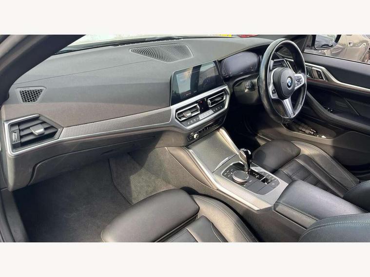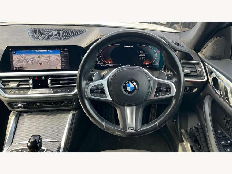 Active guard plus, Attentiveness assist, Auto start-stop, BMW ConnectedDrive online services, BMW iDrive controller on centre console, BMW Live Cockpit Professional Nav with 12.3" instrument display + 10.25" display, Intelligent Voice Assist, BMW OS 7, HDD, 2USB, 4G LTE connect, BMW service history, BMW Teleservices, Brake pad wear indicator in front and rear, Check Control warning system for monitoring of lights and door/luggage compartment open warning, Condition based service, Electric bootlid, Electric power steering with Servotronic steering optimised at all speed ranges, Gearshift time display in manual mode, Instrument cluster with speedometer with mph readout, tachometer, fuel gauge and oil temperature gauge, Integrated owners handbook, Oil sensor for level and grade, warning by check control system, On board computer - average speed, fuel consumption, outside temp display with acoustic warning, clock/date, service interval, odometer/trip meter, Optimum shift indicator, Tailgate, Variable sport steering, 48V Mild hybrid technology, 8 speed automatic steptronic transmission with gearshift paddles, Adaptive M suspension, Driving experience modes - Comfort, ECO PRO, Sport and Sport+ mode, Low centre of gravity, M Sport differential, Petrol Particulate Filter, Stroke dependent dampers, xDrive system permanent all-wheel drive variable torque distribution, DAB tuner, Electronic service booklet, Acoustic glazing, Automatic headlight beam throw control with load dependent regulating reaction, dynamic compensation of braking dive and acceleration squat, Automatic windscreen wipers and automatic headlight, Automatically dimming electrochromatic rear view mirror, BMW emblem on engine compartment lid and tailgate, Body colour fuel filler flap, Body colour roof fin, Brushed aluminium inserts in the front door sill finishers with BMW designation, Dynamic brake lights, Electric windows - front and rear, with open/close fingertip control, anti trap facility and comfort closing function all round, Exterior mirrors - electrically folding with anti-dazzle, Fading support, Follow me home headlights, Front and rear bumper system, Front apron plastic in body colour, Green tinted heat protection glazing, Illuminated bow type door handles in body colour drivers side with door lock, Interior rear view electrochromatic mirror with automatic anti dazzle function, LED daytime running lights, Licence plate panel integrated into front bumper and tailgate, Lightweight engineering, M designation on front side panels, left and right, M rear boot spoiler, One piece front bumper cover including towing eye cover in body colour, Preparation for high beam assistant, Rear side wing doors, Rear wiper, Reversing light, Side frame decorative moulding black matt, Twin exhaust tailpipes x2, Two part LED tailights in L-shape with components in smoked glass, brake light, LED turn indicator and rear fog light, Visible VIN plate, Welcome lights in interior and door handle area, Widened track and increased camber values for max transverse dynamics, agility and steering precision, Window recess cover black high gloss, Windscreen wipers with integrated heated washing jets, xDrive designation on left tailgate, 12V power socket in front centre console, 2 front cupholder in centre console with clamping elements and matt black inlay, 3 rear headrests, 3 seat bench in 2nd row, 3 spoke M sport leather multifunction steering wheel, 3 zone automatic air conditioning, 4 pieces lashing eyelets in luggage compartment, 40:20:40 split folding rear seat and rear centre armrest with two cupholders, Ambient lighting with welcome carpet light, Anthracite headlining, Armrest integrated in front and rear door trim + front centre console armrest, Four grab handles integrated in roof lining, Front and rear door pockets, Front and rear footwell lights, Front and rear reading lights, Front headrests, Heated driver and front passenger seats, Height adjustable mechanically and infinitely variable steering column, Illuminated armrest storage compartment, Illuminated glove compartment with separate small compartment, Luggage compartment light, Make-up mirror lights, Single front passenger seat, Storage compartment in rear centre console, Sunvisors with vanity mirrors and ticket pocket, Toolkit located in luggage compartment, Velour front floor mats, Connected professional package - 4 Series, M sport exterior styling pack - 4 Series M440i, 3 point seatbelts on all seats, Battery safety cut-off, BMW emergency call, Brake energy regeneration, Braking pre-tensioning, Child proof locking system in rear door, Child seat ISOFIX attachment for the two outer rear seats, Coasting in idle in ECO PRO mode, Cornering brake control (CBC), Crash sensor activating of airbags, Unlocking doors, hazard warning lights, fuel cut off, interior lighting+activation of safety battery terminal clamp, Driver and front passenger side airbags, integrated in the door side seat backrest bolsters for all seat variants, Driver/Front Passenger airbags, Dry braking, Dynamic brake control, Dynamic stability control + (DSC+) - Anti-lock Braking System (ABS) with brake assist and cornering brake control + Automatic Stability Control (ASC), Dynamic Traction Control - DTC, Electric parking brake including automatic hold function and automatic release of the parking brake when driving off, Electronic differential lock control (EDLC), Front and rear ventilated brake disc, Front passenger manual airbag deactivation, Head airbags for all 4 outer seats, Hill start assistant, M Sport seatbelts, Seat belt security check for driver and front passenger, Seat belt with belt stopper, pyrotechnic belt tensioners and belt force limiters, Side impact protection, Tyre pressure monitoring with three level warning strategy, Warning triangle and first aid kit, Alarm system (Thatcham 1) with remote control and electronic engine immobiliser, Central locking switch for all doors, fuel filler cap and luggage compartm