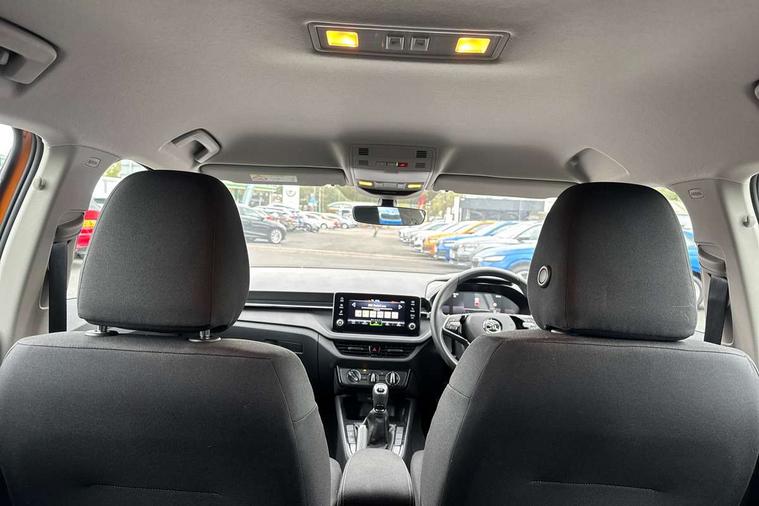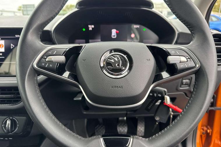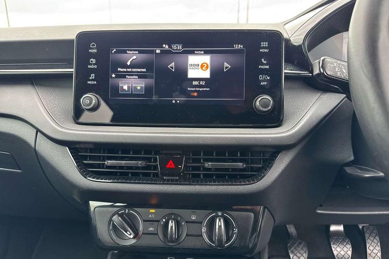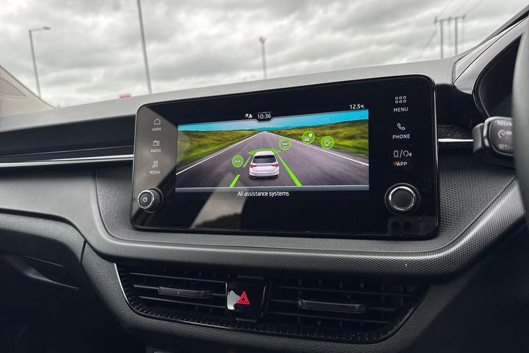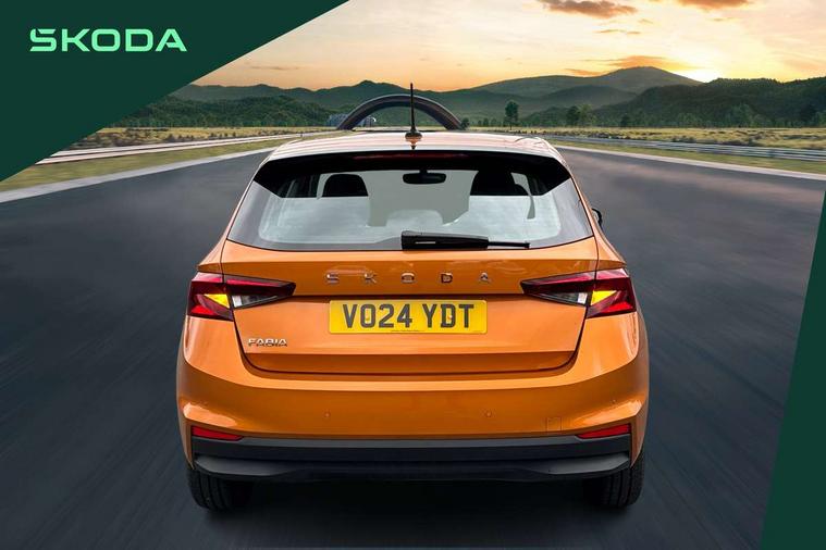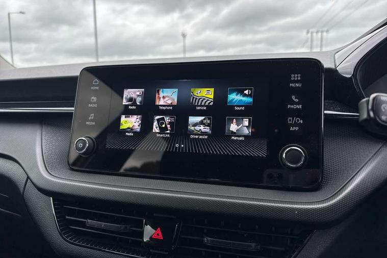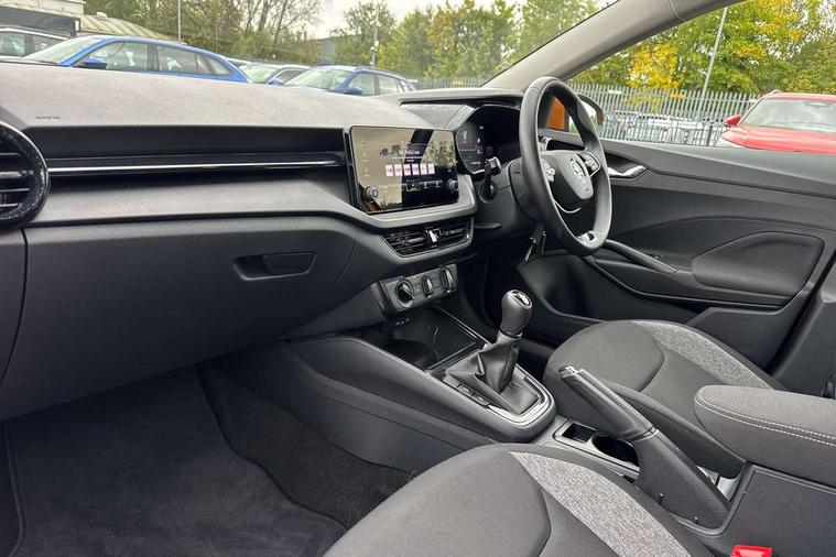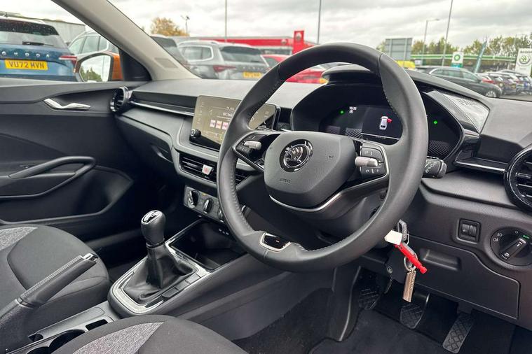 8" Digital instrument display, Advanced driver attention and drowsiness monitor, Bluetooth connection, Electromechanical power steering, Exterior temperature gauge, Lane assist including road edge detection, Rear parking sensors, Service interval indicator, Speed limiter, Traffic sign recognition, Wireless SmartLink for Apple CarPlay and Android Auto, 2x USB-C in the front (for data transmission and charging), 6 speakers (4 speakers/2 tweeters), 8.25" Skoda infotainment touchscreen display, Auxiliary socket for external MP3 player, DAB digital radio reception, Basic LED Headlights, Basic rear lights, Body colour door mirrors, Body coloured bumpers, Dimming rear view mirror with black frame, Door mirror integrated indicators, Electrically adjustable and heated door mirrors, Electrically adjustable front windows with function auto up/down, Front fog lights, Front window wiper intermittent control, Headlight range control - Automatic, Ice scraper in fuel cap, LED daytime running lights with coming and leaving home feature, Mechanical adjustable rear windows, Rain sensor, Rear LED fog light, Rear side wing doors, Rear window wiper with washing nozzles, Roof mounted spoiler, SKODA tailgate lettering in chrome, Third brake light, 2 reading lights in front and 2 reading lights in rear, 2 spoke leather multifunction steering wheel, 3 rear headrests, Backrest split and folding, Central console with removable cup holder and storage box, Chrome handbrake release button, Fabric upholstery, Front centre armrest, Gearshift knob/handle in leather, Grain satin black interior door handles, Hand brake lever handle in leather, Height adjustable driver seat, Height adjustable front headrests, Height adjustable steering wheel, ISOFIX and TopTether anchorage points to the outer rear seats, ISOFIX and TopTether on the front passenger seat, Luggage compartment lighting, Manual air conditioning, Pollen filter, Rear seat bench unsplit, Single front passenger seat, Storm grey headlining, Sun visors with mirror and airbag label on passenger side, Textile floor mats, Ticket holder, 3-point height adjustable front seats belts with pretensioner and force limiter, Automatic warning lights in case of crash, Driver and passengers airbag with switch off function, e-Call+, ESC including ABS, MSR, ASR, EDS, HBA and XDS, Front and rear seat belt warning, FRONT ASSIST (AEB City and AEB Inter Urban), Front side airbags, Head airbags, One tone horn, Pedestrian protection, Three rear 3-points safety seat belts with pretensioner and force limiter including stop function for outer rear seat belts, Tyre pressure monitoring system, Anti-theft alarm system including immobiliser, interior monitoring, backup horn, and towing protection, Central locking with radio remote control, interior controls, SAFE function and 2 foldable keys, Black painted air vents, Glossy black decorative trim, Grain satin black central console cover, Grain satin black lower decorative trim, Satin black door and side trim panel in front, Anti-theft wheel bolts protection, Super-low rolling resistance tyres,