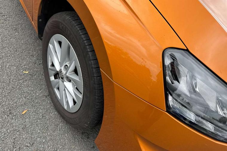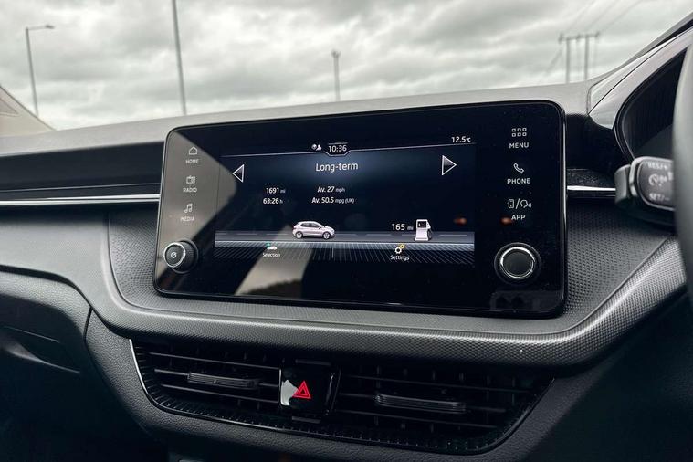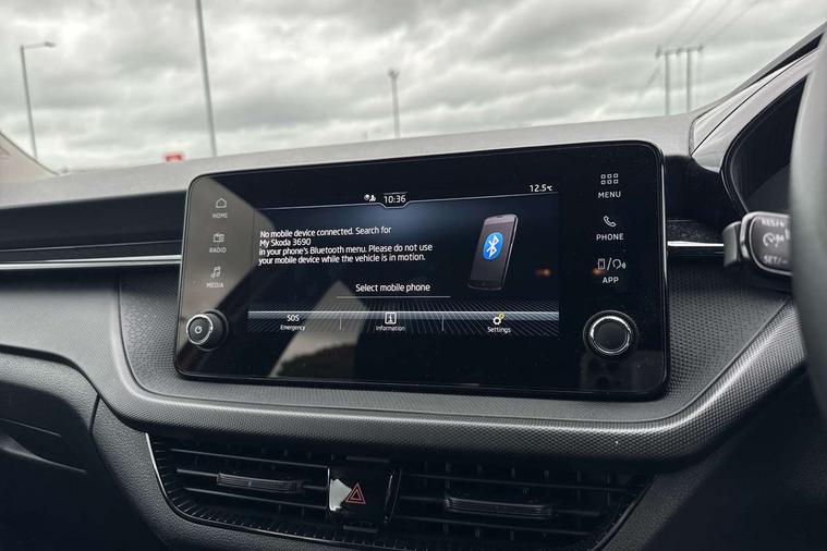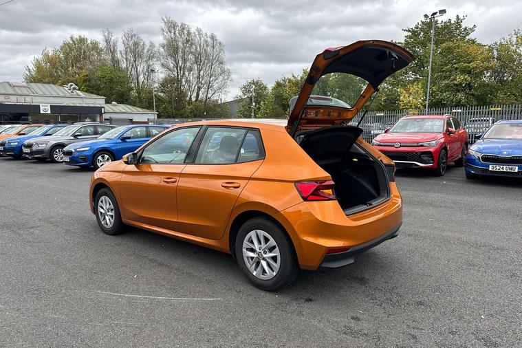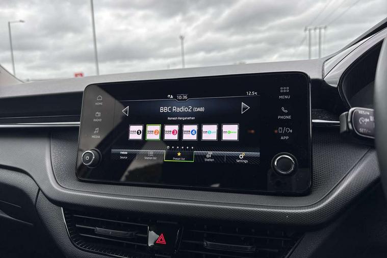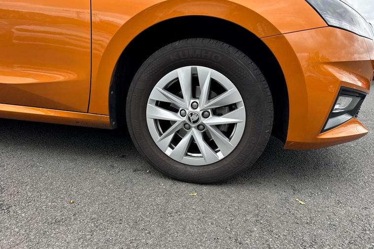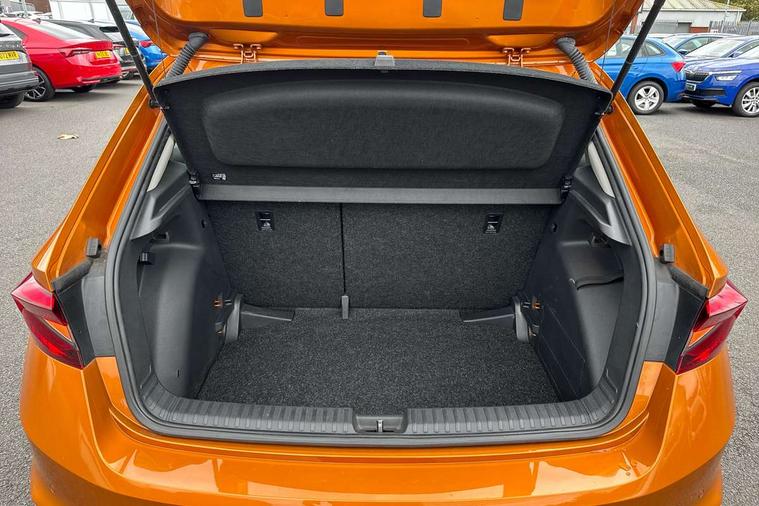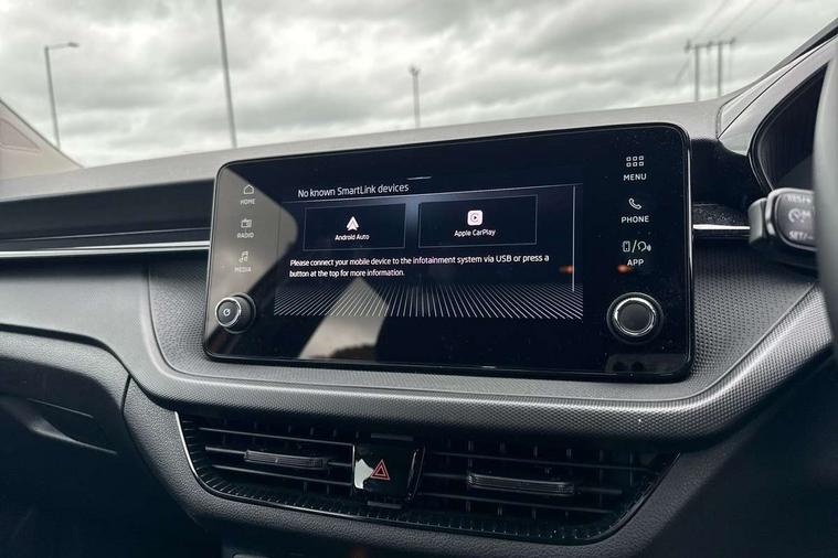 8" Digital instrument display, Advanced driver attention and drowsiness monitor, Bluetooth connection, Electromechanical power steering, Exterior temperature gauge, Lane assist including road edge detection, Rear parking sensors, Service interval indicator, Speed limiter, Traffic sign recognition, Wireless SmartLink for Apple CarPlay and Android Auto, 2x USB-C in the front (for data transmission and charging), 6 speakers (4 speakers/2 tweeters), 8.25" Skoda infotainment touchscreen display, Auxiliary socket for external MP3 player, DAB digital radio reception, Basic LED Headlights, Basic rear lights, Body colour door mirrors, Body coloured bumpers, Dimming rear view mirror with black frame, Door mirror integrated indicators, Electrically adjustable and heated door mirrors, Electrically adjustable front windows with function auto up/down, Front fog lights, Front window wiper intermittent control, Headlight range control - Automatic, Ice scraper in fuel cap, LED daytime running lights with coming and leaving home feature, Mechanical adjustable rear windows, Rain sensor, Rear LED fog light, Rear side wing doors, Rear window wiper with washing nozzles, Roof mounted spoiler, SKODA tailgate lettering in chrome, Third brake light, 2 reading lights in front and 2 reading lights in rear, 2 spoke leather multifunction steering wheel, 3 rear headrests, Backrest split and folding, Central console with removable cup holder and storage box, Chrome handbrake release button, Fabric upholstery, Front centre armrest, Gearshift knob/handle in leather, Grain satin black interior door handles, Hand brake lever handle in leather, Height adjustable driver seat, Height adjustable front headrests, Height adjustable steering wheel, ISOFIX and TopTether anchorage points to the outer rear seats, ISOFIX and TopTether on the front passenger seat, Luggage compartment lighting, Manual air conditioning, Pollen filter, Rear seat bench unsplit, Single front passenger seat, Storm grey headlining, Sun visors with mirror and airbag label on passenger side, Textile floor mats, Ticket holder, 3-point height adjustable front seats belts with pretensioner and force limiter, Automatic warning lights in case of crash, Driver and passengers airbag with switch off function, e-Call+, ESC including ABS, MSR, ASR, EDS, HBA and XDS, Front and rear seat belt warning, FRONT ASSIST (AEB City and AEB Inter Urban), Front side airbags, Head airbags, One tone horn, Pedestrian protection, Three rear 3-points safety seat belts with pretensioner and force limiter including stop function for outer rear seat belts, Tyre pressure monitoring system, Anti-theft alarm system including immobiliser, interior monitoring, backup horn, and towing protection, Central locking with radio remote control, interior controls, SAFE function and 2 foldable keys, Black painted air vents, Glossy black decorative trim, Grain satin black central console cover, Grain satin black lower decorative trim, Satin black door and side trim panel in front, Anti-theft wheel bolts protection, Super-low rolling resistance tyres,