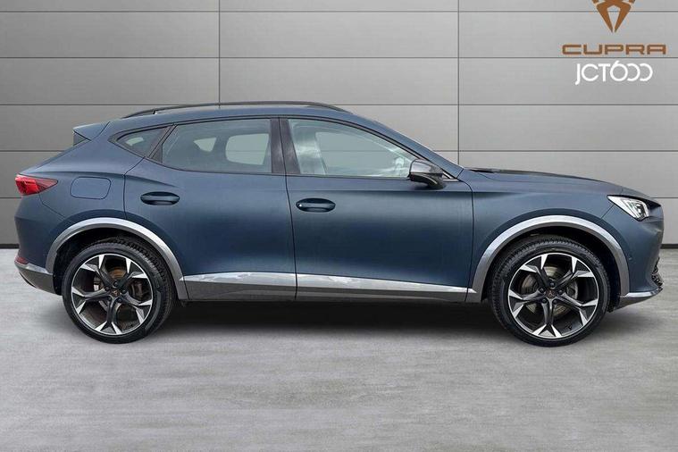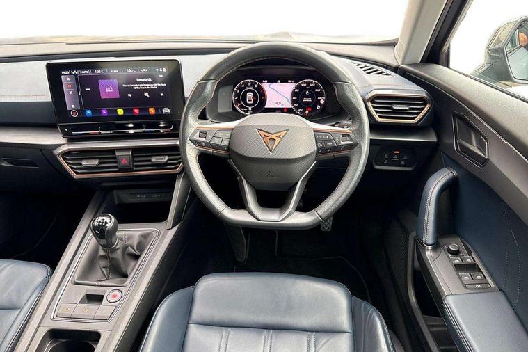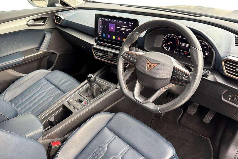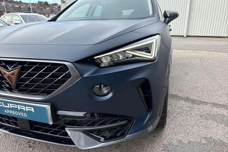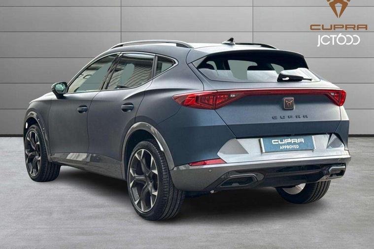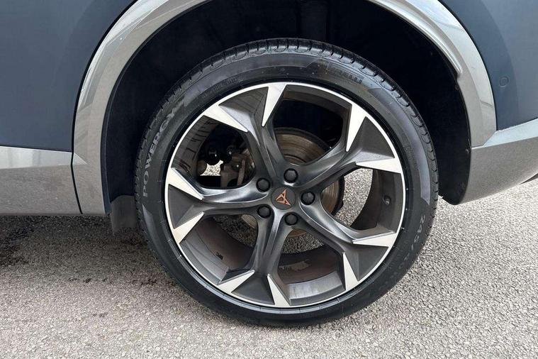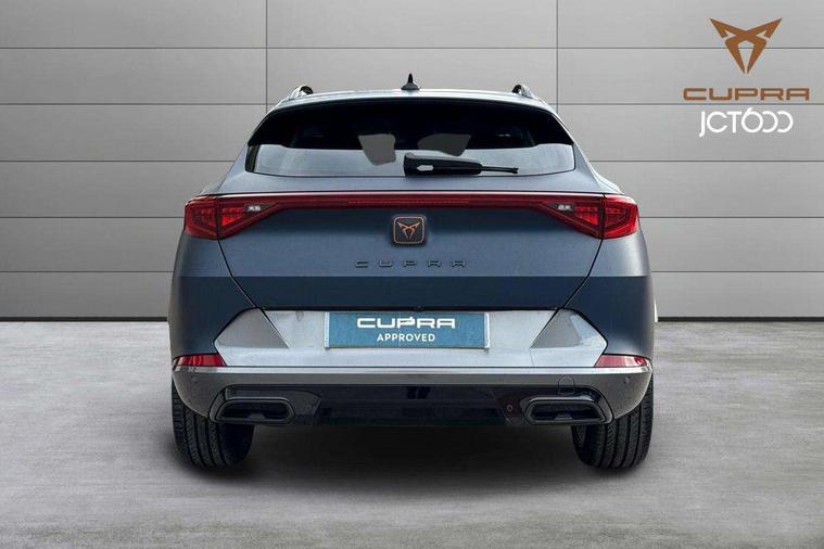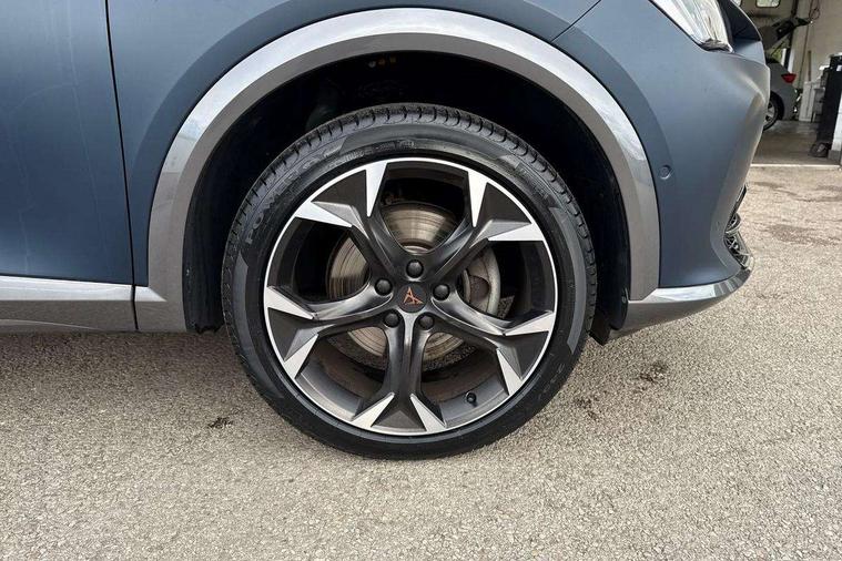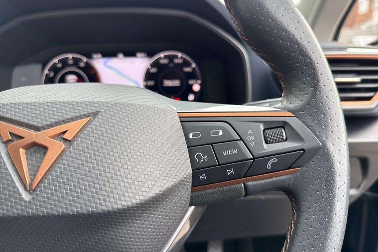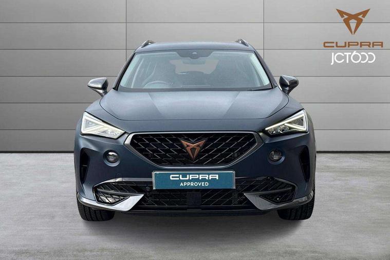 Digital cockpit and configurable dashboard, Driver alert system, Driving profile selection, E-call, Forward collision warning with automatic braking, Lane assist, Park assist (inc front/rear parking sensors), PAS, Predictive adaptive cruise control with speed limiter, Rear view camera, RPM, trip computer, outside temp gauge, instrument light brightness, low fuel warning light, lights on reminder, gearshift indicator, Service interval indicator, Start/stop system with regenerative braking, Wireless apple carplay, Wireless phone charger, Electronic locking differential and dynamic traction support, Standard suspension, 2 front and 2 rear USB type C sockets, Auxiliary input socket, DAB radio, Auto dimming rear view mirror, Body colour door handles, Body coloured bumpers, Dark grey wing mirror, Daytime running light with automatic headlight control and coming home feature, Dynamic headlight range control, Electric front/rear windows, Electrically adjustable heated and folding door mirrors with memory function, Front fog lamps with cornering function, Gloss black roof rails and window surrounds, LED Headlights, LED Taillights with dynamic indicator, Rain sensing wipers, Rear diffuser with black simulated exhaust pipes, Rear side wing doors, Rear wash/wipe, Third brake light, Tinted rear windows, Welcome lights, 12v power supply in centre console, 12V socket, 12v socket in loadspace, 2 front and 2 rear reading lights, 230V socket, 3 seat bench in 2nd row, 60/40 split rear bench seat with armrest and mechanical seat release, Dust/pollen filter, Front and rear head restraints, Front centre armrest, Height/reach adjust steering wheel, Illuminated interior front door sills, Illuminated sunvisor with mirror, Isofix, Leather multi function steering wheel, Luggage tie-down hooks, Single front passenger seat, Three zone climate control with control panel in rear, Variable luggage/load compartment floor, Wraparound lighting, Genuine Nappa leather Pack - Cupra, Navigation system pack with 10" navigation system - Formentor, Safety and driving pack (M) - Formentor, 3 point seatbelts on all rear seats, ABS, Brake control system - ESC and brake booster, Child proof door locks, Driver and front passenger airbags with front passenger airbag de-activation, Electronic parking brake, Front and rear disc brakes, Front side curtain airbags, Hill hold control, Seat belt reminder for front and rear seats, Tyre pressure monitoring system, Anti theft alarm system, Keyless entry and start system (KESSY), Locking wheel bolts, Copper and aluminium interior detailing, 19" 'Exclusive' machined sport matte black and silver alloy wheels,