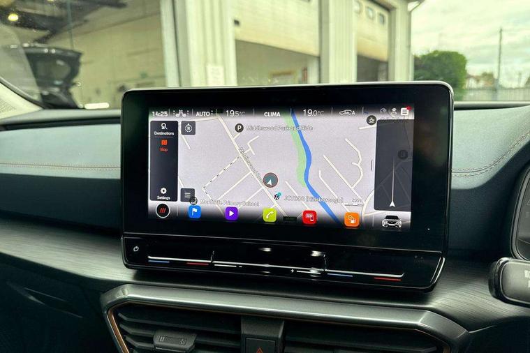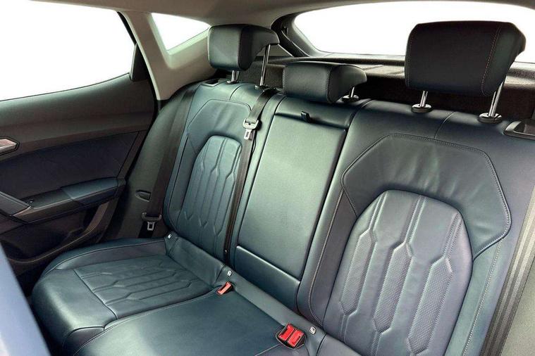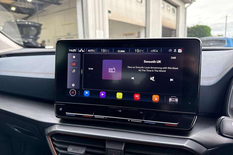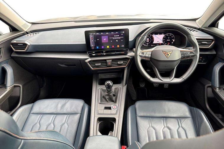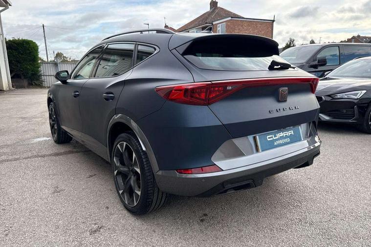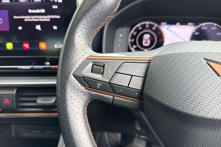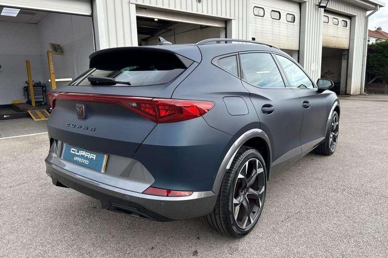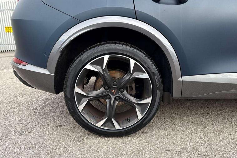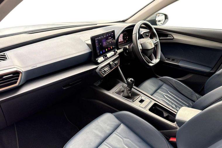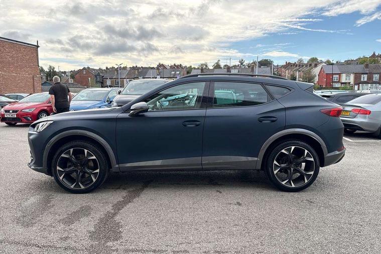 Digital cockpit and configurable dashboard, Driver alert system, Driving profile selection, E-call, Forward collision warning with automatic braking, Lane assist, Park assist (inc front/rear parking sensors), PAS, Predictive adaptive cruise control with speed limiter, Rear view camera, RPM, trip computer, outside temp gauge, instrument light brightness, low fuel warning light, lights on reminder, gearshift indicator, Service interval indicator, Start/stop system with regenerative braking, Wireless apple carplay, Wireless phone charger, Electronic locking differential and dynamic traction support, Standard suspension, 2 front and 2 rear USB type C sockets, Auxiliary input socket, DAB radio, Auto dimming rear view mirror, Body colour door handles, Body coloured bumpers, Dark grey wing mirror, Daytime running light with automatic headlight control and coming home feature, Dynamic headlight range control, Electric front/rear windows, Electrically adjustable heated and folding door mirrors with memory function, Front fog lamps with cornering function, Gloss black roof rails and window surrounds, LED Headlights, LED Taillights with dynamic indicator, Rain sensing wipers, Rear diffuser with black simulated exhaust pipes, Rear side wing doors, Rear wash/wipe, Third brake light, Tinted rear windows, Welcome lights, 12v power supply in centre console, 12V socket, 12v socket in loadspace, 2 front and 2 rear reading lights, 230V socket, 3 seat bench in 2nd row, 60/40 split rear bench seat with armrest and mechanical seat release, Dust/pollen filter, Front and rear head restraints, Front centre armrest, Height/reach adjust steering wheel, Illuminated interior front door sills, Illuminated sunvisor with mirror, Isofix, Leather multi function steering wheel, Luggage tie-down hooks, Single front passenger seat, Three zone climate control with control panel in rear, Variable luggage/load compartment floor, Wraparound lighting, Genuine Nappa leather Pack - Cupra, Navigation system pack with 10" navigation system - Formentor, Safety and driving pack (M) - Formentor, 3 point seatbelts on all rear seats, ABS, Brake control system - ESC and brake booster, Child proof door locks, Driver and front passenger airbags with front passenger airbag de-activation, Electronic parking brake, Front and rear disc brakes, Front side curtain airbags, Hill hold control, Seat belt reminder for front and rear seats, Tyre pressure monitoring system, Anti theft alarm system, Keyless entry and start system (KESSY), Locking wheel bolts, Copper and aluminium interior detailing, 19" 'Exclusive' machined sport matte black and silver alloy wheels,