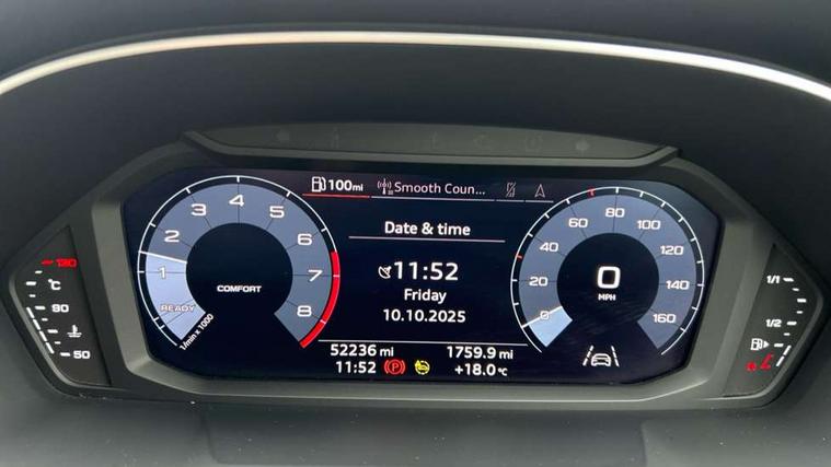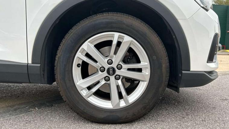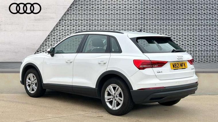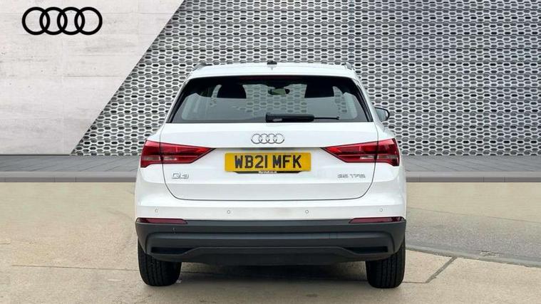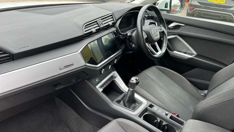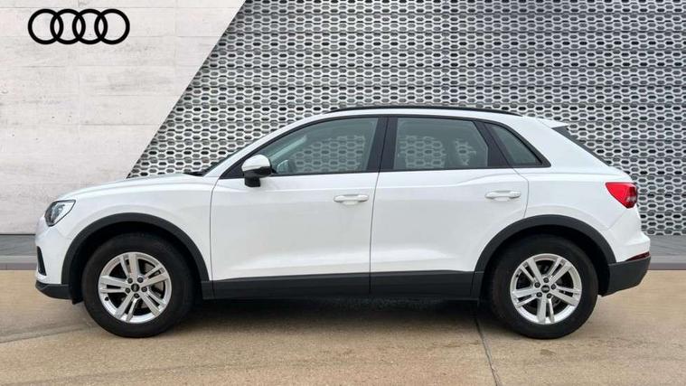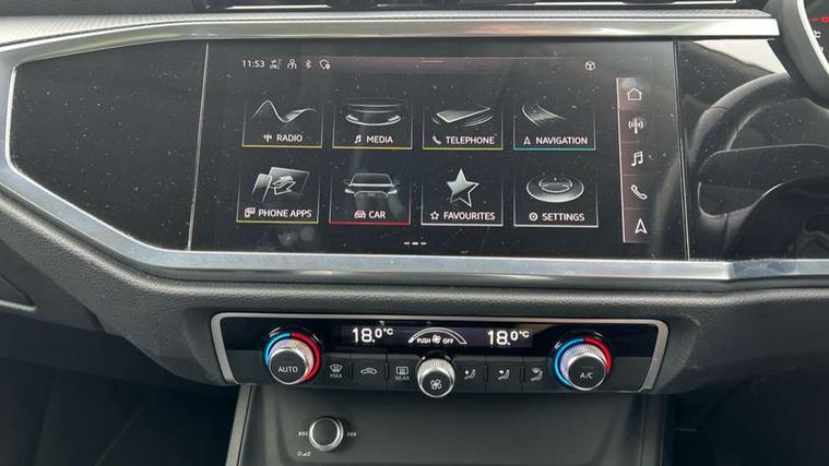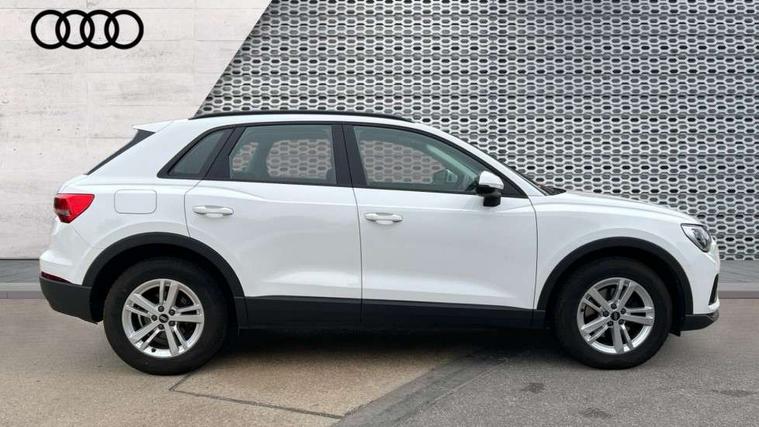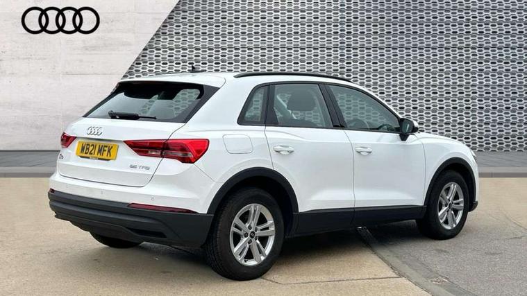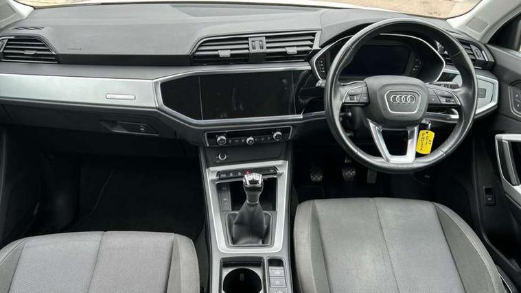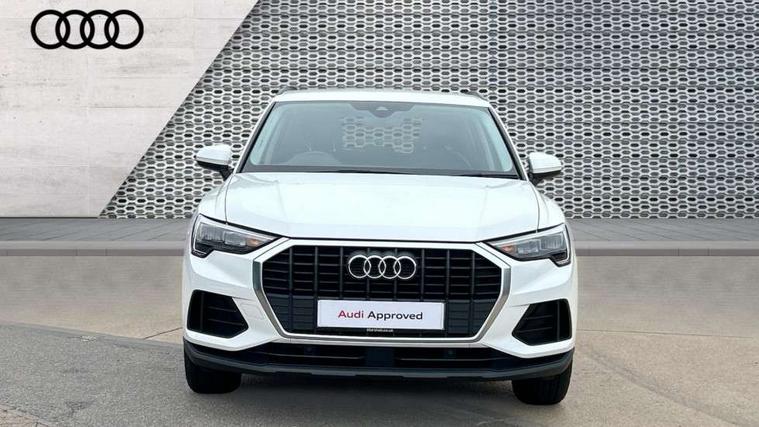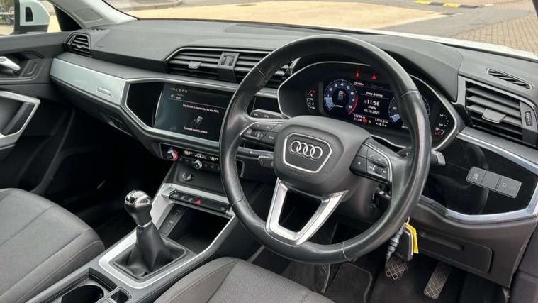 Amazon alexa Integration, Audi connect safety and service (e-call), Audi drive select, Audi lane departure warning, Audi Virtual Cockpit - 10.25" display, Bluetooth interface, Camera based traffic sign recognition, Cruise control + speed limiter, MMI Navigation Plus with high resolution 10.1 inch touchscreen colour display, Power operated tailgate, Progressive steering, Rear parking sensors, Service interval indicator, Smartphone interface includes wireless Apple carplay/Android Auto, Start stop system with recuperation, Voice control system with natural language interaction, Standard suspension, 2 USB-C ports with charge and data functions, 6 passive loudspeakers, DAB digital radio module, Acoustic windscreen, Auto dimming frameless rear view mirror, Black roof rails, Body colour door mirrors, Diffuser in grained anthracite, Electrically folding, adjustable and heated door mirrors with integrated LED side indicators and kerb view function for passenger side, Exterior bumper with wheel arch trims and side sill trims in grained black matt, Front and rear electric windows, Grained radiator protective grille, Halogen rear lights, LED headlights with LED daytime running lights, Rain and light sensors, 12V socket in rear centre console, 3 spoke multi-function leather steering wheel, 40:20:40 folding with manual adjustment for 60:40 forwards/backwards position and backrest angle, Dual zone electronic climate control, Front and rear floor mats, Front and rear headrests, Front and rear roof module including reading lights, Front centre armrest, Glove compartment lighting, Height and reach adjustable steering wheel, ISOFIX child seat mounting for front passenger with airbag deactivation and outer rear seat including top tether attachment point for outer rear seats, Luggage compartment light, Lunar silver cloth headlining, Manual front seats with height adjustment, Stainless steel luggage compartment sill finisher, Non smoking pack - Q3, 3x3 point rear seatbelts, 6 airbags - Driver, front passenger, curtain and side windows, Audi pre-sense front with pedestrain and cyclist recognition, Electrically operated child locks on rear doors, Electromechanical parking brake, Electronic stabilisation control including ABS, ASR and EDL, Hill descent control, Hill hold assist, Pre sense basic, Seatbelt monitoring, Tyre pressure warning, Warning triangle and first aid kit, Anti theft alarm, Anti theft wheel bolts, Remote central locking, Detail dashboard around MMI touch colour display in glass look, black with surround in aluminium look, Micrometallic silver inlay, 17" 5 twin spoke design alloy wheels,