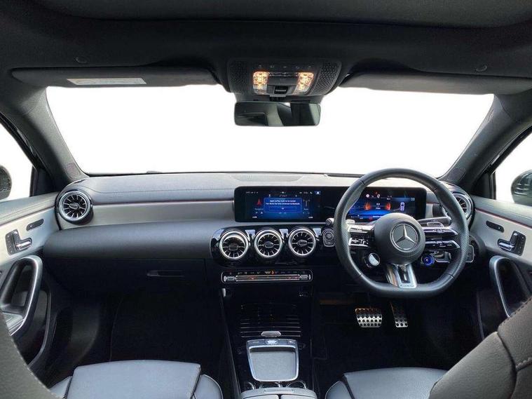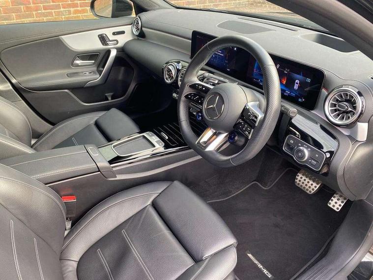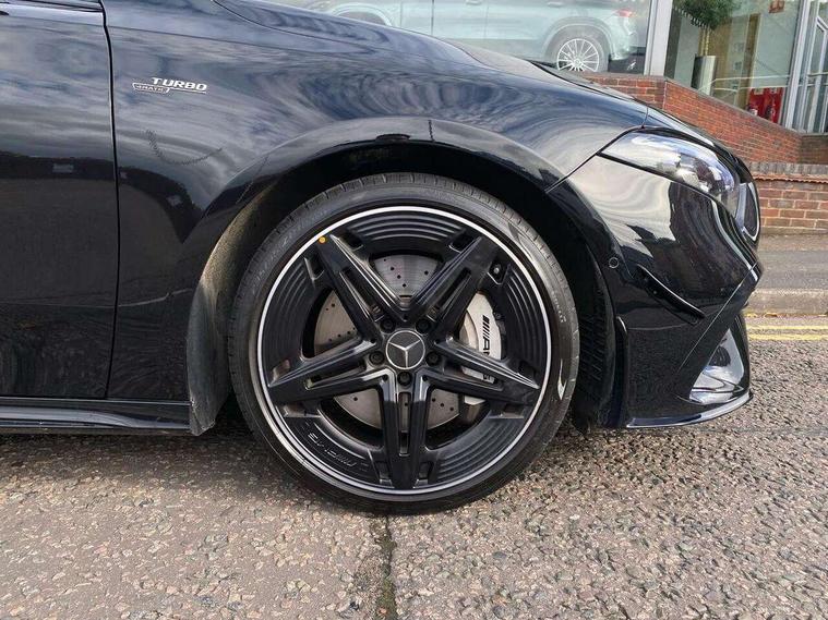 10.25 inch touchscreen central media display, 10.25" Digital instrument cluster display screen, Attention assist, Brake pad wear indicator warning light, Car wash mode, Direct steering, Direction indicators with lane change function, Dual bluetooth interfaces, DYNAMIC SELECT with driving programs (Slippery, Comfort, Sport, Sport+ and Individual), Easy pack tailgate hands-free access, ECO start/stop function, Engine start/stop button, Fingerprint scanner, Fluid level warning indicator for fuel, oil, coolant and washer fluid, Fluorescent jacket for driver, Hard-disk navigation, Head up Display, Hey Mercedes Voice activation, Lamp failure indicator, MBUX augmented reality for navigation, MBUX Interior assistant, Mercedes me connect including emergency call system, accident recovery, breakdown and maintenance management, Mercedes me remote services, Outside temperature gauge, Owners manual in English, Pre-installation of private car share, Preinstallation for Mercedes Benz link, Remote boot closing, Service indicator (ASSYST), Smartphone integration with Apple CarPlay and Android auto, Speed sensitive power steering, Tailgate, Traffic sign assist, Trip computer in multifunction display with current consumption indicator, Wireless charging, AMG suspension, Suspension with adaptive damping system, DAB Digital radio, MBUX multimedia system, Mercedes Benz advanced sound system (225 W) with 10 speakers, 1 central speaker, speakers on doors, a tweeter on door, one sub woofer + boost amplifier, 4 Electric Front and Rear windows, Adaptive brake lights, AMG body styling - AMG front apron with front splitter and AMG rear apron and visible exhaust tailpipe trim elements, AMG Front apron with flics as air deflector elements on the outer air intakes, AMG radiator grille with twin blade lamella and AMG Lettering, AMG Rear apron with specific diffuser look with four vertical fins and two round chrome plated tailpipe trim elements with a diameter of 90 mm, AMG spoiler lip on roof, Beltline strips in High gloss Black, Body colour bumpers, Body colour door handles with chrome inserts, Body colour side skirt, Electric adjustable and heated door mirrors with integrated LED side indicators, Front splitter and trim elements on the louvres in the outer air inlets, Front wings wheel arches with TURBO 4MATIC lettering, Headlamp assist automatic headlamp activation, Heat insulating dark tinted rear and rear side windows, Heated glass rear windscreen + timer control, LED daytime running lights, LED High level third brake light, LED tail lamp, Multibeam LED headlamps with adaptive highbeam assist and cornering function, Panoramic sliding sunroof, Privacy glass, Radio aerial, Rain sensing windscreen wipers with two sensitivity settings, Rear fog lights, Rear side wing doors, Rear windscreen wiper, Surround lighting with logo projection, Wider wheel arches for AMG wheels, Window line trim strip in black, 3 seat bench in 2nd row, 40:20:40 split folding rear seats, Air conditioning - Two zone thermotronic luxury automatic climate control with display, AMG floor mats, AMG Performance steering wheel in nappa leather, Automatic child seat recognition sensor, Black air vents with surround in silver chrome, Black roof lining, Brushed stainless steel sports pedals with rubber studs, Electrically adjustable front memory seats including lumbar support and backrest inclination, Front centre armrest with stowage, Front seat backs luggage nets, Height/reach adjustable steering column, Illuminated AMG front door sills with changeable cover, Interior lighting - 64 colour Ambient lighting, Interior mirror with reading lamps in black and frameless, Rear armrest with 2 cupholders, Seat occupancy sensor for front passenger seat, Silver coloured aluminium gear shift paddles on steering wheel, Single front passenger seat, Sports seats with integrated headrests, Stowage compartment in centre console with retractable cover, Sunvisors with illuminated vanity mirrors, Twin front cupholders, Aerodynamic pack - A Class, AMG night pack - A Class, Light and sight package - A Class, Mirror package - A Class, Parking pack with 360 degree camera - A Class, Seat comfort pack - A Class, USB pack plus - A Class, Winter pack - A Class, 3 rear 3 point seatbelts, ABS with Brake Assist, Active bonnet, Adaptive brake assist with hold function and hill start assist, Black seatbelts, Bonnet with power domes, Childproof locks manually operated for rear doors and electrically operated for rear power windows, Crash responsive emergency lighting, Driver and passenger head and side airbags, Drivers knee airbag, Dual stage driver/passenger airbags, Electronic parking brake, ESP curve dynamic assist, ESP with ASR, Exit warning, Front and rear seatbelt reminder, Front brake calipers with AMG lettering, ISOFIX and top tether child seat fixing points in two outer rear seats, Tyre pressure monitoring system, Warning triangle and first aid kit, Window airbags, Alarm system/interior protection/immobiliser, Guard 360 degree vehicle protection, Keyless entry lock/unlock, Keyless Go, Remote central locking and crash sensor with emergency opening function, Light longitudinal grain aluminium trim, 19" AMG 5 twin spoke light alloy wheels aerodynamically optimised painted in matt black with high sheen rim flange, Summer tyres, Tirefit sealant kit,