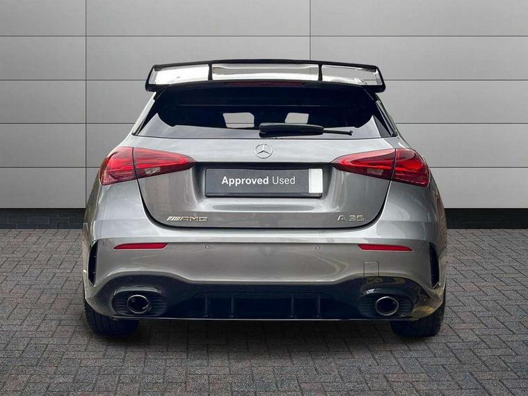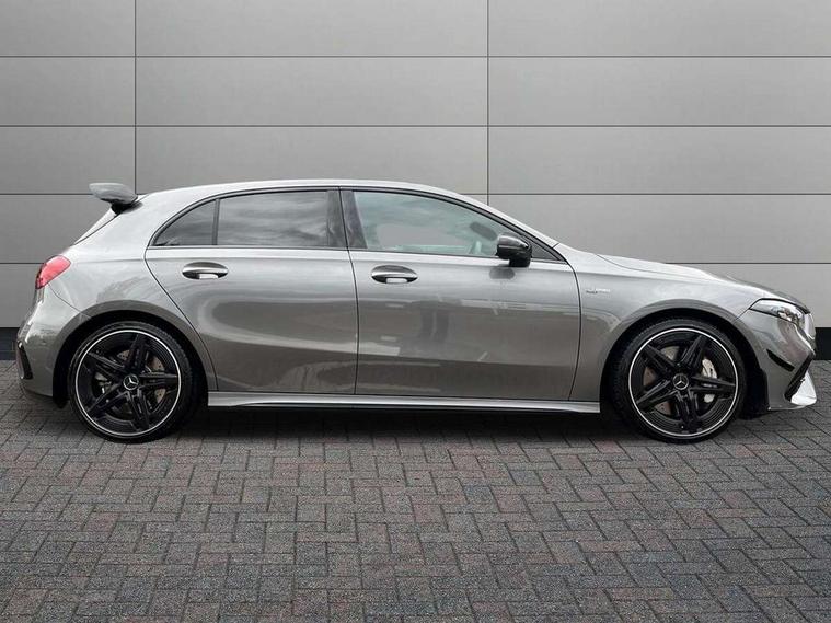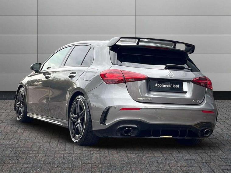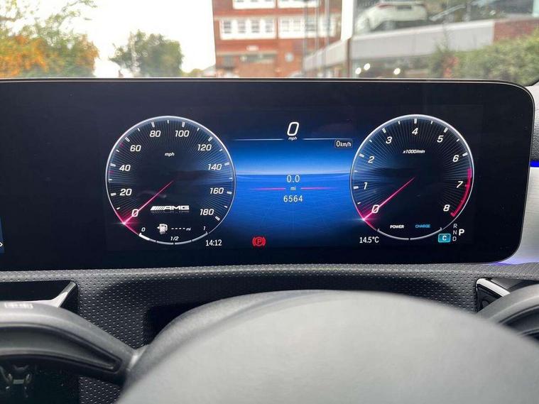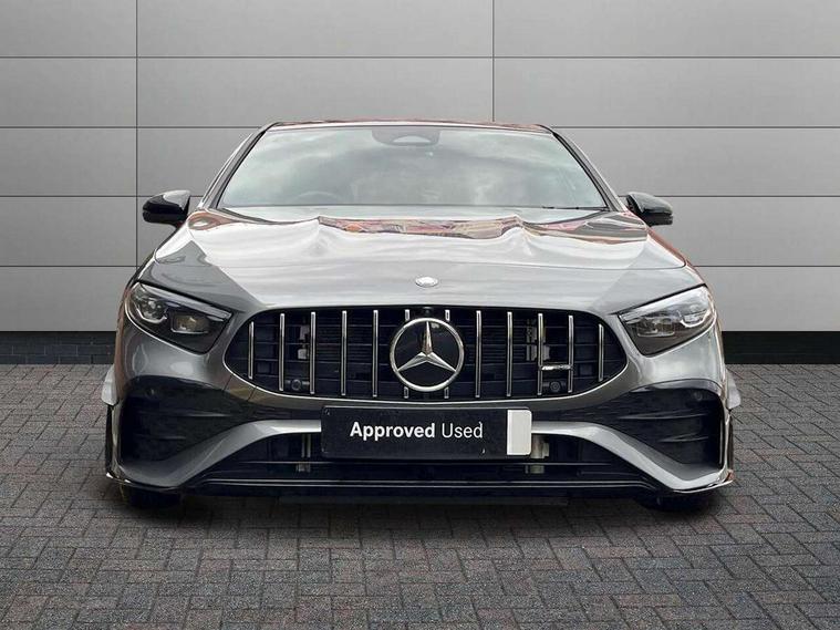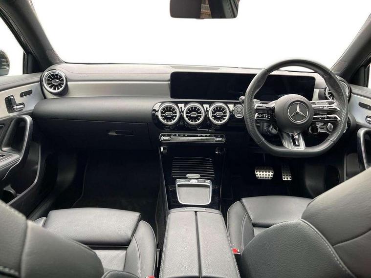 10.25 inch touchscreen central media display, 10.25" Digital instrument cluster display screen, Attention assist, Brake pad wear indicator warning light, Car wash mode, Direct steering, Direction indicators with lane change function, Dual bluetooth interfaces, DYNAMIC SELECT with driving programs (Slippery, Comfort, Sport, Sport+ and Individual), Easy pack tailgate hands-free access, ECO start/stop function, Engine start/stop button, Fingerprint scanner, Fluid level warning indicator for fuel, oil, coolant and washer fluid, Fluorescent jacket for driver, Hard-disk navigation, Head up Display, Hey Mercedes Voice activation, Lamp failure indicator, MBUX augmented reality for navigation, MBUX Interior assistant, Mercedes me connect including emergency call system, accident recovery, breakdown and maintenance management, Mercedes me remote services, Outside temperature gauge, Owners manual in English, Pre-installation of private car share, Preinstallation for Mercedes Benz link, Remote boot closing, Service indicator (ASSYST), Smartphone integration with Apple CarPlay and Android auto, Speed sensitive power steering, Tailgate, Traffic sign assist, Trip computer in multifunction display with current consumption indicator, Wireless charging, AMG suspension, Suspension with adaptive damping system, DAB Digital radio, MBUX multimedia system, Mercedes Benz advanced sound system (225 W) with 10 speakers, 1 central speaker, speakers on doors, a tweeter on door, one sub woofer + boost amplifier, 4 Electric Front and Rear windows, Adaptive brake lights, AMG body styling - AMG front apron with front splitter and AMG rear apron and visible exhaust tailpipe trim elements, AMG Front apron with flics as air deflector elements on the outer air intakes, AMG radiator grille with twin blade lamella and AMG Lettering, AMG Rear apron with specific diffuser look with four vertical fins and two round chrome plated tailpipe trim elements with a diameter of 90 mm, AMG spoiler lip on roof, Beltline strips in High gloss Black, Body colour bumpers, Body colour door handles with chrome inserts, Body colour side skirt, Electric adjustable and heated door mirrors with integrated LED side indicators, Front splitter and trim elements on the louvres in the outer air inlets, Front wings wheel arches with TURBO 4MATIC lettering, Headlamp assist automatic headlamp activation, Heat insulating dark tinted rear and rear side windows, Heated glass rear windscreen + timer control, LED daytime running lights, LED High level third brake light, LED tail lamp, Multibeam LED headlamps with adaptive highbeam assist and cornering function, Panoramic sliding sunroof, Privacy glass, Radio aerial, Rain sensing windscreen wipers with two sensitivity settings, Rear fog lights, Rear side wing doors, Rear windscreen wiper, Surround lighting with logo projection, Wider wheel arches for AMG wheels, Window line trim strip in black, 3 seat bench in 2nd row, 40:20:40 split folding rear seats, Air conditioning - Two zone thermotronic luxury automatic climate control with display, AMG floor mats, AMG Performance steering wheel in nappa leather, Automatic child seat recognition sensor, Black air vents with surround in silver chrome, Black roof lining, Brushed stainless steel sports pedals with rubber studs, Electrically adjustable front memory seats including lumbar support and backrest inclination, Front centre armrest with stowage, Front seat backs luggage nets, Height/reach adjustable steering column, Illuminated AMG front door sills with changeable cover, Interior lighting - 64 colour Ambient lighting, Interior mirror with reading lamps in black and frameless, Rear armrest with 2 cupholders, Seat occupancy sensor for front passenger seat, Silver coloured aluminium gear shift paddles on steering wheel, Single front passenger seat, Sports seats with integrated headrests, Stowage compartment in centre console with retractable cover, Sunvisors with illuminated vanity mirrors, Twin front cupholders, Aerodynamic pack - A Class, AMG night pack - A Class, Light and sight package - A Class, Mirror package - A Class, Parking pack with 360 degree camera - A Class, Seat comfort pack - A Class, USB pack plus - A Class, Winter pack - A Class, 3 rear 3 point seatbelts, ABS with Brake Assist, Active bonnet, Adaptive brake assist with hold function and hill start assist, Black seatbelts, Bonnet with power domes, Childproof locks manually operated for rear doors and electrically operated for rear power windows, Crash responsive emergency lighting, Driver and passenger head and side airbags, Drivers knee airbag, Dual stage driver/passenger airbags, Electronic parking brake, ESP curve dynamic assist, ESP with ASR, Exit warning, Front and rear seatbelt reminder, Front brake calipers with AMG lettering, ISOFIX and top tether child seat fixing points in two outer rear seats, Tyre pressure monitoring system, Warning triangle and first aid kit, Window airbags, Alarm system/interior protection/immobiliser, Guard 360 degree vehicle protection, Keyless entry lock/unlock, Keyless Go, Remote central locking and crash sensor with emergency opening function, Light longitudinal grain aluminium trim, 19" AMG 5 twin spoke light alloy wheels aerodynamically optimised painted in matt black with high sheen rim flange, Summer tyres, Tirefit sealant kit,