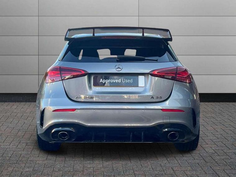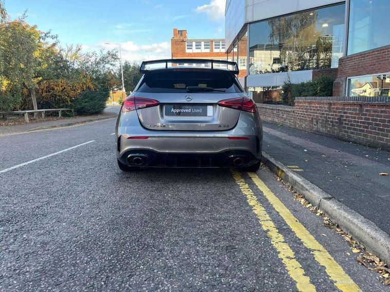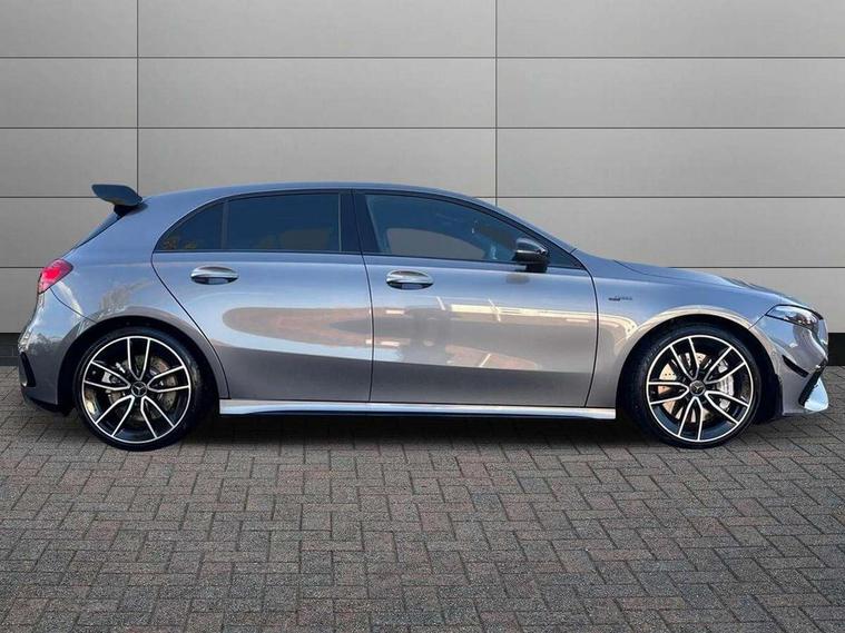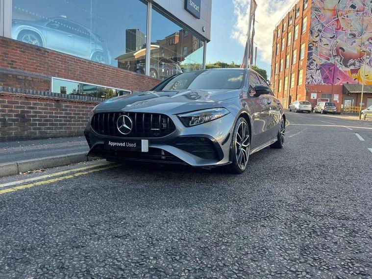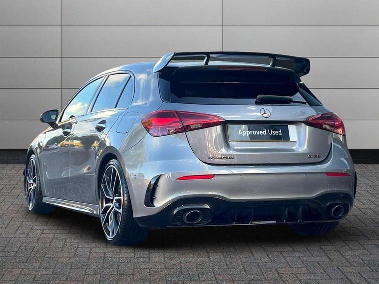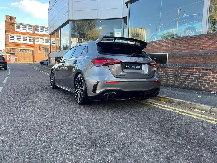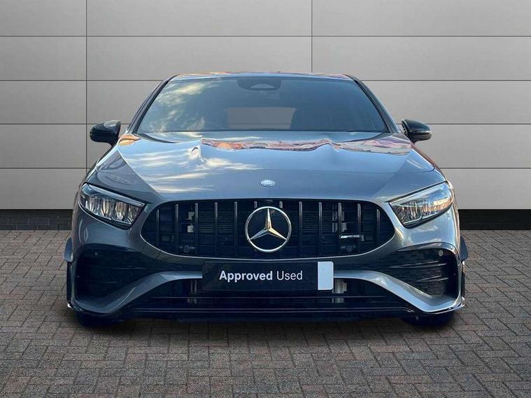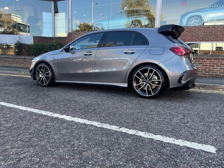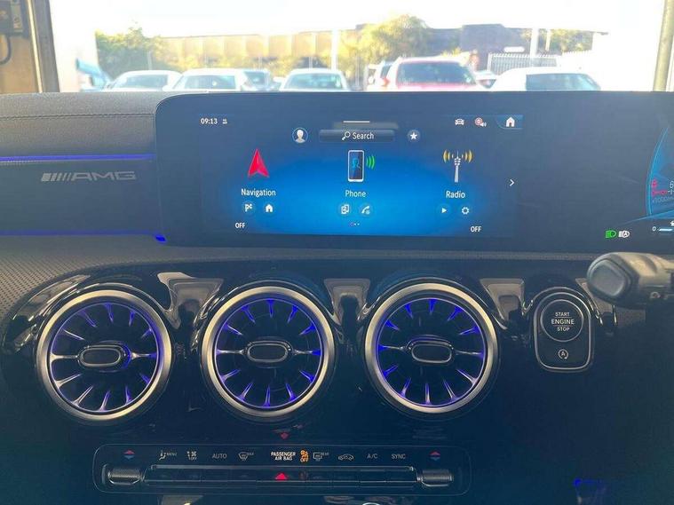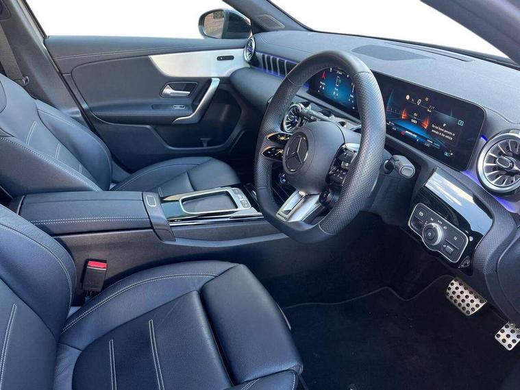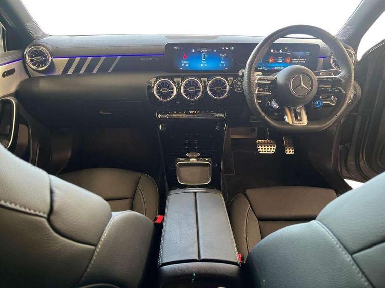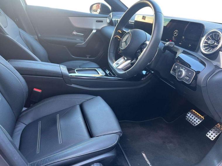 10.25 inch touchscreen central media display, 10.25" Digital instrument cluster display screen, Attention assist, Blind spot assist, Brake pad wear indicator warning light, Car wash mode, Cruise control + speed limiter, Direct steering, Direction indicators with lane change function, Dual bluetooth interfaces, DYNAMIC SELECT with driving programs (Slippery, Comfort, Sport, Sport+ and Individual), ECO start/stop function, Engine start/stop button, Fingerprint scanner, Fluid level warning indicator for fuel, oil, coolant and washer fluid, Fluorescent jacket for driver, Hard-disk navigation, Hey Mercedes Voice activation, Lamp failure indicator, Lane keeping system, MBUX augmented reality for navigation, Mercedes me connect including emergency call system, accident recovery, breakdown and maintenance management, Mercedes me remote services, Outside temperature gauge, Owners manual in English, Pre-installation of private car share, Remote boot closing, Service indicator (ASSYST), Smartphone integration with Apple CarPlay and Android auto, Speed limit assist, Speed sensitive power steering, Tailgate, Trip computer in multifunction display with current consumption indicator, Wireless charging, AMG suspension, DAB Digital radio, MBUX multimedia system, Mercedes Benz sound system (100 W) with 6 speakers, 4 Electric Front and Rear windows, Adaptive brake lights, AMG body styling - AMG front apron with front splitter and AMG rear apron and visible exhaust tailpipe trim elements, AMG Front apron with flics as air deflector elements on the outer air intakes, AMG Rear apron with specific diffuser look with four vertical fins and two round chrome plated tailpipe trim elements with a diameter of 90 mm, AMG spoiler lip on roof, AMG sports exhaust system with two round tailpipes attached to the rear apron, Beltline strips in High gloss Black, Body colour bumpers, Body colour door handles with chrome inserts, Body colour side skirt, Electric adjustable and heated door mirrors with integrated LED side indicators, Front splitter and trim elements on the louvres in the outer air inlets, Front wings wheel arches with TURBO 4MATIC lettering, Headlamp assist automatic headlamp activation, Heated glass rear windscreen + timer control, LED High level third brake light, LED High Performance headlamps including integral LED daytime running lamps and adaptive highbeam assist, LED tail lamp, Privacy glass, Radio aerial, Rain sensing windscreen wipers with two sensitivity settings, Rear fog lights, Rear side wing doors, Rear windscreen wiper, Wider wheel arches for AMG wheels, Window line trim strip in black, 3 seat bench in 2nd row, 4 way lumbar support, 40:20:40 split folding rear seats, Air conditioning - Two zone thermotronic luxury automatic climate control with display, AMG floor mats, AMG Performance steering wheel in nappa leather, Automatic child seat recognition sensor, Black air vents with surround in silver chrome, Black roof lining, Brushed stainless steel sports pedals with rubber studs, Front centre armrest with stowage, Front door sills with AMG lettering, Front seat backs luggage nets, Heated front seats, Height/reach adjustable steering column, Interior lighting - 64 colour Ambient lighting, Interior mirror with reading lamps in black and frameless, Rear armrest with 2 cupholders, Rear head restraints, Seat occupancy sensor for front passenger seat, Silver coloured aluminium gear shift paddles on steering wheel, Single front passenger seat, Sports seats with integrated headrests, Stowage compartment in centre console with retractable cover, Sunvisors with illuminated vanity mirrors, Twin front cupholders, Aerodynamic pack - A Class, AMG night pack - A Class, AMG night pack II - A Class, Light and sight package - A Class, Mirror package - A Class, Parking pack with 180 degree view - A Class, Seat comfort pack - A Class, USB pack plus - A Class, 3 rear 3 point seatbelts, ABS with Brake Assist, Active bonnet, Active brake assist includes forward collision warning system with autonomous braking, Adaptive brake assist with hold function and hill start assist, Black seatbelts, Bonnet with power domes, Childproof locks manually operated for rear doors and electrically operated for rear power windows, Crash responsive emergency lighting, Driver and passenger head and side airbags, Drivers knee airbag, Dual stage driver/passenger airbags, Electronic parking brake, ESP curve dynamic assist, ESP with ASR, Front and rear seatbelt reminder, Front brake calipers with AMG lettering, ISOFIX and top tether child seat fixing points in two outer rear seats, Tyre pressure monitoring system, Warning triangle and first aid kit, Window airbags, Alarm system/interior protection/immobiliser, Guard 360 degree vehicle protection, Keyless entry lock/unlock, Keyless Go, Remote central locking and crash sensor with emergency opening function, Aluminium AMG design black/silver interior trim, 19" AMG 5 twin spoke light alloy wheels painted in high gloss black with high sheen finish, Summer tyres, Tirefit sealant kit,