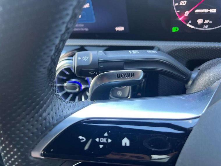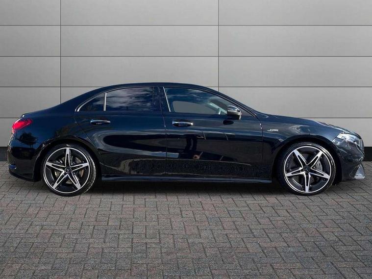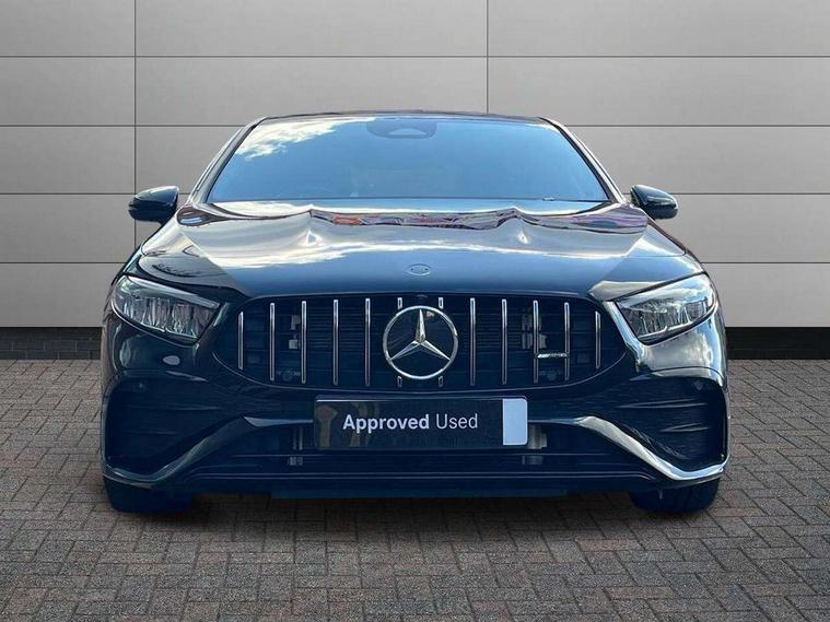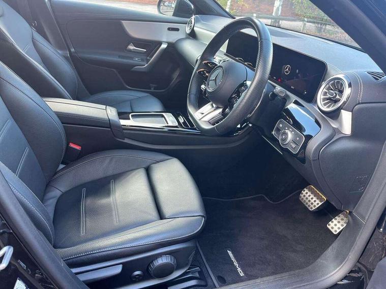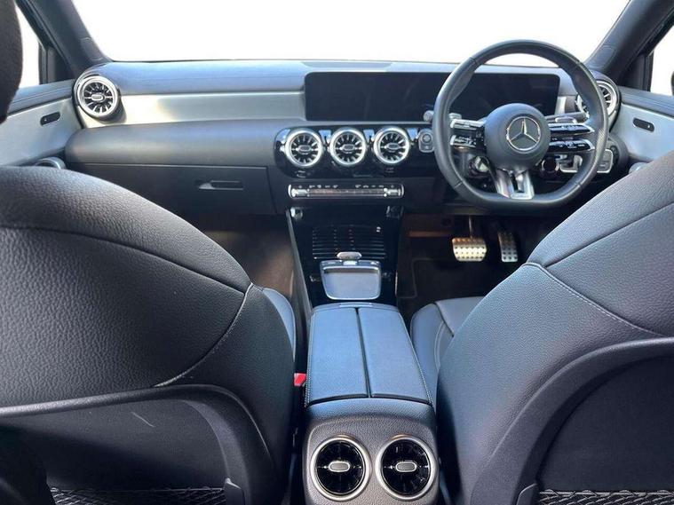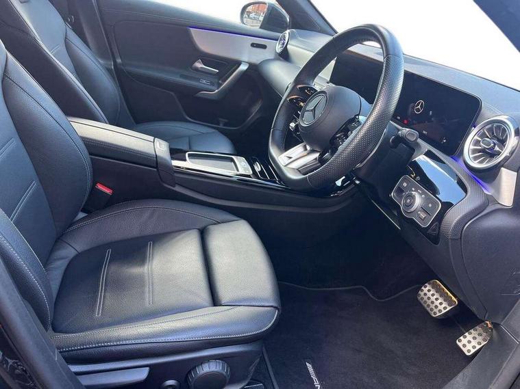 10.25 inch touchscreen central media display, 10.25" Digital instrument cluster display screen, Attention assist, Blind spot assist, Brake pad wear indicator warning light, Car wash mode, Cruise control + speed limiter, Direct steering, Direction indicators with lane change function, Dual bluetooth interfaces, DYNAMIC SELECT with driving programs (Slippery, Comfort, Sport, Sport+ and Individual), ECO start/stop function, Engine start/stop button, Fingerprint scanner, Fluid level warning indicator for fuel, oil, coolant and washer fluid, Fluorescent jacket for driver, Hard-disk navigation, Hey Mercedes Voice activation, Lamp failure indicator, Lane keeping system, MBUX augmented reality for navigation, Mercedes me connect including emergency call system, accident recovery, breakdown and maintenance management, Mercedes me remote services, Outside temperature gauge, Owners manual in English, Pre-installation of private car share, Preinstallation for Mercedes Benz link, Remote boot closing, Service indicator (ASSYST), Smartphone integration with Apple CarPlay and Android auto, Speed limit assist, Speed sensitive power steering, Trip computer in multifunction display with current consumption indicator, Wireless charging, AMG suspension, DAB Digital radio, MBUX multimedia system, Mercedes Benz advanced sound system (225 W) with 10 speakers, 1 central speaker, speakers on doors, a tweeter on door, one sub woofer + boost amplifier, 4 Electric Front and Rear windows, Adaptive brake lights, AMG body styling - AMG front apron with front splitter and AMG rear apron and visible exhaust tailpipe trim elements, AMG Front apron with flics as air deflector elements on the outer air intakes, AMG radiator grille with twin blade lamella and AMG Lettering, AMG Rear apron with specific diffuser look with four vertical fins and two round chrome plated tailpipe trim elements with a diameter of 90 mm, AMG spoiler lip on roof, Beltline strips in High gloss Black, Body colour bumpers, Body colour door handles with chrome inserts, Body colour side skirt, Electric adjustable and heated door mirrors with integrated LED side indicators, Front splitter and trim elements on the louvres in the outer air inlets, Front wings wheel arches with TURBO 4MATIC lettering, Headlamp assist automatic headlamp activation, Heat insulating dark tinted rear and rear side windows, Heated glass rear windscreen + timer control, LED High Performance headlamps including integral LED daytime running lamps and adaptive highbeam assist, LED tail lamp, Privacy glass, Radio aerial, Rain sensing windscreen wipers with two sensitivity settings, Rear boot, Rear fog lights, Rear side wing doors, Third brake light featuring LED technology, Wider wheel arches for AMG wheels, Window line trim strip in black, 3 seat bench in 2nd row, 40:20:40 split folding rear seats, Air conditioning - Two zone thermotronic luxury automatic climate control with display, AMG floor mats, AMG Performance steering wheel in nappa leather, Automatic child seat recognition sensor, Black air vents with surround in silver chrome, Black roof lining, Brushed stainless steel sports pedals with rubber studs, Electrically adjustable front memory seats including lumbar support and backrest inclination, Front centre armrest with stowage, Front seat backs luggage nets, Heated front seats, Height/reach adjustable steering column, Illuminated AMG front door sills with changeable cover, Interior lighting - 64 colour Ambient lighting, Interior mirror with reading lamps in black and frameless, Rear armrest with 2 cupholders, Seat occupancy sensor for front passenger seat, Silver coloured aluminium gear shift paddles on steering wheel, Single front passenger seat, Sports seats with adjustable head restraints, Stowage compartment in centre console with retractable cover, Sunvisors with illuminated vanity mirrors, Twin front cupholders, AMG night pack - A Class, Keyless go comfort pack - A Class, Light and sight package - A Class, Mirror package - A Class, Parking pack with 180 degree view - A Class, Seat comfort pack - A Class, USB pack plus - A Class, 3 rear 3 point seatbelts, ABS with Brake Assist, Active bonnet, Active brake assist includes forward collision warning system with autonomous braking, Adaptive brake assist with hold function and hill start assist, Black seatbelts, Bonnet with power domes, Childproof locks manually operated for rear doors and electrically operated for rear power windows, Crash responsive emergency lighting, Driver and passenger head and side airbags, Drivers knee airbag, Dual stage driver/passenger airbags, Electronic parking brake, ESP curve dynamic assist, ESP with ASR, Exit warning, Front and rear seatbelt reminder, Front brake calipers with AMG lettering, ISOFIX and top tether child seat fixing points in two outer rear seats, Tyre pressure monitoring system, Warning triangle and first aid kit, Window airbags, Alarm system/interior protection/immobiliser, Guard 360 degree vehicle protection, Remote central locking and crash sensor with emergency opening function, Light longitudinal grain aluminium trim, 19" AMG 5 twin spoke light alloy wheels aerodynamically optimised painted in matt black with high sheen finish, Summer tyres, Tirefit sealant kit,