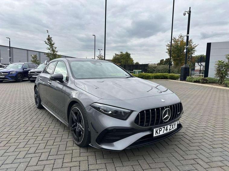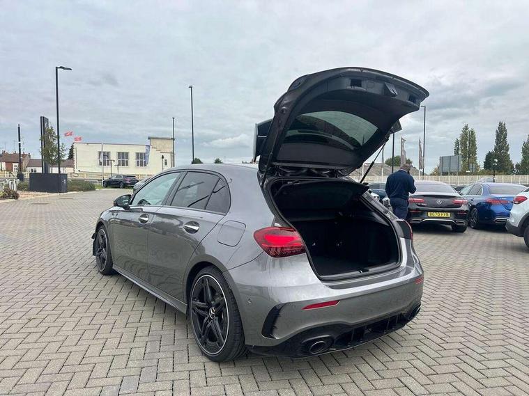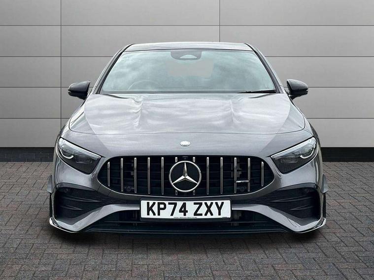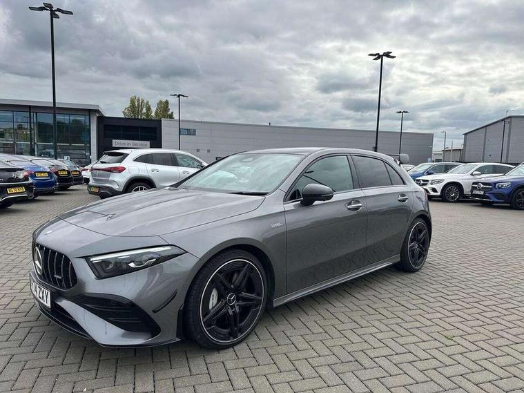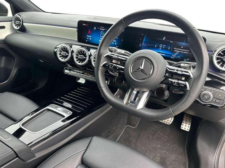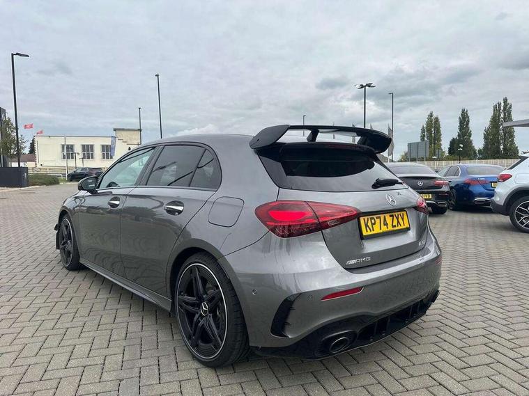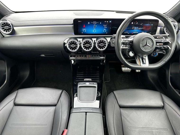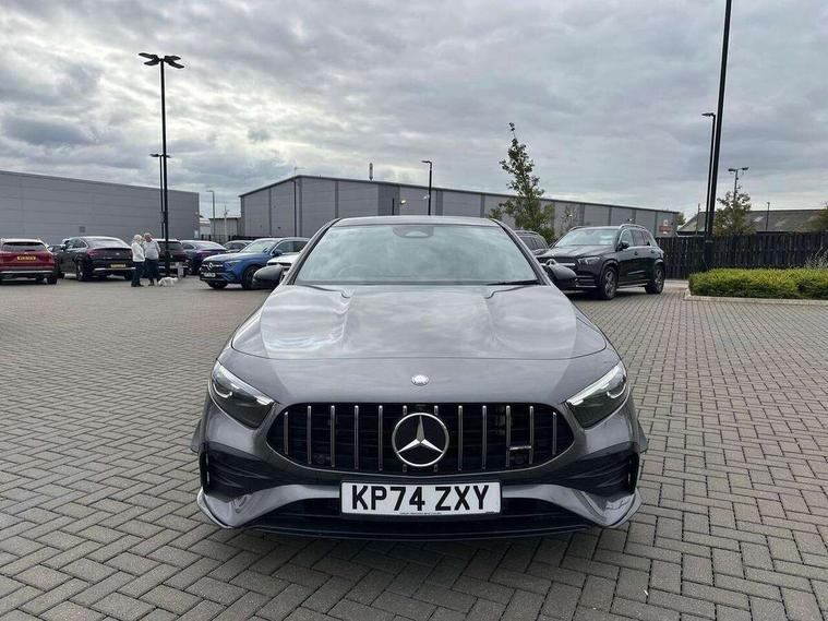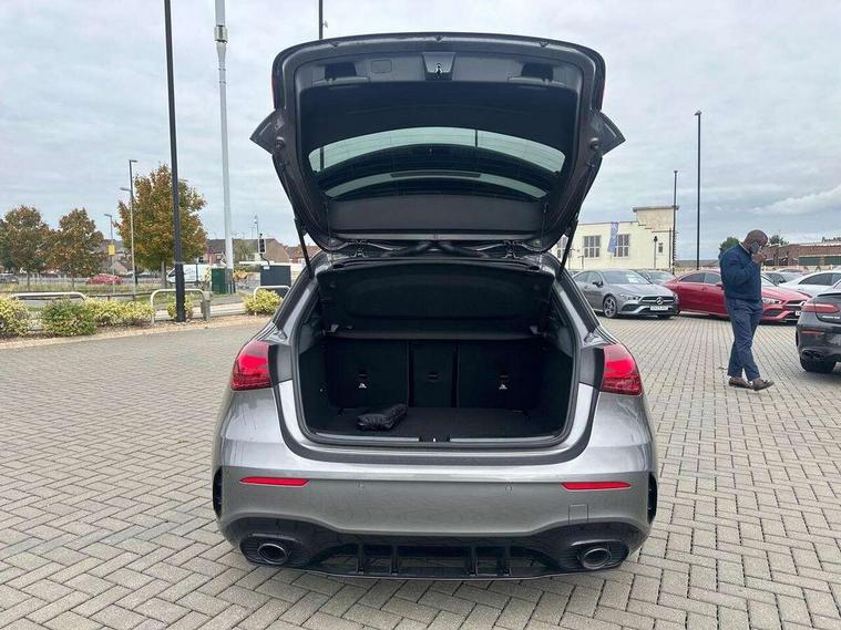 10.25 inch touchscreen central media display, 10.25" Digital instrument cluster display screen, Attention assist, Brake pad wear indicator warning light, Car wash mode, Direct steering, Direction indicators with lane change function, Dual bluetooth interfaces, DYNAMIC SELECT with driving programs (Slippery, Comfort, Sport, Sport+ and Individual), Easy pack tailgate hands-free access, ECO start/stop function, Engine start/stop button, Fingerprint scanner, Fluid level warning indicator for fuel, oil, coolant and washer fluid, Fluorescent jacket for driver, Hard-disk navigation, Head up Display, Hey Mercedes Voice activation, Lamp failure indicator, MBUX augmented reality for navigation, MBUX Interior assistant, Mercedes me connect including emergency call system, accident recovery, breakdown and maintenance management, Mercedes me remote services, Outside temperature gauge, Owners manual in English, Pre-installation of private car share, Preinstallation for Mercedes Benz link, Remote boot closing, Service indicator (ASSYST), Smartphone integration with Apple CarPlay and Android auto, Speed sensitive power steering, Tailgate, Traffic sign assist, Trip computer in multifunction display with current consumption indicator, Wireless charging, AMG suspension, Suspension with adaptive damping system, DAB Digital radio, MBUX multimedia system, Mercedes Benz advanced sound system (225 W) with 10 speakers, 1 central speaker, speakers on doors, a tweeter on door, one sub woofer + boost amplifier, 4 Electric Front and Rear windows, Adaptive brake lights, AMG body styling - AMG front apron with front splitter and AMG rear apron and visible exhaust tailpipe trim elements, AMG Front apron with flics as air deflector elements on the outer air intakes, AMG radiator grille with twin blade lamella and AMG Lettering, AMG Rear apron with specific diffuser look with four vertical fins and two round chrome plated tailpipe trim elements with a diameter of 90 mm, AMG spoiler lip on roof, Beltline strips in High gloss Black, Body colour bumpers, Body colour door handles with chrome inserts, Body colour side skirt, Electric adjustable and heated door mirrors with integrated LED side indicators, Front splitter and trim elements on the louvres in the outer air inlets, Front wings wheel arches with TURBO 4MATIC lettering, Headlamp assist automatic headlamp activation, Heat insulating dark tinted rear and rear side windows, Heated glass rear windscreen + timer control, LED daytime running lights, LED High level third brake light, LED tail lamp, Multibeam LED headlamps with adaptive highbeam assist and cornering function, Panoramic sliding sunroof, Privacy glass, Radio aerial, Rain sensing windscreen wipers with two sensitivity settings, Rear fog lights, Rear side wing doors, Rear windscreen wiper, Surround lighting with logo projection, Wider wheel arches for AMG wheels, Window line trim strip in black, 3 seat bench in 2nd row, 40:20:40 split folding rear seats, Air conditioning - Two zone thermotronic luxury automatic climate control with display, AMG floor mats, AMG Performance steering wheel in nappa leather, Automatic child seat recognition sensor, Black air vents with surround in silver chrome, Black roof lining, Brushed stainless steel sports pedals with rubber studs, Electrically adjustable front memory seats including lumbar support and backrest inclination, Front centre armrest with stowage, Front seat backs luggage nets, Height/reach adjustable steering column, Illuminated AMG front door sills with changeable cover, Interior lighting - 64 colour Ambient lighting, Interior mirror with reading lamps in black and frameless, Rear armrest with 2 cupholders, Seat occupancy sensor for front passenger seat, Silver coloured aluminium gear shift paddles on steering wheel, Single front passenger seat, Sports seats with integrated headrests, Stowage compartment in centre console with retractable cover, Sunvisors with illuminated vanity mirrors, Twin front cupholders, Aerodynamic pack - A Class, AMG night pack - A Class, Light and sight package - A Class, Mirror package - A Class, Parking pack with 360 degree camera - A Class, Seat comfort pack - A Class, USB pack plus - A Class, Winter pack - A Class, 3 rear 3 point seatbelts, ABS with Brake Assist, Active bonnet, Adaptive brake assist with hold function and hill start assist, Black seatbelts, Bonnet with power domes, Childproof locks manually operated for rear doors and electrically operated for rear power windows, Crash responsive emergency lighting, Driver and passenger head and side airbags, Drivers knee airbag, Dual stage driver/passenger airbags, Electronic parking brake, ESP curve dynamic assist, ESP with ASR, Exit warning, Front and rear seatbelt reminder, Front brake calipers with AMG lettering, ISOFIX and top tether child seat fixing points in two outer rear seats, Tyre pressure monitoring system, Warning triangle and first aid kit, Window airbags, Alarm system/interior protection/immobiliser, Guard 360 degree vehicle protection, Keyless entry lock/unlock, Keyless Go, Remote central locking and crash sensor with emergency opening function, Light longitudinal grain aluminium trim, 19" AMG 5 twin spoke light alloy wheels aerodynamically optimised painted in matt black with high sheen rim flange, Summer tyres, Tirefit sealant kit,