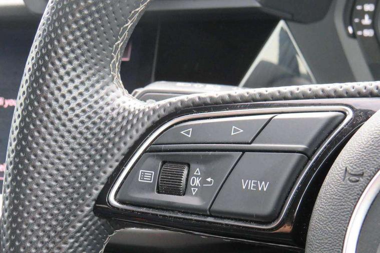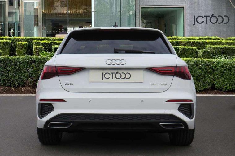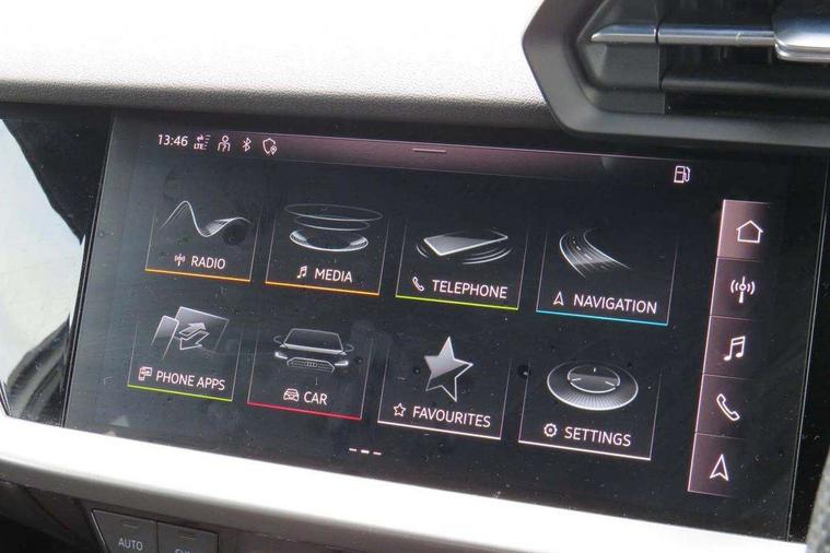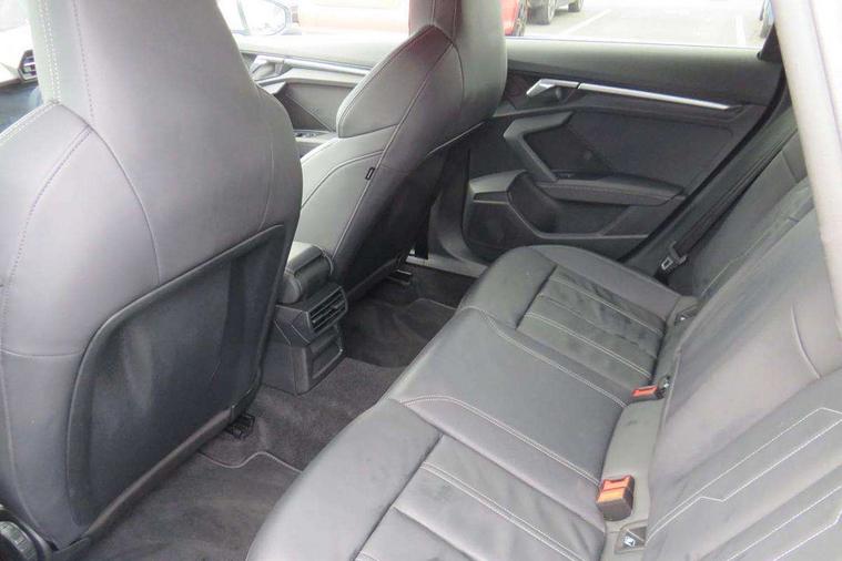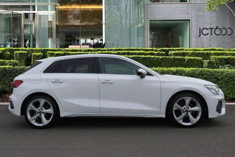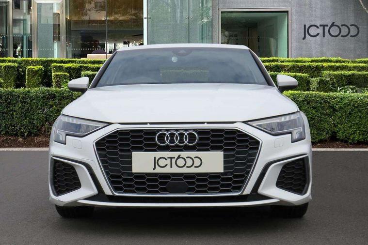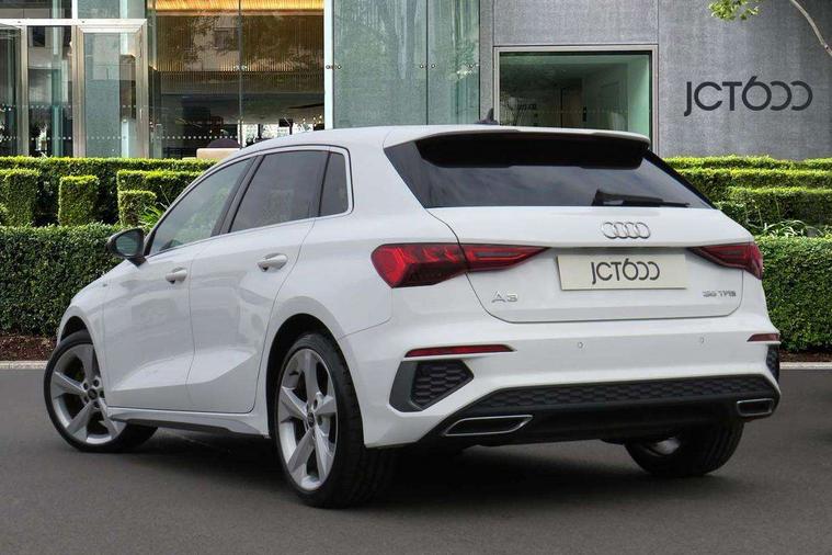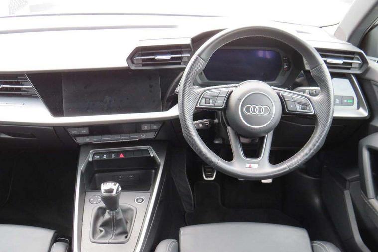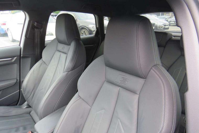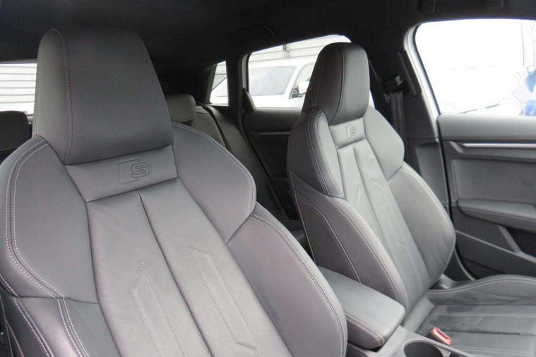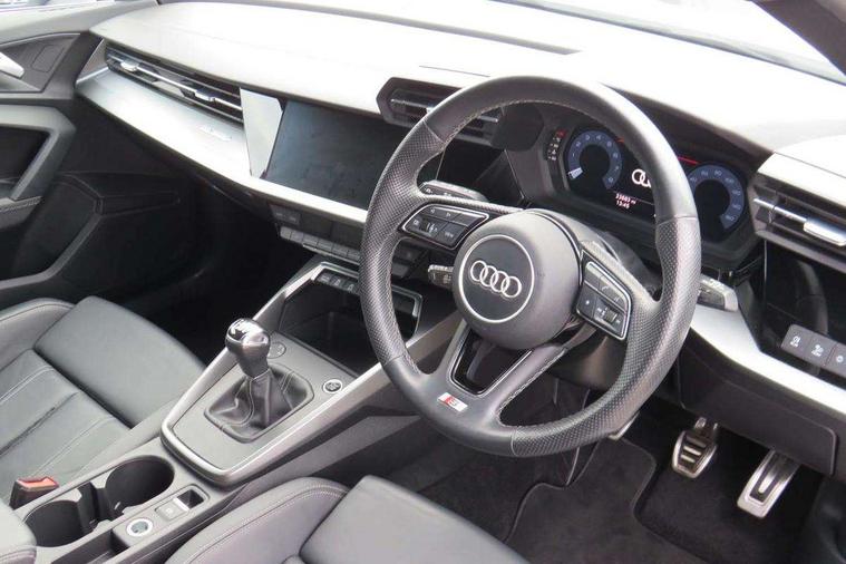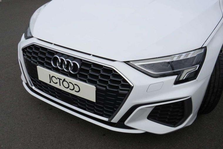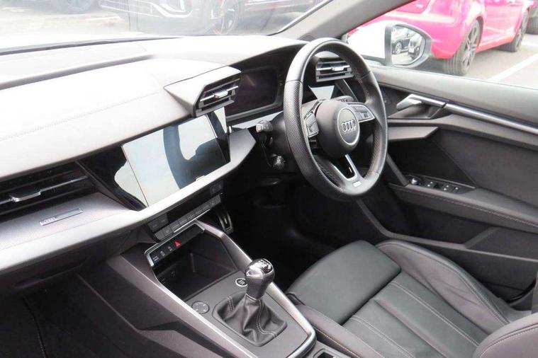 Audi drive select (Auto, Comfort, Dynamic, Efficiency and Individual), Audi smartphone interface, Audi Virtual Cockpit - 10.25" digital and colour instrument cluster, Automatic start/stop system with recuperation, Bluetooth interface, Collision avoidance assistant, Cruise control, e-Call (emergency call), Electromechanical power speed sensitive steering, Lane departure warning system, MMI Navigation Plus with high resolution 10.1" colour touch screen display, Rear parking sensors, Service indicator, Trip computer, Voice control system with natural language interaction, 2xUSB-C connection with data and charging functions, 6 passive loudspeakers, DAB Digital radio, 3rd brake light, Acoustic glass windscreen, Aluminium window trim, Auto dimming frameless rear view mirror, Electrically adjustable/heated/folding/auto dimming door mirrors with integrated LED indications + kerb view function for passenger side, Front electric windows, Illuminated aluminium inserts front door sills with S logo, LED daytime running lights, LED headlights with LED rear lights and dynamic rear indicators, Light and rain sensors, Privacy glass - dark tinted rear window, rear door and side windows, Rear electric windows, Rear side air outlets in grained matt black, Rear side wing doors, Rear wiper, S line bumpers, S roof spoiler, 12V socket and storage compartment in front centre console, 3 seat bench in 2nd row, 40/20/40 split folding rear seat bench with cupholder, Black cloth headlining, Dual zone electronic climate control, Front and rear centre armrest in leather, Front and rear headrests, Front/rear floor mats, Height and reach adjustable steering wheel, Illuminated vanity mirror, Interior lighting - glove compartment light and right hand side, Luggage compartment floor covering, Manual boot compartment lid, Manually adjustable front seats, Seat side bolsters, Single front passenger seat, Stainless steel pedals and front footrest in black, Twin leather upholstery with front sports seats S embossed logo, Aluminium interior elements pack - A3 Sportback, S line styling pack - A3 Sportback, 3x3 point rear seat belts, Audi pre sense front, Driver and front passenger airbag with passenger airbag deactivation, Electronic Stabilisation Control (ESC) including ABS, ASR and EDL, First aid kit with warning triangle and 2 safety vests, Front side airbags with head airbags and interaction airbag, Pre-sense front with pedestrian and cyclist detection, Seatbelt monitoring, Tyre pressure loss indicator, Anti theft alarm, Anti-theft wheel bolts, Immobiliser, Manual child locks, Remote control central locking, Accent surfaces in the dashboard and centre console in platinum grey silk effect paint finish, Dark spectrum aluminium inlays,