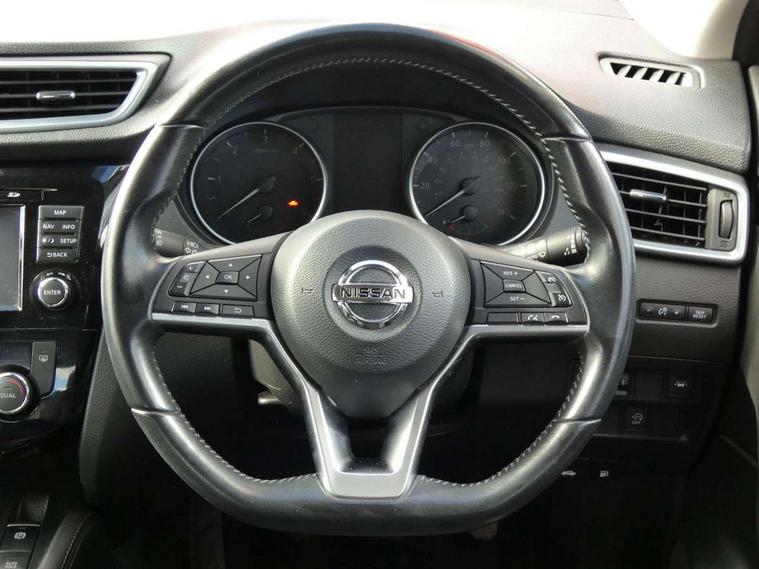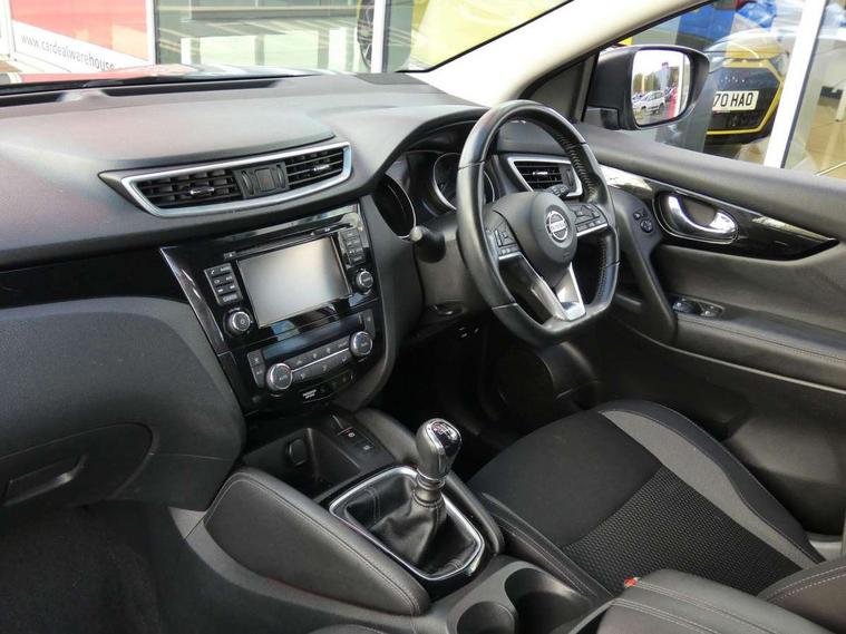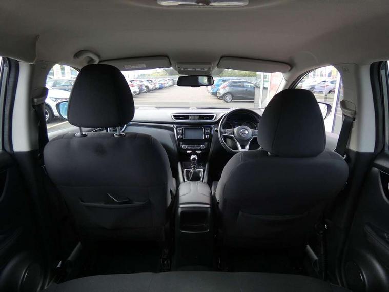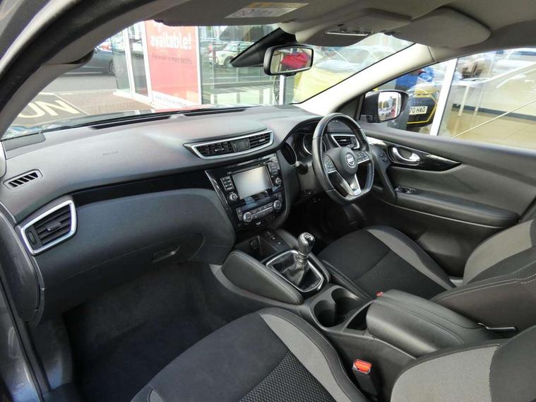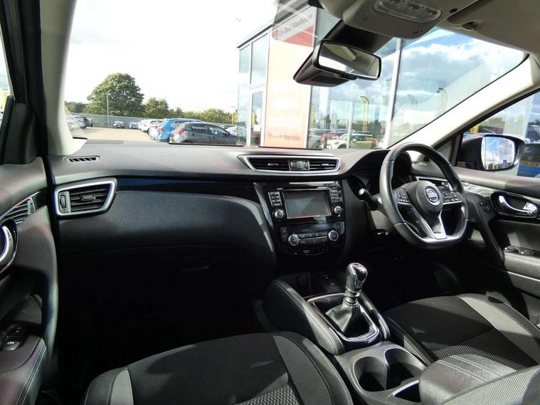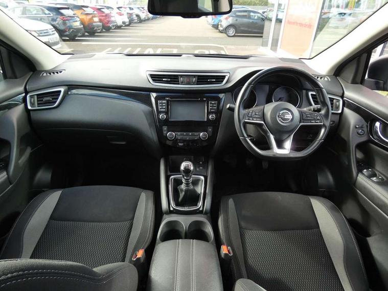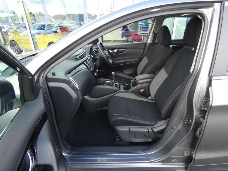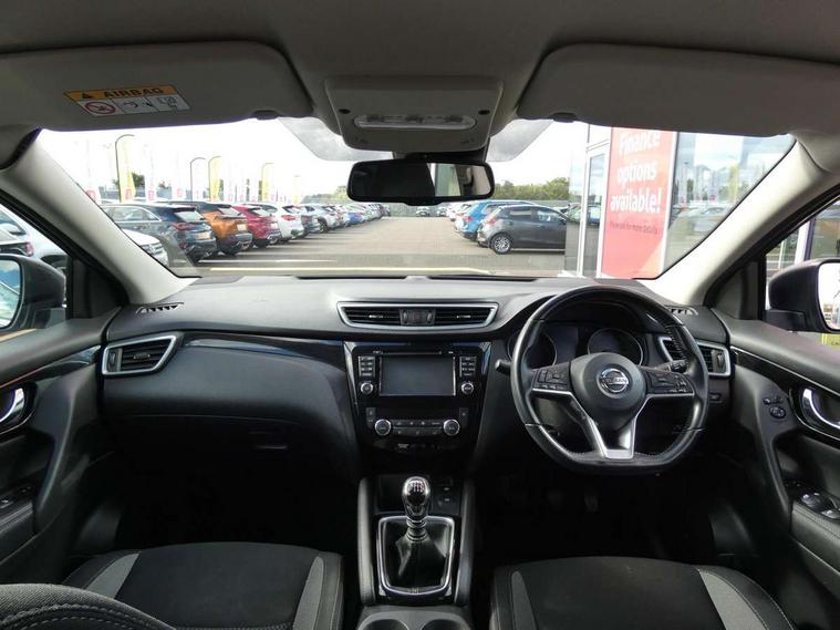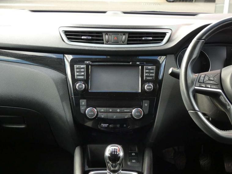 Advanced drive assist display 5'' TFT coloured screen, Android Auto, Apple CarPlay preparation, Bluetooth connectivity, Cruise control + speed limiter, Electric speed sensitive power steering, Front parking sensors, Lane departure warning system, Nissan connect evo 7" touchscreen navigation and entertainment system, Normal or sport selectable steering, Outside temperature sensor, Rear parking sensors, Rear view camera, Service interval indicator, Smartphone integration, Stop/start system, Tomtom connected services, Traffic sign recognition, Trip computer, Voice control system, Diesel particulate filter, Nissan chassis control (intelligent ride control, intelligent trace control, intelligent engine brake), 6 speakers, AM/FM radio, CD audio system, Aux-in socket, DAB Digital radio, Steering wheel mounted audio controls, USB port, Anti dazzle rear view mirror, Auto wipers, Body colour bumpers, Body coloured door handles, Body coloured door mirrors, Chrome window surround, Daytime running lights dip function when turn signal applied, Electric folding door mirrors, Electric front and rear windows with one touch illuminated window controls, Electric front/rear windows, Electrically adjustable door mirrors, Front fog lights, Halogen headlights, Heated door mirrors, High beam assist, Intelligent auto headlights, LED indicators in door mirrors, Rear roof spoiler, Rear wiper with reverse link, Shark fin antenna, Signature LED daytime running lights, Underbody vortex generators, 2 X front 12v power sockets, 3 height adjustable rear headrests, 60/40 split folding rear seat, Ambient lighting in centre console, Boot lighting, Centre console storage box/armrest, Chrome interior door handles, Cloth upholstery, Configurable luggage board system, Driver's seat manual height adjust, Dual zone climate control, Front and rear door pockets with bottle holders, Front and rear seat belt pre-tensioners with load limiters, Height adjustable front headrests, ISOFIX on outer rear seats, Leather D shaped steering wheel, Leather gear lever, Leather knee pad, Manual height adjustable front passenger seat, Manual lumbar support on driver seat, Manual lumbar support on passenger seat, Parcel shelf stow function under luggage board, Pollen filter, Rear armrest with 2 cupholders, Tilt/telescopic adjustable steering wheel, 6 airbags - Driver, front passenger, curtain and side airbags, ABS, ESP, EBD and brake assist, Auto hold function, Child locks on rear doors, Electronic parking brake, Front and rear seat belt warning, Front passenger airbag deactivation, Height adjustable front seatbelts, Hill start assist, Intelligent emergency braking with pedestrian recognition, Three 3 point rear seatbelts, Tyre pressure monitoring system, Anti-theft immobiliser, Remote central locking, Thatcham Cat.1 alarm, Piano black dash trim, 17" Alloy wheels, Tyre puncture repair kit,