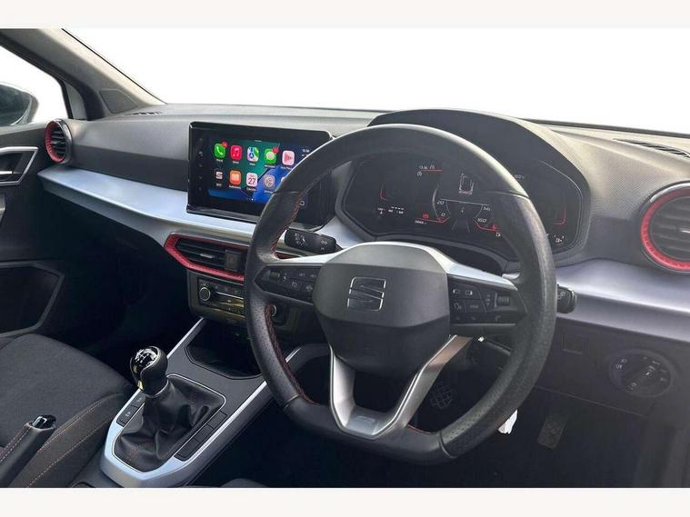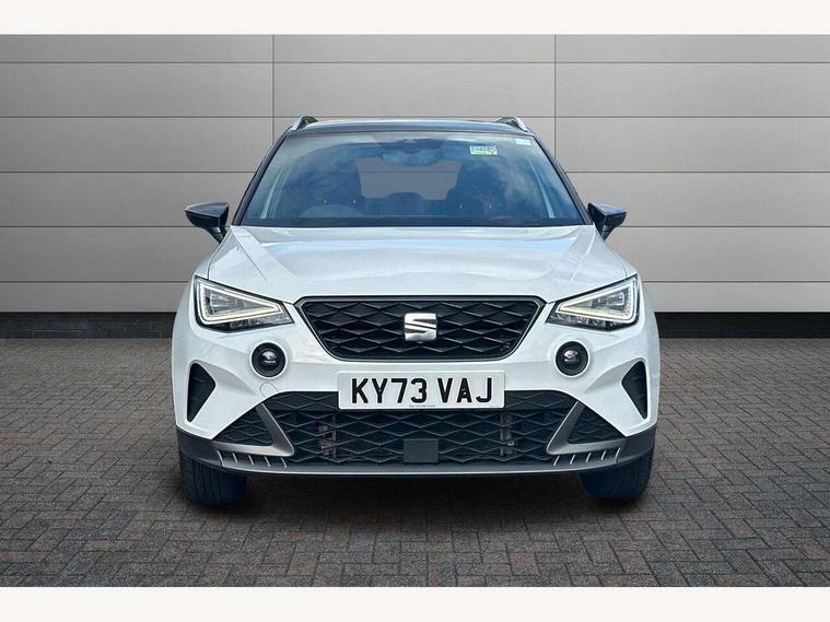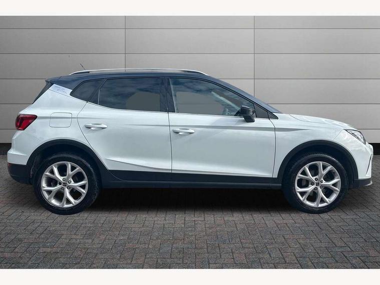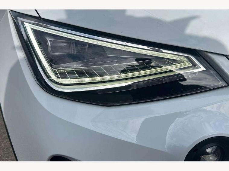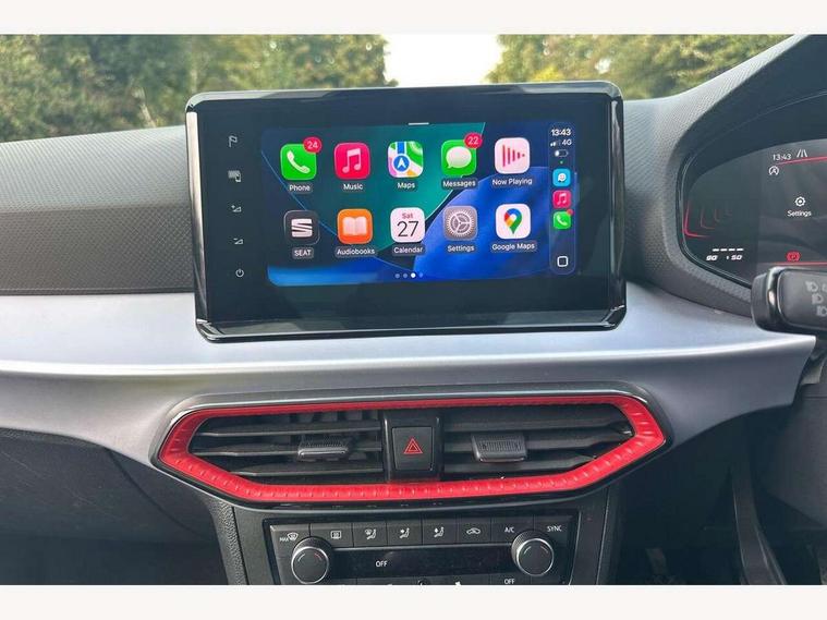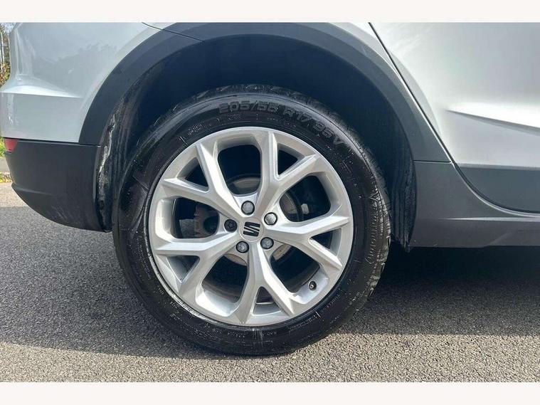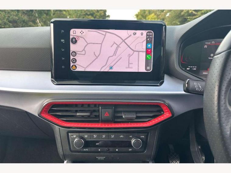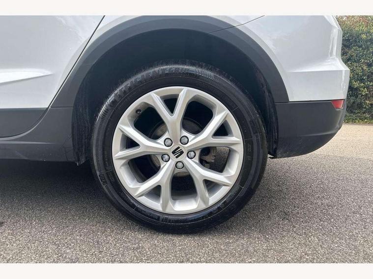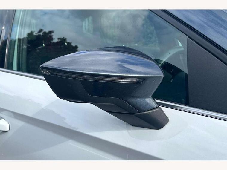 'Lights On' Reminder warning buzzer, 8" Digital cockpit, Digital clock, E-call, Electric speed sensitive power steering, Full Link Smartphone Integration with Mirror Link, Apple Car Play, Google Android Auto with USB Type C cable for Apple and Android compatibility, Lane keeping system, Low fuel warning light, Outside temperature display, Rear parking sensor, RPM counter, Seat connect with safety, service, remote and online, SEAT Drive profile - Four different models normal-sport-eco-individual, steering response, throttle response, Trip computer, Wireless phone charger, 9.2" colour touchscreen with navigation system, voice control and USB port (type c), Bluetooth interface for hands free and audio streaming, DAB digital radio and AM/FM radio, Steering wheel mounted audio controls, Anti theft roof antenna, Auto dimming interior rear view mirror, Automatic activation of hazard warning lights, Body coloured bumpers, Body coloured door handle inserts, Chrome roof rails and window surrounds, Dark tinted rear windows, Electric front/rear windows, Electrically adjustable, heated and folding door mirrors, Front fog lights with cornering function and rear fog light, FULL LED automatic headlights with dynamic headlight range control, coming and leaving home, LED daytime running lights, LED rear tail lights and licence plate lights, Protective side mouldings, Rain sensing wipers, Rear side wing doors, Rear spoiler, Rear window wash/wipe, Roof colour door mirrors, Third brake light, Twin exhaust pipe styling hidden exhaust pipe, Visible VIN plate, Windshield wiper with intermittent control and potentiometer, 2 cupholders, 3 seat bench in 2nd row, 60/40 split folding rear seat, Aircare filter, Black interior roof, Cloth upholstery, Double boot floor, Driver sunvisor with covered mirror + card holder, Dual zone climate control, Front courtesy light with front reading lights, Front sport seats, Gear shift indicator, Height adjustable front seats, Height/reach adjustable steering column, Illuminated boot, Instrument lighting with brightness control, Interior ambient lighting, Interior light in footwell, central console and door panel, ISOFIX points in outer rear seats with top tether anchorage points, Passenger sunvisor with vanity mirror, Perforated flat bottomed leather steering wheel/gear knob/handbrake with red stitching and FR logo, Single front passenger seat, Two front and three rear height adjustable headrests, Interior chrome pack - Arona, 3 point seatbelts on all rear seats, ABS, Active front headrests, Child locks on rear doors, Driver and front passenger airbags with front passenger airbag de activation, front side and curtain airbags, Electronic stability control, Emergency Brake Assist (EBA) and front assist, Front and rear seatbelt reminder, Hill hold control, Multi-Collision braking, Tiredness recognition system, Traction control, Tyre pressure monitoring system, Alarm with back-up horn, Electronic engine immobiliser, Locking wheel bolts, Remote central locking + deadlocks, Tow away protection, Titan black dashboard, 17" Dynamic alloy wheels,