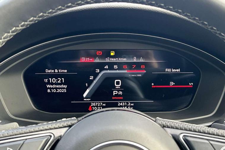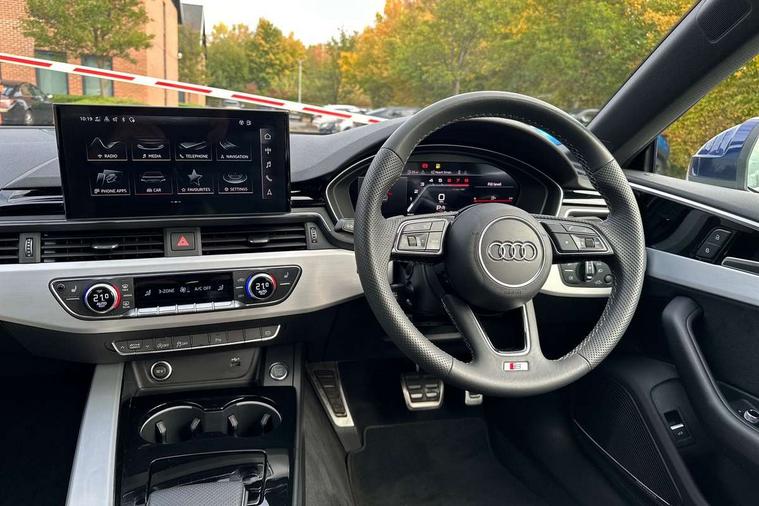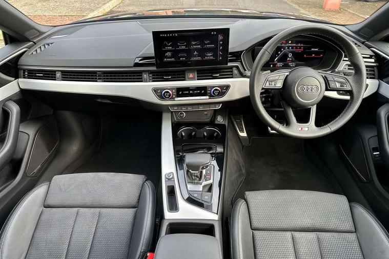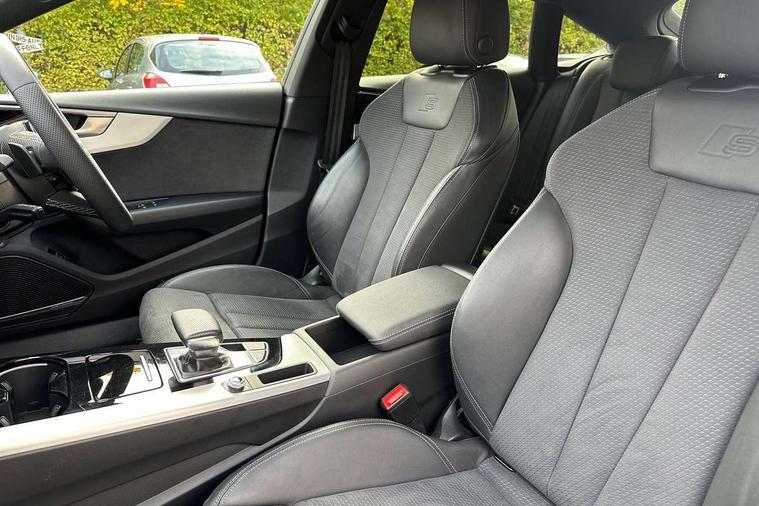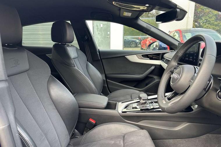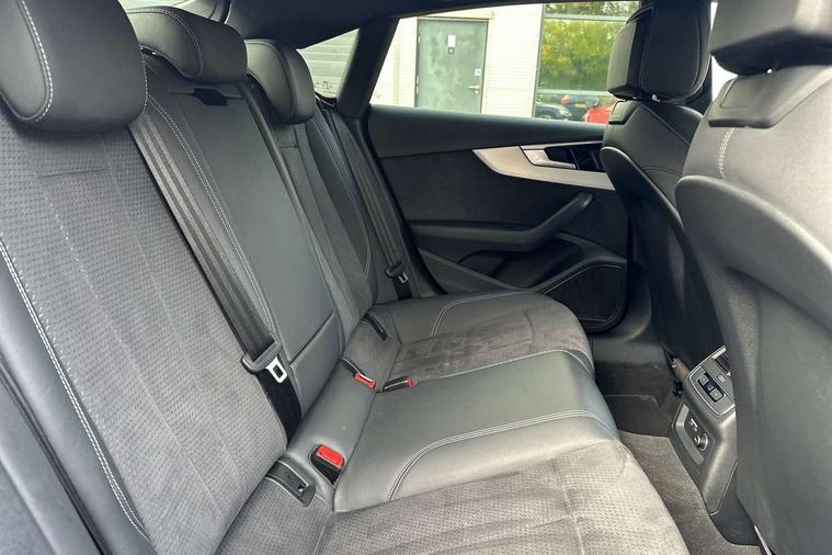 Audi connect safety and service (e-call), Audi drive select (Auto, Comfort, Dynamic and Individual), Audi parking system plus with front and rear sensors, Audi smartphone interface, Audi virtual cockpit - 12.3" full colour digital instrument cluster, vehicle/engine speed, Radio/media information+Driver assistance systems, Automatic start-stop system with coasting functionality and efficiency programme, Bluetooth interface, Camera based traffic sign recognition, Electro-mechanical power steering, Email, calendar and text messages displayed via MMI, Lane departure warning, MMI nav+ with MMI touch - 10.1" high resolution MMI display, touch sensitive, 3D map, route/country info, dynamic route guide, personal route assist, Power operated tailgate, Rear view camera, Service interval indicator, Voice control system, 54 litre fuel tank, Sports suspension lowered by 23mm, 8 passive loudspeakers, CD player, DAB digital radio reception, Two additional USB ports for rear passenger in rear centre console, Two SDXC card slots, Auto dimming door mirrors, Auto dimming rear view mirror, Body colour bumpers, Body colour door handles, Body colour front spoiler lip, Body colour side sill trim, Body coloured door mirrors, Electric adjustable heated door mirrors, Electric folding door mirrors, Electric front windows, Front fog lights, Honeycomb structure radiator grille in grained matt black, Kerb-view function for passenger side, LED headlights and rear lights with LED daytime running lights, LED side indicator lights integrated into door mirrors, LED third brake light, Matt aluminium silver tailpipe trim, Privacy glass, Rain and light sensors, Rear side wing doors, Rear wiper, S line badges on front wings, S line front and rear bumpers with side skirts, S Line rear diffuser in matt anthracite black with trim strip in matt aluminium silver, Side air inlets in grained matt black with matt aluminium silver inlay, Variable front intermittent wipers, Windscreen with acoustic glazing, 3 seat bench in 2nd row, 3 spoke high multifunction leather sport steering wheel with paddle shfit and S badging perforated leather grips, 4 way electric lumbar support for driver and front passenger, 40/20/40 split folding 3 seater rear bench seat, Adjustable steering column, Black cloth headlining, Black perforated leather gearknob, Contrast stitching on seats, steering wheel and gear lever gaiter, Deluxe 3 zone electronic climate control, Front centre armrest, Front head restraints, Front/rear floor mats, Heated front seats, Illuminated door sill trim with S logo, ISOFIX child seat mounting and top tether, Luggage compartment mat, Manual seat adjustment, Rear centre armrest, Rear headrests, Single front passenger seat, Stainless steel pedals, Sunvisors with vanity mirrors, Tool kit, LED interior light pack - A5/RS5, 3x3 point rear seatbelts, 6 airbags - Driver, front passenger, curtain and side airbags, Attention and drowsiness assist, Electromechanical parking brake, Electronic Stabilisation Control (ESC) including ABS, ASR and EDL, Front passenger airbag deactivation, Height adjustable front seatbelts, Hill hold assist, Manual child lock in rear doors, Multi collision brake assist, Pop-up bonnet for pedestrian protection, Pre sense city, Seatbelt monitoring, Tyre pressure warning, Variable restraint system, Warning triangle and first aid kit, Anti theft alarm system, Anti theft wheel bolts, Immobiliser, Keyless Go, Remote central locking, Matt brushed aluminium inlays, Tyre repair kit,