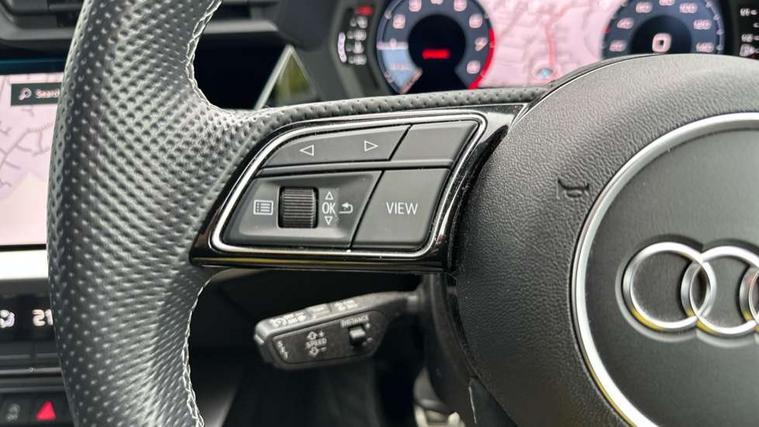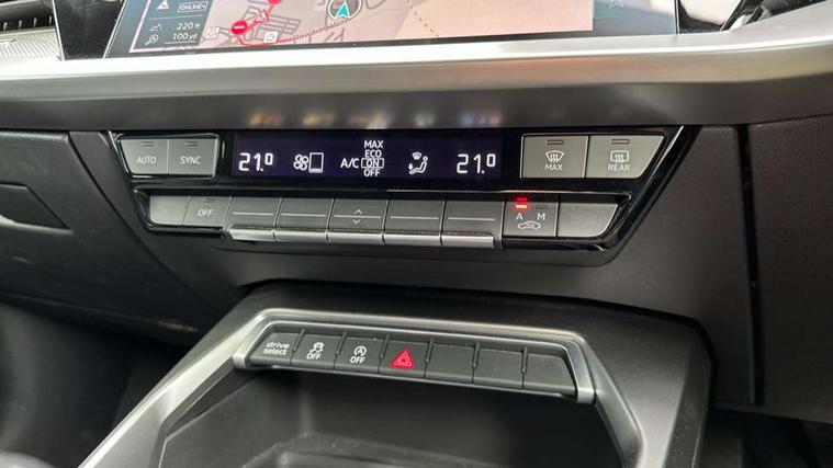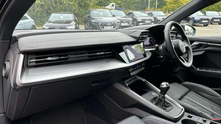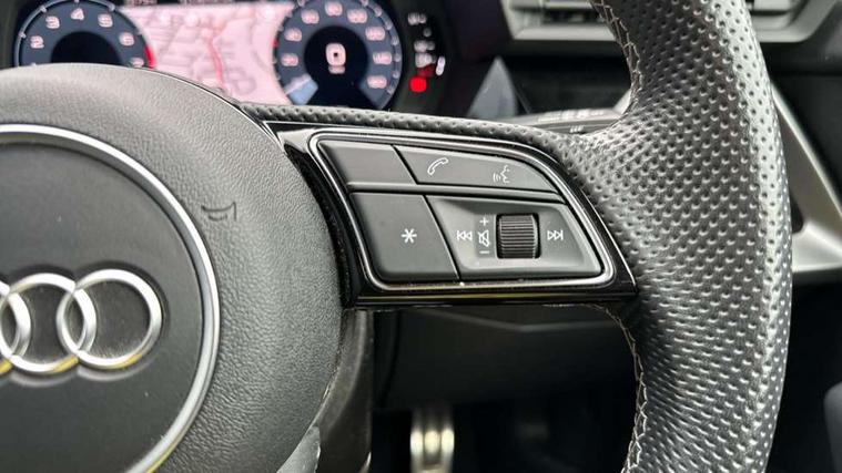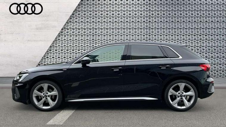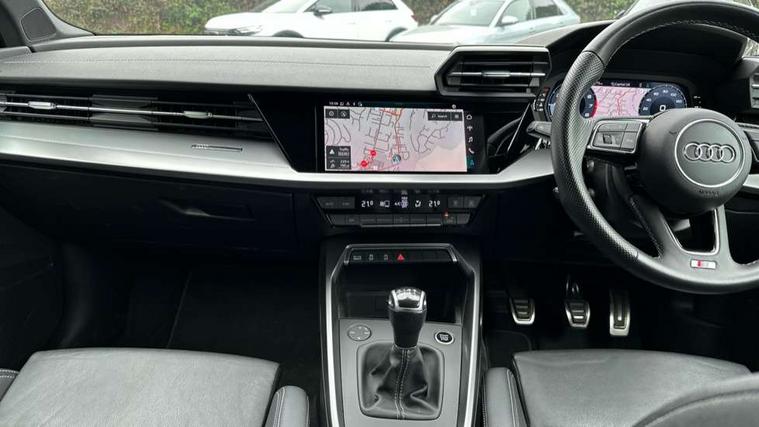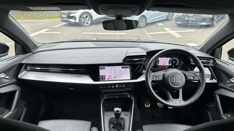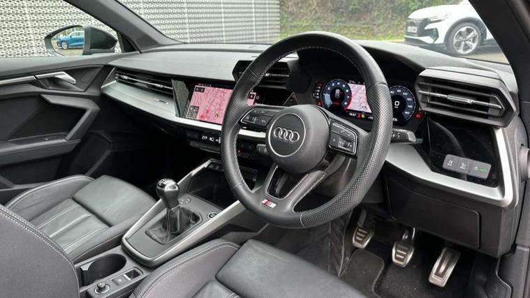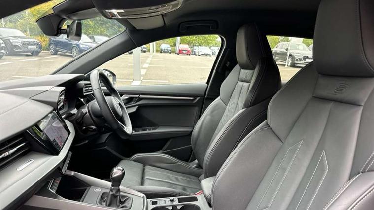Audi drive select (Auto, Comfort, Dynamic and Individual), Audi smartphone interface, Audi Virtual Cockpit - 10.25" digital and colour instrument cluster, Automatic start/stop system with recuperation, Bluetooth interface, Collision avoidance assistant, Cruise control, e-Call (emergency call), Electromechanical power speed sensitive steering, Lane departure warning system, MMI Navigation Plus with high resolution 10.1" colour touch screen display, Rear parking sensors, Service indicator, Trip computer, Voice control system with natural language interaction, 2xUSB-C connection with data and charging functions, 6 passive loudspeakers, DAB Digital radio, 3rd brake light, Acoustic glass windscreen, Aluminium window trim, Auto dimming frameless rear view mirror, Electrically adjustable/heated/folding/dimming door mirrors with kerb view includes integrated LED indications + kerb view function for passenger side, Front electric windows, Illuminated aluminium inserts front door sills with S logo, LED daytime running lights, LED headlights with LED rear lights and dynamic rear indicators, Light and rain sensors, Privacy glass - dark tinted rear window, rear door and side windows, Rear electric windows, Rear side air outlets in grained matt black, Rear side wing doors, Rear wiper, S line bumpers, S roof spoiler, 12V socket and storage compartment in front centre console, 3 seat bench in 2nd row, 40/20/40 split folding rear seat bench with cupholder, Black cloth headlining, Dual zone electronic climate control, Front and rear centre armrest in leather, Front and rear headrests, Front/rear floor mats, Height and reach adjustable steering wheel, Illuminated vanity mirror, Interior lighting - glove compartment light and right hand side, Luggage compartment floor covering, Manual boot compartment lid, Manually adjustable front seats, Seat side bolsters, Single front passenger seat, Stainless steel pedals and front footrest in black, Twin leather upholstery with front sports seats S embossed logo, Aluminium interior elements pack - A3 Sportback, LED interior lighting pack - A3 Sportback, S line styling pack - A3 Sportback, 3x3 point rear seat belts, Audi pre sense front, Driver and front passenger airbag with passenger airbag deactivation, Electronic Stabilisation Control (ESC) including ABS, ASR and EDL, First aid kit with warning triangle and 2 safety vests, Front side airbags with head airbags and interaction airbag, Pre-sense front with pedestrian and cyclist detection, Seatbelt monitoring, Tyre pressure loss indicator, Anti theft alarm, Anti-theft wheel bolts, Electronically operated child lock, Immobiliser, Remote control central locking, Accent surfaces in the dashboard and centre console in platinum grey silk effect paint finish, Dark spectrum aluminium inlays,