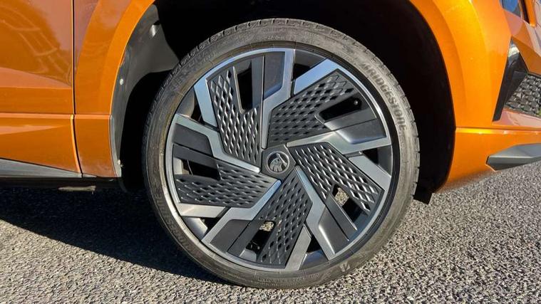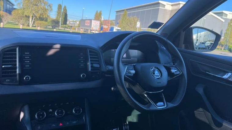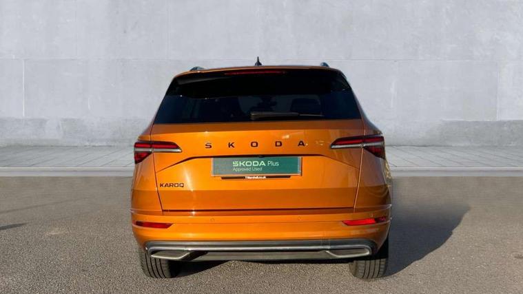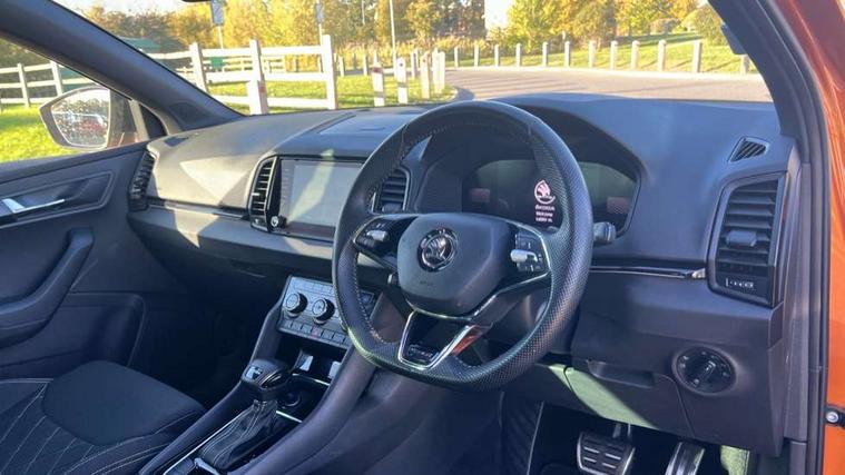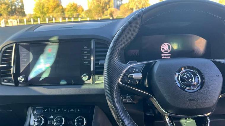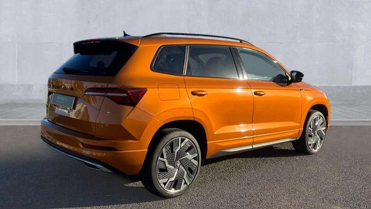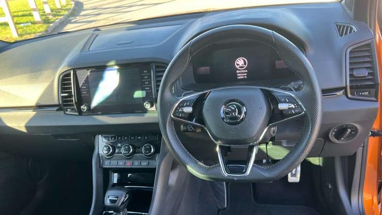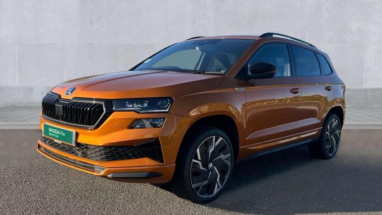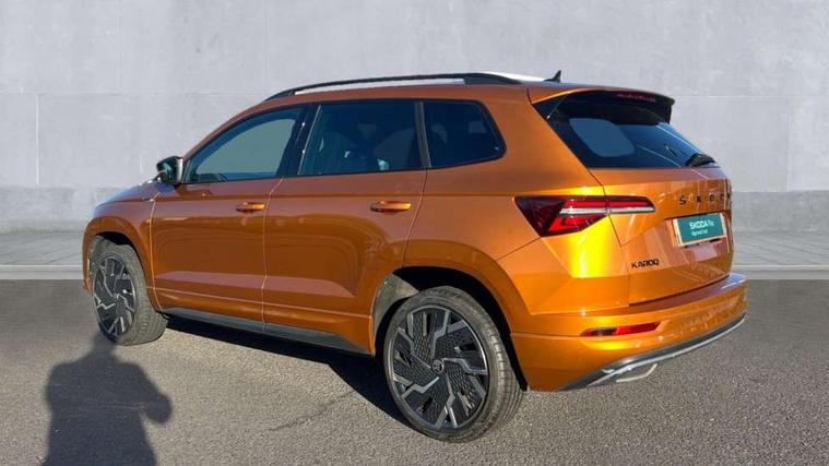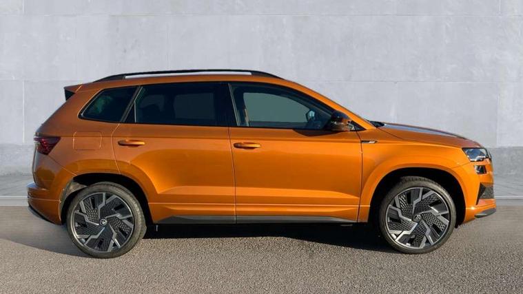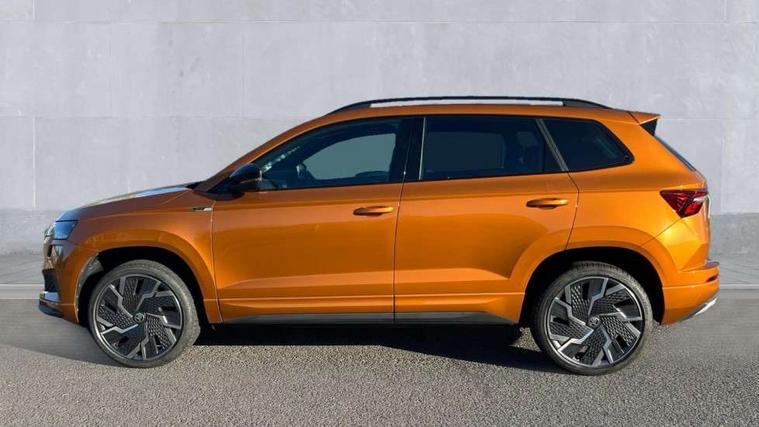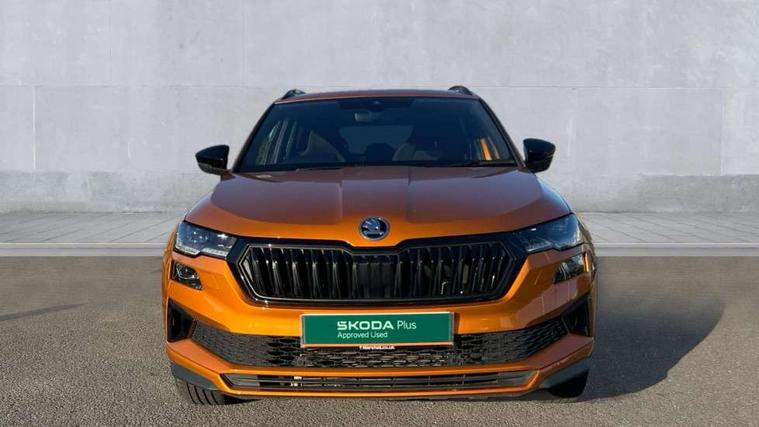 8" Digital display, Care connect, Driver fatigue sensor, Emergency services call system, Outside temperature gauge, Service interval indicator, SmartLink wireless for Apple and wired for Android, Start/stop system with regenerative braking, USB C Port x 2 in front centre console, Virtual cockpit, Virtual pedal with electrically operated boot door, 8 Speakers, DAB radio with Bluetooth, USB connection, Acoustic glass, Aero front windscreen wipers with intermittent function, Auto dimming rear view mirror with light and rain sensors, Black door mirrors, Black electric window control buttons, Black radiator grille, Black roof rails, Body colour door handles, Dynamic headlight range control with cornering light function, Electric front and rear windows with child proof lock, Front door steps with SportLine logo, Heated rear windscreen, LED daytime running lights, LED rear lights with high functionality welcome effect and dynamic indicators, Light assistant (coming/leaving home/tunnel light), Panoramic sliding sunroof, Plastic scuff plates, Privacy glass, Protective door side sills in body colour, Rear diffuser, Rear side wing doors, Rear spoiler, Rear window wiper with washer system and intermittent control, Safety reflectors on front doors, Skoda lettering on tailgate in black, Sportline badge on front fender, Sportline decorative inserts with badging, Sports front and rear bumpers, 1.5 litre bottle holders in driver and front passenger door panels, 12V socket in boot, 12v socket in front centre armrest with storage compartment and rear air vents, 2 Folding hooks and nets in boot, 3 rear height adjustable headrests, 3 seat bench in 2nd row, 3 spoke leather sports multifunction steering wheel and silver stitching with gear shift paddles, 4 foldable roof handles with rear coat hooks, Black floor carpet, Black roof headlining, Chrome inner door handles, Double sided boot floor, Foldable hooks in the boot, Front head restraints, Height adjustable front three point seats belts with tensioners, Height/reach adjust steering wheel, Ice scraper, Illuminated glovebox, Illuminated luggage compartment, Isofix child seat preparation outer rear, Manual lumbar support for front seats, Pen holder, Pollen filter, Rear boot cover, Rear reading lights, Rear seats fixed folding and divided 60:40, Rubbish bin door, Safety vest holder, Single front passenger seat, Storage box in upper central dashboard closed, Sunvisors with illuminated vanity mirrors, Textile floor mats, Ticket holder, Titan black interior ceiling, Welcome animation with sportline logo, Light Pack - Karoq, Parking pack - Karoq, Automatic door unlocking in case of crash, Automatic fuel cut off in case of crash, Child locks on rear doors, Driver airbag, Electronic parking brake with auto hold function, Emergency rear braking signal, ESC including ABS, MSR, ASR, EDS, HBA, DSR, RBS, MKB and traction control, Front side airbags, Hill hold control, Knee airbags, Passenger airbag with switch-off function, Pedestrian monitor, Seatbelt reminder signalisation and pretensioner for all seats, Three point seatbelts rear, Two tone horn, Tyre pressure display, Tyre pressure monitor, Alarm with interior monitoring, back up horn and tilt sensor with safe function, Electronic engine immobiliser, Keyless entry and start/stop, Remote central locking with 2 remote folding keys, Black air vent surround, Black centre console, Satin black dashboard, Satin black door trim, 19" Vega black polished alloy wheels, Anti-theft wheel bolts protection, Matt black aero hub caps, Storage on wheel cover, Tool kit,