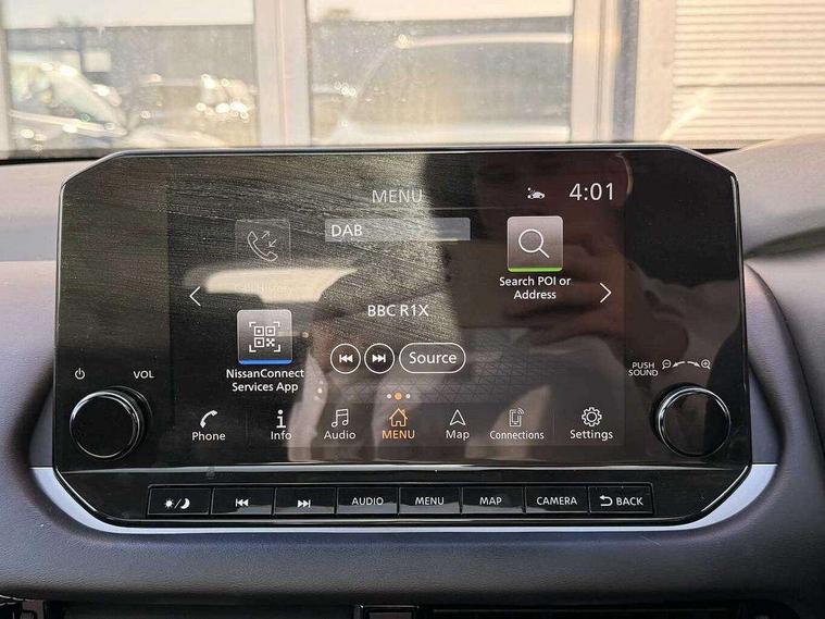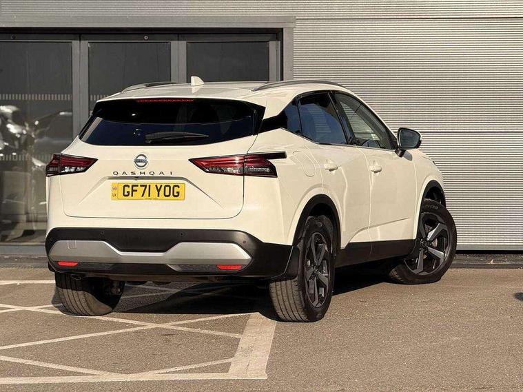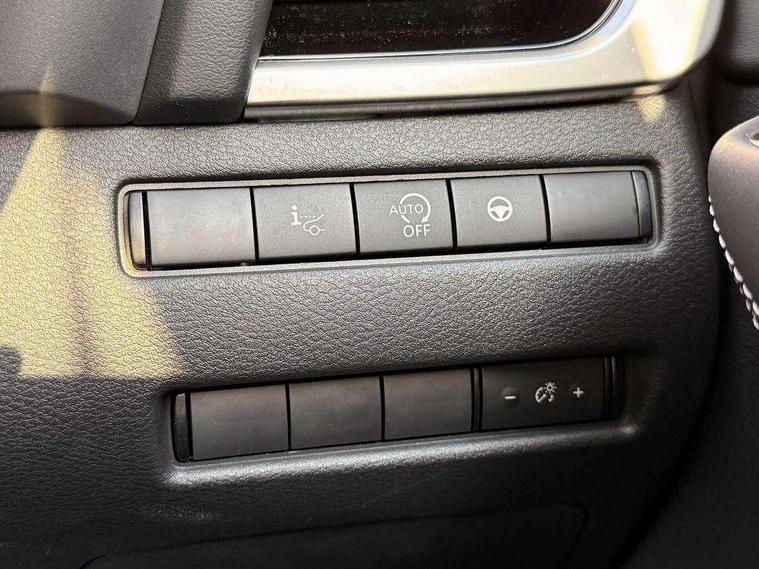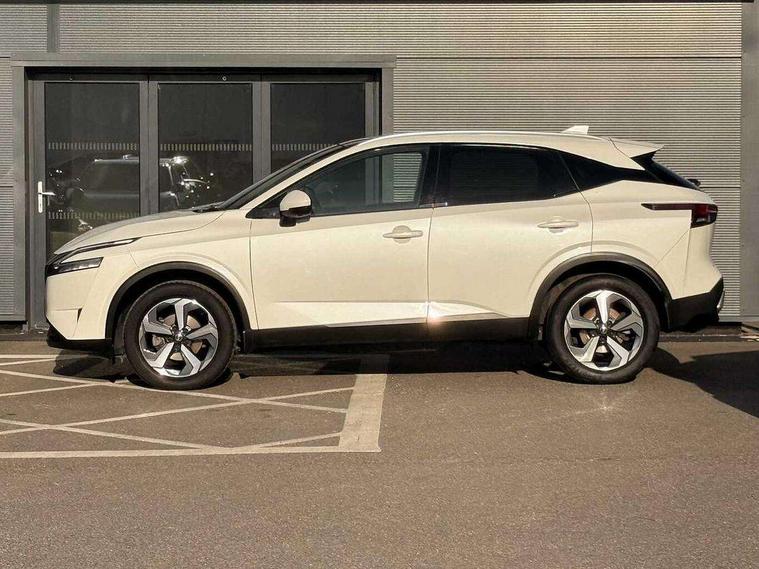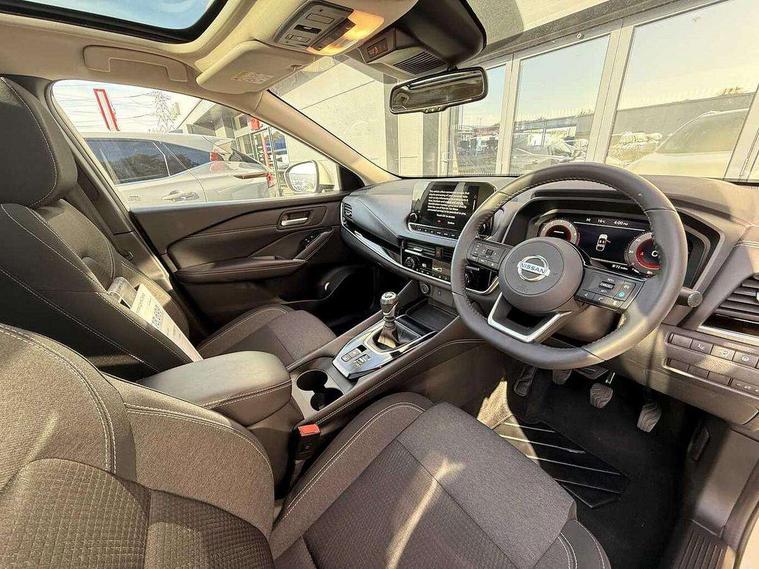 Blind spot warning, Drive modes (sport, normal, eco), Electric speed sensitive power steering, Emergency and breakdown call, Front and rear parking sensors, Full Digital 12.3" TFT Digital Combimeter, Idle stop/start system, Intelligent Cruise control (ICC), Intelligent driver alert system, Intelligent forward collision warning, Intelligent lane intervention, Lane departure prevention, Lane departure warning system, Moving object detection, Push button starter, Rear cross traffic alert, Traffic sign recognition with legal speed adjustment, Trip computer, 6 speakers, AM/FM audio system with DAB, Bluetooth audio streaming, Front USB connections (Type-A and Type-C), Rear USB charging only ports (Type-A and Type-C), 3rd brake light, Auto dimming rear view mirror, Auto rear wiper when reversing, Body colour mirror caps, Body coloured door handles, Bodyside mouldings, Chrome side window finisher, Electric auto folding door mirrors, Electrically adjustable and heated door mirrors with LED turn indicator, Fixed panoramic glass roof with electric sunshade, Follow me home headlights, High beam assist, Intelligent auto headlights, LED daytime running lights, LED rear lights, One touch front and rear electric windows with remote opening and closing, Partially body coloured bumpers, Privacy glass, Rain sensor, Rear roof spoiler, Rear side wing doors, Rear styling plate, Roof rails, Shark fin antenna, Splash free rain sensing wipers, Super UV and infrared cut glass, Three blink turn signal, 12v power socket in dashboard and luggage, 2 way electrical driver lumbar adjustment, 2x Rear coat hooks, 3 bench rear seats in 2nd row, 3 rear headrests, 4 grab handles, 6 Luggage hooks - 4 on floor, 2 on side, 60/40 split folding rear seat bench, Ambient lighting around centre console, Centre console storage tray, Chrome interior door handles, Cloth monoform upholstery, Driver and front passenger sunvisors with illuminated vanity mirrors, Driver seat back pocket, Dual zone automatic climate control with pollen filter, Front centre console and armrest, Front cupholder, Front door with bottle holders, Glovebox with light, Hard trunk cover, Height adjustable driver's seat, Height adjustable front headrests, Leather shift knob, Leather steering wheel, Luggage board system, Luggage space lighting, Manually adjustable passenger (slide recline + lifter), Multifunction steering wheel, Passenger seat back pocket, Rear armrest with 2 cupholders, Rear door bottle holders, Single front passenger seat, Soft PVC kneepad, Steering wheel switches, Tilt/telescopic adjustable steering wheel, Two rear isofix child seat anchorage points with top tether, Welcome light and console tray ambient lighting, Connectivity Pack - Qashqai, Tech Pack (Drive Assist + HUD), 3x3 point rear seatbelt pretensioners + load limiters, ABS, ESP, EBD and brake assist, Active brake limited slip, Auto hold function, Child locks on rear doors, Curtain and front side, far side airbags, Driver and passenger airbags, Driver, passenger and 2nd row rear seat belt reminder, Electronic parking brake, Front seatbelt pretensioners + load limiters, Height adjustable front seatbelts, Hill start assist, Intelligent blind spot intervention, Intelligent front emergency braking with pedestrian, cyclist recognition and junction assist, Intelligent rear automatic braking, Tyre pressure monitoring system, Vehicle dynamic control, Capless fuel filler, Engine immobiliser, Nissan i-key, Remote central door locking with deadlocking, Thatcham Cat.1 alarm, 18" Diamond cut alloy wheels,
