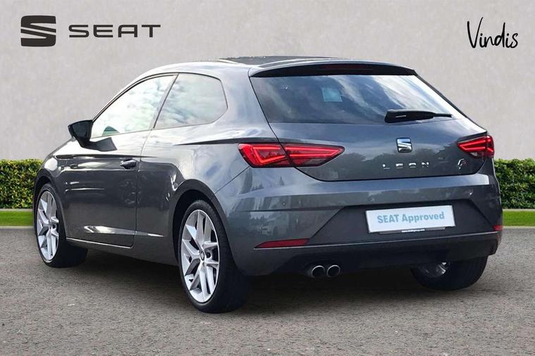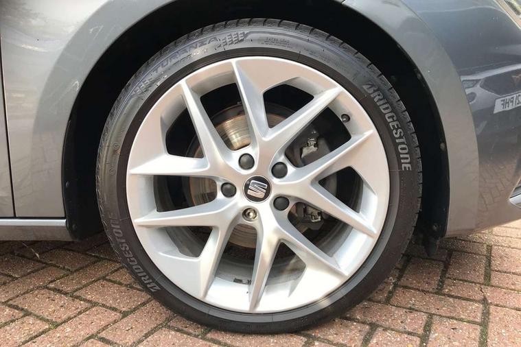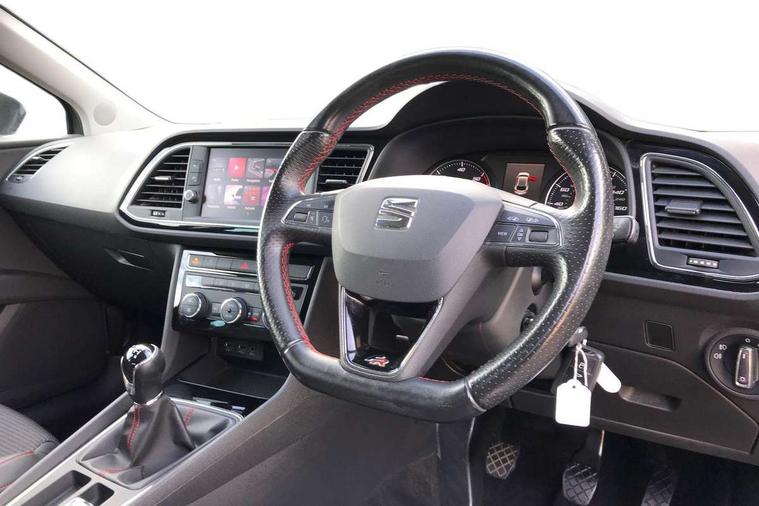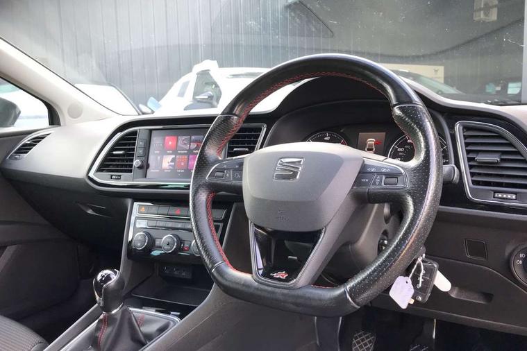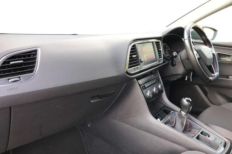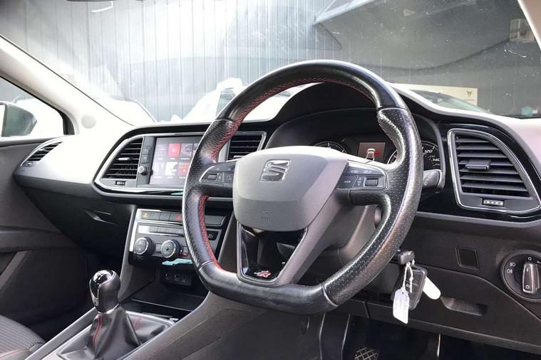 'Lights On' Reminder warning buzzer, 8" touch screen, Bluetooth Handsfree Phone Connection, Low fuel warning light, Outside temperature gauge, Rear parking sensors, Remote fuel flap release, SEAT Drive profile, SEAT logo boot release, Service interval indicator, Trip computer, Voice control system, XDS electronic differential lock, 2 USB ports, 2 USB sockets in rear, 2x SD card slot, Auxiliary input socket, Bluetooth audio streaming, DAB Digital radio, Radio/CD + MP3, Steering wheel mounted audio/phone controls, Aluminium front door sills, Black grille with chrome surround, Body colour door handles, Body coloured bumpers, Body coloured door mirrors, Dark tinted rear windows, Electric adjustable/heated/folding door mirrors, Electric front windows + one touch + anti-pinch, Electric headlamp adjustment, High gloss black finish B and C pillars, LED daytime running lights, LED front fog lights, LED Headlights, LED indicators in door mirrors, LED number plate light, LED tail lights, Rear wash/wipe, Reverse activated kerb-view adjustment on passenger's door mirror, Twin exhaust pipes, 12v power point in centre console, 3 height adjustable rear headrests, 60/40 split folding rear seat, Active head restraints, Additional heating and ventilation outlet in rear of centre console, Boot net, Cloth upholstery, Driver seat height adjust, Driver seat lumbar adjustment, Driver/passenger sunvisors with illuminated vanity mirrors, Dual zone climate control, Dust/pollen filter, Front adjustable head restraints, Front armrest with storage box, Front cupholders x 2, Front seat and rear pockets, Front seats - 'Easy Entry', Front sports seats, Front/rear floor mats, Height/reach adjust steering wheel, Illuminated boot, Illuminated glovebox, Instrument lighting with brightness control, Leather handbrake, Luggage tie-down hooks, Passenger seat height adjuster, Passenger seat lumbar adjust, Perforated leather steering wheel with red stitching + gear knob, Rear top tether child seat ISOFIX attachment, Storage box under drivers seat, 3 point seatbelts on all rear seats, ABS + traction control, Active pedestrian safety system, Collision mitigation braking system, Curtain airbags, Driver/Front Passenger airbags, Drivers knee airbag, Electronic parking brake with auto hold, ESP+EBA, Front seatbelt pretensioners, Front Seatbelt warning, Front side airbags, Hill hold control, Passenger airbag deactivation system, Tyre pressure monitoring system, 2 folding remote keys with window open/close function, Engine immobiliser, Locking wheel bolts, Remote central locking + deadlocks, Volumetric alarm with back up horn, Chrome interior trim,