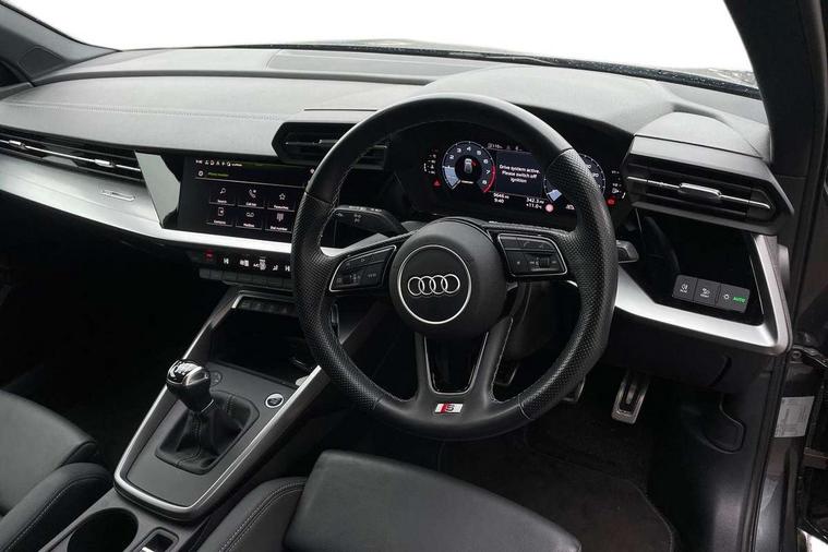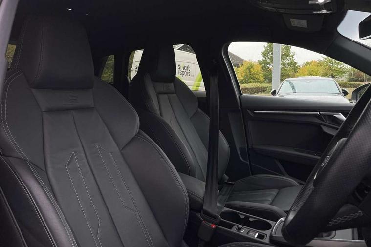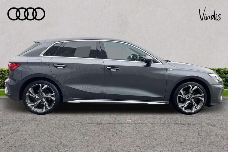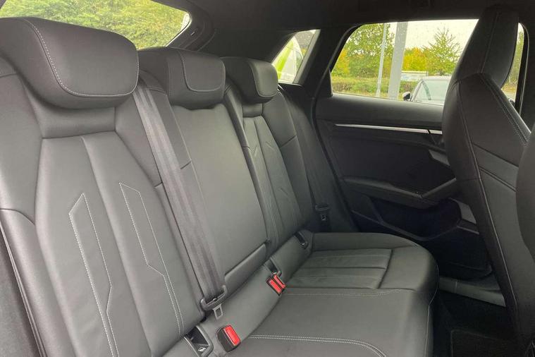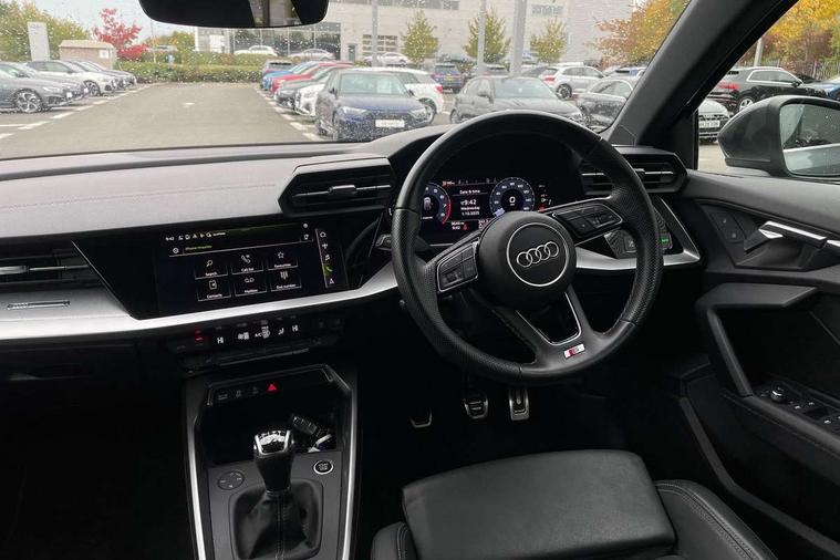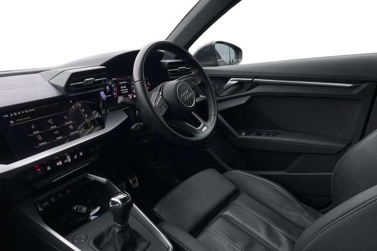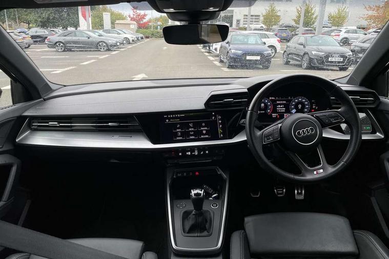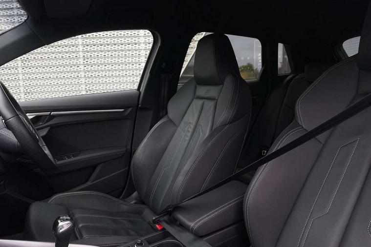 Audi drive select (Auto, Comfort, Dynamic and Individual), Audi smartphone interface, Audi Virtual Cockpit - 10.25" digital and colour instrument cluster, Automatic start/stop system with recuperation, Bluetooth interface, Camera based traffic sign recognition, Collision avoidance assistant, Cruise control, e-Call (emergency call), Electromechanical power speed sensitive steering, Lane departure warning system, MMI Navigation Plus with high resolution 10.1" colour touch screen display, Rear parking sensors, Service indicator, Trip computer, Voice control system with natural language interaction, Sports suspension, 2xUSB-C connection with data and charging functions, 6 passive loudspeakers, DAB Digital radio, 3rd brake light, Acoustic glass windscreen, Aluminium window trim, Auto dimming frameless rear view mirror, Body colour exterior mirrors, Electrically adjustable/heated/folding/auto dimming door mirrors with integrated LED indications + kerb view function for passenger side, Front electric windows, Illuminated door sills with aluminium inserts at the front with S logo, LED daytime running lights, LED headlights with LED rear lights and dynamic rear indicators, Light and rain sensors, Privacy glass - dark tinted rear window, rear door and side windows, Rear electric windows, Rear side air outlets in grained matt black, Rear side wing doors, Rear wiper, S line bumpers, S roof spoiler, 12V socket and storage compartment in front centre console, 3 seat bench in 2nd row, 3 spoke leather multifunction steering wheel, 4 way electrically adjustable lumbar support for driver and front passenger, 60/40 split folding rear seat bench, Black cloth headlining, Dual zone electronic climate control, Front and rear centre armrest in artificial leather, Front and rear headrests, Front/rear floor mats, Height and reach adjustable steering wheel, Interior lighting - glove compartment light and right hand side, Luggage compartment floor covering, Manual boot compartment lid, Manually adjustable front seats, Seat side bolsters, Single front passenger seat, Stainless steel pedals and front footrest in black, Twin leather upholstery with front sports seats S embossed logo, Aluminium interior elements pack - A3 Sportback, LED interior lighting pack - A3 Sportback, S line styling pack - A3 Sportback, 3x3 point rear seat belts, Driver and front passenger airbag with passenger airbag deactivation, Electronic Stabilisation Control (ESC) including ABS, ASR and EDL, First aid kit with warning triangle and 2 safety vests, Front side airbags with head airbags and interaction airbag, Pre-sense front with pedestrian and cyclist detection, Seatbelt monitoring, Tyre pressure loss indicator, Anti theft alarm, Anti-theft wheel bolts, Electronically operated child locks, Immobiliser, Remote control central locking, Dark spectrum aluminium inlays, accent surfaces in the dashboard and centre console in platinum grey silk effect paint finish,