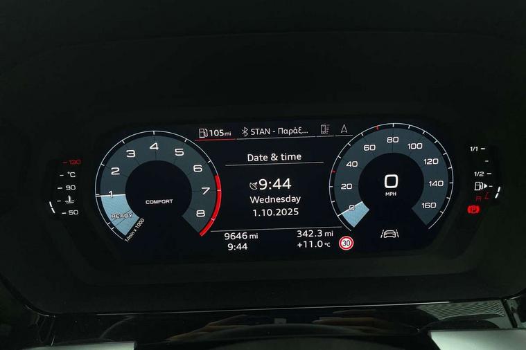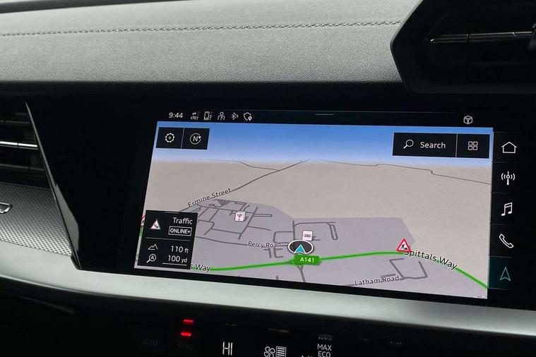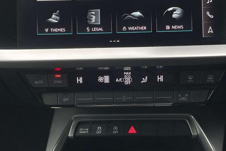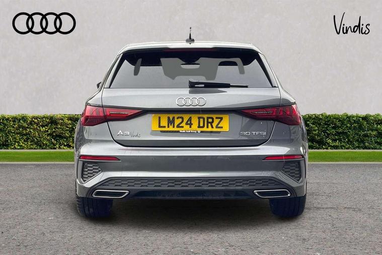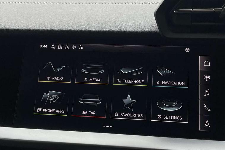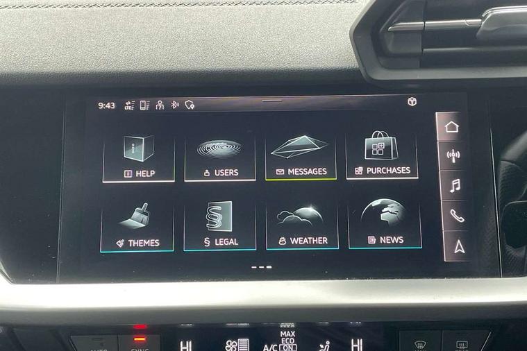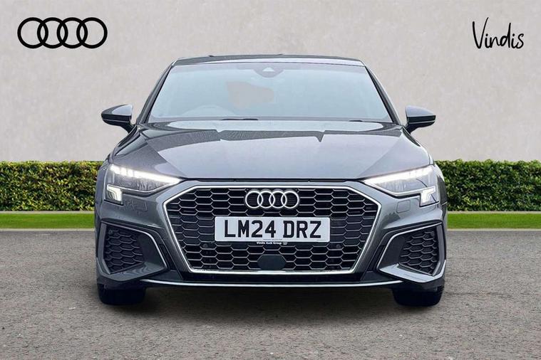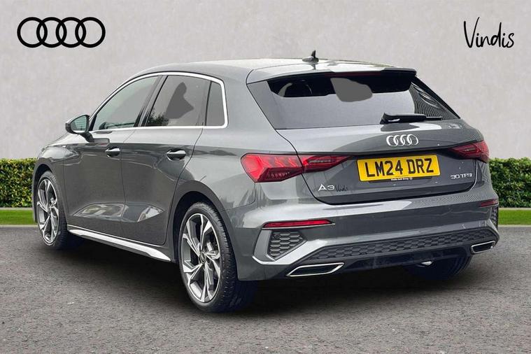 Audi drive select (Auto, Comfort, Dynamic and Individual), Audi smartphone interface, Audi Virtual Cockpit - 10.25" digital and colour instrument cluster, Automatic start/stop system with recuperation, Bluetooth interface, Camera based traffic sign recognition, Collision avoidance assistant, Cruise control, e-Call (emergency call), Electromechanical power speed sensitive steering, Lane departure warning system, MMI Navigation Plus with high resolution 10.1" colour touch screen display, Rear parking sensors, Service indicator, Trip computer, Voice control system with natural language interaction, Sports suspension, 2xUSB-C connection with data and charging functions, 6 passive loudspeakers, DAB Digital radio, 3rd brake light, Acoustic glass windscreen, Aluminium window trim, Auto dimming frameless rear view mirror, Body colour exterior mirrors, Electrically adjustable/heated/folding/auto dimming door mirrors with integrated LED indications + kerb view function for passenger side, Front electric windows, Illuminated door sills with aluminium inserts at the front with S logo, LED daytime running lights, LED headlights with LED rear lights and dynamic rear indicators, Light and rain sensors, Privacy glass - dark tinted rear window, rear door and side windows, Rear electric windows, Rear side air outlets in grained matt black, Rear side wing doors, Rear wiper, S line bumpers, S roof spoiler, 12V socket and storage compartment in front centre console, 3 seat bench in 2nd row, 3 spoke leather multifunction steering wheel, 4 way electrically adjustable lumbar support for driver and front passenger, 60/40 split folding rear seat bench, Black cloth headlining, Dual zone electronic climate control, Front and rear centre armrest in artificial leather, Front and rear headrests, Front/rear floor mats, Height and reach adjustable steering wheel, Interior lighting - glove compartment light and right hand side, Luggage compartment floor covering, Manual boot compartment lid, Manually adjustable front seats, Seat side bolsters, Single front passenger seat, Stainless steel pedals and front footrest in black, Twin leather upholstery with front sports seats S embossed logo, Aluminium interior elements pack - A3 Sportback, LED interior lighting pack - A3 Sportback, S line styling pack - A3 Sportback, 3x3 point rear seat belts, Driver and front passenger airbag with passenger airbag deactivation, Electronic Stabilisation Control (ESC) including ABS, ASR and EDL, First aid kit with warning triangle and 2 safety vests, Front side airbags with head airbags and interaction airbag, Pre-sense front with pedestrian and cyclist detection, Seatbelt monitoring, Tyre pressure loss indicator, Anti theft alarm, Anti-theft wheel bolts, Electronically operated child locks, Immobiliser, Remote control central locking, Dark spectrum aluminium inlays, accent surfaces in the dashboard and centre console in platinum grey silk effect paint finish,
