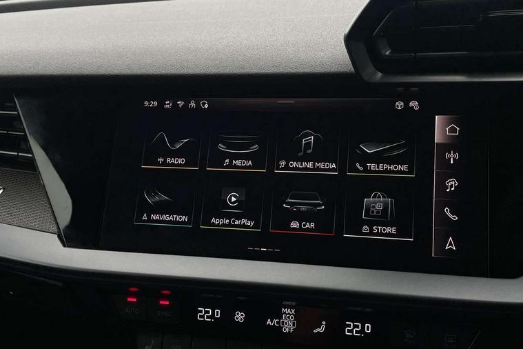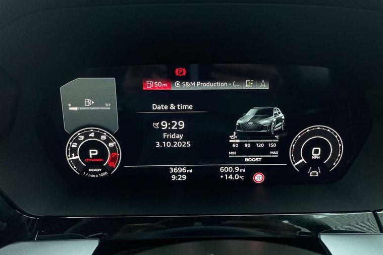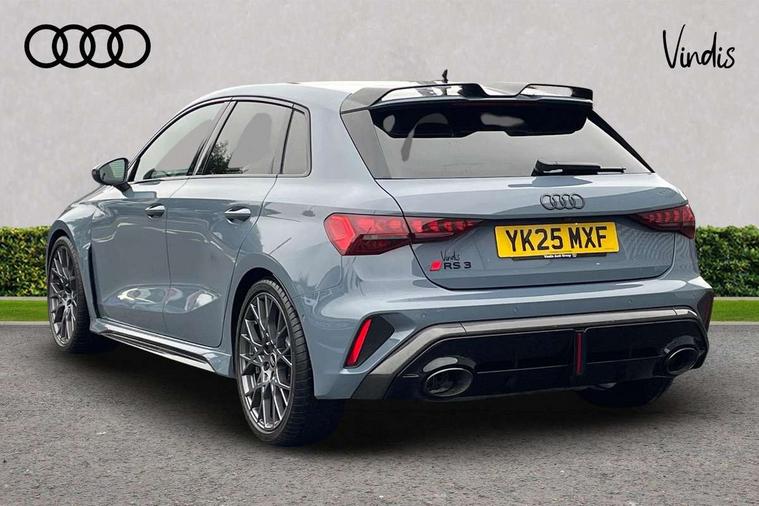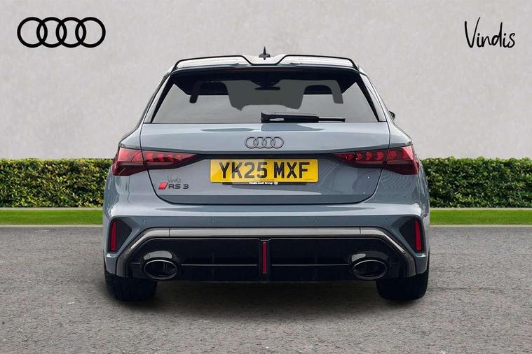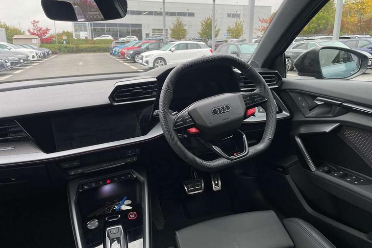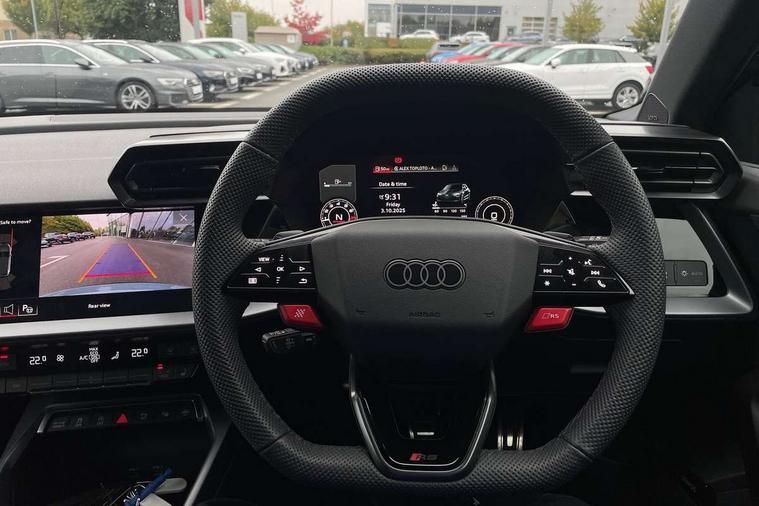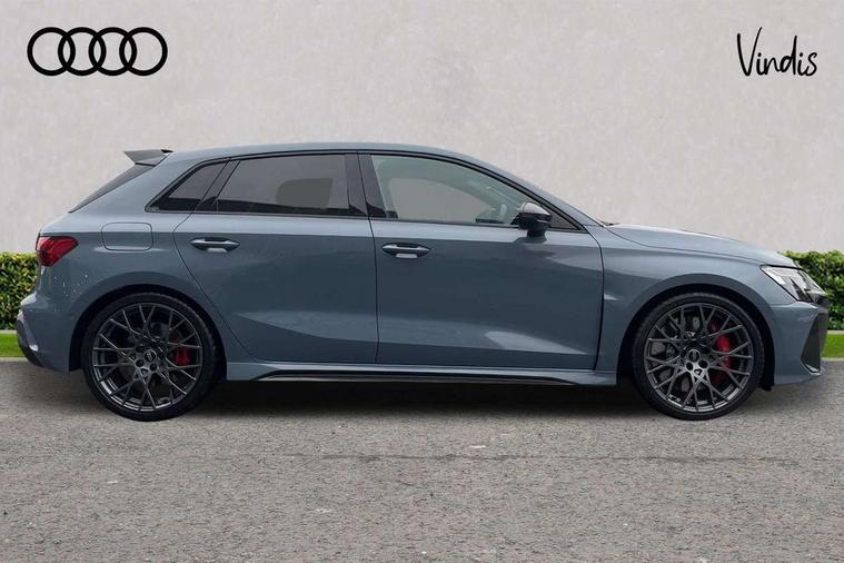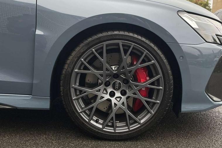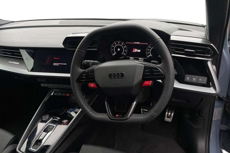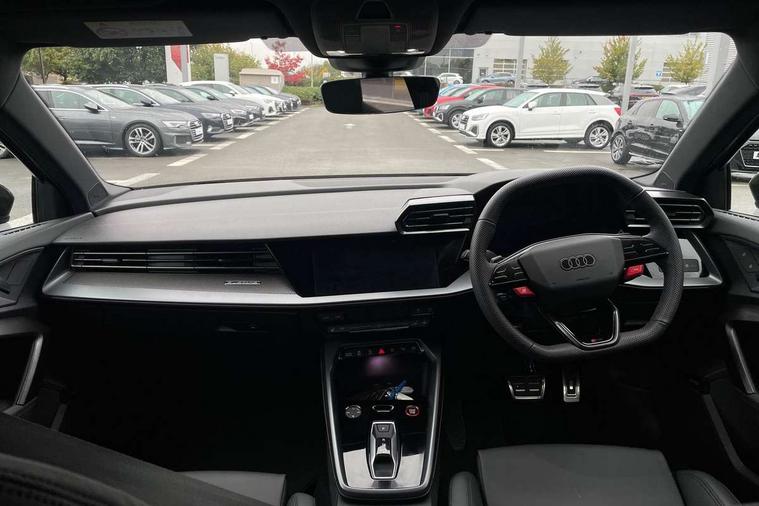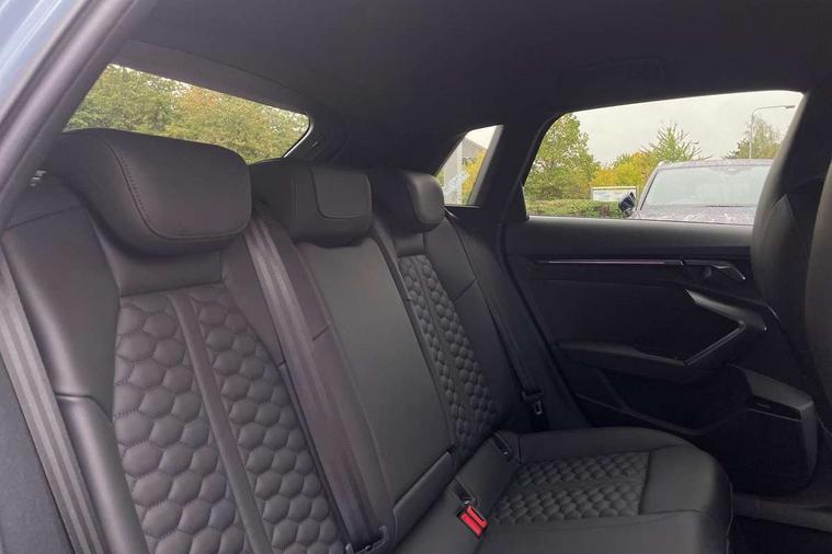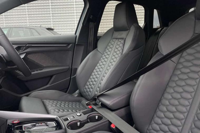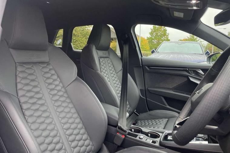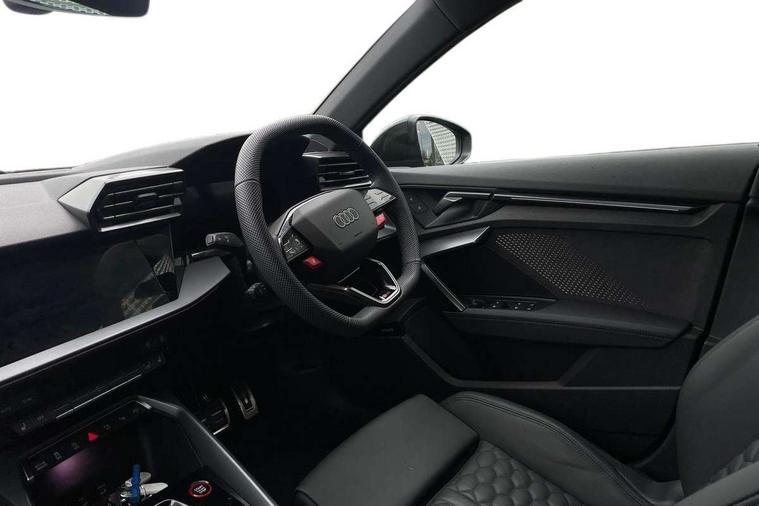 Adjustable speed limiter, Audi drive select comfort, auto, dynamic and efficiency, Audi smartphone interface with app store includes wireless Apple carplay, Android auto and Amazon alexa integration, Audi virtual cockpit plus with RS specific design and 12.3" display with additional graphic display options, Automatic start/stop system with recuperation, Bluetooth interface, Camera based traffic sign recognition, Collision avoidance assistant, Distraction and Fatigue warning, e-Call (emergency call), Lane departure warning system, MMI Navigation Plus with high resolution 10.1" colour touch screen display, Park Assist with parking system Plus, Progressive steering, RS specific driving modes - RS Individual, RS Performance and RS Torque rear, Voice control system with natural language interaction, Quattro permanent four wheel drive, Audi Phonebox light with wireless charging, DAB Digital radio, USB ports with charging function in the rear, All weather light, Audi beam LED projection of RS logo on ground as you exit, Audi darkened matrix LED headlights with dynamic light sequencing and dynamic indicator, Auto dimming frameless rear view mirror, Automatic dynamic range control, Carbon door mirror housings, Carbon fibre engine cover, Dipped beam, main beam, position light and turning light, Dynamic RS specific light sequencing of the coming home and leaving home function, Electrically adjustable/heated/folding/auto dimming door mirrors with integrated LED indications + kerb view function for passenger side, Exterior model badging, Front electric windows, Headlight cleaning system, Heat insulating glass windscreen, Intersection light, LED 3rd brake light, LED brake lights, LED daytime running x3, LED rear lights with dynamic light sequencing and dynamic indicator, LED rear number plate lights, LED reverse light, LED tail lights, Light and rain sensors, Manoeuvring light, Motorway light, Privacy glass - dark tinted rear window, rear door and side windows, Rear electric windows, Rear side wing doors, Rear wiper, Roof edge spoiler in carbon, RS dual branch exhaust system with two chrome plated oval tailpipe trims, Static Cornering lights, Visually upgraded RS specific daytime running light choice of 4 digital signature in chequered flag design within the headlight, 12V socket and storage compartment in front centre console, 3 seat bench in 2nd row, 3 Spoke flat top and bottomed black leather multi function steering and gear shift paddles, 3-zone deluxe automatic air conditioning, 40/20/40 split folding rear seat bench, Black cloth headlining, Front and rear headrests, Front centre armrest, Front door sill trims with RS 3 logo, Front sports seats RS embossed logo, Front/rear floor mats, Heated front seats, Height and reach adjustable steering wheel, Manual boot compartment lid, Manually adjustable front seats, Rear centre armrest with cupholder, Seat side bolsters, Single front passenger seat, Stainless steel pedals and front footrest in black, Vanadium look - Interior door handles, Door trim, power latching, Air vents, window controls, mirror adjust, rear door lock, Selector lever in centre console, Black Styling plus package - RS3, Extended ambient lighting package Pro with Multi-coloured contour lighting of instrument panel - RS3, RS exterior features pack in carbon and gloss black - RS3, RS sport suspension pack - RS3, Storage package - RS3 Sportback, Technology package without speed limiter - RS3, 3x3 point rear seat belts, Driver and front passenger airbag with passenger airbag deactivation, Electronic Stabilisation Control (ESC) including ABS, ASR and EDL, First aid kit with warning triangle and 2 safety vests, Hill hold assist, Pre-sense front with pedestrian and cyclist detection, RS steel brakes, Seatbelt monitoring, Tyre pressure loss indicator, Anti theft alarm, Anti-theft wheel bolts, Electronically operated child locks, Remote central locking with safelock, Inlays in carbon atlas structure, 19" 10 cross spoke silk matt grey alloy wheels, Tyre repair kit,