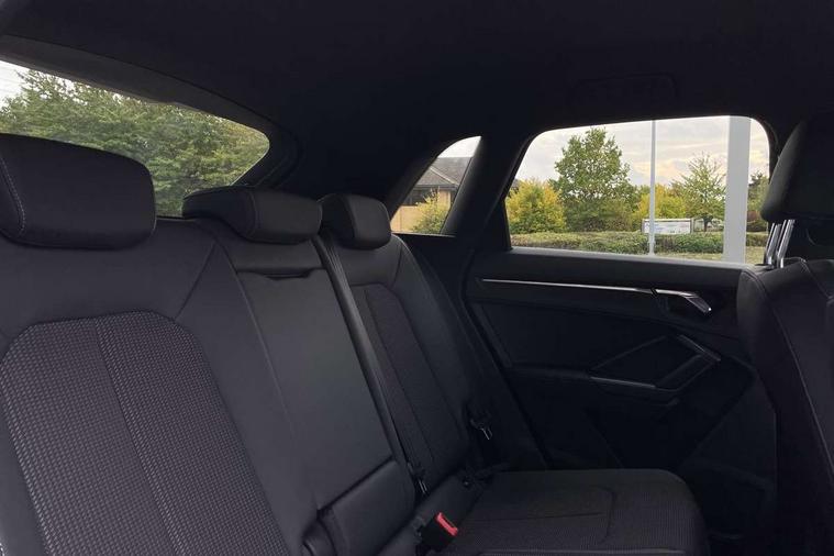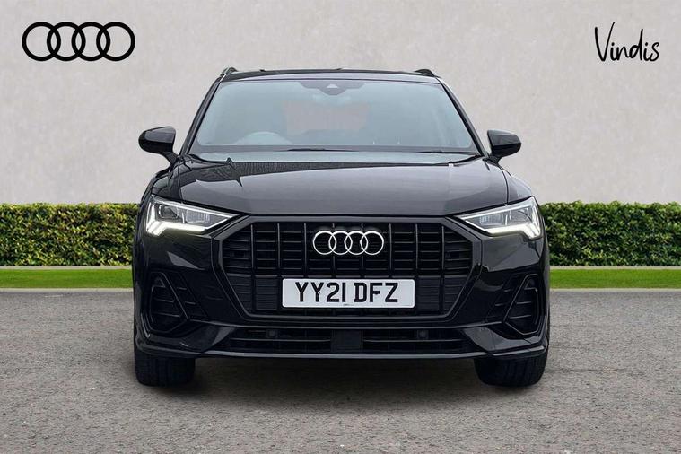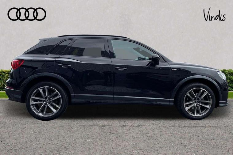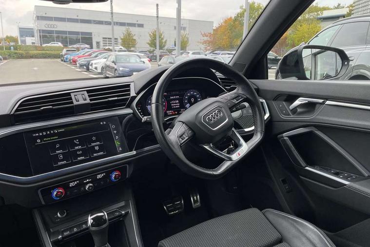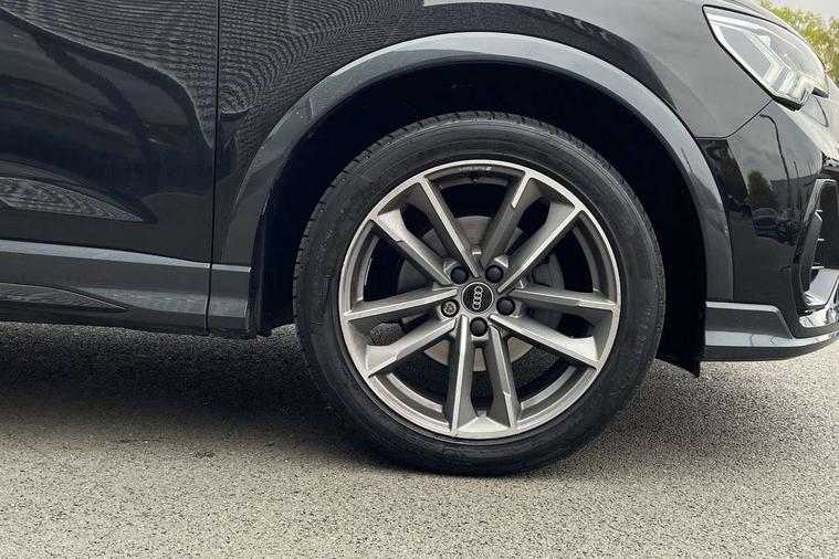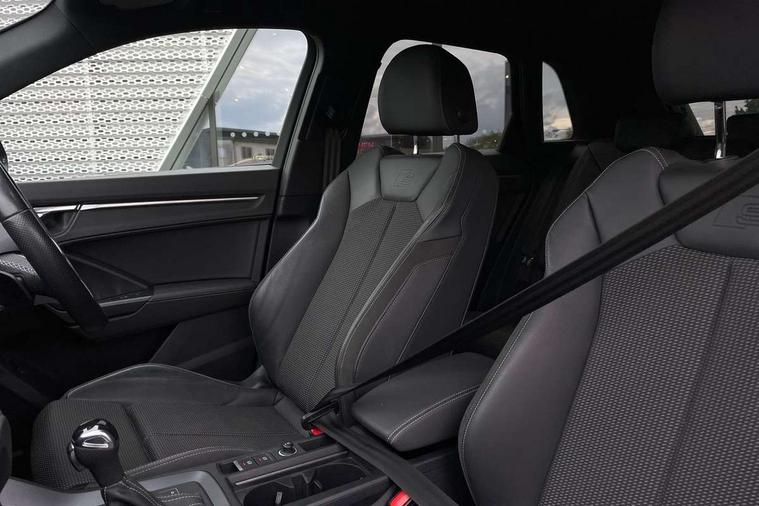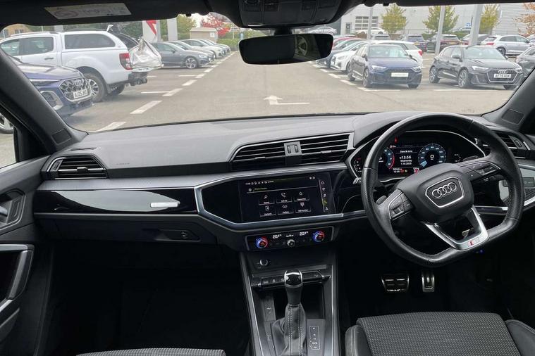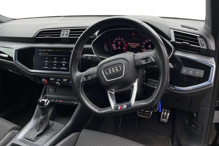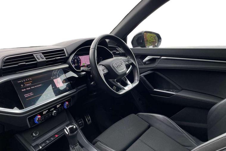 Audi connect safety and service (e-call), Audi drive select, Audi lane departure warning, Audi Virtual Cockpit - 10.25" display, Bluetooth interface, Camera based traffic sign recognition, MMI Navigation Plus with high resolution 10.1 inch touchscreen colour display, Power operated tailgate, Progressive steering, Service interval indicator, Smartphone interface includes wireless Apple carplay/Android Auto, Start stop system with recuperation, Voice control system with natural language interaction, 48V Mild hybrid technology, Sports suspension, 2 USB-C ports with charge and data functions, 6 passive loudspeakers, DAB digital radio module, Acoustic windscreen, Auto dimming frameless rear view mirror, Black roof rails, Electrically folding, adjustable and heated door mirrors with integrated LED side indicators and kerb view function for passenger side, Front and rear electric windows, Front fog lights, High gloss black finish B and C pillars, LED headlights with LED daytime running lights and dynamic rear indicator, LED rear lights, Privacy glass dark tinted rear and rear-side windows (from B-pillar backwards), Rain and light sensors, Rear diffuser strip in matt titanium black, S line bumpers in contrasting Manhattan grey, 12V socket in rear centre console, 40:20:40 folding with manual adjustment for 60:40 forwards/backwards position and backrest angle, Adjustable rear seat bench/backrest with centre armrest and cupholder, Black cloth headlining, Dual zone electronic climate control, Front and rear black floor mats with contrast stitching in rock grey, Front and rear headrests, Front and rear roof module including reading lights, Front centre armrest, Glove compartment lighting, Height and reach adjustable steering wheel, Illuminated door sill trims with S logo, ISOFIX child seat mounting for front passenger with airbag deactivation and outer rear seat including top tether attachment point for outer rear seats, Luggage compartment light, Manual front seats with height adjustment, Perforated leather gearknob, Stainless steel luggage compartment sill finisher, Stainless steel pedals, Black styling pack - Q3, Non smoking pack - Q3, 3x3 point rear seatbelts, 6 airbags - Driver, front passenger, curtain and side windows, Audi pre-sense front with pedestrain and cyclist recognition, Electrically operated child locks on rear doors, Electromechanical parking brake, Electronic stabilisation control including ABS, ASR and EDL, Hill descent control, Hill hold assist, Pre sense basic, Seatbelt monitoring, Tyre pressure warning, Warning triangle and first aid kit, Anti theft alarm, Anti theft wheel bolts, Remote central locking, Detail dashboard around MMI touch colour display in glass look, black with surround in aluminium look, Leatherette door armrest, Piano black inlay, Tool kit, Tyre repair kit,
