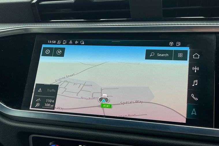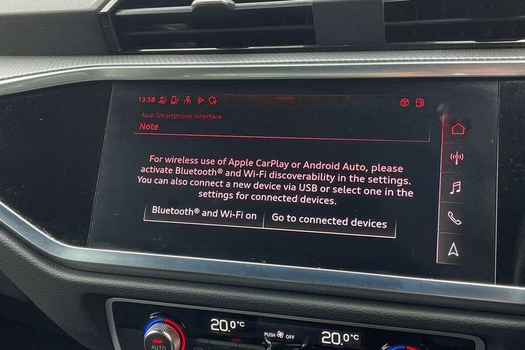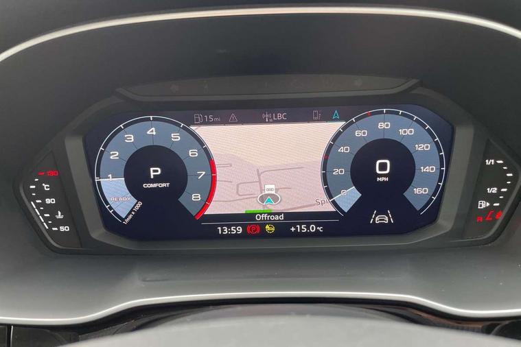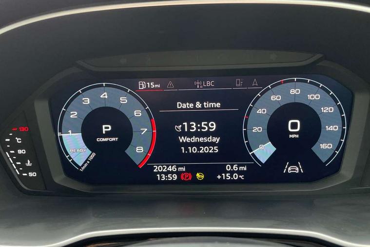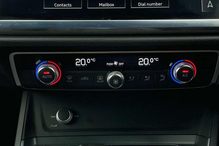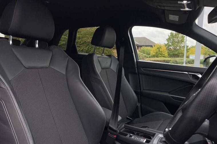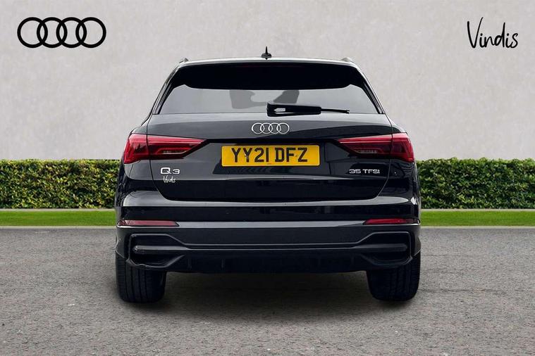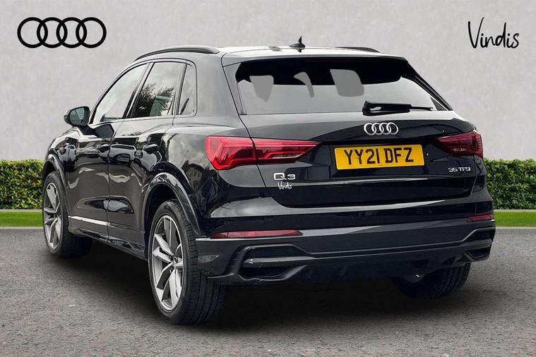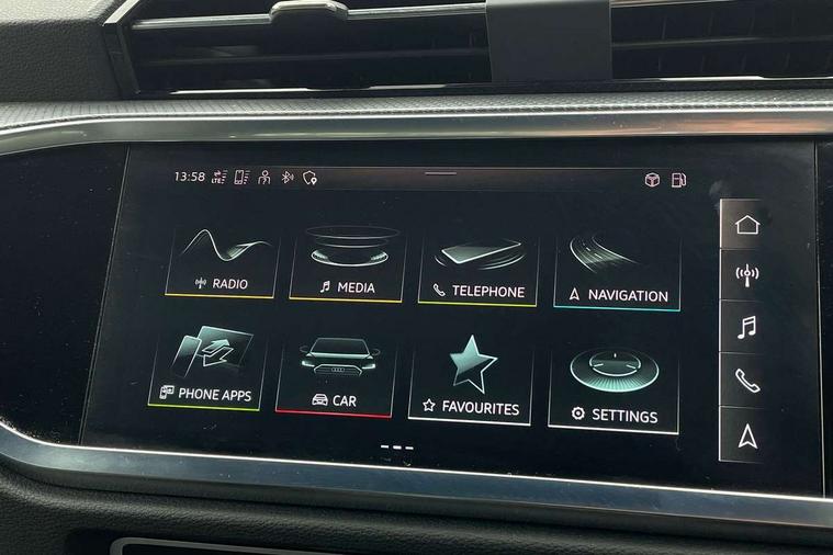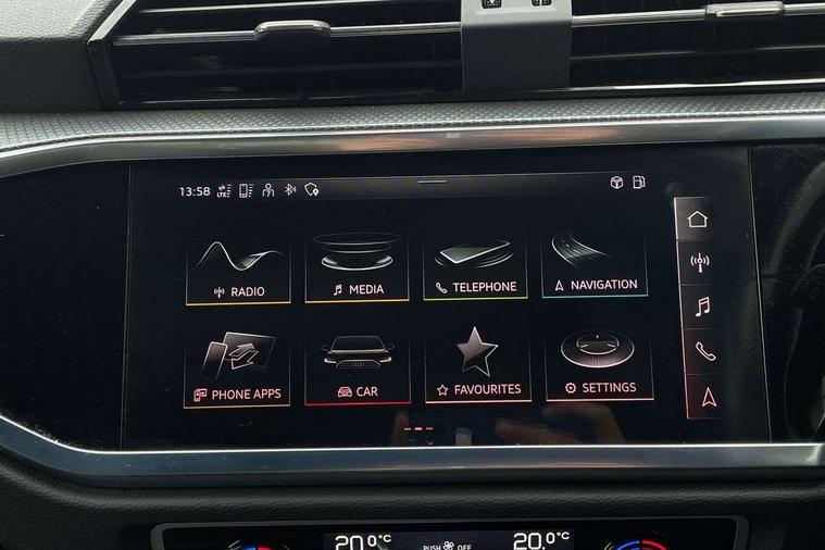 Audi connect safety and service (e-call), Audi drive select, Audi lane departure warning, Audi Virtual Cockpit - 10.25" display, Bluetooth interface, Camera based traffic sign recognition, MMI Navigation Plus with high resolution 10.1 inch touchscreen colour display, Power operated tailgate, Progressive steering, Service interval indicator, Smartphone interface includes wireless Apple carplay/Android Auto, Start stop system with recuperation, Voice control system with natural language interaction, 48V Mild hybrid technology, Sports suspension, 2 USB-C ports with charge and data functions, 6 passive loudspeakers, DAB digital radio module, Acoustic windscreen, Auto dimming frameless rear view mirror, Black roof rails, Electrically folding, adjustable and heated door mirrors with integrated LED side indicators and kerb view function for passenger side, Front and rear electric windows, Front fog lights, High gloss black finish B and C pillars, LED headlights with LED daytime running lights and dynamic rear indicator, LED rear lights, Privacy glass dark tinted rear and rear-side windows (from B-pillar backwards), Rain and light sensors, Rear diffuser strip in matt titanium black, S line bumpers in contrasting Manhattan grey, 12V socket in rear centre console, 40:20:40 folding with manual adjustment for 60:40 forwards/backwards position and backrest angle, Adjustable rear seat bench/backrest with centre armrest and cupholder, Black cloth headlining, Dual zone electronic climate control, Front and rear black floor mats with contrast stitching in rock grey, Front and rear headrests, Front and rear roof module including reading lights, Front centre armrest, Glove compartment lighting, Height and reach adjustable steering wheel, Illuminated door sill trims with S logo, ISOFIX child seat mounting for front passenger with airbag deactivation and outer rear seat including top tether attachment point for outer rear seats, Luggage compartment light, Manual front seats with height adjustment, Perforated leather gearknob, Stainless steel luggage compartment sill finisher, Stainless steel pedals, Black styling pack - Q3, Non smoking pack - Q3, 3x3 point rear seatbelts, 6 airbags - Driver, front passenger, curtain and side windows, Audi pre-sense front with pedestrain and cyclist recognition, Electrically operated child locks on rear doors, Electromechanical parking brake, Electronic stabilisation control including ABS, ASR and EDL, Hill descent control, Hill hold assist, Pre sense basic, Seatbelt monitoring, Tyre pressure warning, Warning triangle and first aid kit, Anti theft alarm, Anti theft wheel bolts, Remote central locking, Detail dashboard around MMI touch colour display in glass look, black with surround in aluminium look, Leatherette door armrest, Piano black inlay, Tool kit, Tyre repair kit,