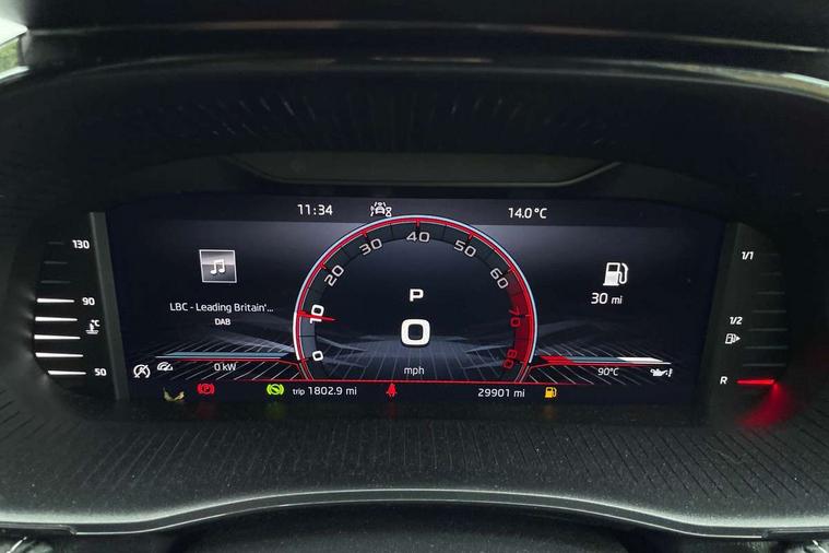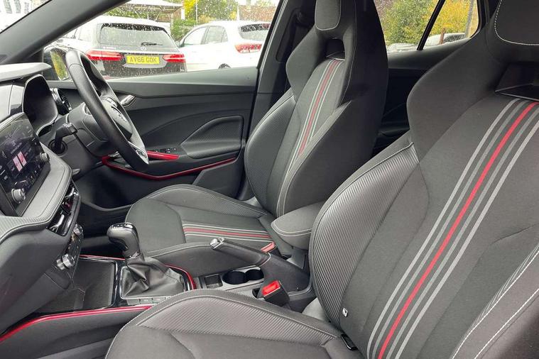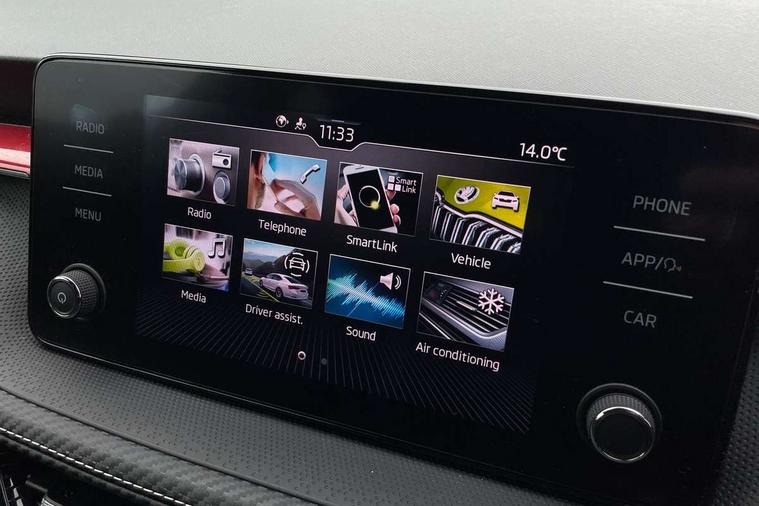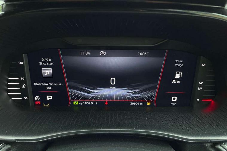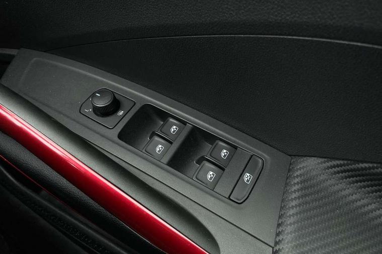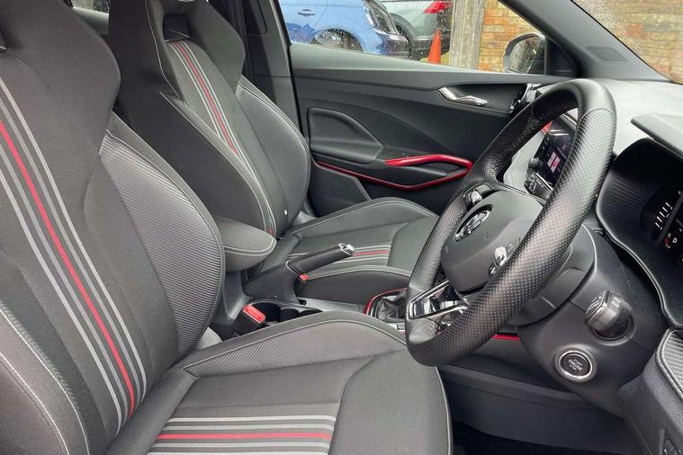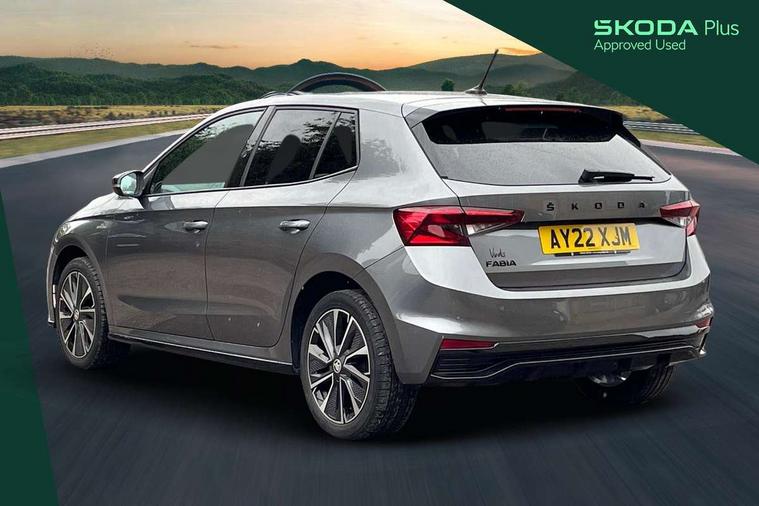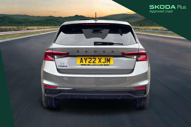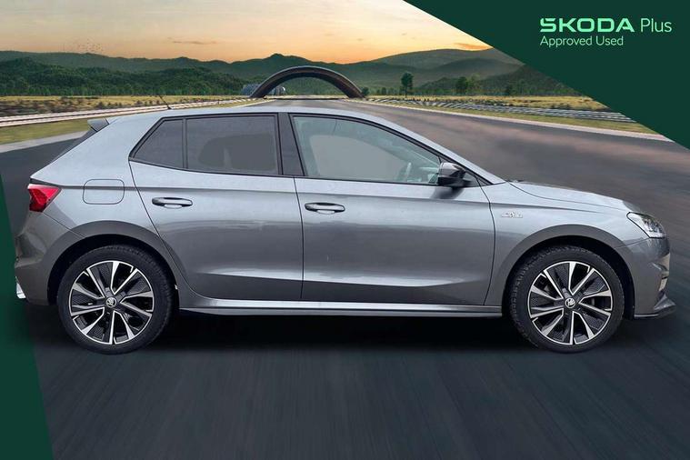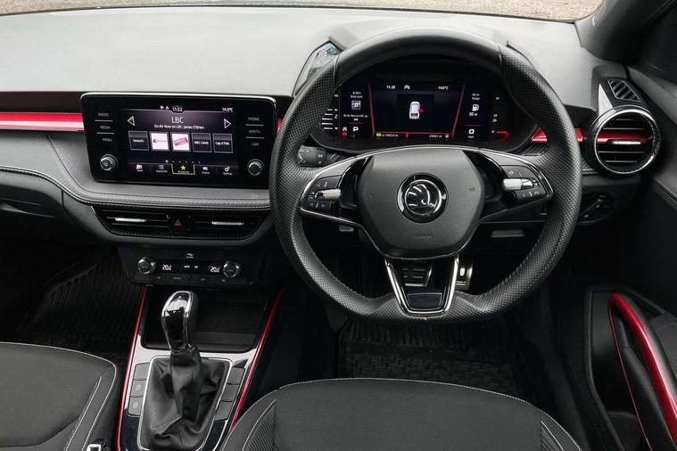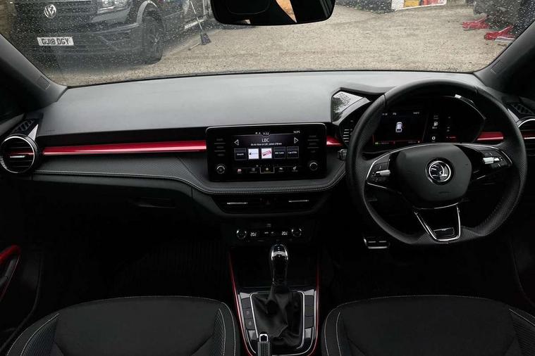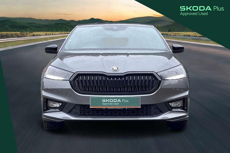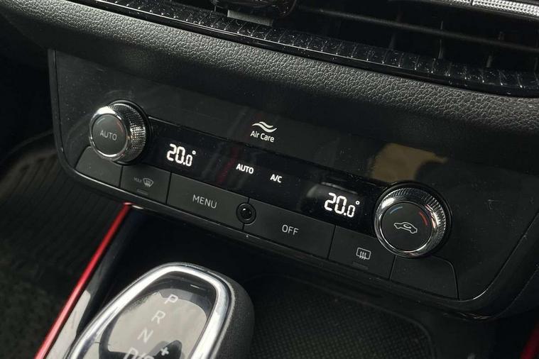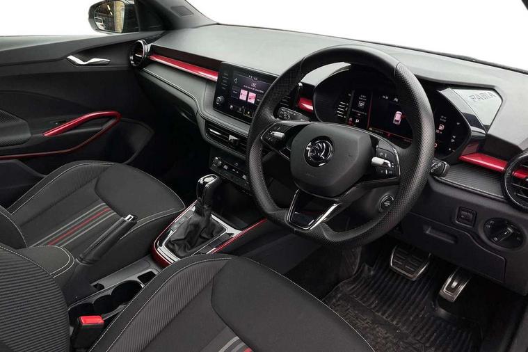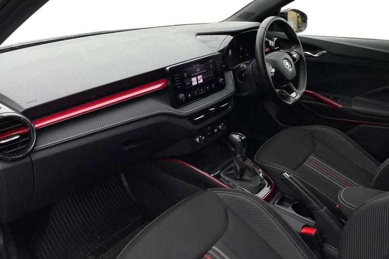 Bluetooth connection, Driver alert system - DAS, Electromechanical power steering, Exterior temperature gauge, Service interval indicator, 2x USB-C in the front (for data transmission and charging), 6 Speakers (4 in front and 2 in rear), Auxiliary socket for external MP3 player, Bolero radio with 8" colour display, DAB digital radio reception, Auto dimming rear view mirror, Basic rear lights, Black radiator grille, Body coloured bumpers, Door mirror integrated indicators, Electrically adjustable and heated door mirrors, Front and rear electric windows, Front window wiper intermittent control, Headlight range control - Automatic, Ice scraper in fuel cap, LED daytime running lights with coming and leaving home feature, Monte Carlo badging, Privacy glass, Rear LED fog light, Rear side wing doors, Rear window wiper with washing nozzles, Roof mounted spoiler, SKODA tailgate lettering in black, Sports bumpers, Third brake light, 3 rear headrests, Aluminium pedals, Backrest split and folding, Black headlining, Central console with removable cup holder and storage box, Chrome handbrake release button, Fabric/artificial leather upholstery, Front sports seats, Gearshift knob/handle in leather, Hand brake lever handle in leather, Height adjustable front headrests, Height adjustable steering wheel, ISOFIX and TopTether anchorage points to the outer rear seats, ISOFIX and TopTether on the front passenger seat, Luggage compartment lighting, Metallic painted red central console cover, Metallic red interior door handles, Monte Carlo door sills, Pollen filter, Rear seat bench unsplit, Single front passenger seat, Sun visors with mirror and airbag label on passenger side, Textile floor mats, Ticket holder, Umbrella in drivers door, Ambient lighting pack 2 - Fabia Hatchback, 3-point height adjustable front seats belts with pretensioner and force limiter, Automatic warning lights in case of crash, Driver and passengers airbag with switch off function, e-Call+, ESC including ABS, MSR, ASR, EDS, HBA and XDS, Front and rear seat belt warning, FRONT ASSIST (AEB City and AEB Inter Urban), Front side airbags, Head airbags, Hill hold assist, One tone horn, Pedestrian protection, Three rear 3-points safety seat belts with pretensioner and force limiter including stop function for outer rear seat belts, Tyre pressure monitoring system, Anti-theft alarm system including immobiliser, interior monitoring, backup horn, and towing protection, Carbon effect door and side trim panels, Carbon effect lower decorative trim with white stitching, Red metallic upper decorative trim, Anti-theft wheel bolts protection, Super-low rolling resistance tyres,