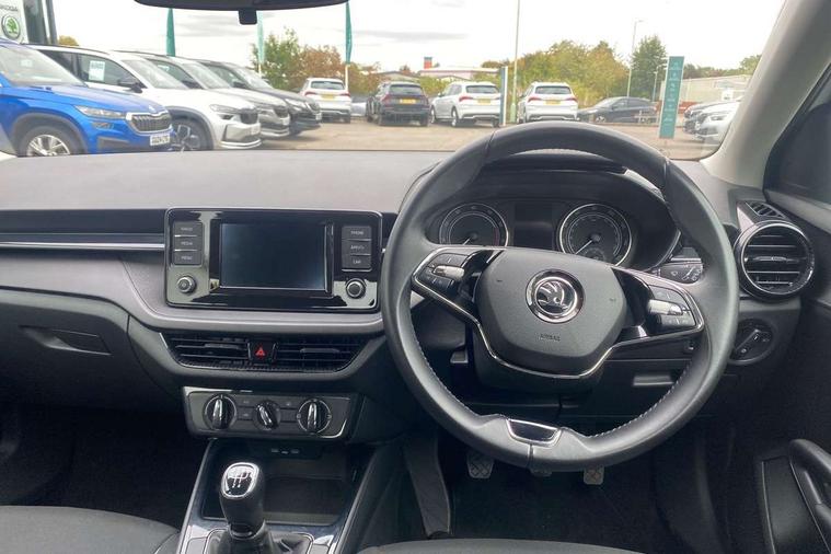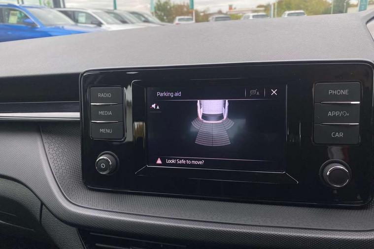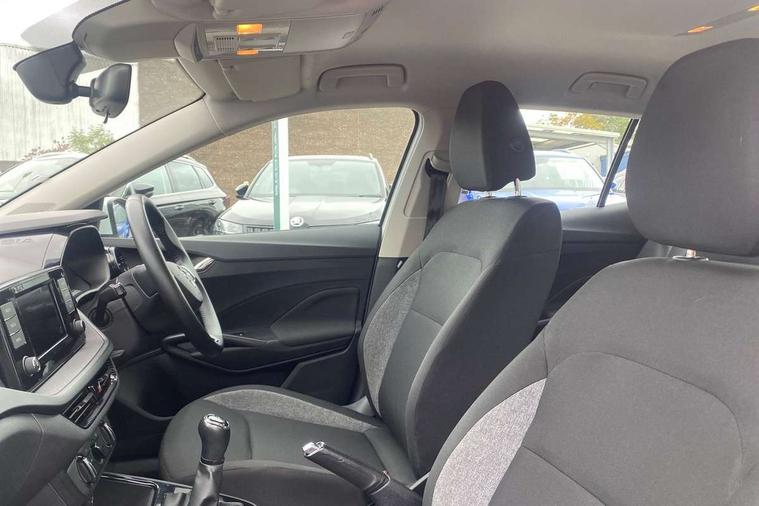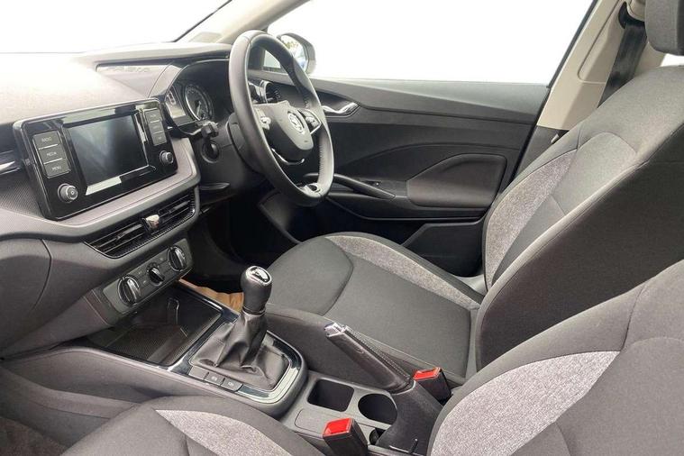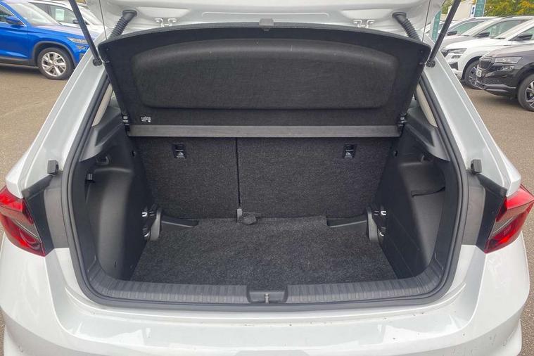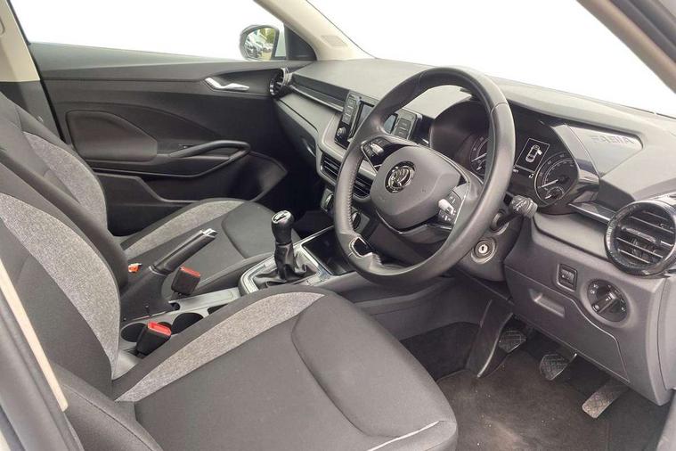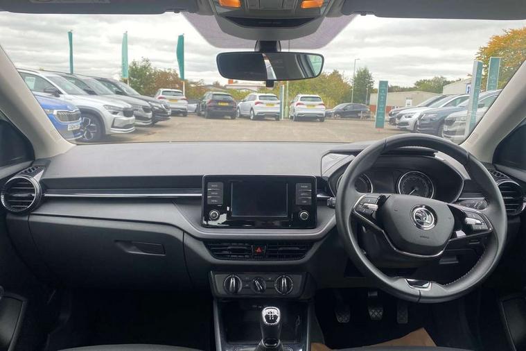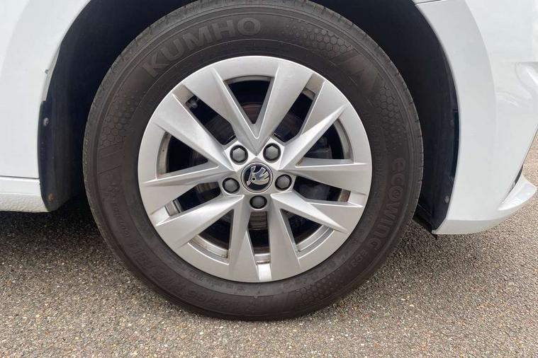 Bluetooth connection, Driver alert system - DAS, Electromechanical power steering, Exterior temperature gauge, Lane assist including road edge detection, Multifunction trip computer in black and white, Service interval indicator, Speed limiter, 2x USB-C in the front (for data transmission and charging), 4 speakers in front, Auxiliary socket for external MP3 player, DAB digital radio reception, Radio Swing with 6.5" colour display, Basic LED Headlights, Basic rear lights, Body colour door mirrors, Body coloured bumpers, Dimming rear view mirror with black frame, Door mirror integrated indicators, Electrically adjustable and heated door mirrors, Electrically adjustable front windows with function auto up/down, Front fog lights, Front window wiper intermittent control, Headlight range control - Automatic, Ice scraper in fuel cap, LED daytime running lights with coming and leaving home feature, Mechanical adjustable rear windows, Rain sensor, Rear LED fog light, Rear side wing doors, Rear window wiper with washing nozzles, Roof mounted spoiler, SKODA tailgate lettering in chrome, Third brake light, 2 reading lights in front and 2 reading lights in rear, 2 spoke leather multifunction steering wheel, 3 rear headrests, Backrest split and folding, Central console with fixed cup holder and storage box, Chrome handbrake release button, Fabric upholstery, Gearshift knob/handle in leather, Grain satin black interior door handles, Hand brake lever handle in leather, Height adjustable front headrests, Height adjustable front seats, Height adjustable steering wheel, ISOFIX and TopTether anchorage points to the outer rear seats, ISOFIX and TopTether on the front passenger seat, Luggage compartment lighting, Manual air conditioning, Manually adjustable lumbar support in front seats, Pollen filter, Rear seat bench unsplit, Single front passenger seat, Storm grey headlining, Sun visors with mirror and airbag label on passenger side, Ticket holder, 3-point height adjustable front seats belts with pretensioner and force limiter, Automatic warning lights in case of crash, Driver and passengers airbag with switch off function, e-Call+, ESC including ABS, MSR, ASR, EDS, HBA and XDS, Front and rear seat belt warning, FRONT ASSIST (AEB City and AEB Inter Urban), Front side airbags, Head airbags, One tone horn, Pedestrian protection, Three rear 3-points safety seat belts with pretensioner and force limiter including stop function for outer rear seat belts, Tyre pressure monitoring system, Anti-theft alarm system including immobiliser, interior monitoring, backup horn, and towing protection, Central locking with radio remote control, interior controls, SAFE function and 2 foldable keys, Black painted air vents, Glossy black decorative trim, Grain satin black central console cover, Grain satin black lower decorative trim, Satin black door and side trim panel in front, Anti-theft wheel bolts protection, Super-low rolling resistance tyres,